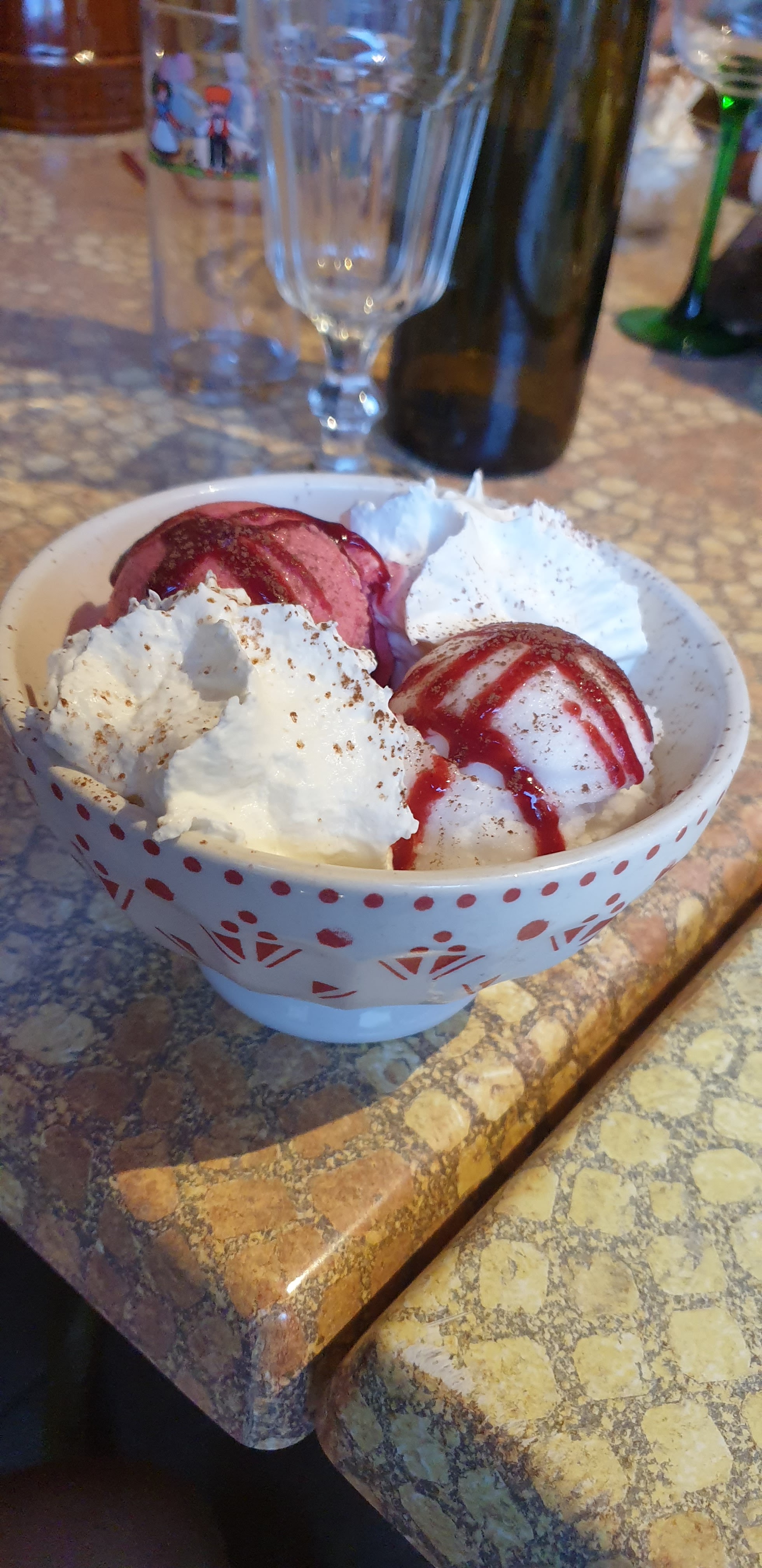 Après avoir dégusté l'excellente tarte flambée, je vous suggère un petit dessert accompagné de cette merveilleuse chantilly maison ! Un régal à côté des siphons ......y a pas photo !