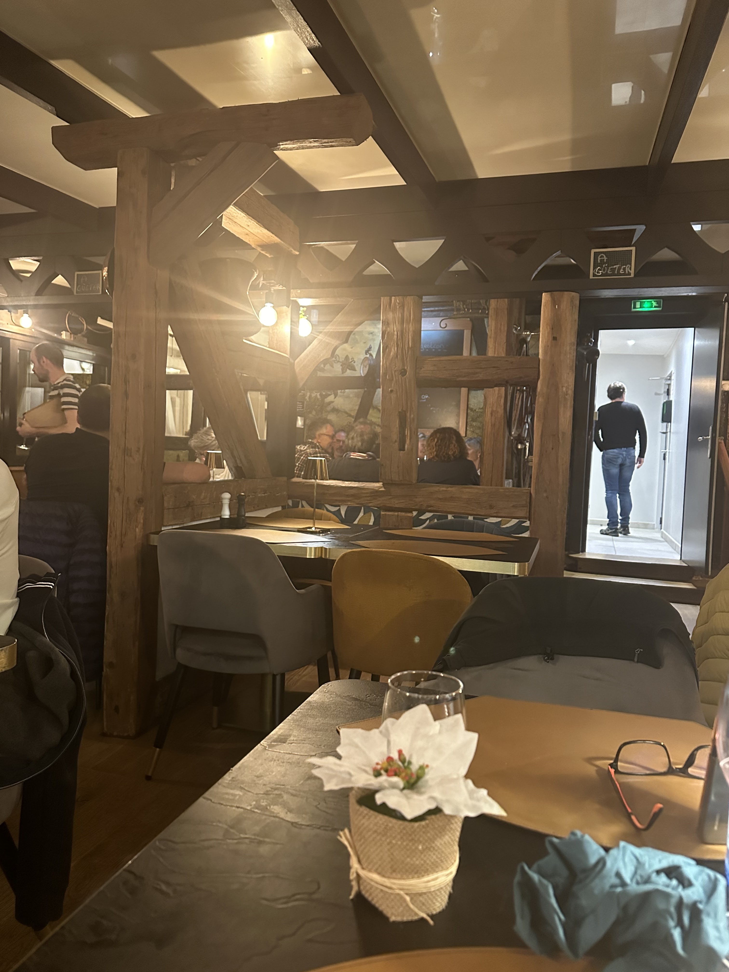 Nous avons dîné trois fois dans ce restaurant. Le cadre est très chaleureux, la cuisine excellente (en particulier la tarte flambée) et le personnel très aimable. Seul petit regret : les salles sont très bruyantes en cas de forte affluence.