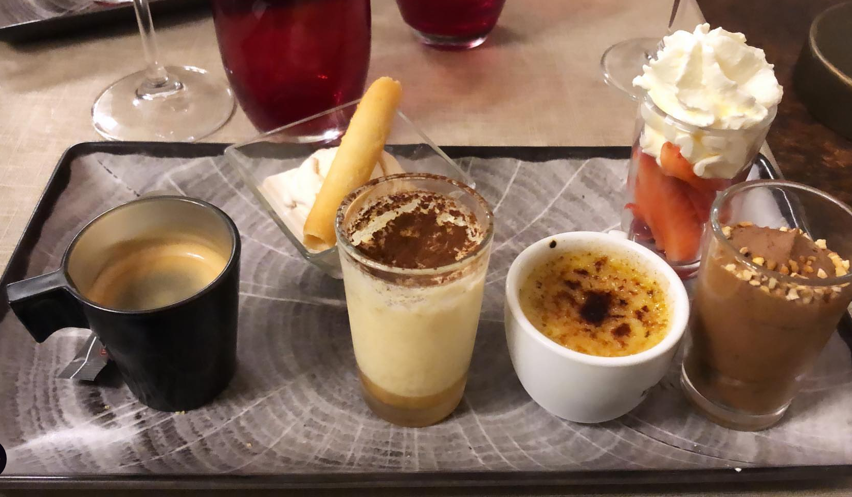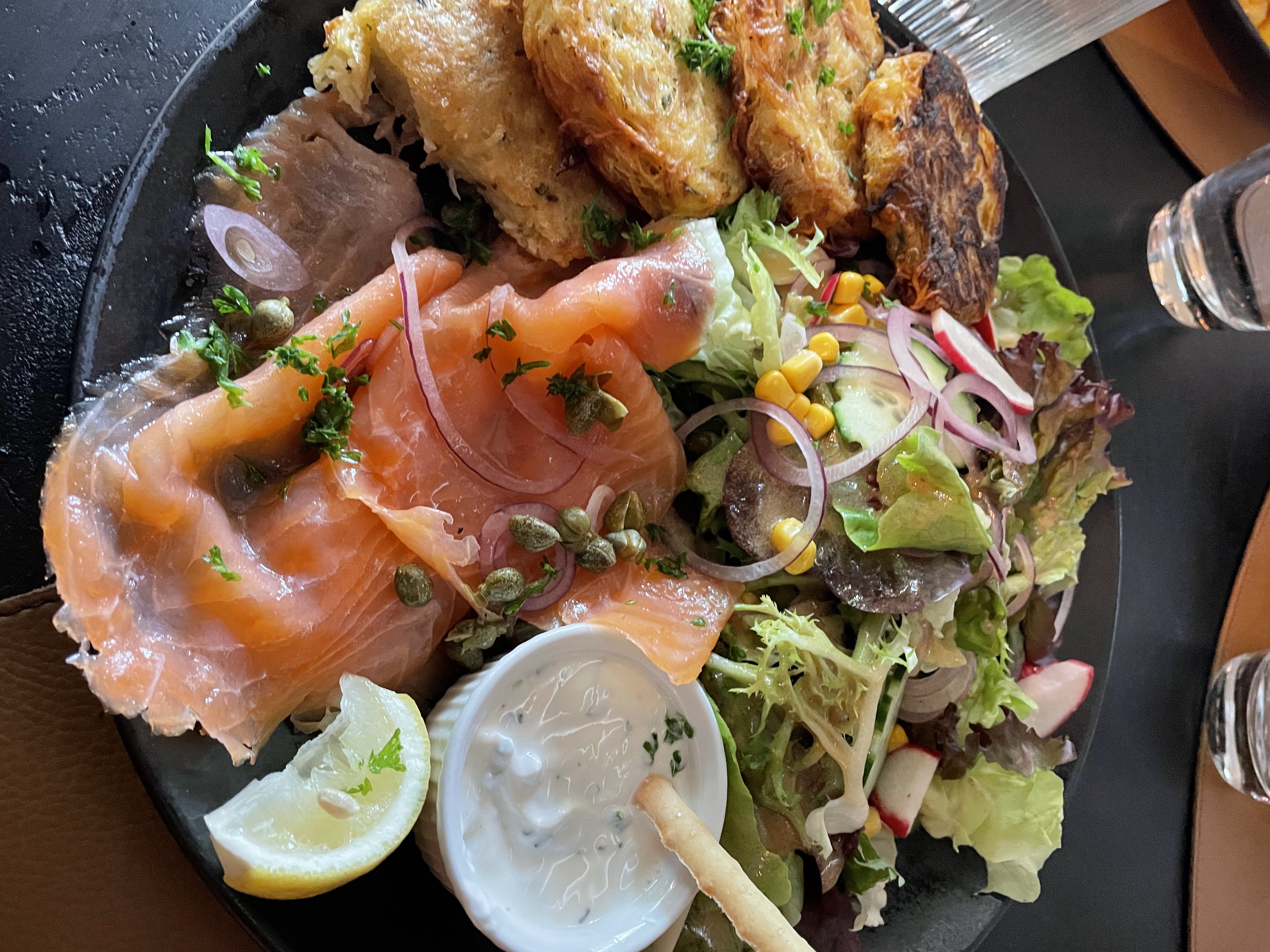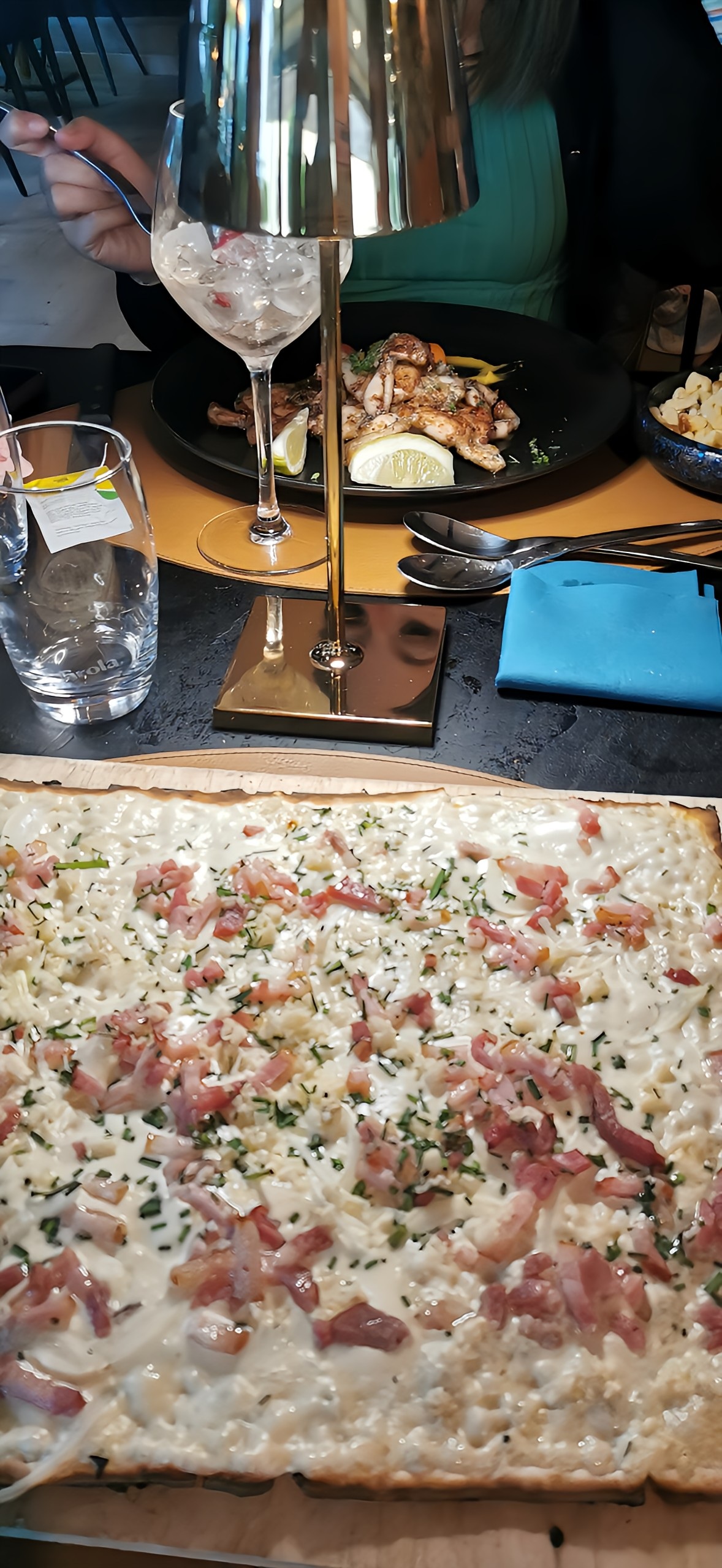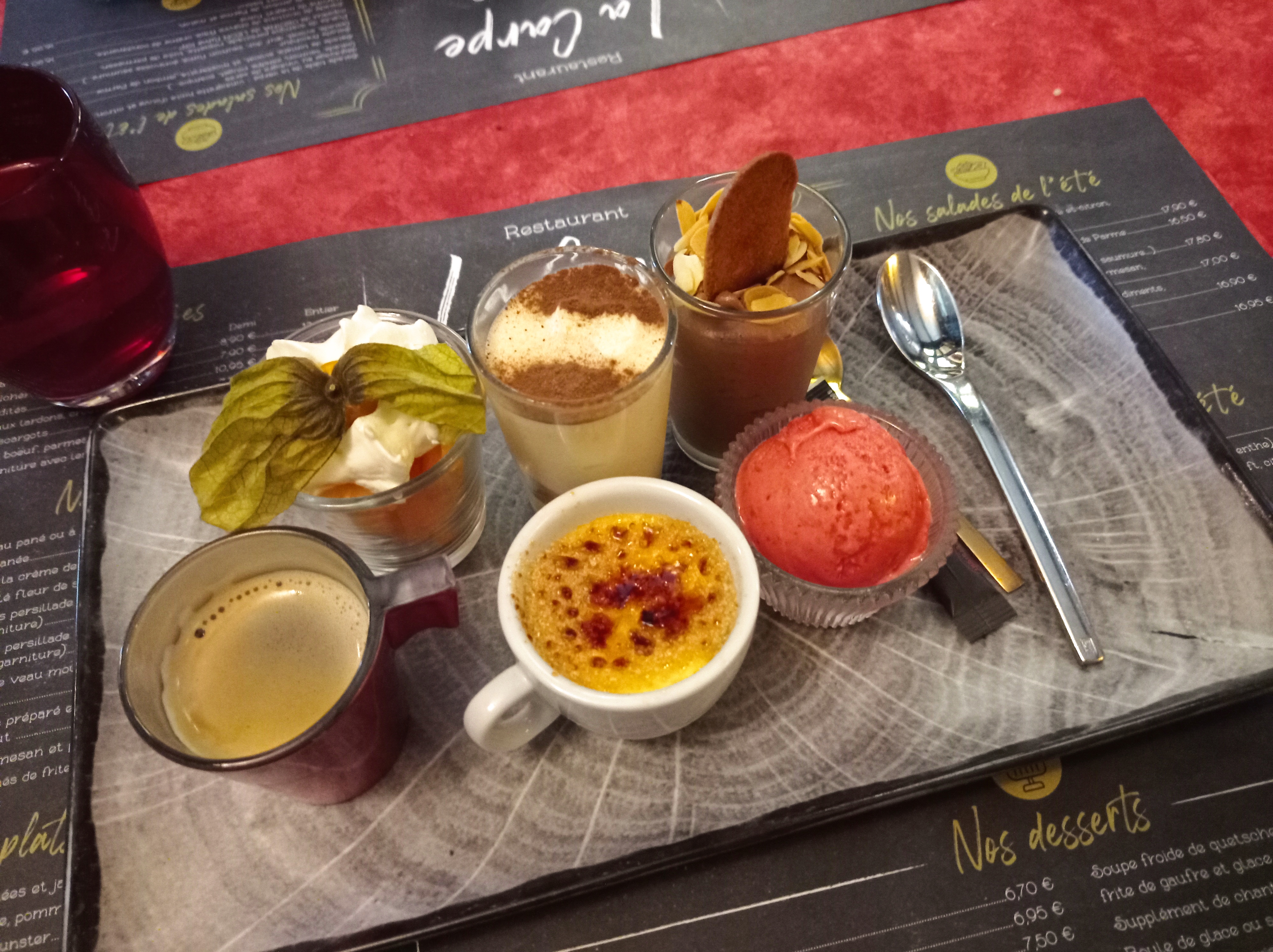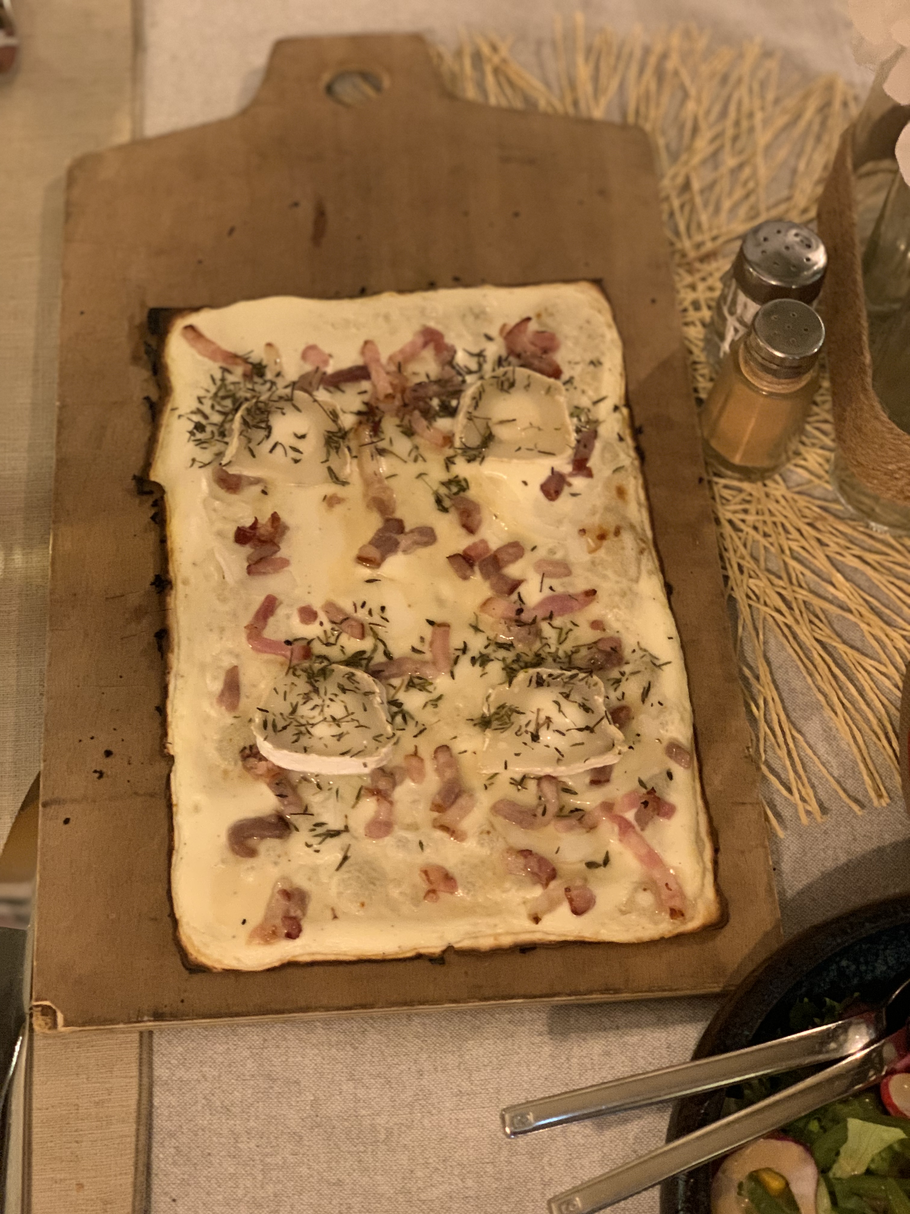 Nous étions nombreux donc uniquement pour des tartes flambées...je n'ai pas aimé plus que ça ..parfois à peine tiède... j'aurai aimé goûter aux plats proposés sur la carte car au vue des plats que j'ai pu voir aux autres tables cela avait l'air appétissant.. Donc à refaire....par contre mon café gourmand a été une véritable tuerie ! Tout était excellent !¡