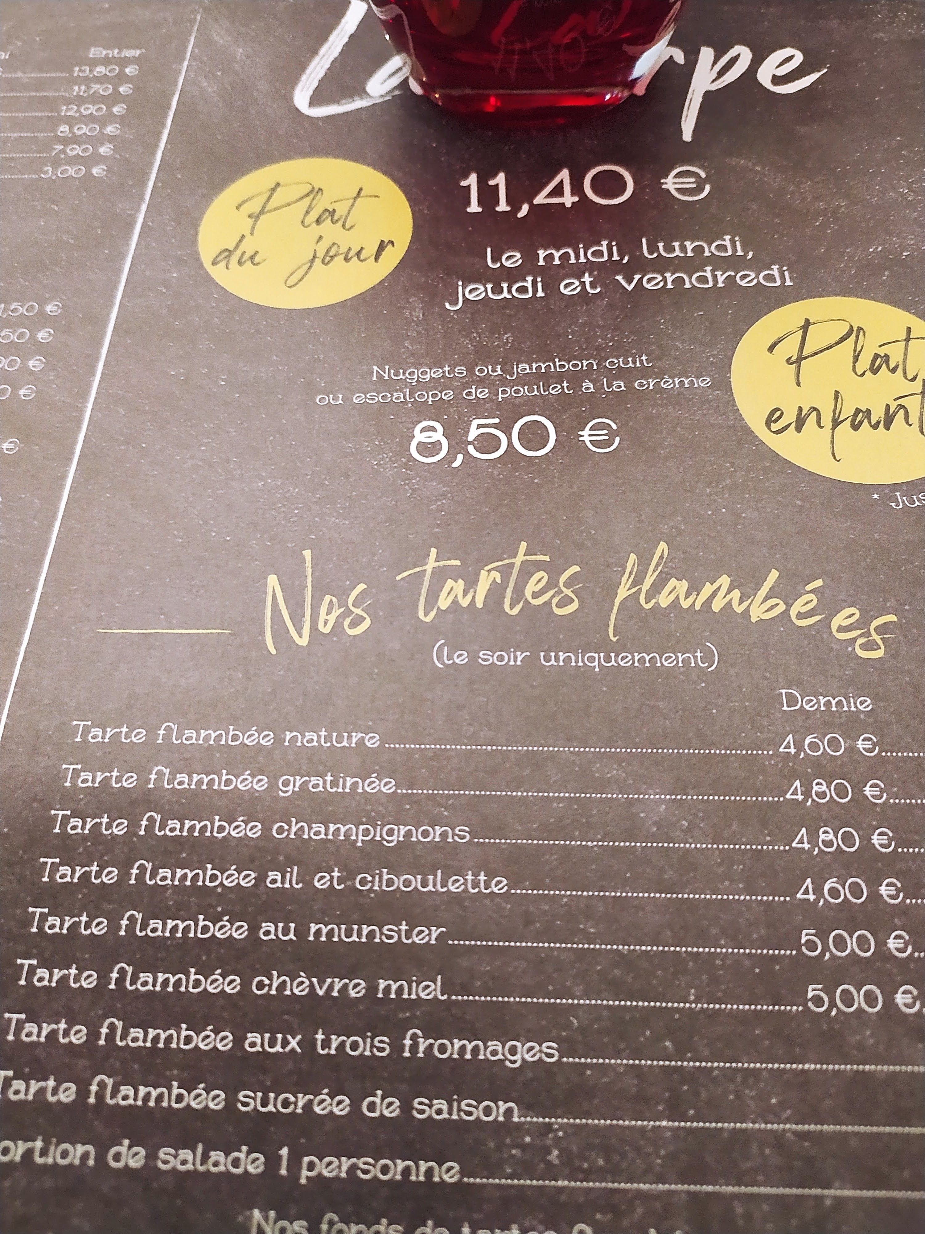 Le personnel et la patronne très très agréable. La tarte flambée délicieuse ainsi que la salade tiède aux poissons. Un moment très convivial bravo à vous 👍🥰