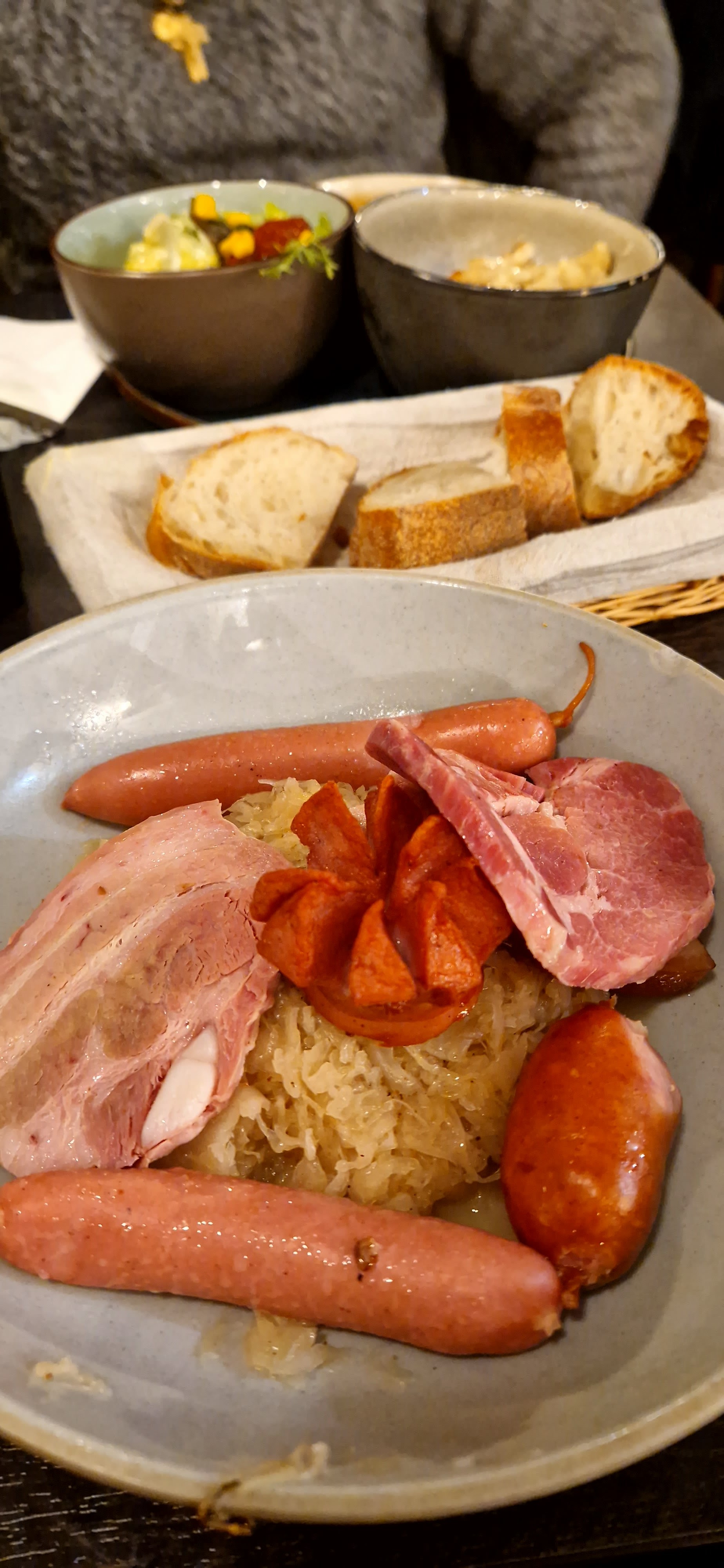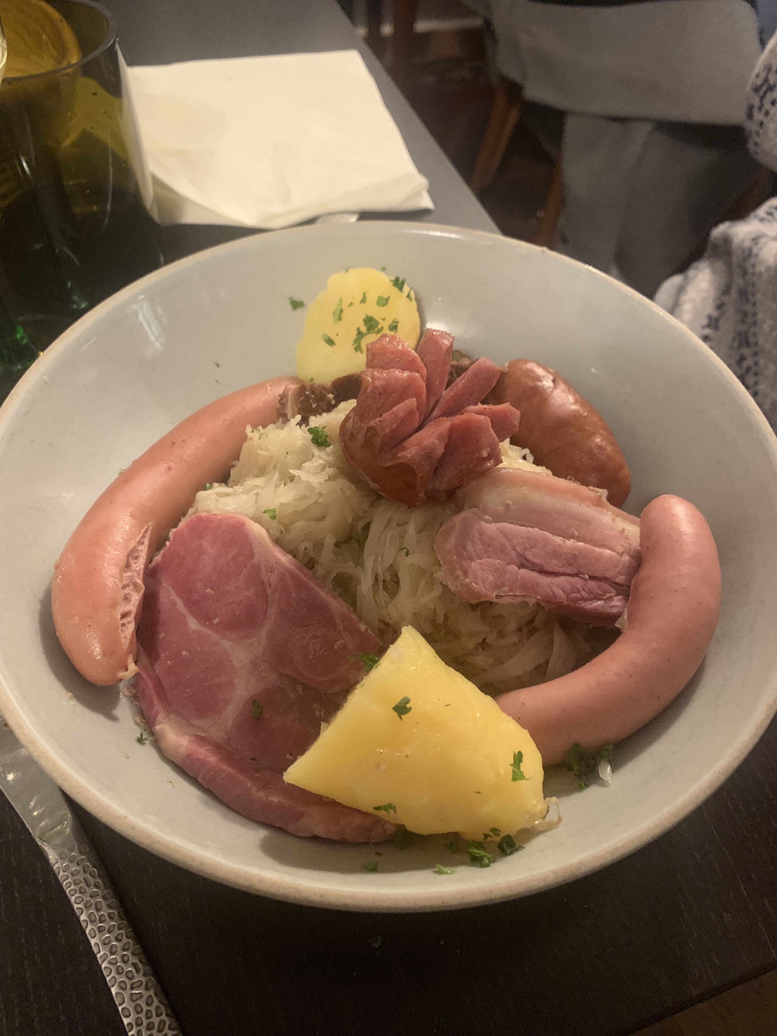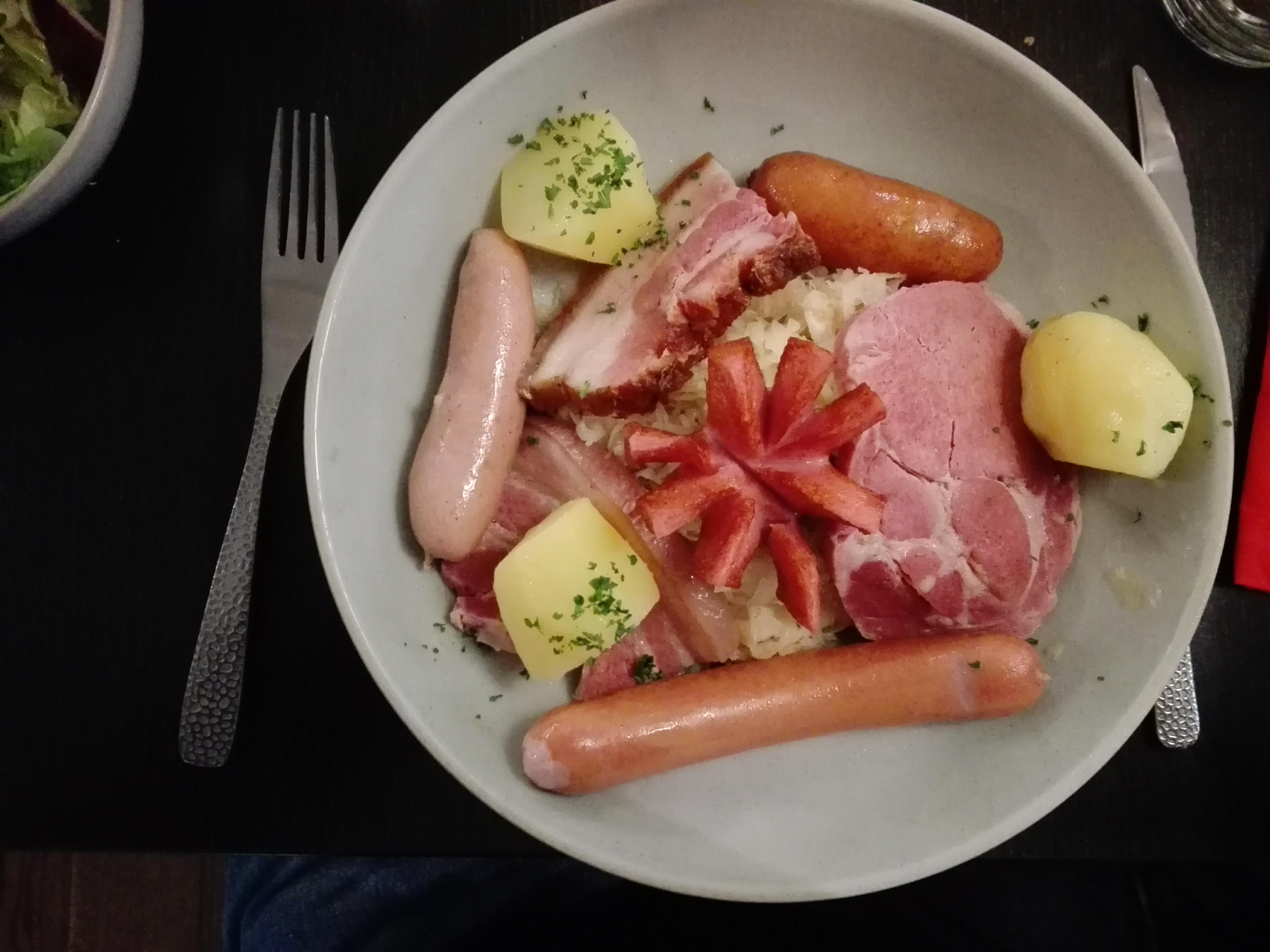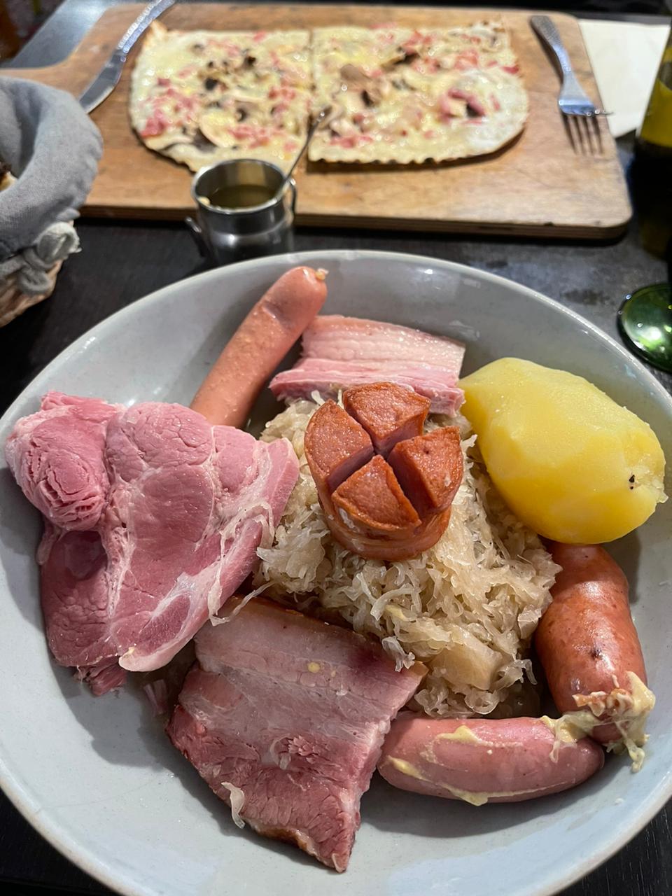 Le restaurant est très prisé à Strasbourg, on a dû attendre 40 minutes dans la pluie et le froid pour rentrer dans le restaurant. Ma tarte flambée gratinée était bonne même si trop fine. Par contre, les spaëtzles sont vraiment pas terribles. Les prix sont excessifs, surtout la choucroute, qui manque de cruellement de patates. Heureusement, les nems à la choucroute sont très bons.