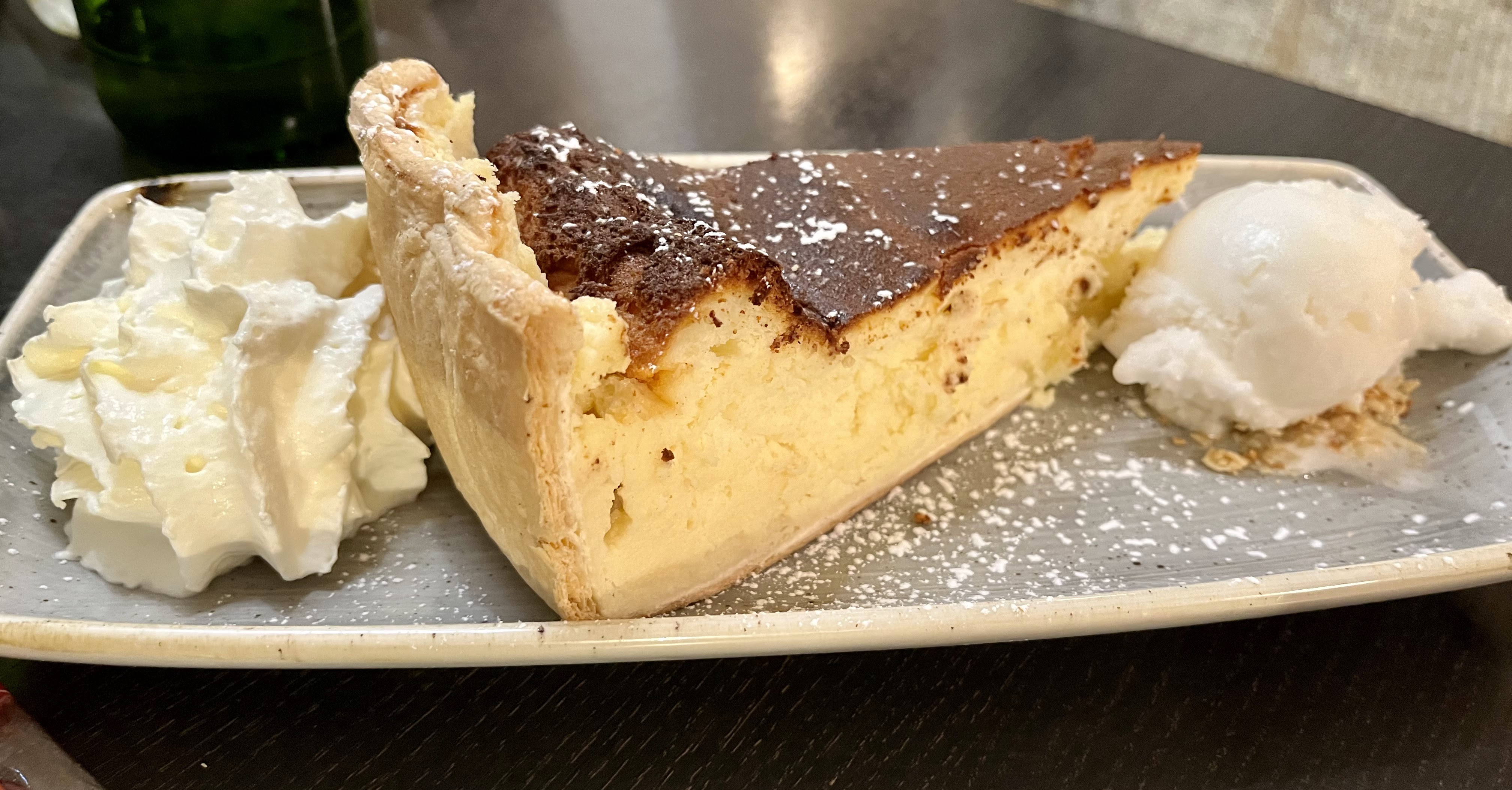 Super ! Nous voulions une tarte flambée classique cuit au feu de pois, bonne adresse. N'étant pas du coin je trouve que la classique est un peu cher mais le cadre et le personnel compense. Très accueillant et au petit soin. Je retire une étoile parce qu'il n'y a pas d'accès poussette ( sinon une marche en passant par le côté). J'ai beaucoup aimé le Rumtopf ( Boisson alcoolisée, je recommande) et la tarte flambée ail et ciboulette. La carte amuse et engage de longue conversation 🤭. Le cheesecake est onctueux ! Très bonne crème brûlée mais petite portion. Le Irish café est très bon aussi ( attention chaud 😉), généreux et bien dosé. Il y a du monde, pensez à réserver.