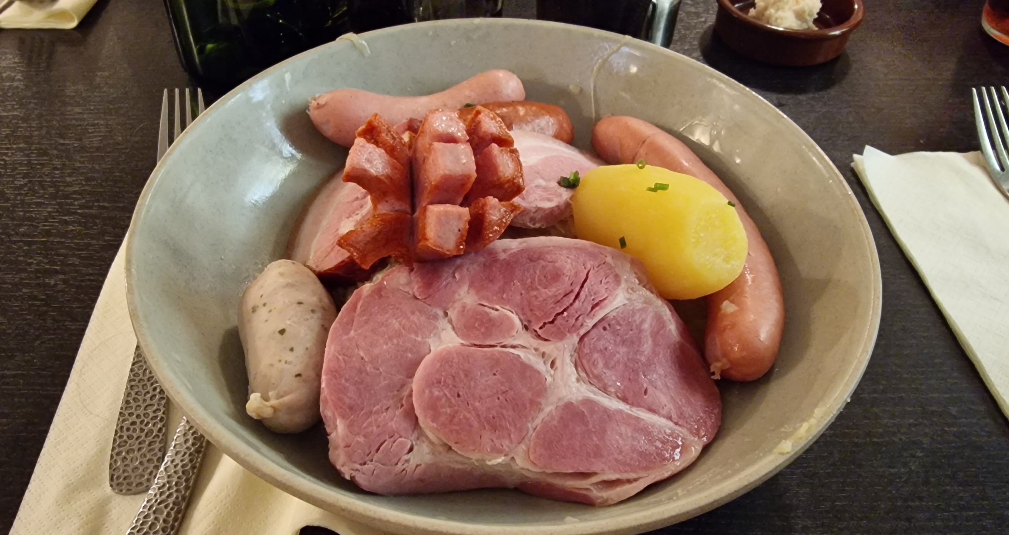 Un inmanquable en cas de passage à Strasbourg! Nous avons été reçus comme des princes et nourris comme des rois, malgré une salle comble. À noter que les réservations ne sont pas possibles pendant la période du marché de Noël mais l’attente pour une table reste raisonnable.