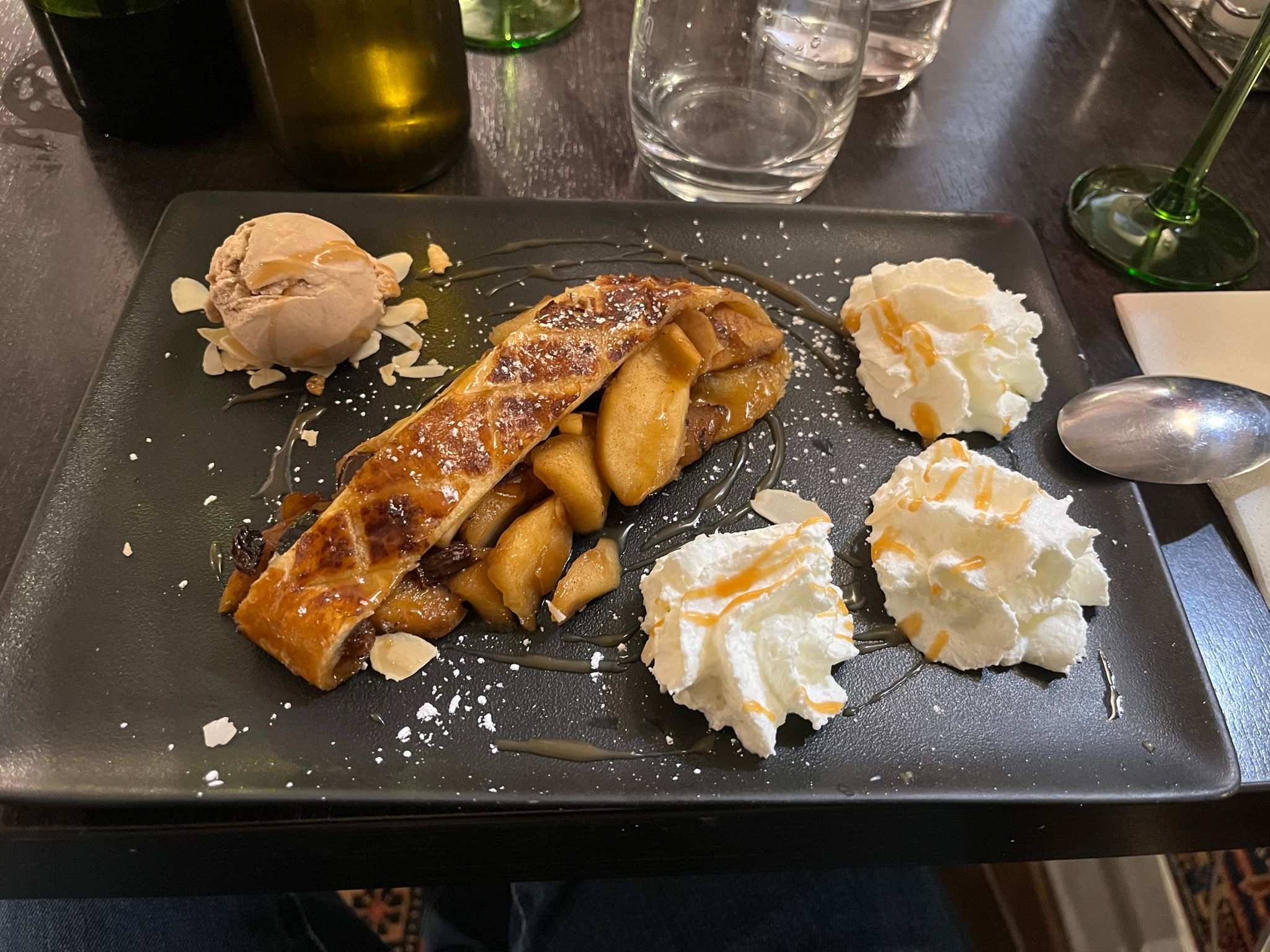 Nous avons passé une excellente soirée ! Les tartes flambées salées et sucrées sont très bonnes. On peut en dire de même pour les spaetzles. Tout était gourmand. Nous avons aussi été enchantés par le service, avec qui nous avons bien ri. Merci particulièrement pour cette fin de repas sous le signe de la générosité ! Je ne manquerai pas de revenir et recommander cette adresse à mes proches.