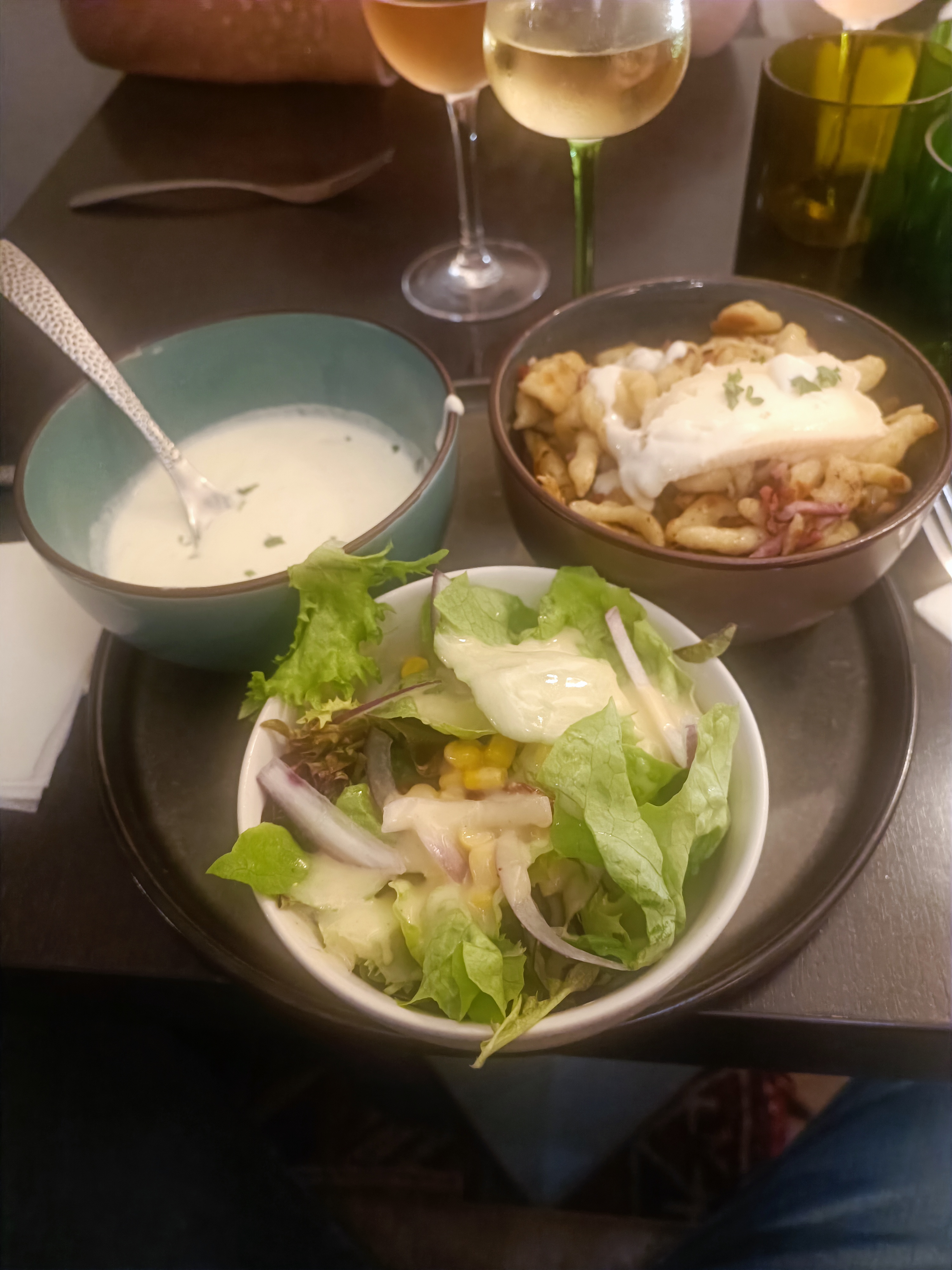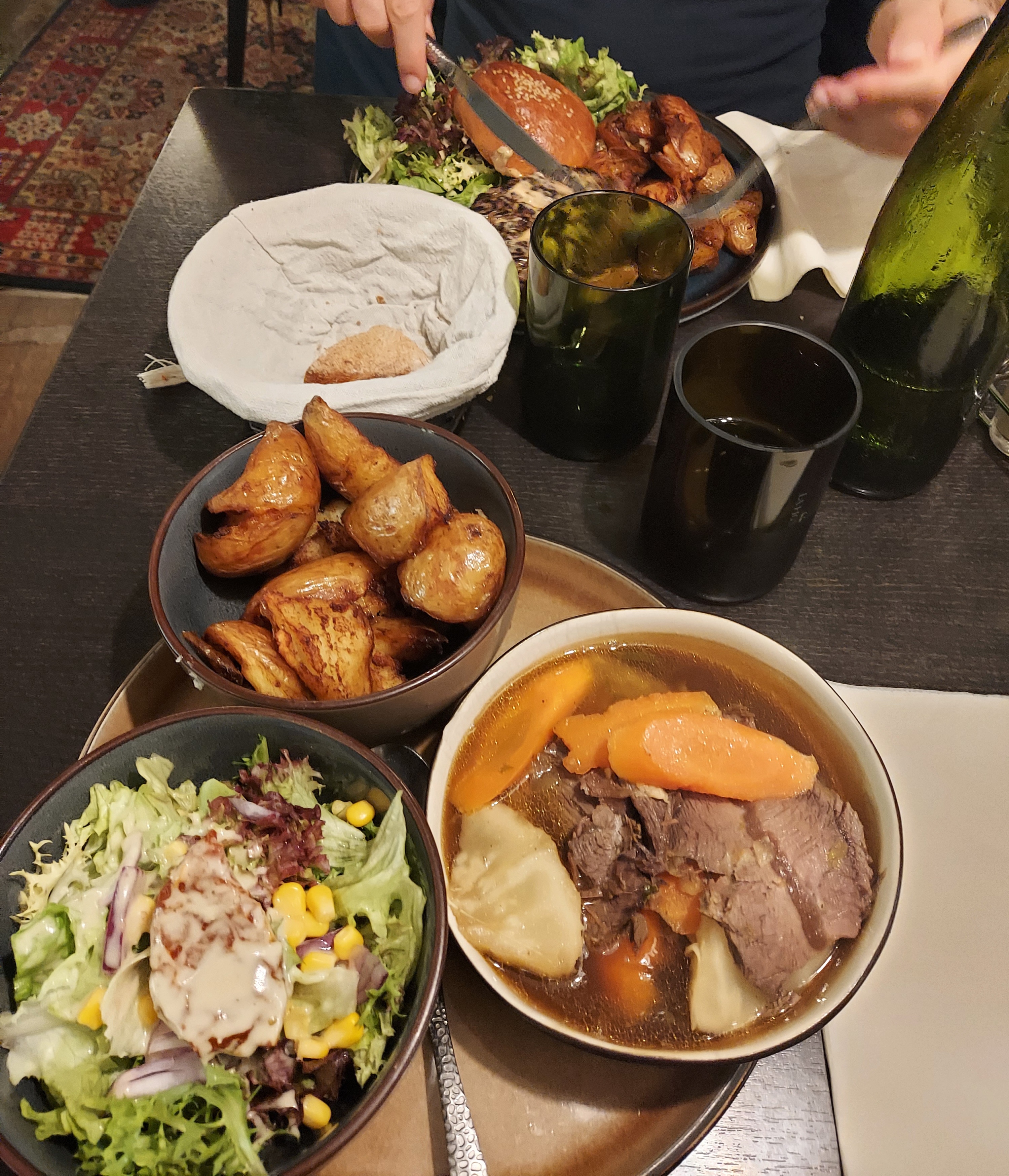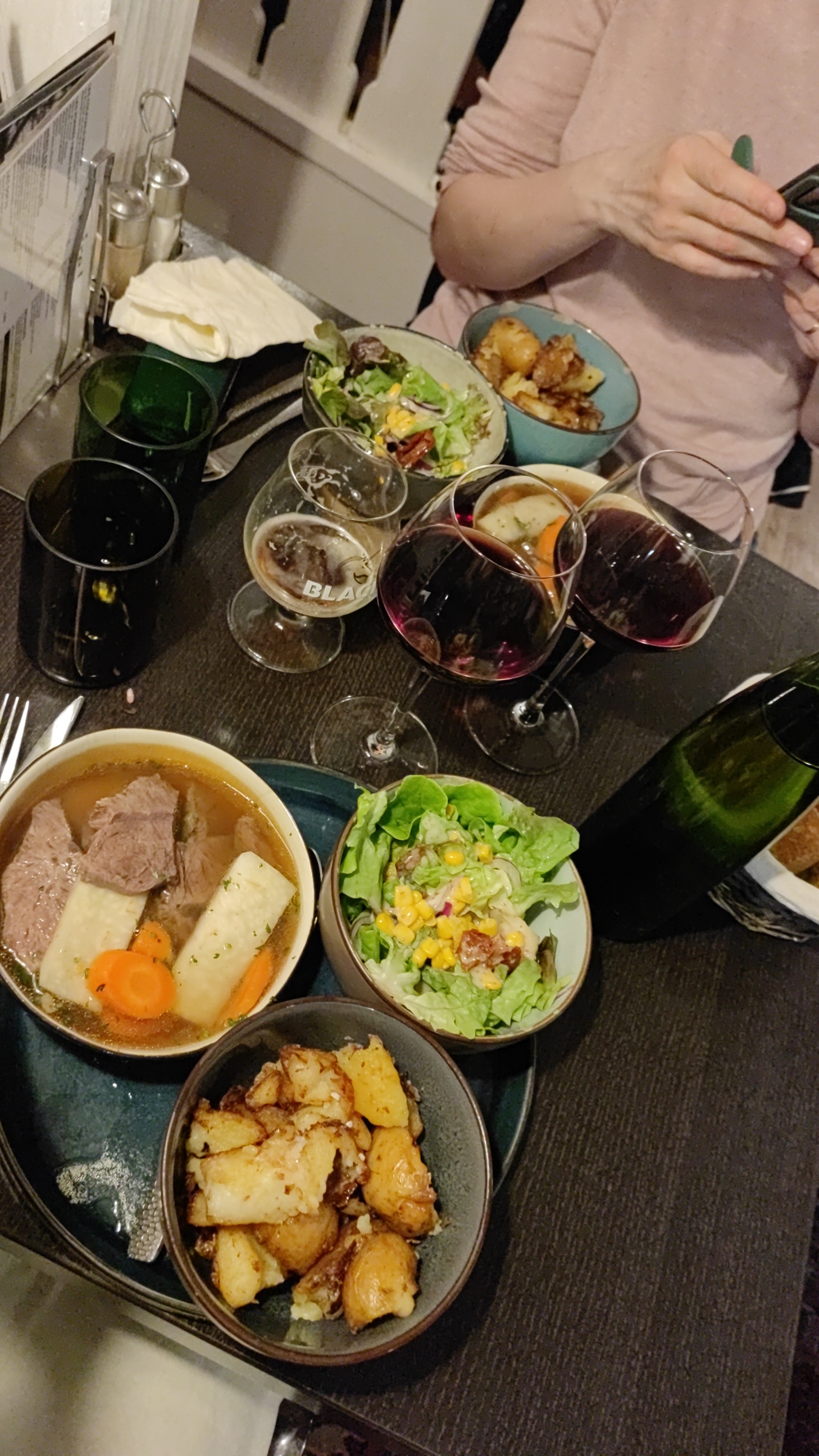 Excellent ! Nous étions 2, nous avions réservé pour 21h mais on a pu être installé plus tôt, ce qui a très attentionné. La cuisine est typique, excellente, mais copieuse, très copieuse. Nous avions pris une tarte flambée à 2, un cordon bleu et un plat du jour (souris d'agneau), nous n'avions pas pris d'apero avant, ni même d'en cas dans la journée, et nous avons peiné pour finir. Le service aussi est parfait, à l'écoute, attentionnés, j'ai posé des questions sur les plats et la serveuse à tout simplement été chercher l'information sans s'agacer alors qu'elle était clairement bien bien occupée (restaurant bondé, des clients qui font la queue dehors) et les serveurs.ses ont toujours le sourire et une bonne humeur. Et très efficace ! Je recommande tout !