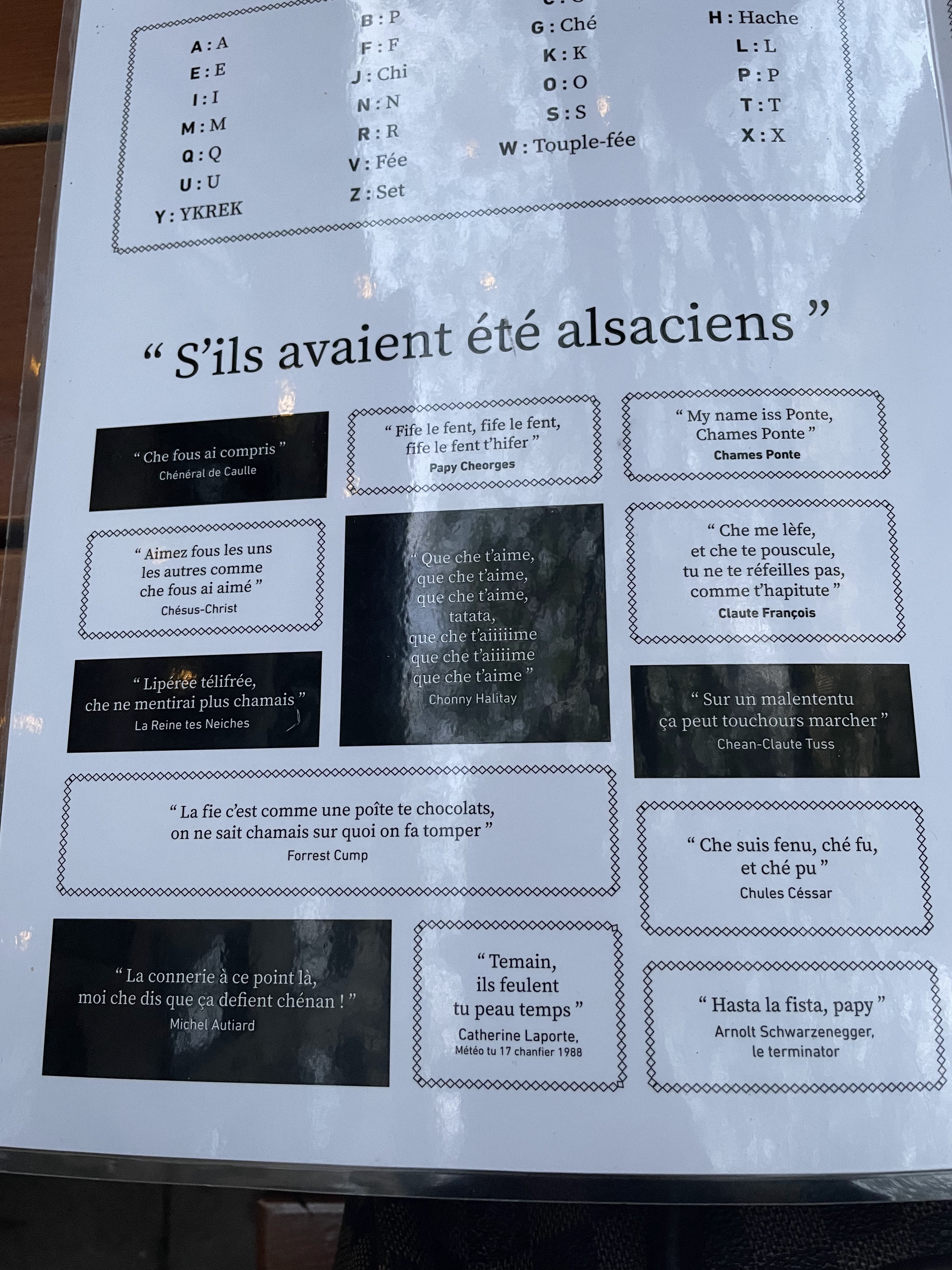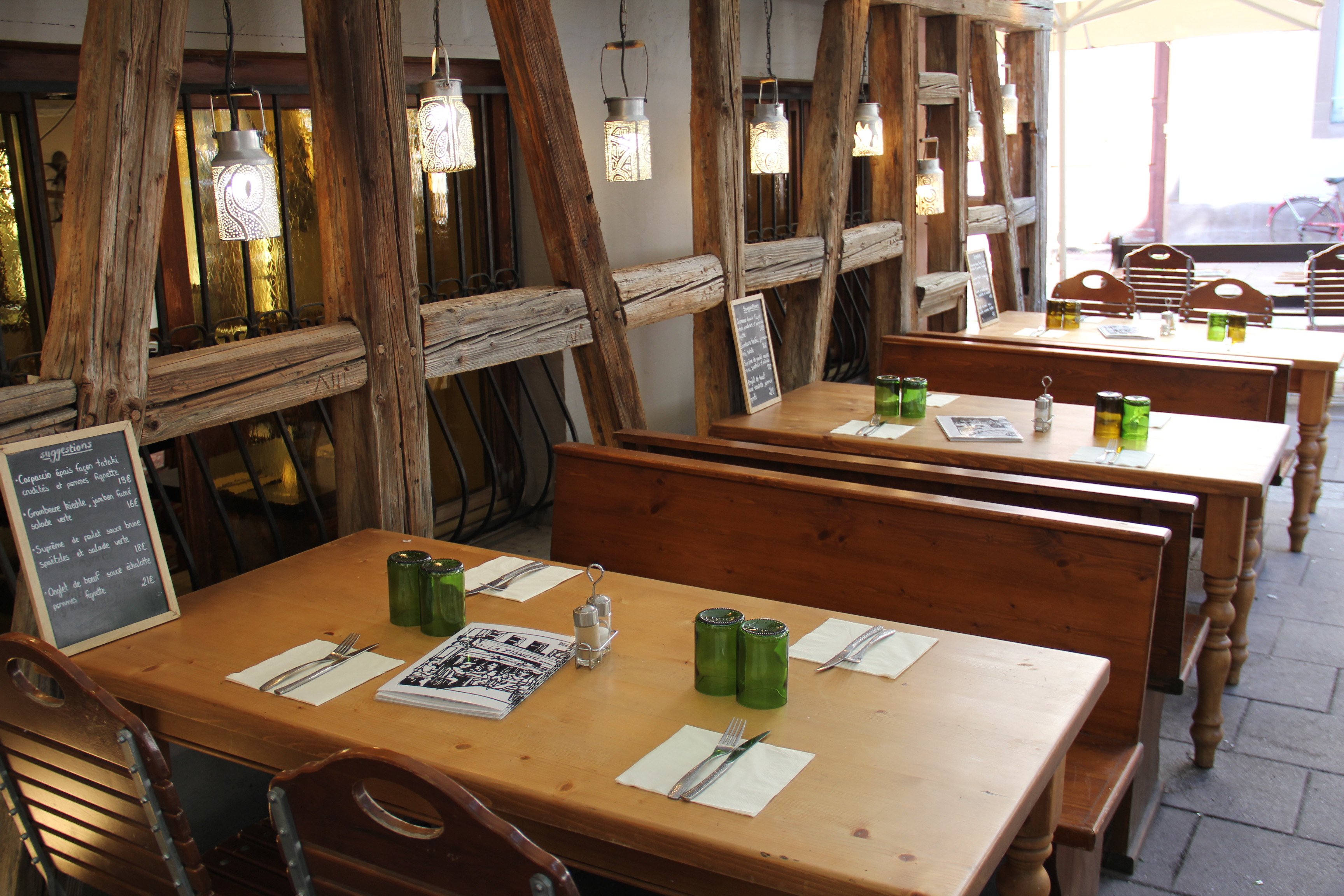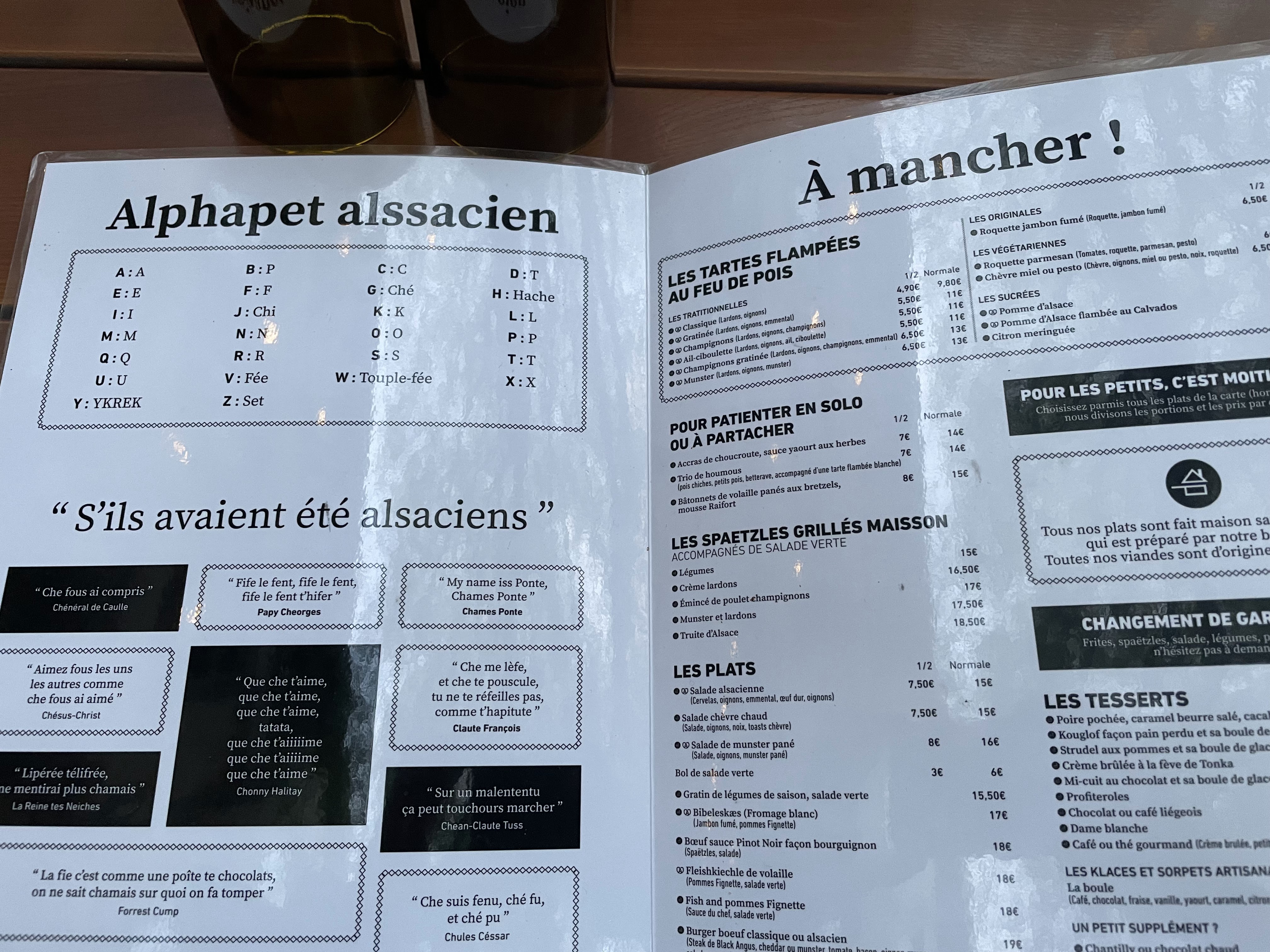J'ai (enfin) eu l'occasion de découvrir cet endroit. On m'avait parlé de l'humour alsacien sur les cartes et qui est déjà annoncé sur l'enseigne. Le cadre est juste magnifique, au point où l'on se croirait dans un restaurant d'un village typique alsacien, mais en ville. Les tartes flambées comme la cuisine sont aussi excellentes. Je dirai même que c'est les meilleures que j'ai mangées jusque là.