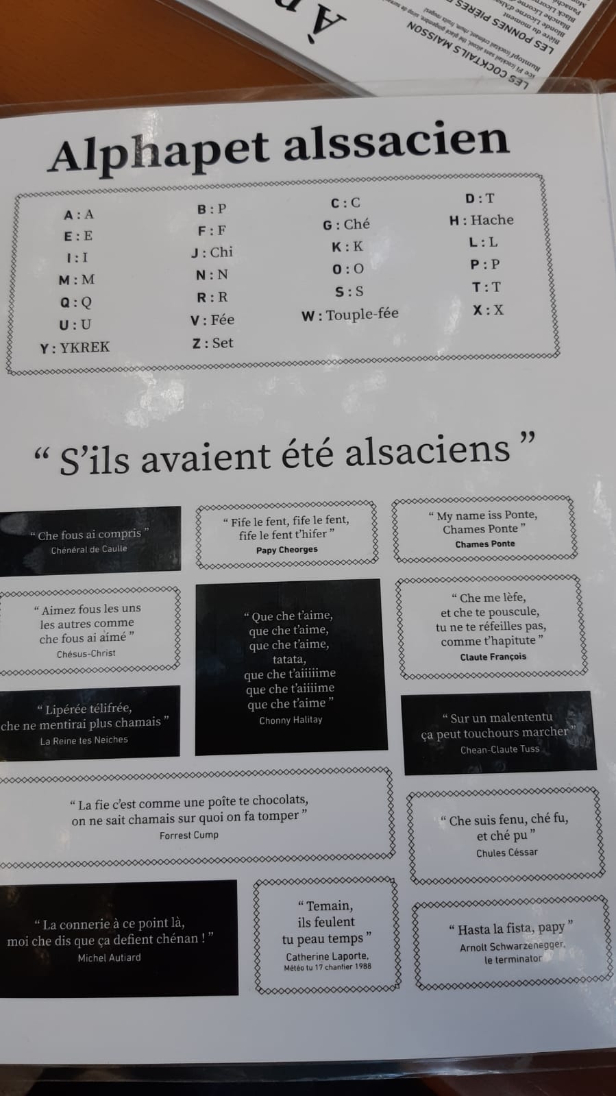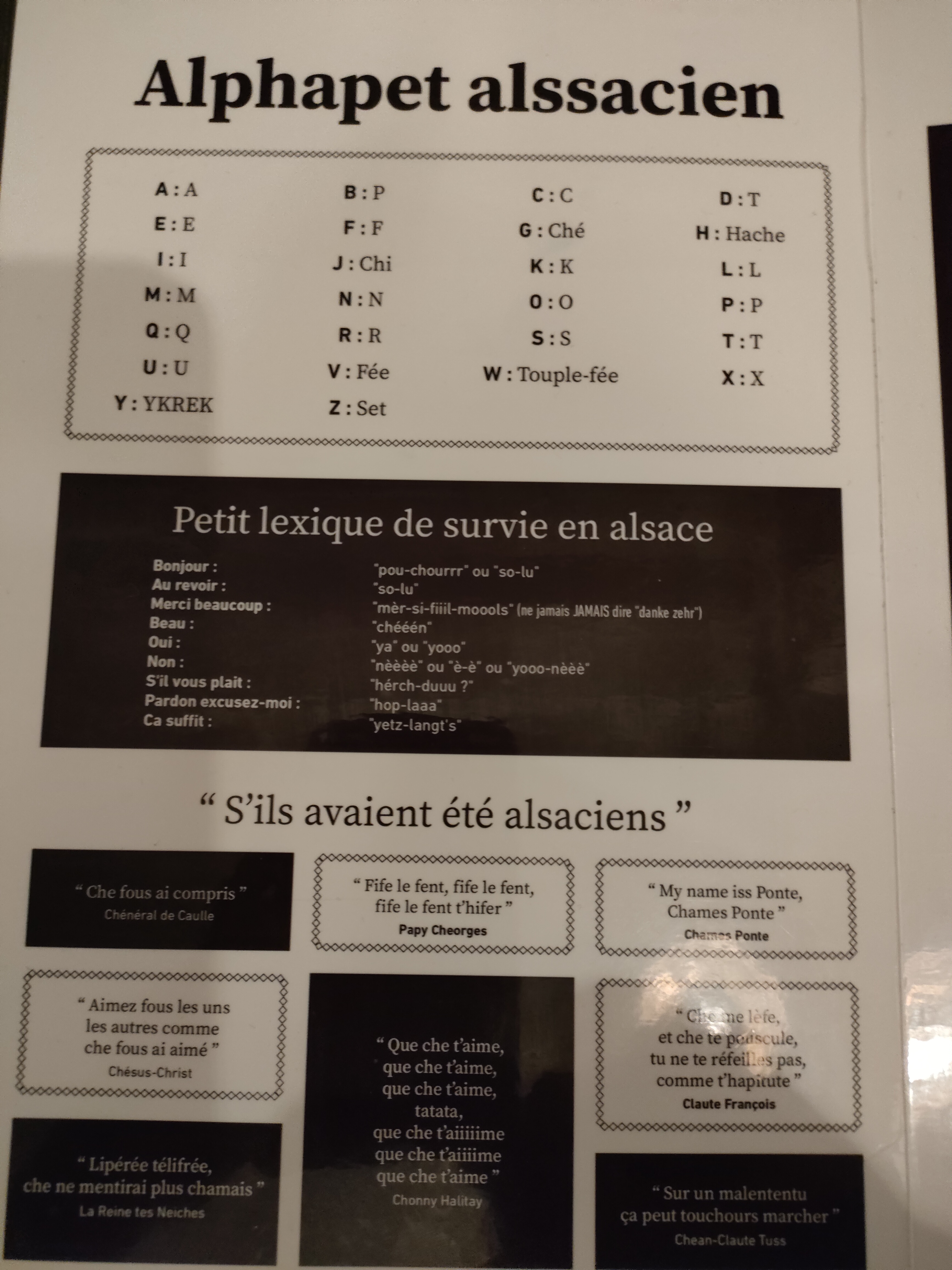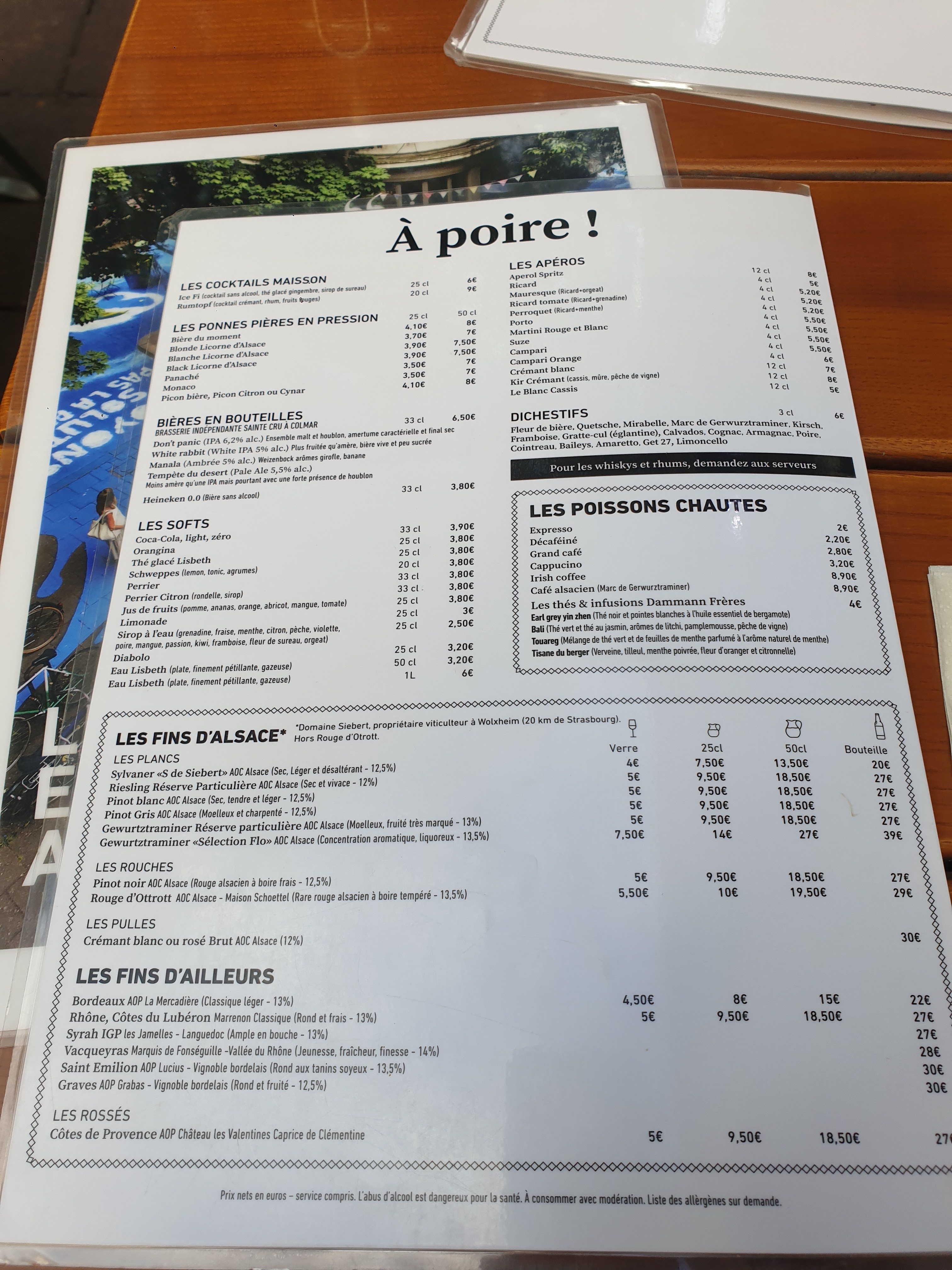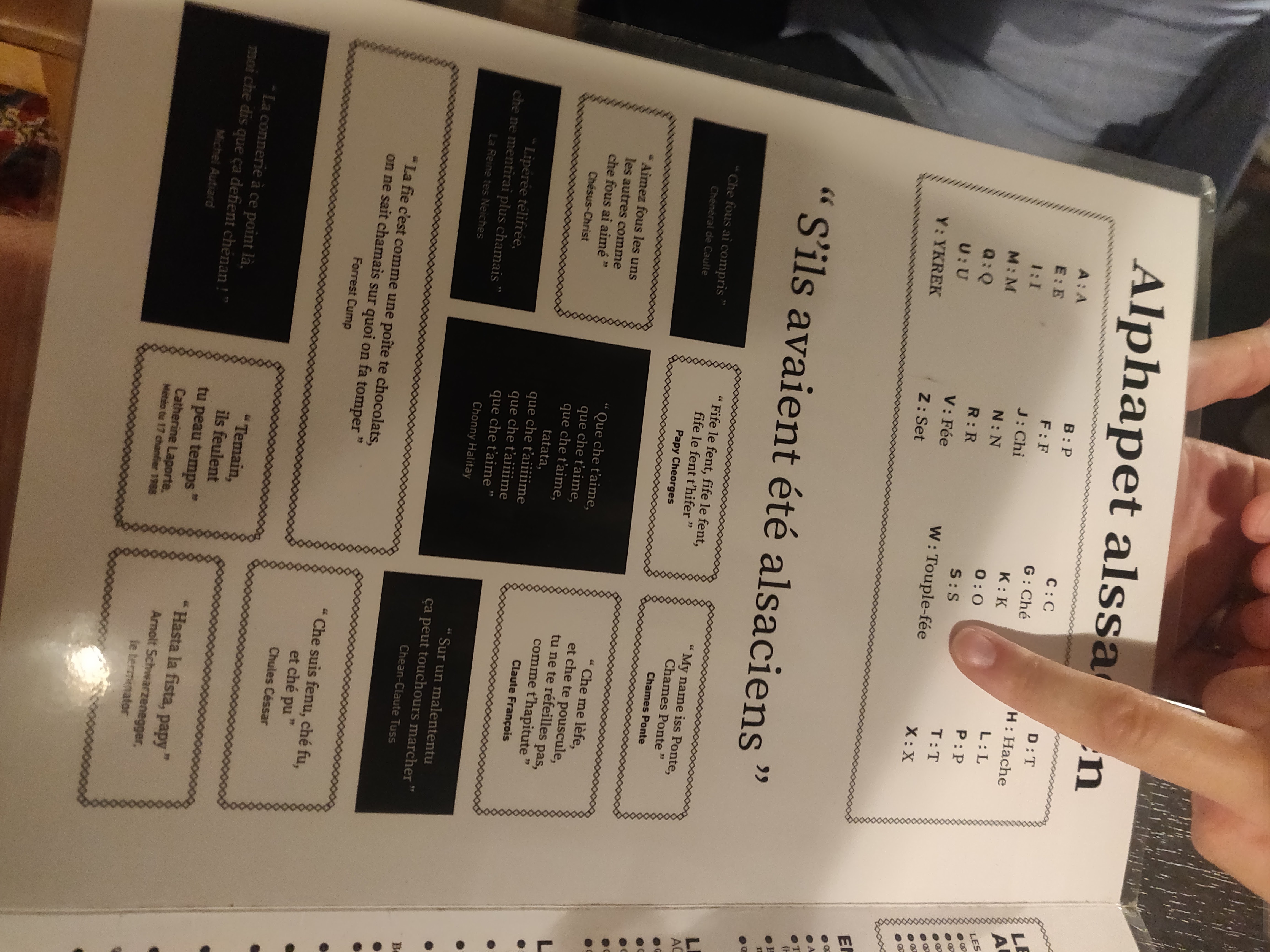 J'ai (enfin) eu l'occasion de découvrir cet endroit. On m'avait parlé de l'humour alsacien sur les cartes et qui est déjà annoncé sur l'enseigne. Le cadre est juste magnifique, au point où l'on se croirait dans un restaurant d'un village typique alsacien, mais en ville. Les tartes flambées comme la cuisine sont aussi excellentes. Je dirai même que c'est les meilleures que j'ai mangées jusque là.