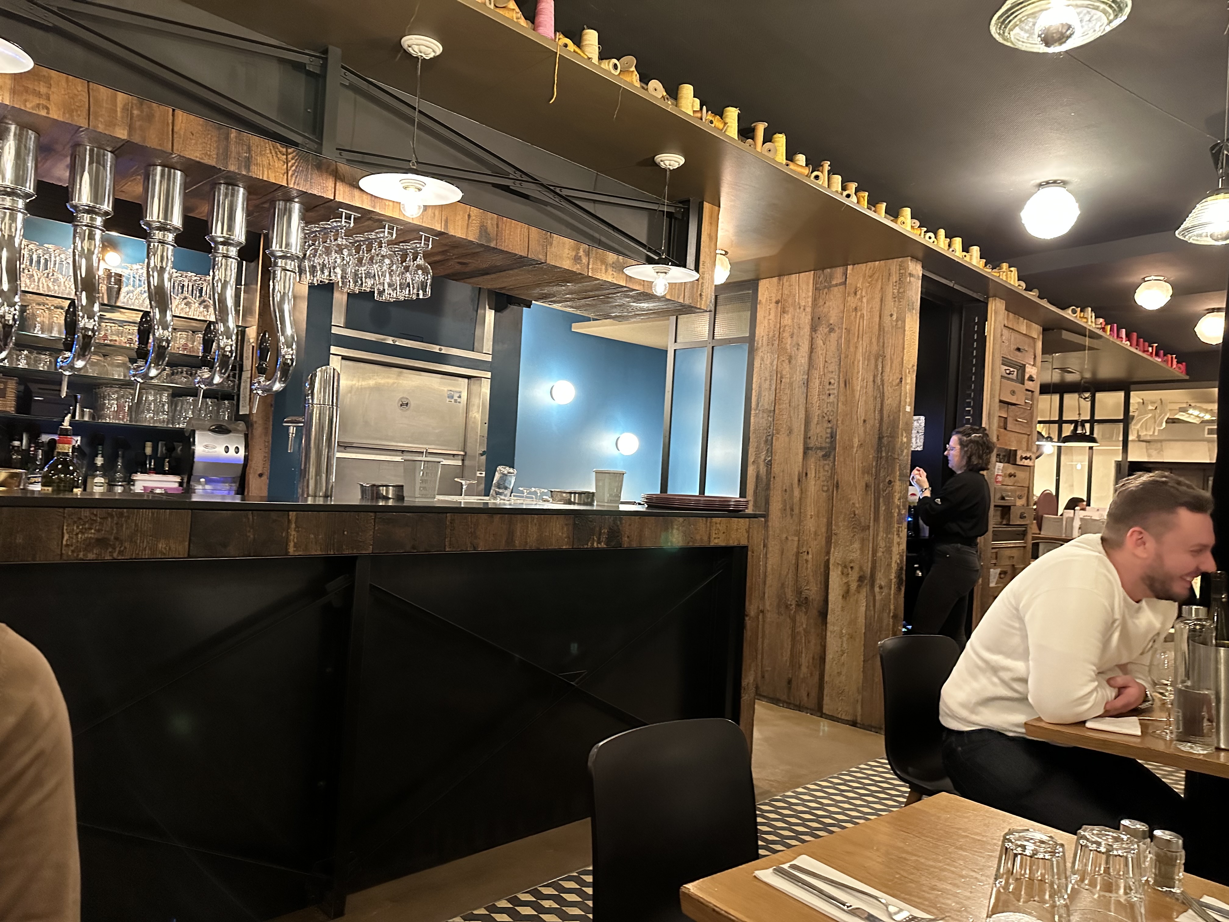 Une soirée très sympathique Reçu par Ange et son équipe jaune nous avons bien mangé dans un beau cadre et surtout la bonne humeur des serveurs. Les lustres sont originaux et jolis. Il faut attendre un peu à l’extérieur pour avoir une table mais ça vaut le détour. Original les nems choucroute. Je recommande.