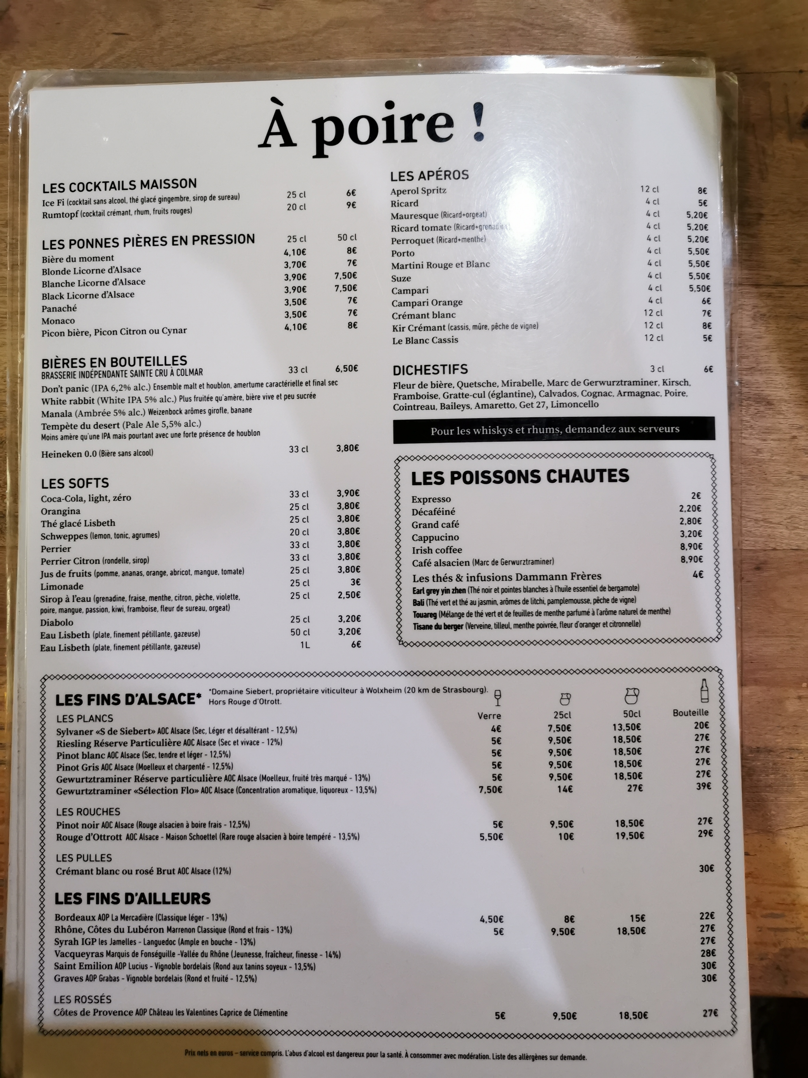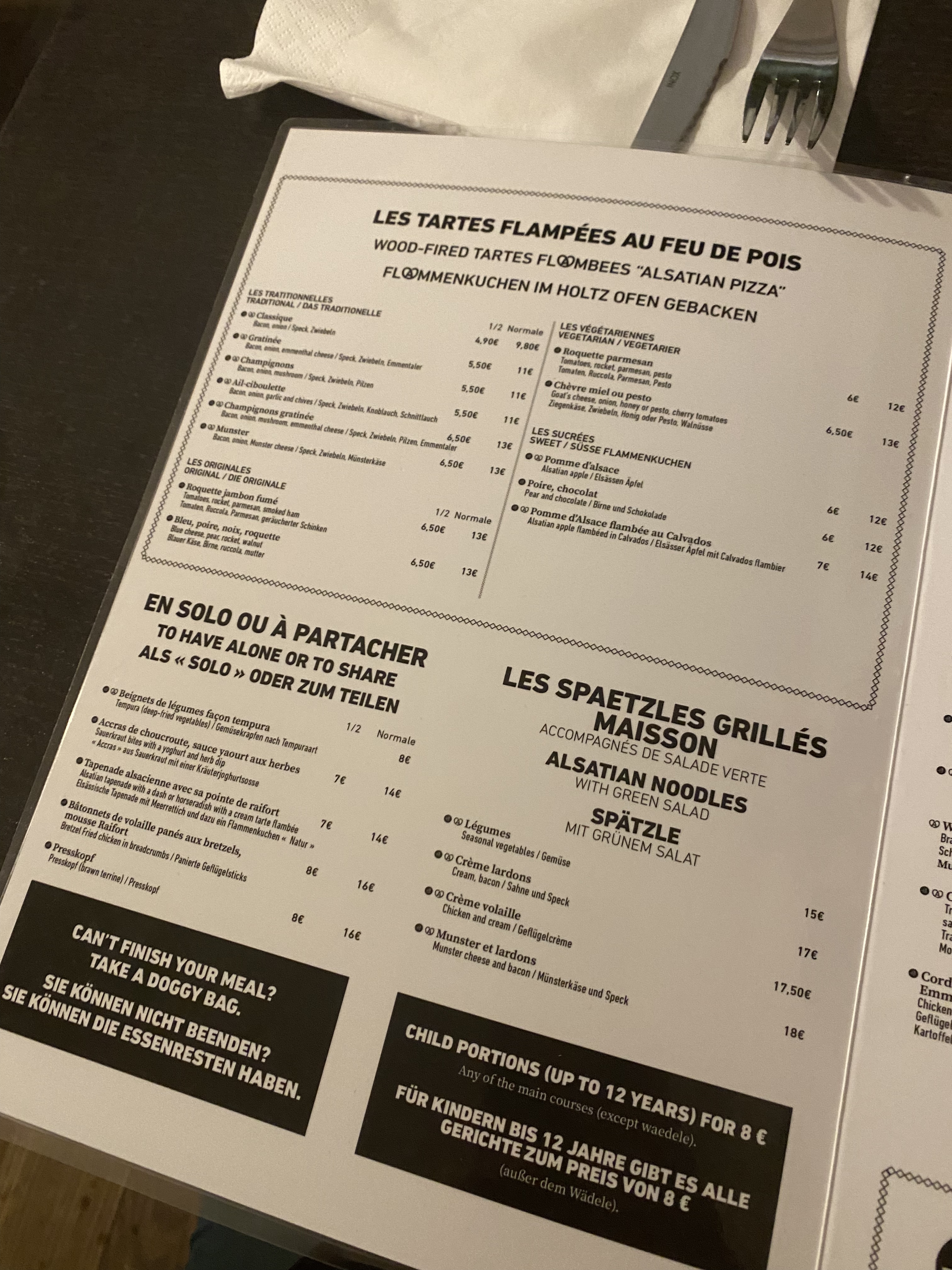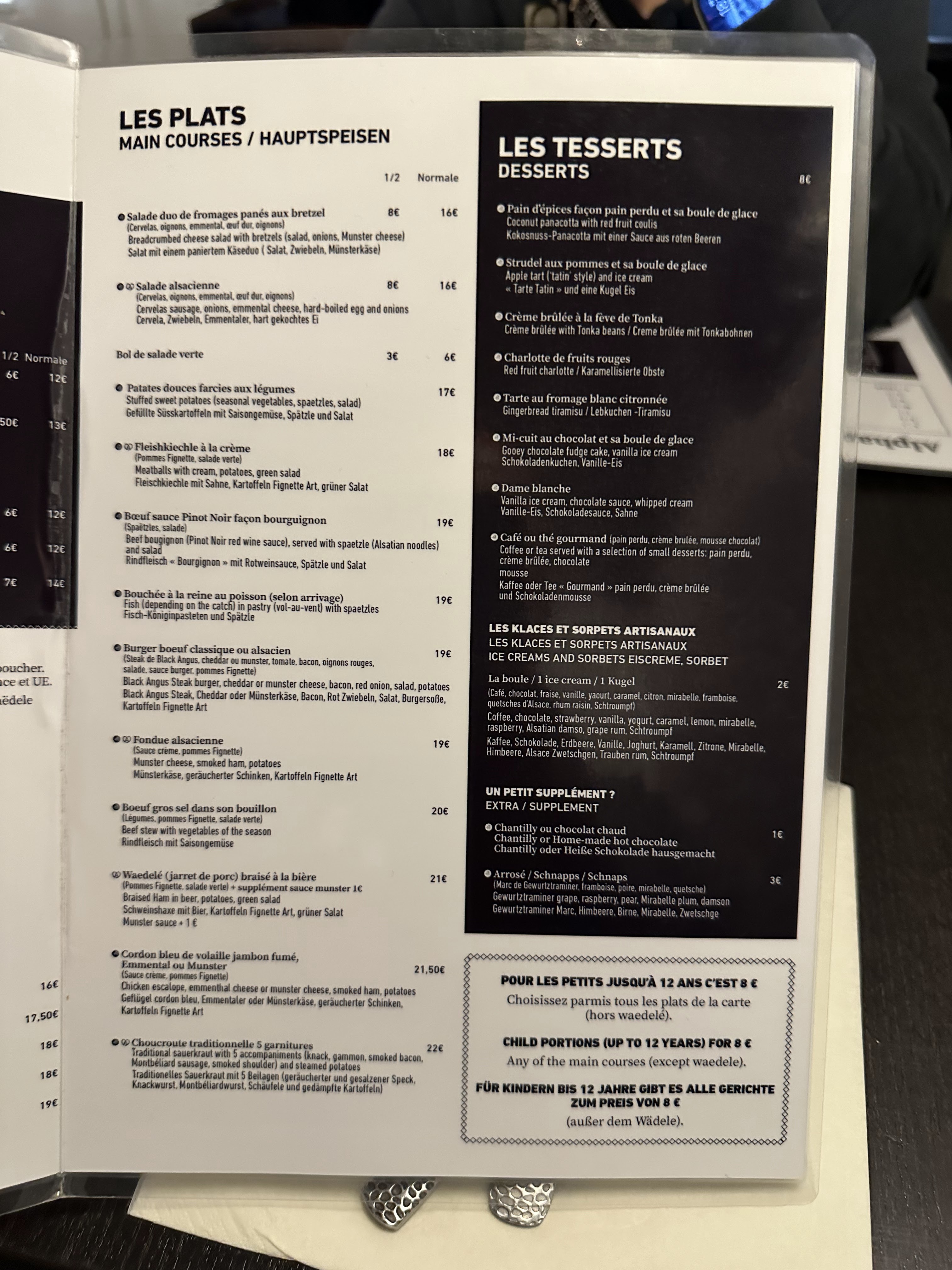 Une carte inventive, pleine de spécialités alsaciennes savoureuses, avec la possibilité de commander des demi-portions qui permet de tester plus de plats différents ! Mention spéciale aux pommes Fignette à la cuisson excellente. L'équipe était aux petits soins avec nous et notre fille de deux ans :) Une adresse à ne pas rater au cœur de Strasbourg, pensez à réserver au préalable !