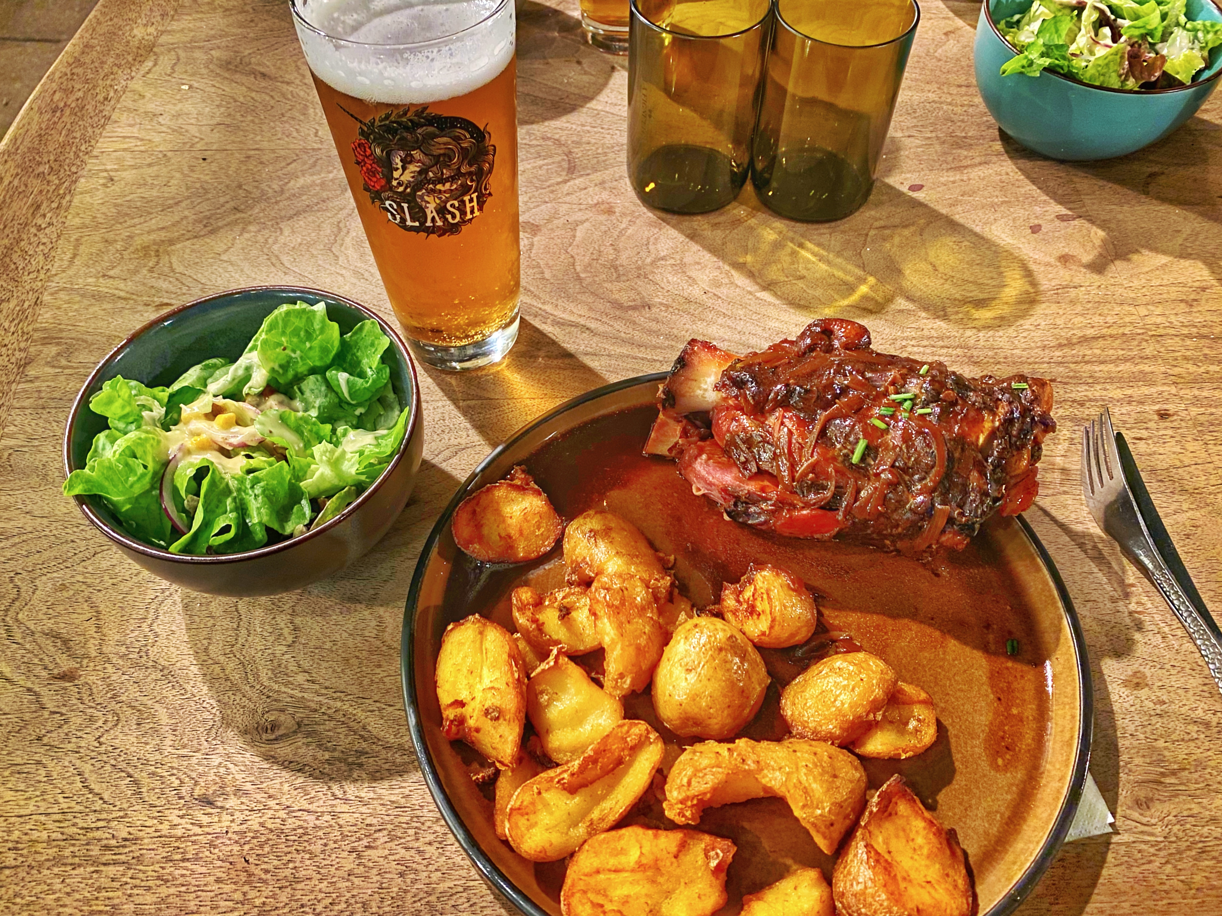 Cadre sympathique et original, accueil chaleureux, aimable et patient. Très prisé, beaucoup de monde, beaucoup de place, bien situé au calme, terrasse sans la foule qui circule au ras de votre assiette. Difficile de faire son choix, tout est tentant. les jarrets au top, la bière du moment exquise, nous étions très contents, notre teckel était admis à l'intérieur, top ! On est revenu pour les tartes flambées depuis...Belle et bonne adresse, prix raisonnables.