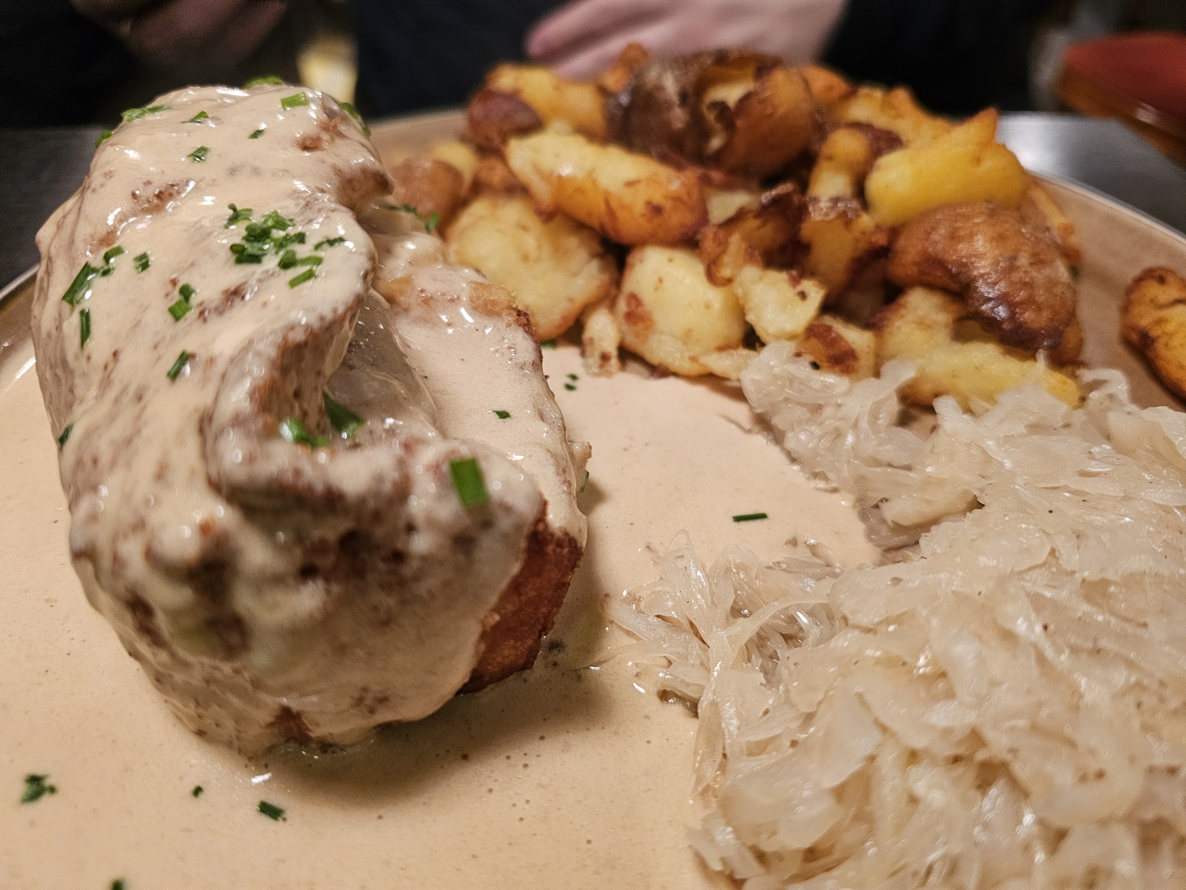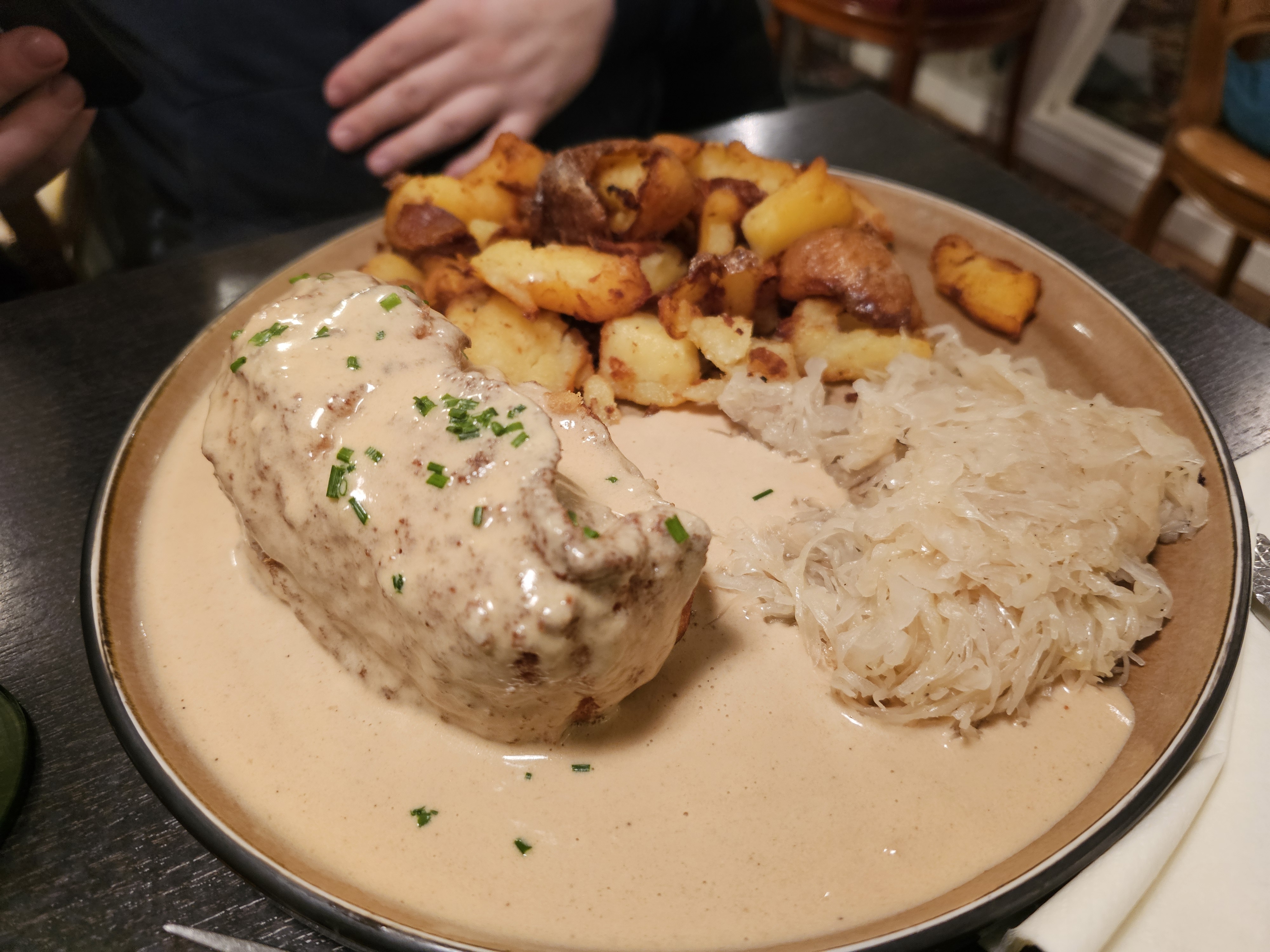 Arrêtés par hasard, nous nous sommes régalés dans ce restaurant. Portions généreuses et du fait maison très savoureux. Le service est impeccablement organisés. La réservation est cependant plus que conseillée ! Une très bonne adresse à un prix raisonnable. En photos, nos plats : choucroute à la truite, fondue de munster et cordon bleu au munster.