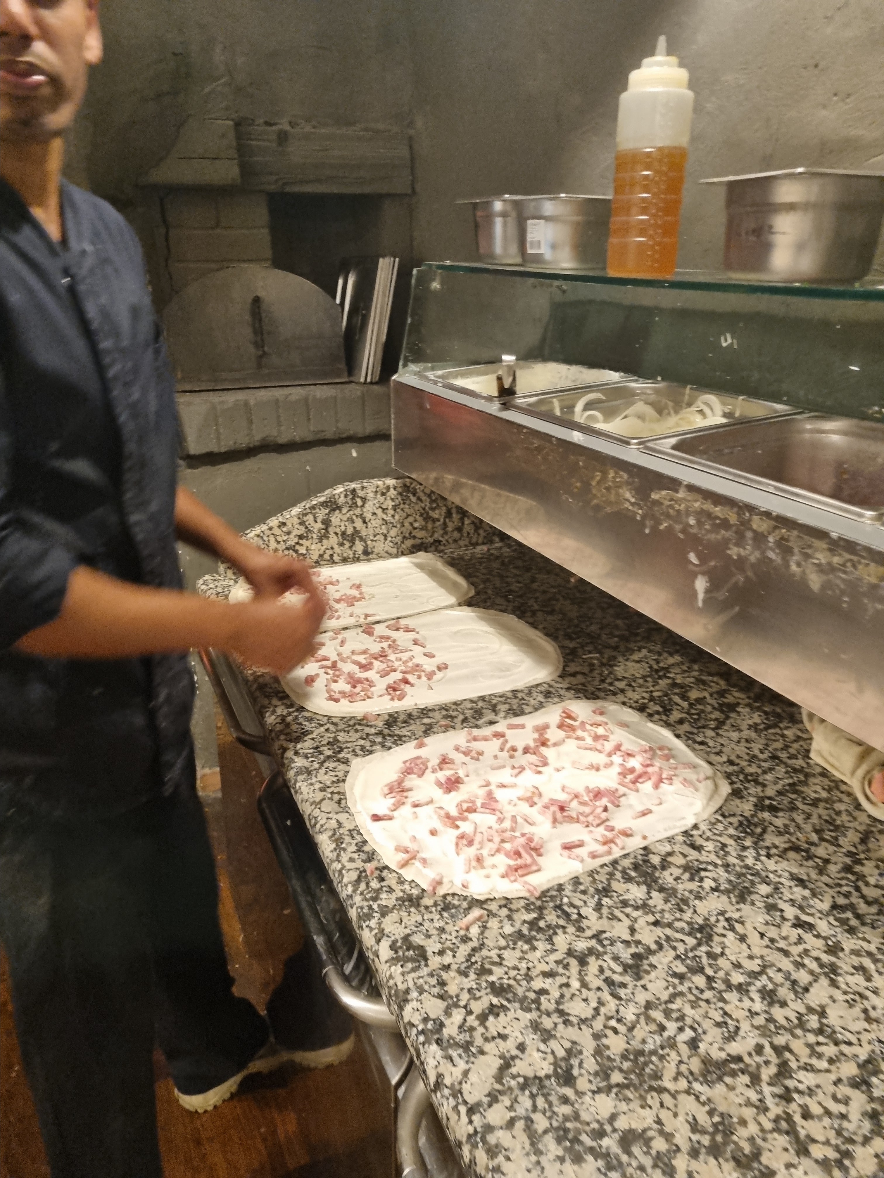 1h30 d'attente un samedi soir de décembre mais ça en valait tellement la peine. Les serveurs et serveuses nous offrent une bonne humeur incroyable ainsi qu'une bonne ambiance. Les tartes flambées sont délicieuses, les meilleures que j'ai mangé. Les prix sont très bien en rapport avec la qualité. Recommandé mille fois, même par -4°C avec de l'attente c'est pour dire à quel point ça vaut le coup!