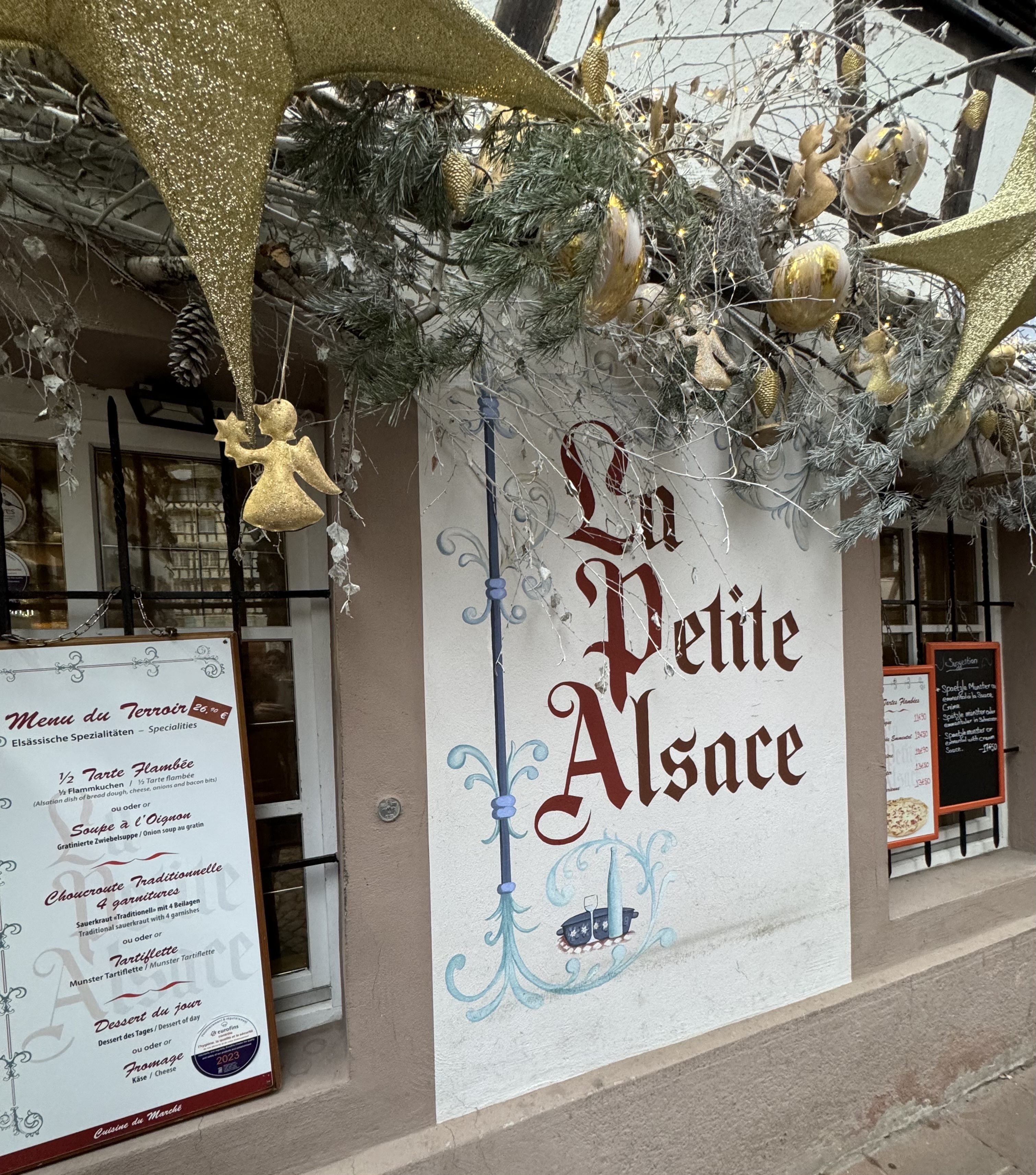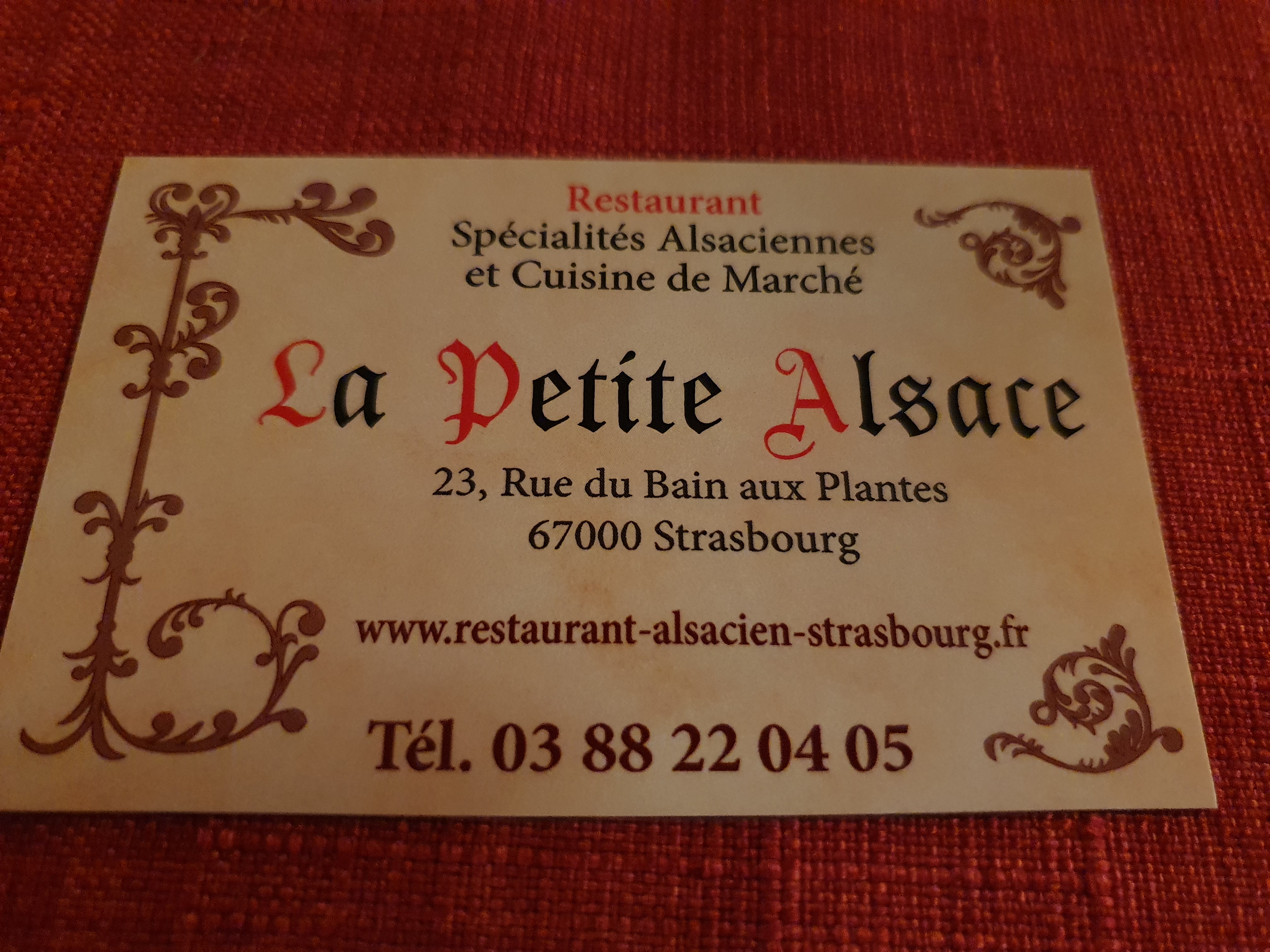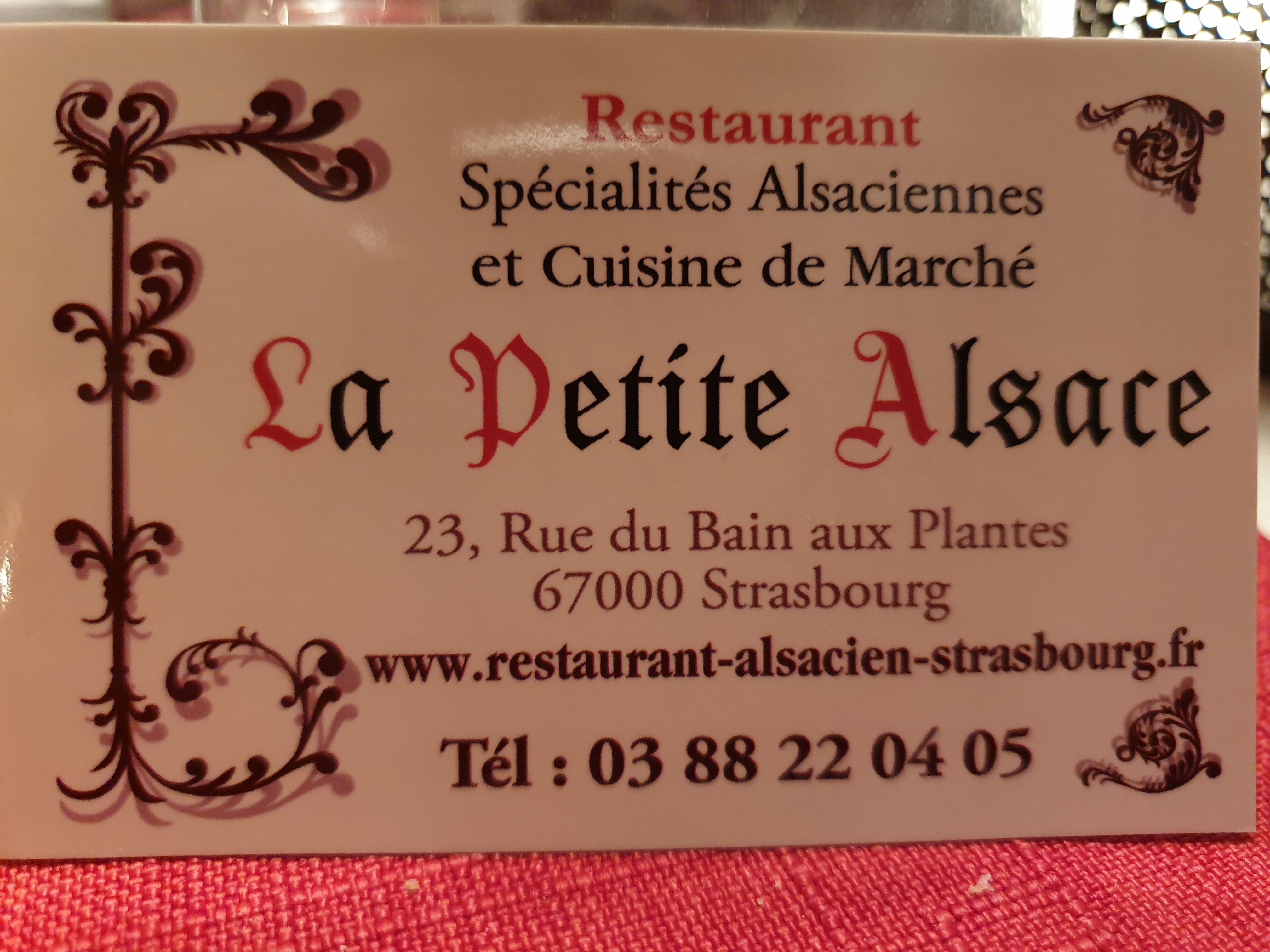 On nous avait donné l'adresse d'un restaurant, le Thomas Stuebel qui était malheureusement fermé. Nous avons trouvé la petite Alsace, là ou les avis n'étaient pas trop mauvais. Le décor dans son jus, la choucroute bonne, la flamenkuche moyenne. Surtout le plus désagréable la serveuse qui parlait avec le cuisinier de tout et de rien. De la discrétion eu été la bienvenue, Hormis cela en s'adressant à nous, elle était charmante. Mais je n'en ferait pas mon restaurant favori.