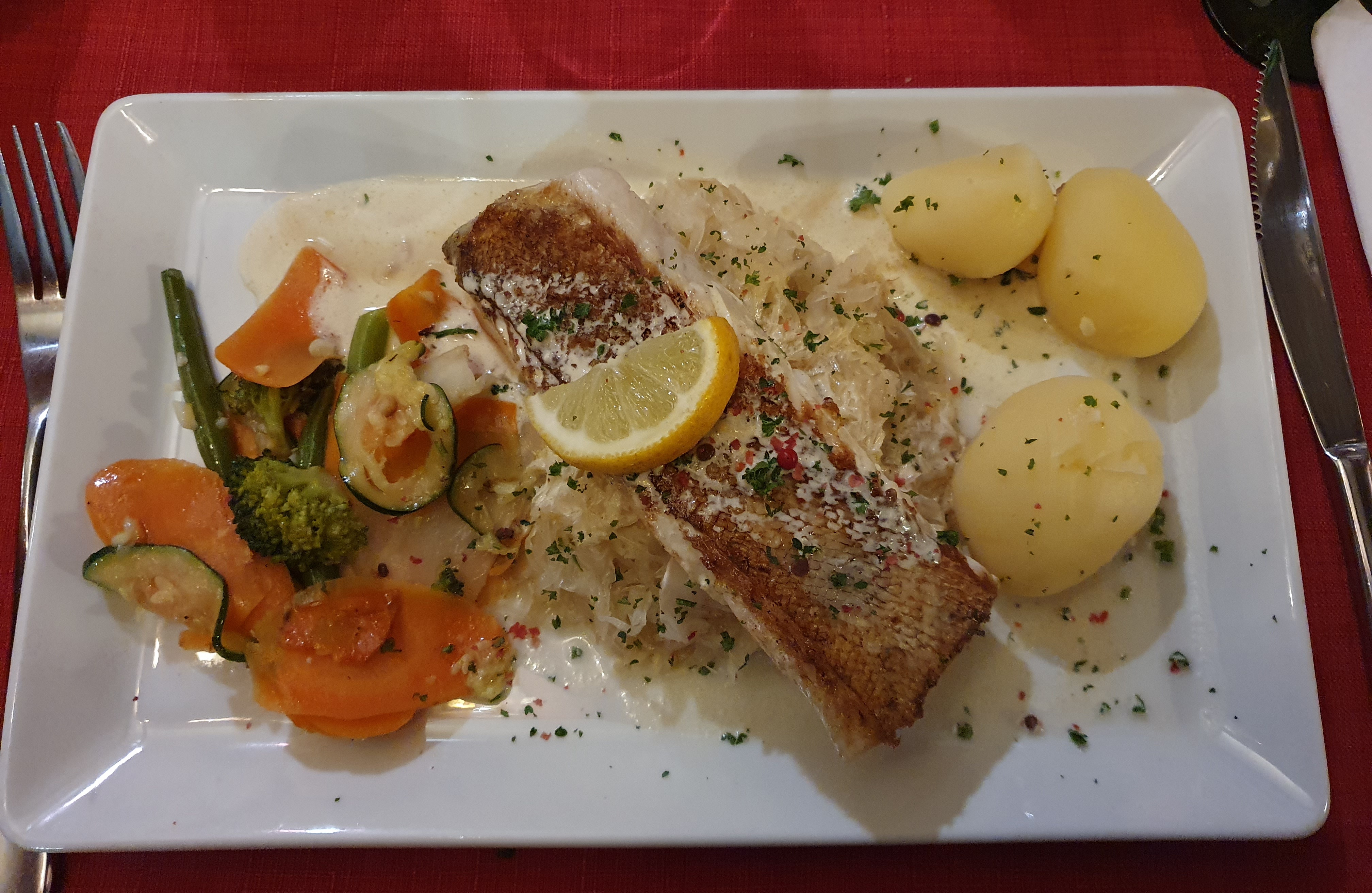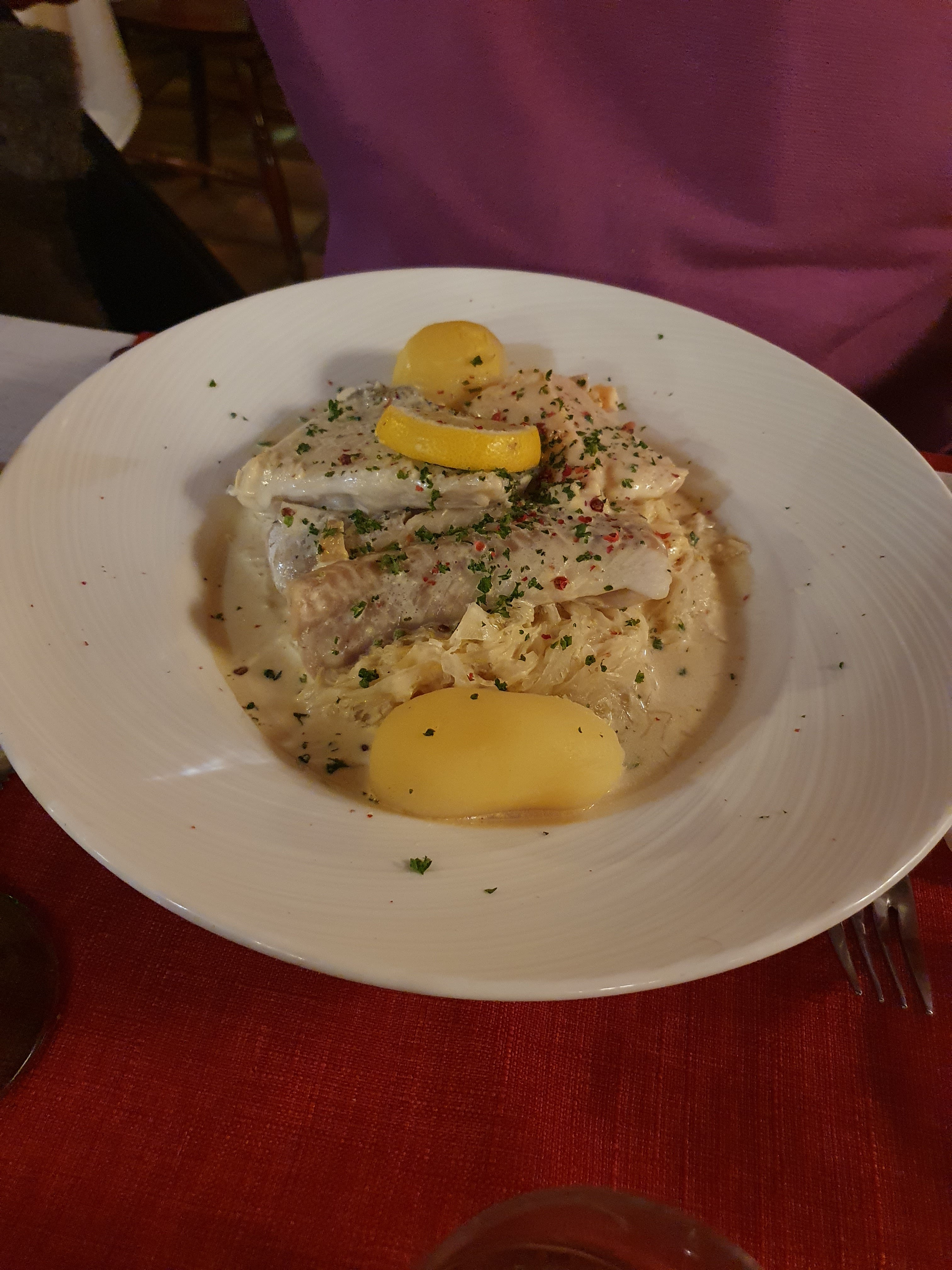 Excellent ! Qualité/prix est au rendez vous... nous nous sommes très bien régalés avec pour ma part juste un plat, une Choucroute aux trois poissons, très copieuse; et pour mon conjoint un menu à 24€ qui est composé d'une entrée, d un plat et d un dessert. Chantilly maison ! 😋 Si vous avez des hésitations pour le vin, demandez à vous faire goûter. On vous le recommande... 😊