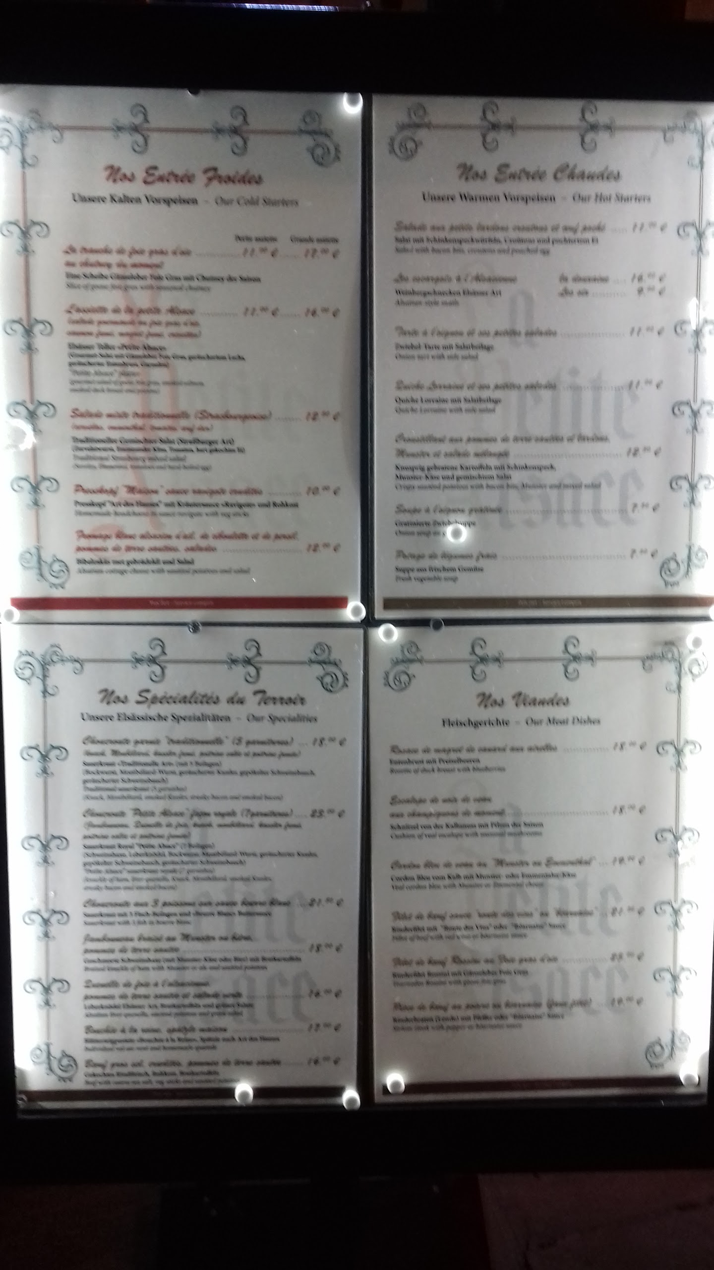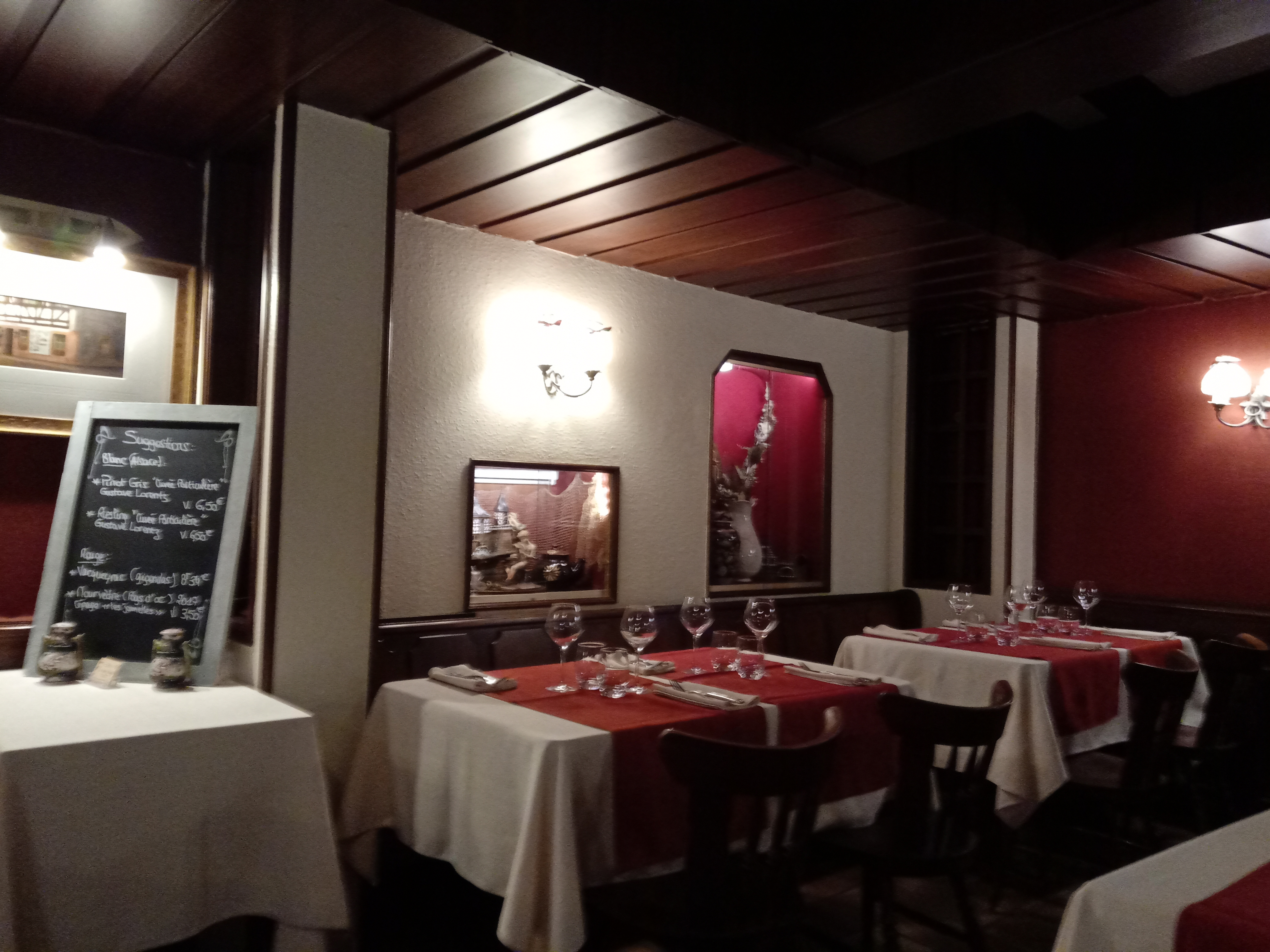 Malheureusement très déçu de la cuisine!!! Pour la soupe à l'oignon aucune saveur aucun oignons, plat traditionnel baeckeoffe les pommes de terre etait dure, sèche grise et sans saveur le vin blanc inexistant dommage...