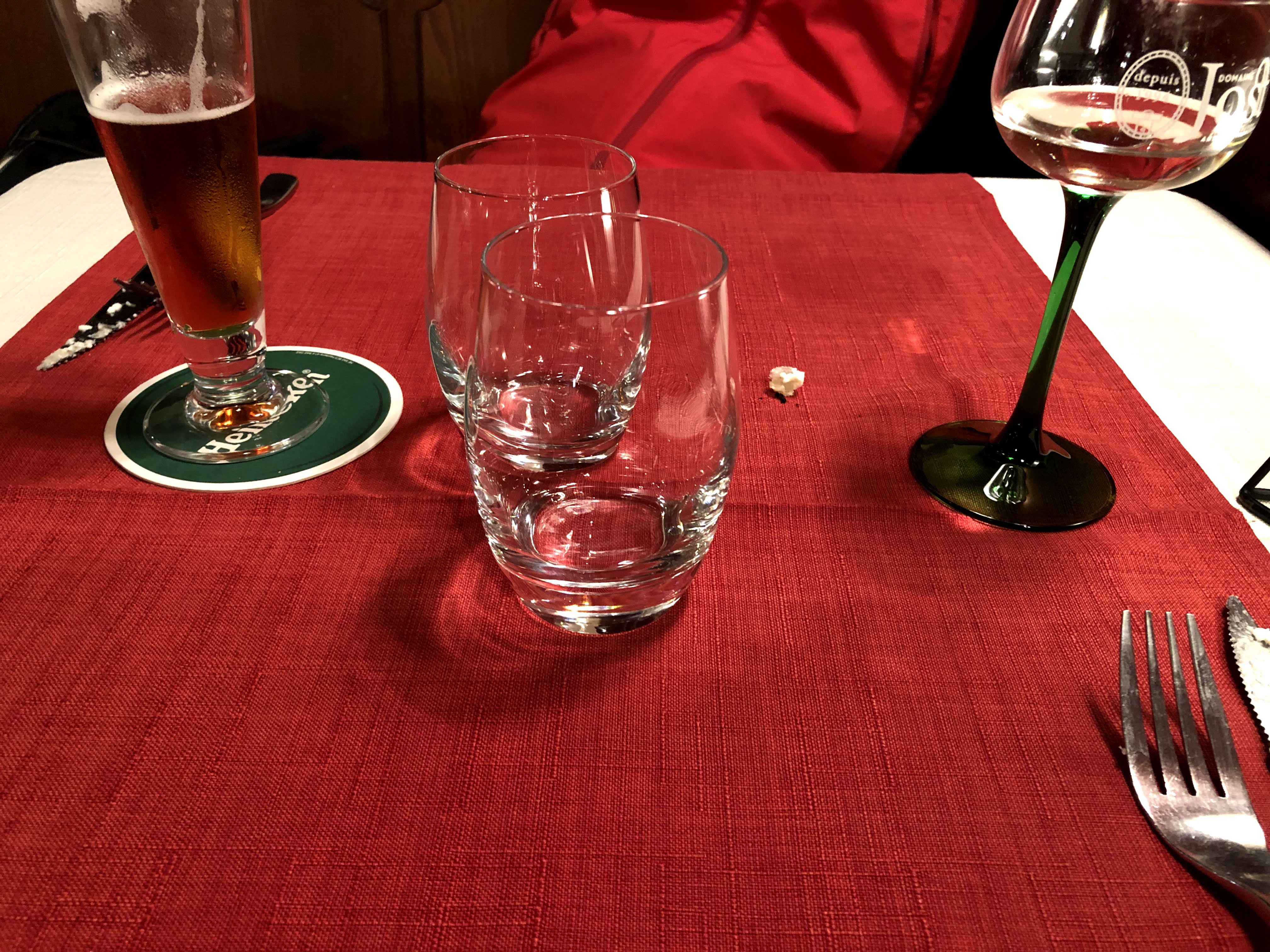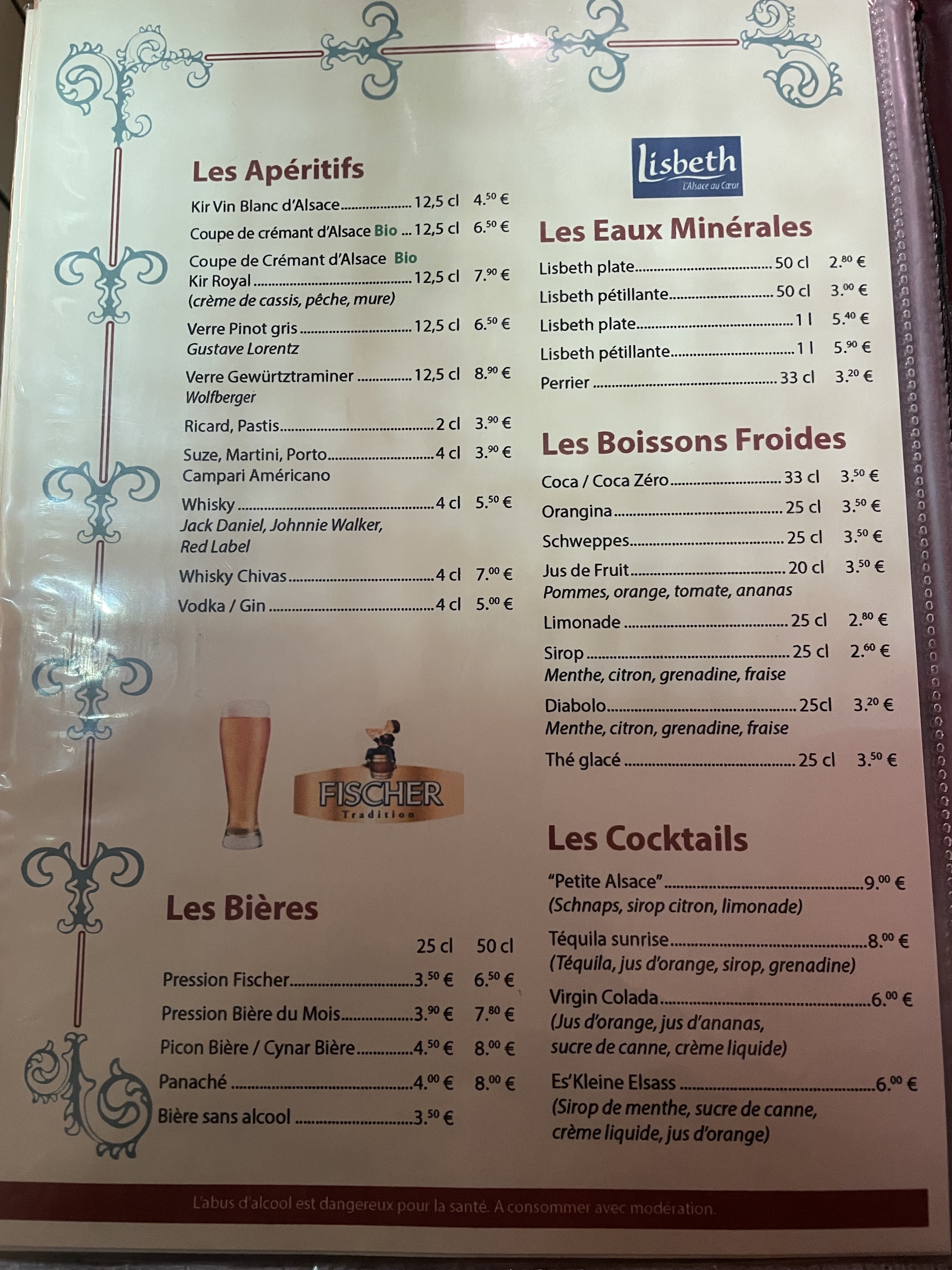 Pour info nous étions Deux et nous avons pris: Escargots à l’Alsacienne par 6 + Choucroute Traditionnel + Nougat Glacé Quiche Lorraine + Bœuf Sauce au Vin + Mousse au Chocolat ainsi qu'un Fischer et une Bière brune ( qui était la bière du jour) Nous avons passé un très bon moment. Le Personnels étaient serviable et souriant. Le Cadre était très atypique. Et surtout la cuisine était délicieuse. Recommande vivement.