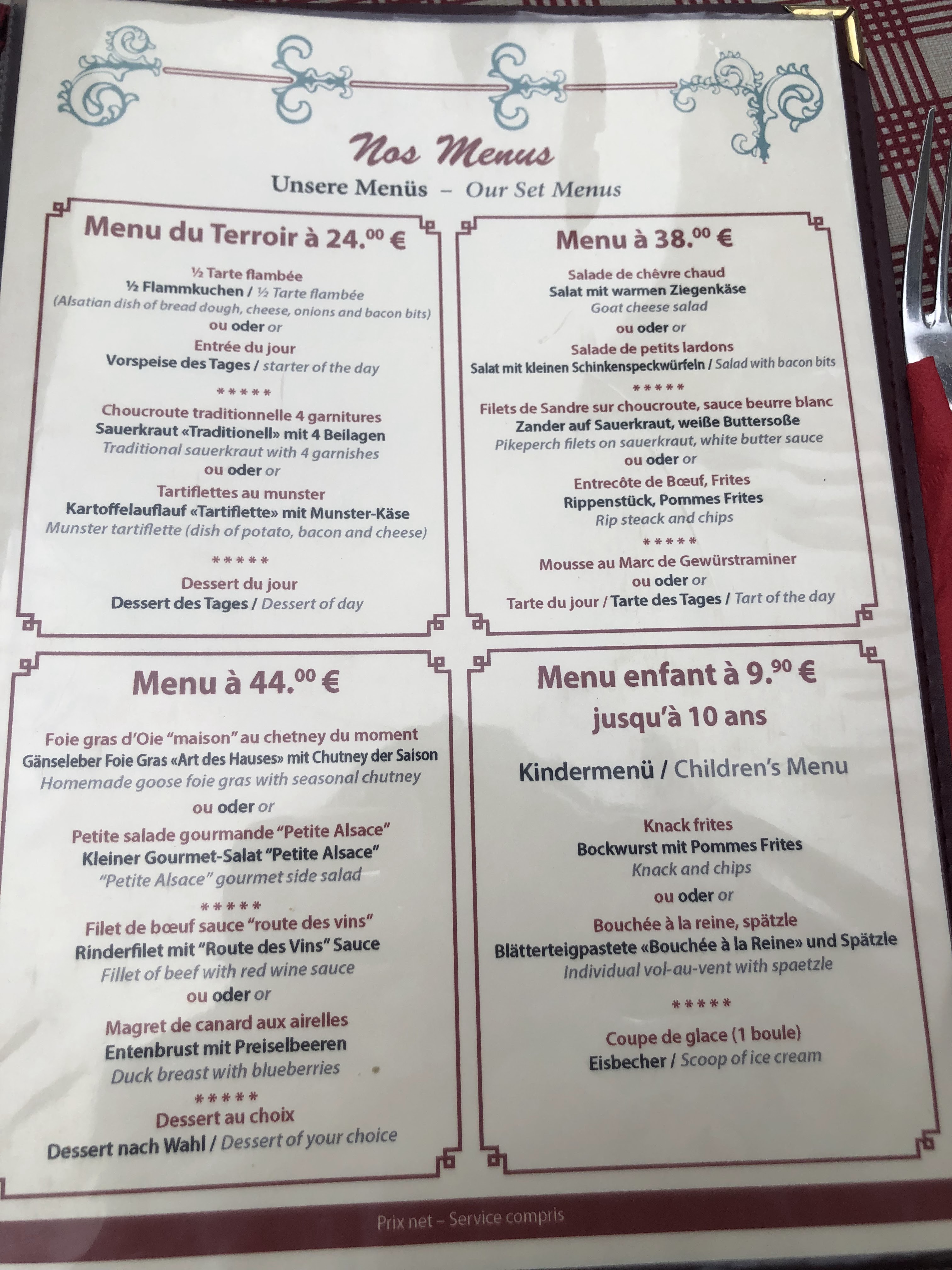 Excellente expérience alsacienne !! Très bon menu proposé à 26,90€ qui permet de déguster un panel de l'art culinaire local !! Un service aux petits oignons et un très bon rapport qualité prix...À recommander 👍
