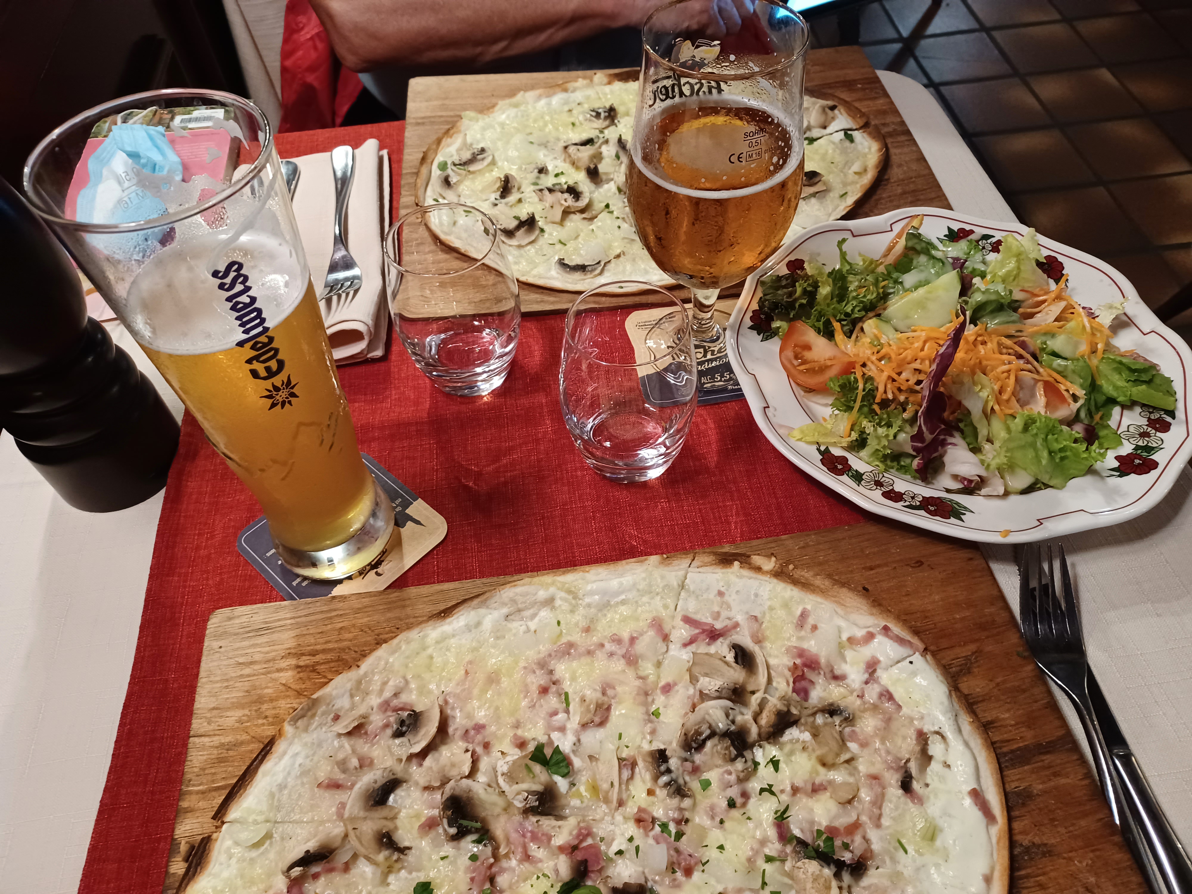 Avons mangé dimanche en terrasse. Bien abrité sous les parasols minis se gouttières. On s'est régalé avec tarte flambée et salade César.
