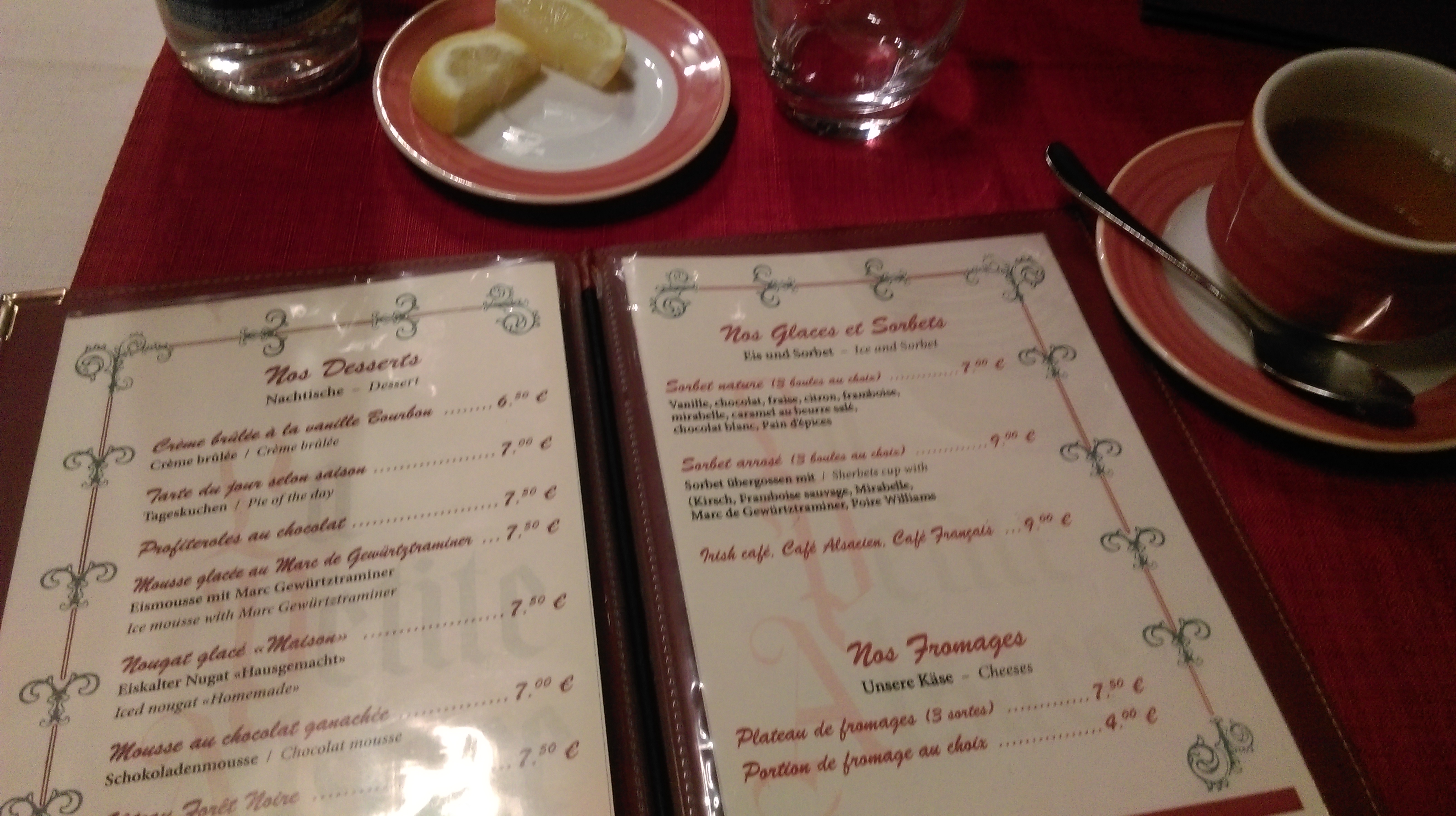 Dessert un peu cher en dehors des menus. Mais service impeccable, personnel accueillant et sympathique. Et la choucroute est a tomber parterre!! Je recommande vivement !!!