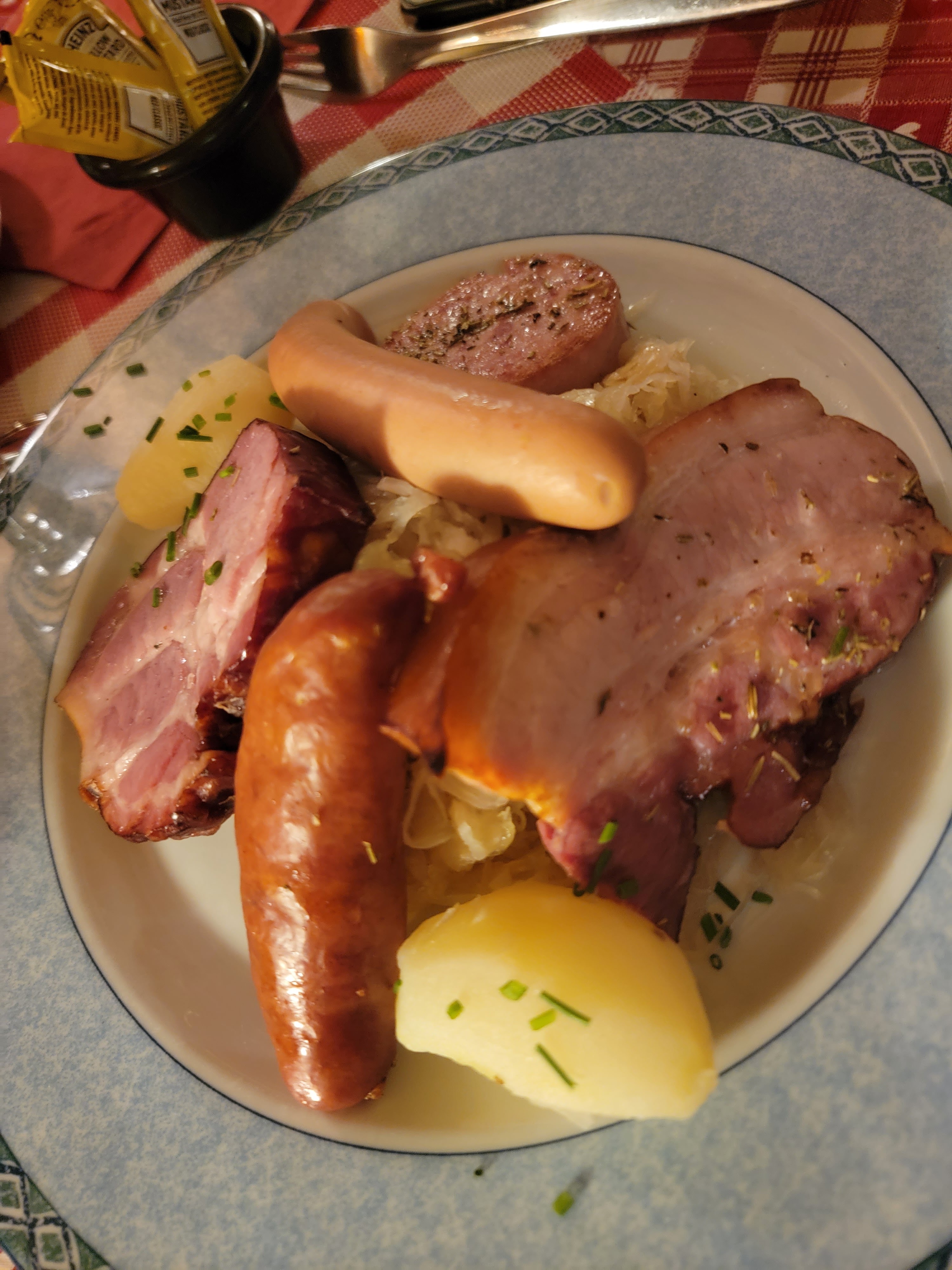 Choucroute très bonne, quantité bien proportionnée, le dessert est bon, pas de réservation possible pour ce week-end de l'ascension, il faut s'y présenter.