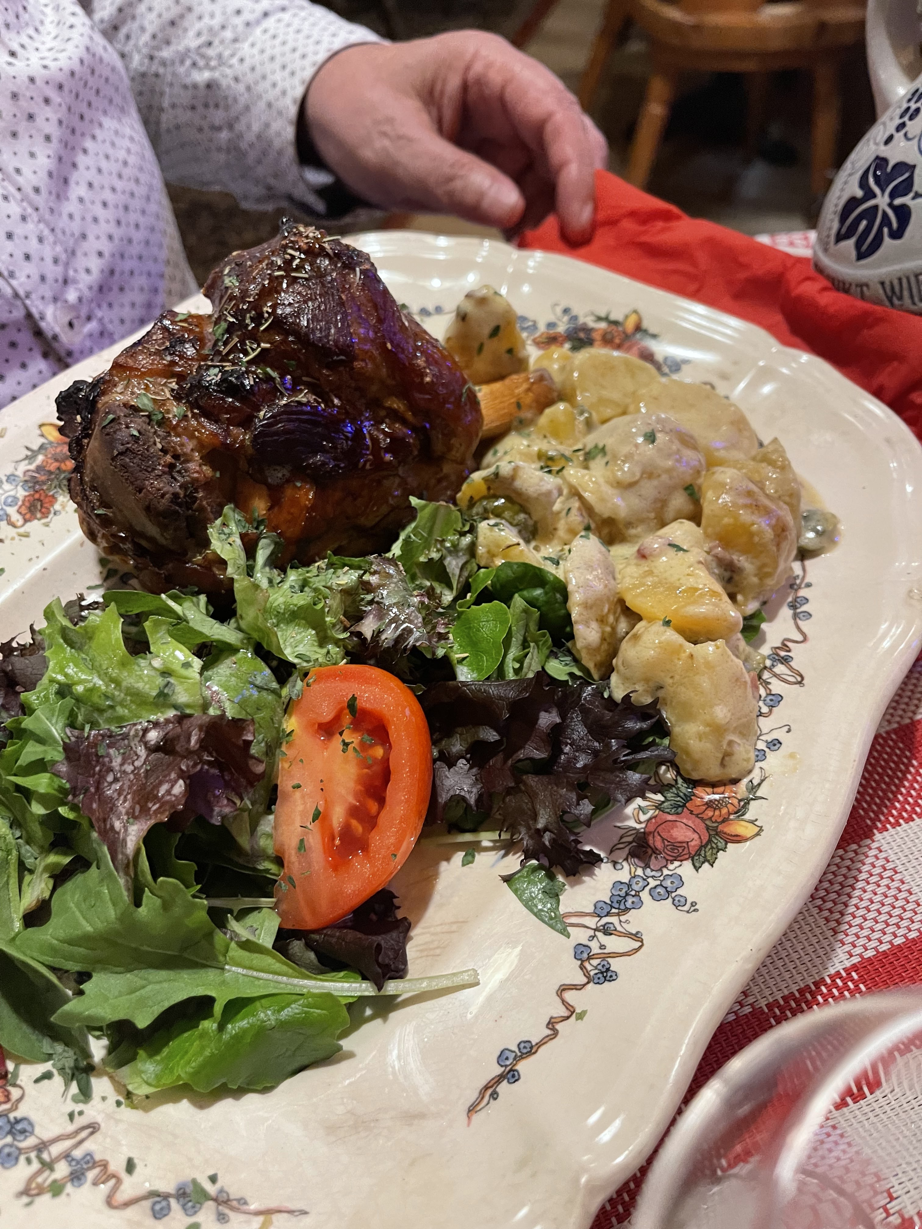 Malheureusement, nous avons été très déçus du restaurant. Pour commencer, nous n’avons pas eu de chance et avons été placés à une table juste derrière la porte d’entrée. Il faisait -6 degrés à l’extérieur, donc nous étions glacés à chaque fois que quelqu’un ouvrait la porte. Pas très agréable de manger en claquant des dents. De plus, le fondant de Jambonneau Braisé aux Thym et au miel, ne contenait pas de miel ou bien alors le goût du miel était inexistant. Nous pouvons voir que sur la photo de ce plat sur Google, le Jambonneau est servi avec des pommes de terres au four et des saucisses mais l’assiette servie ne ressemblait pas du tout à la photo. Le Jambonneau était servi avec un peu de salade verte et de la salade de pomme de terre et lardons. Beaucoup trop cher pour ce que c’est.