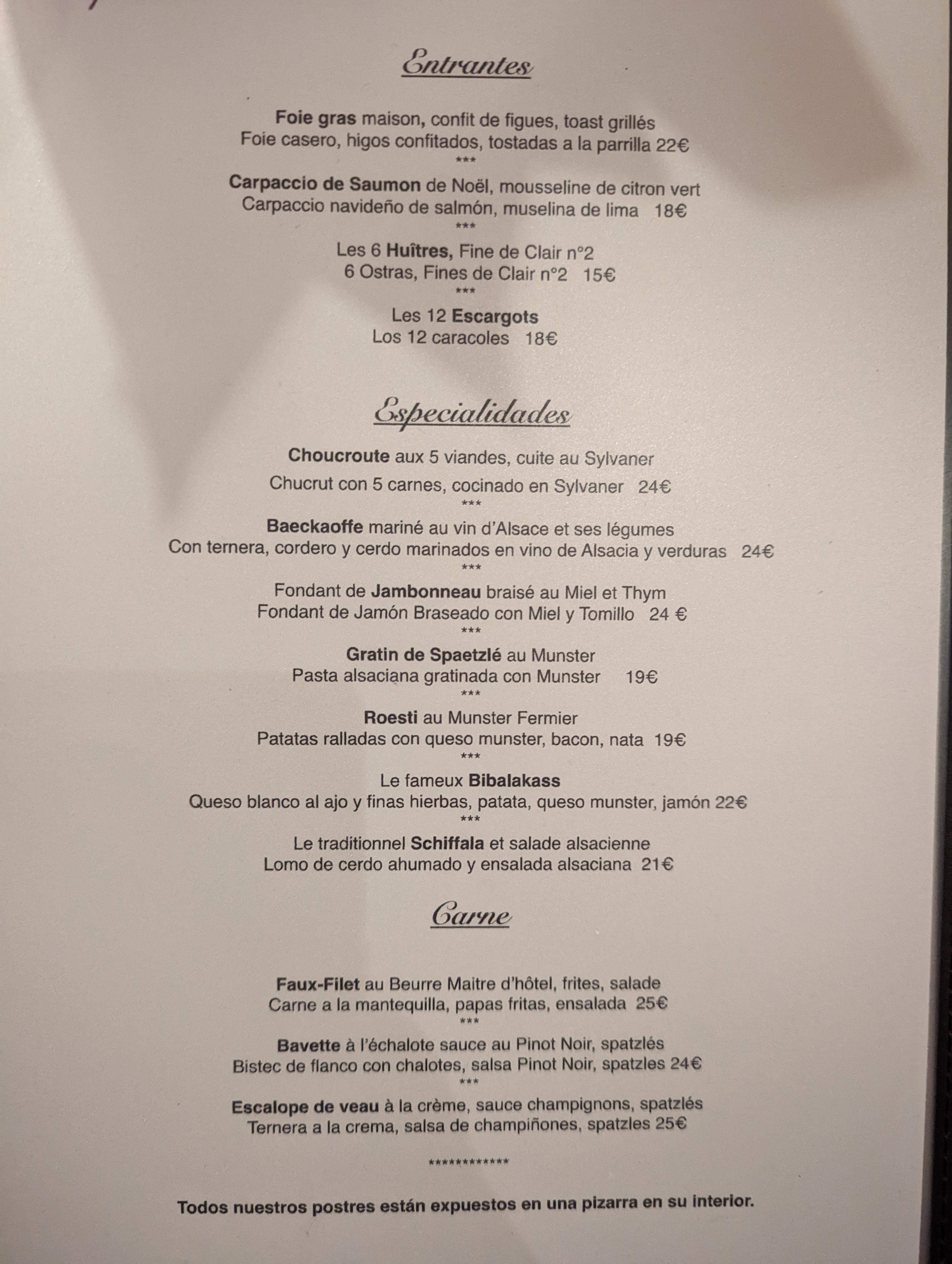 Ce restaurant prépare des plats traditionnels d'Alsace, dommage je voulais tester la Fleischnaka mais ce plat n'est pas au menu. J'ai trouvé les prix un peu élevé mais les quantités sont là.
