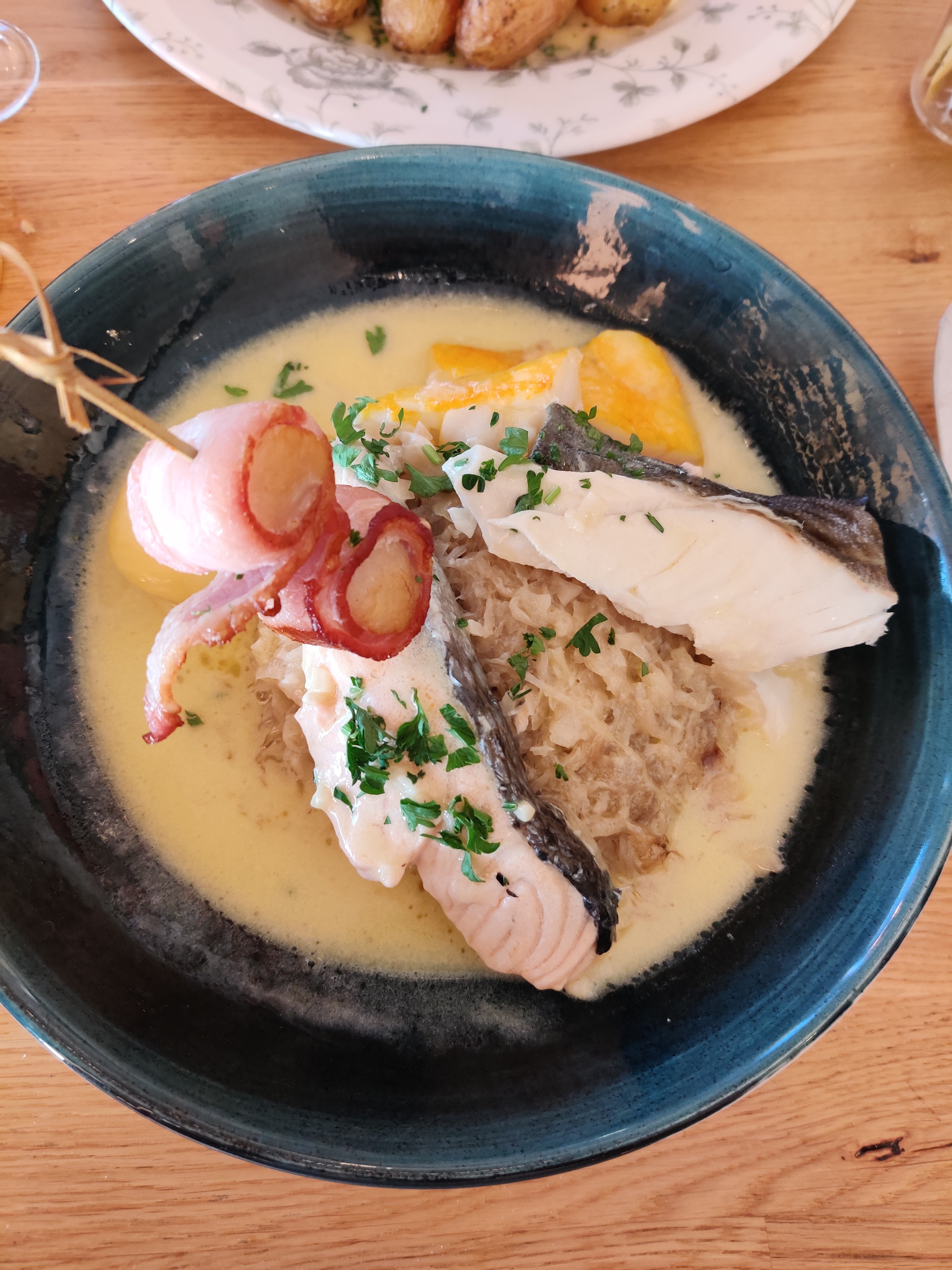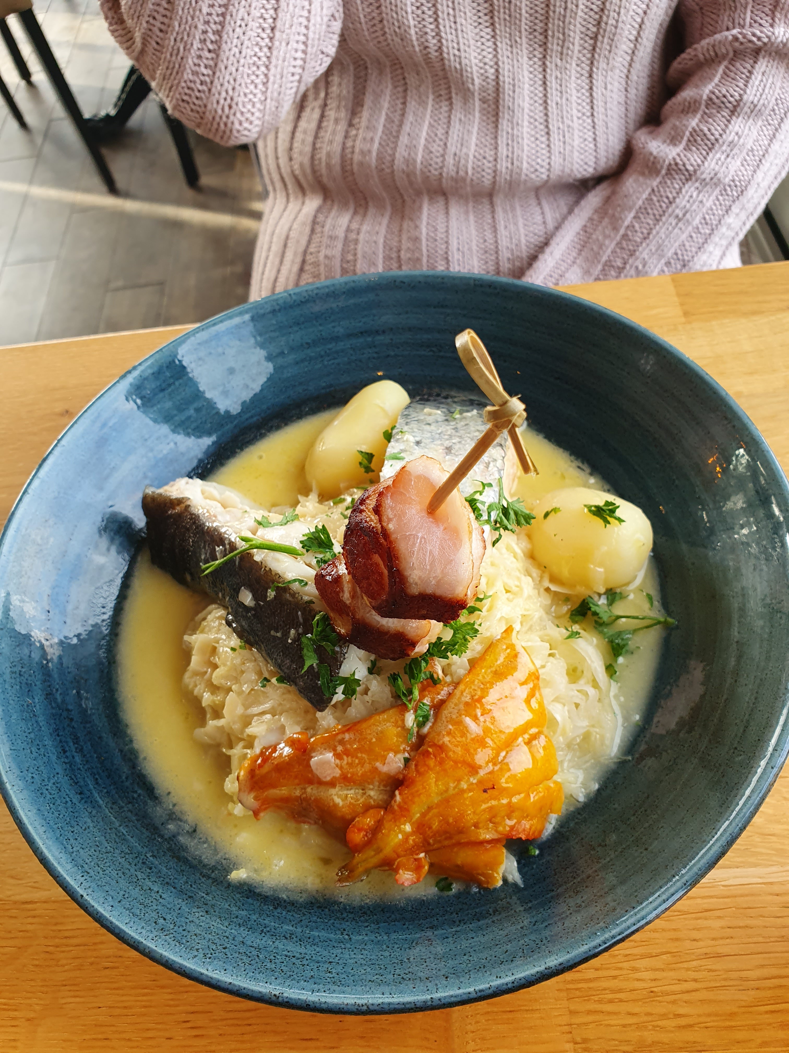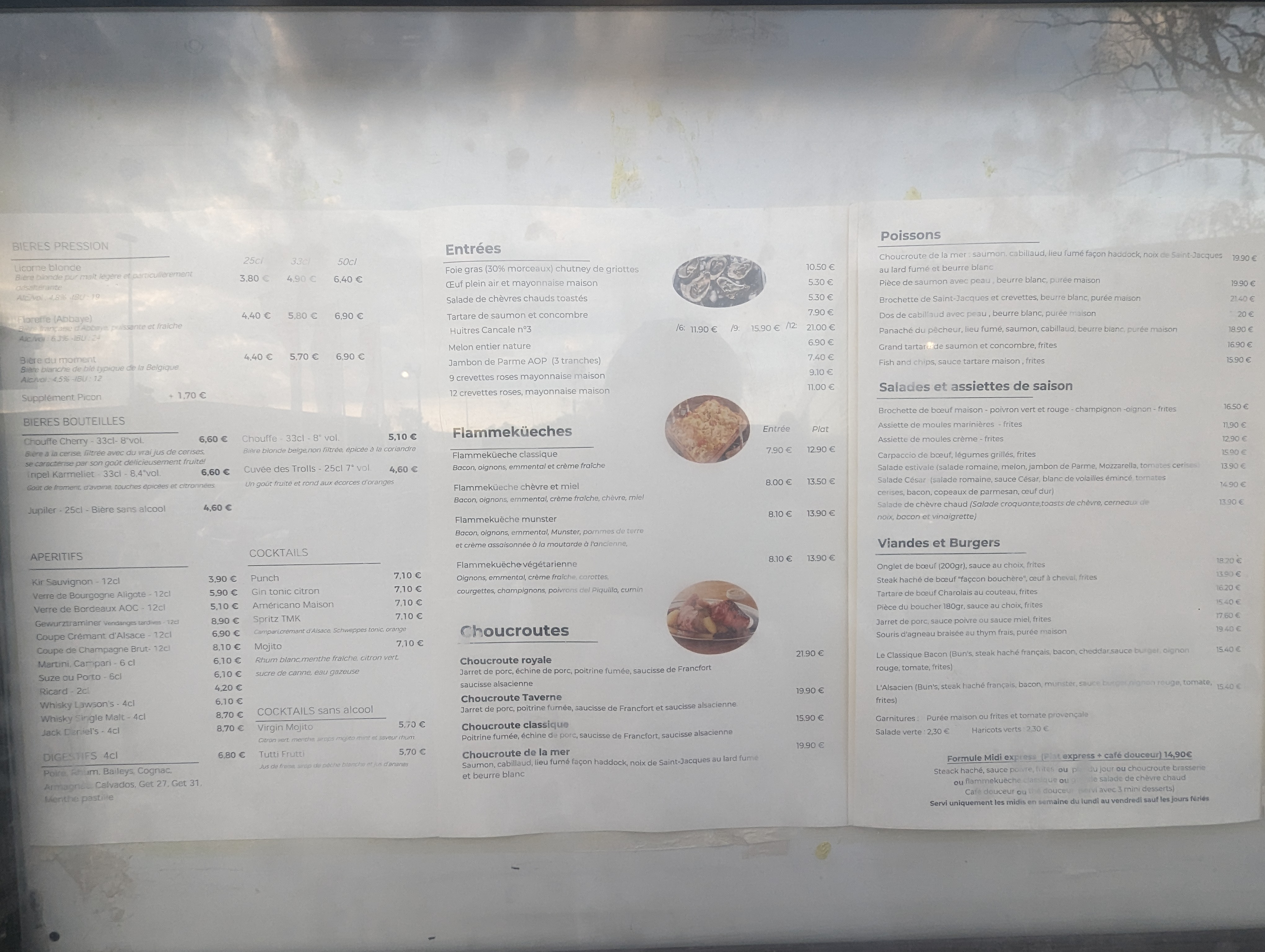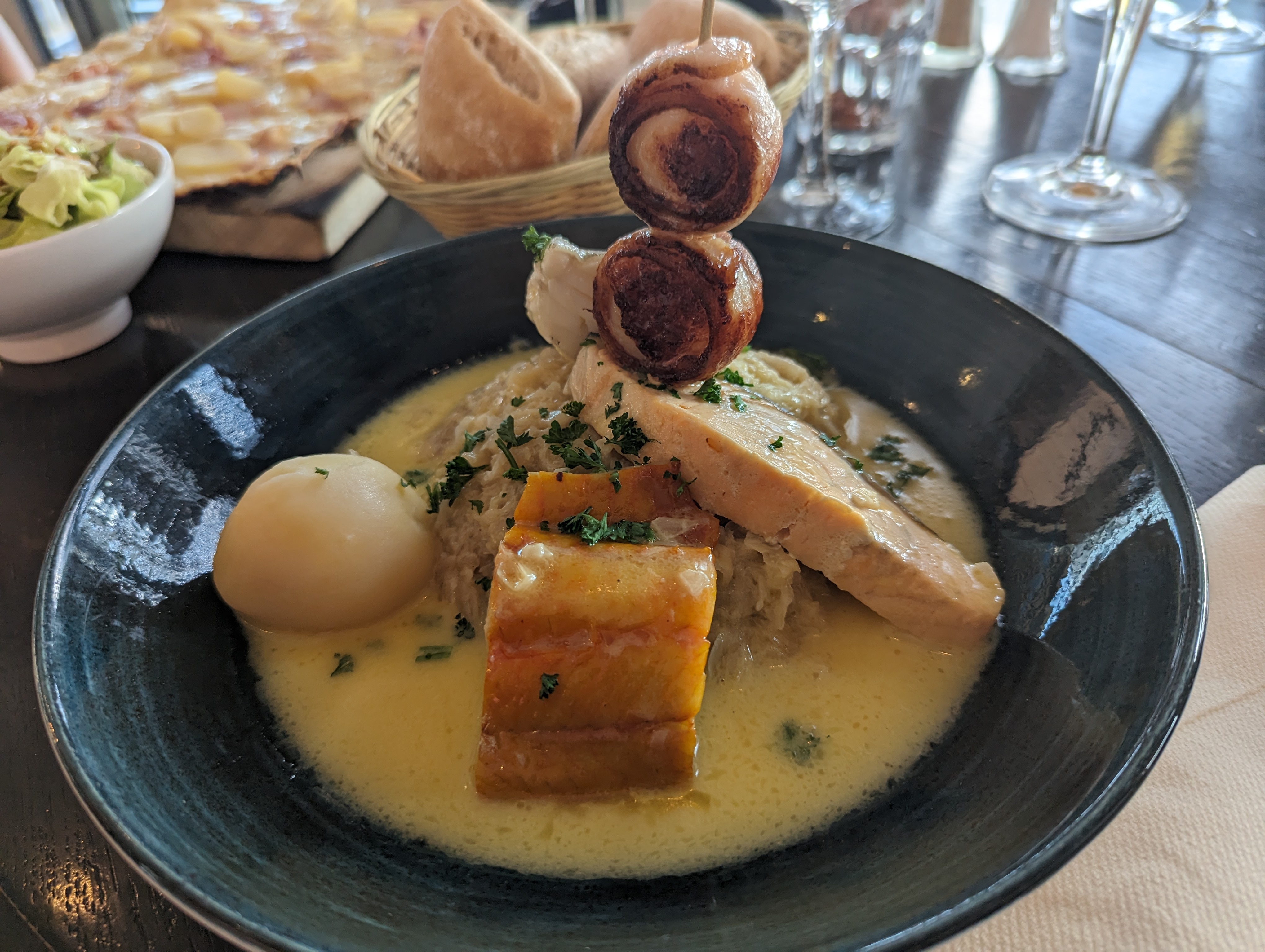 Très bonne choucroute de la mer bien présentée La flamekuche excellente Bonne biere pression rien à dire sauf qu il accepte les chiens et l odeur de poil mouillé n était pas agréable