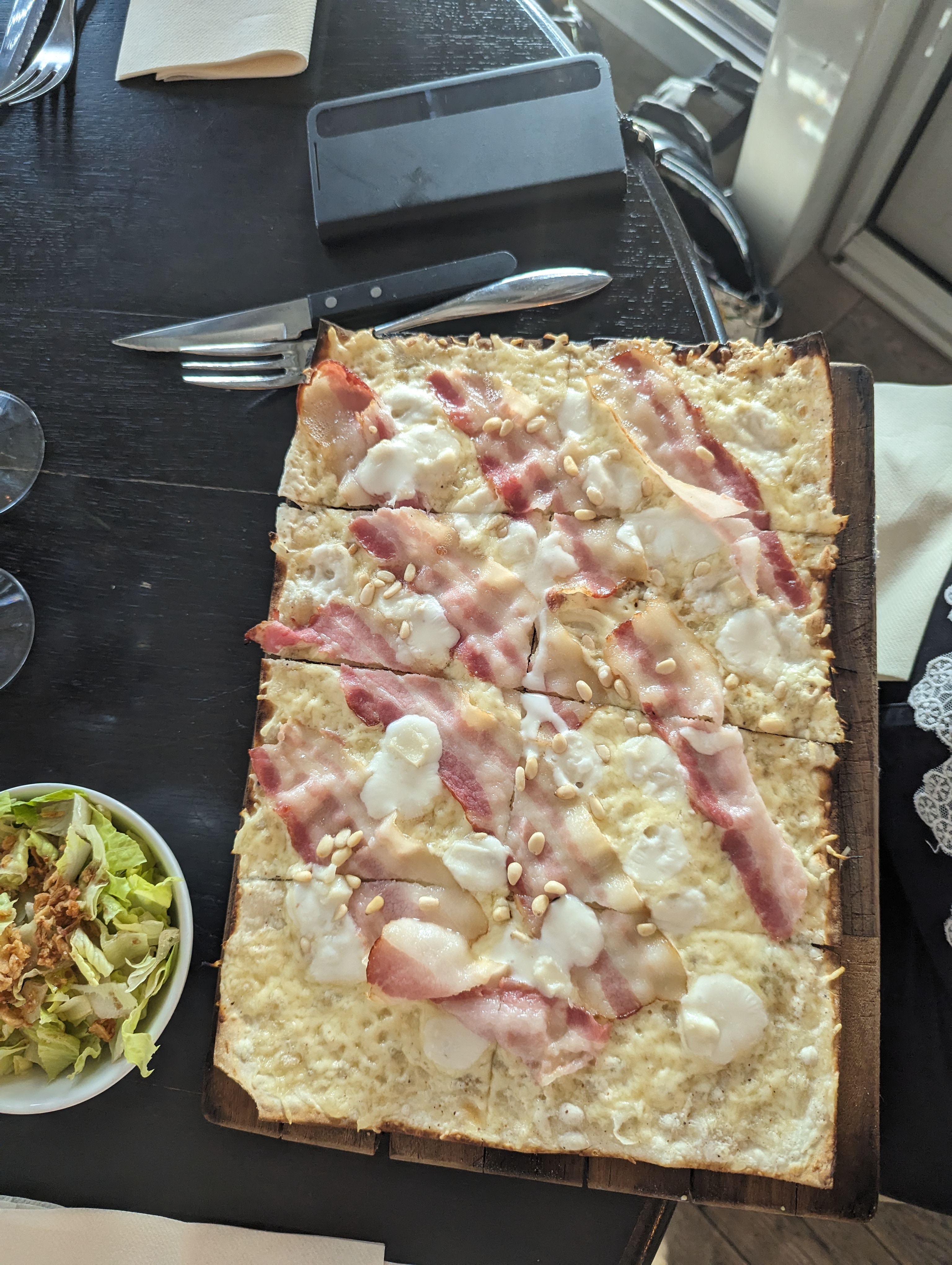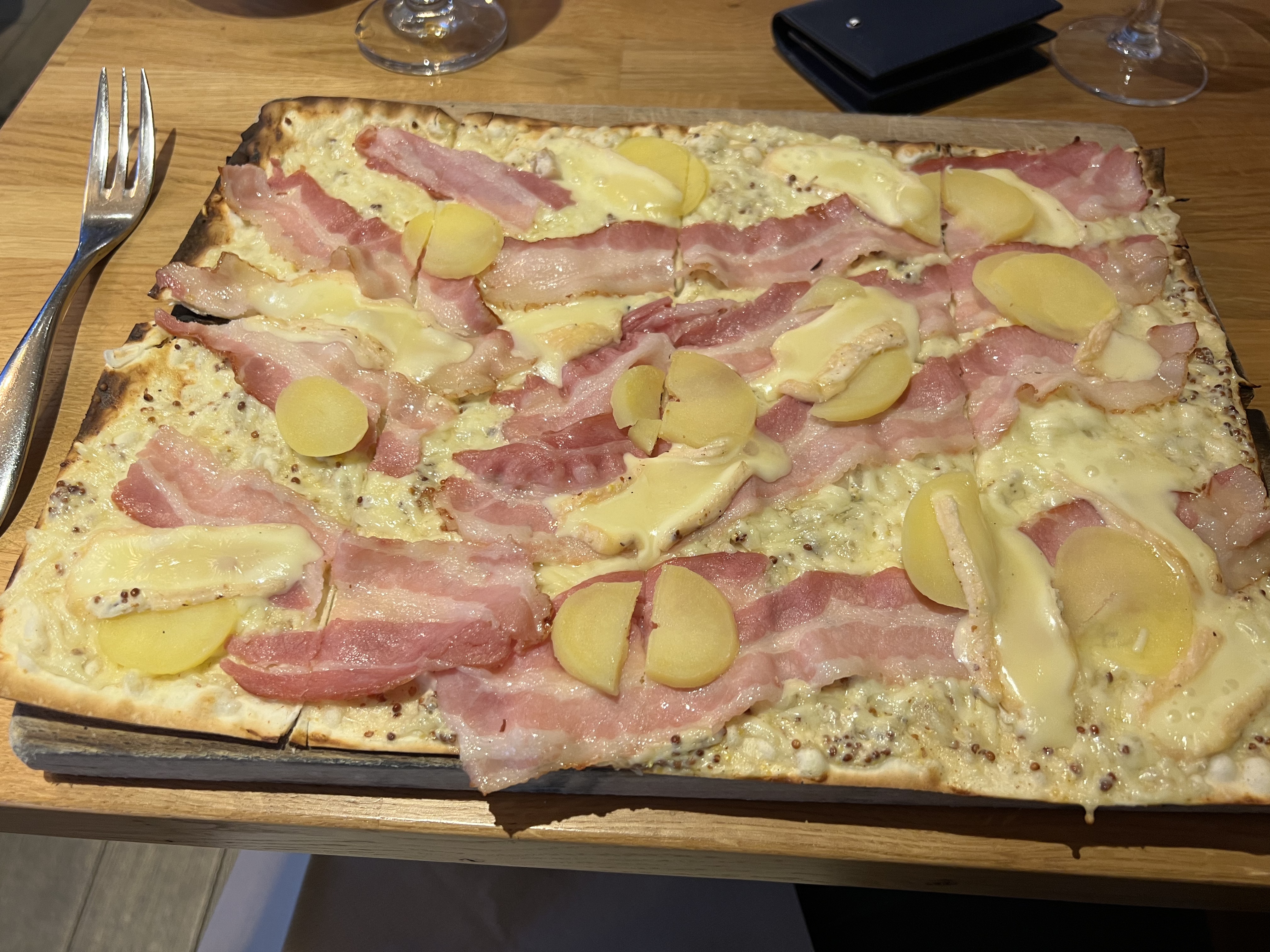 Personnel agréable mais Flammekeuch particulière que nous n'avons pas pu finir de manger. Peut être la surcharge de gruyère. Déception.