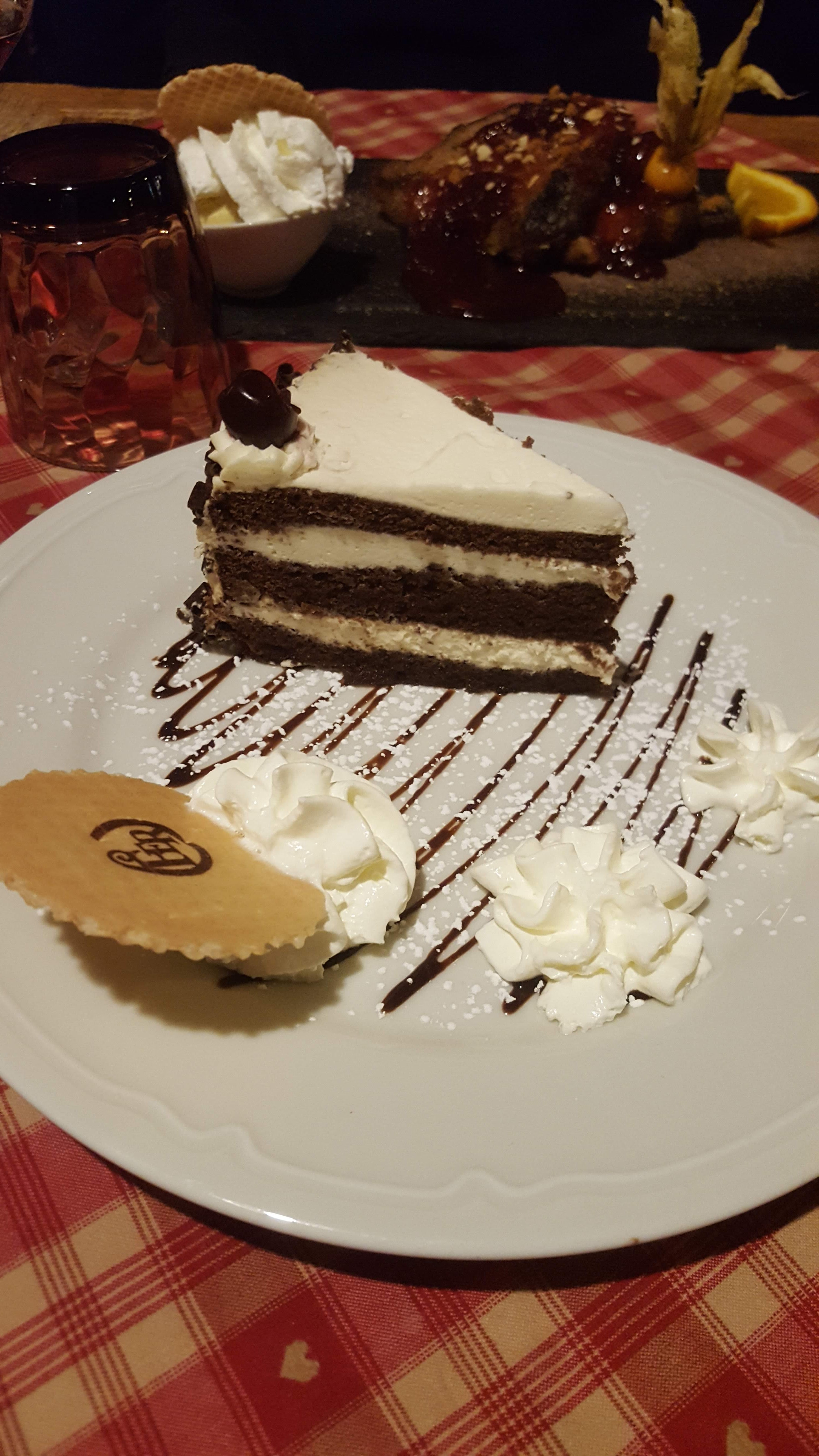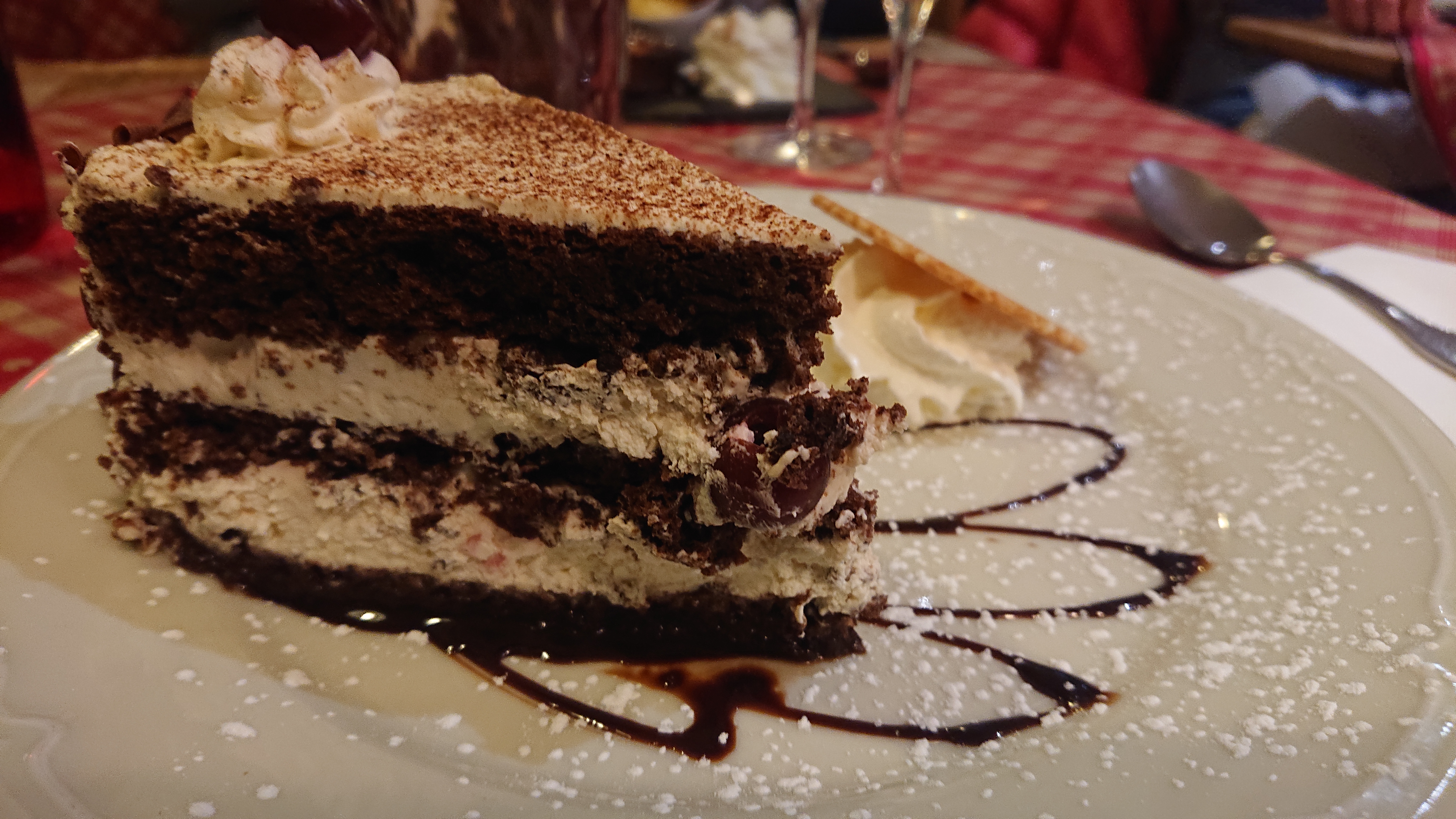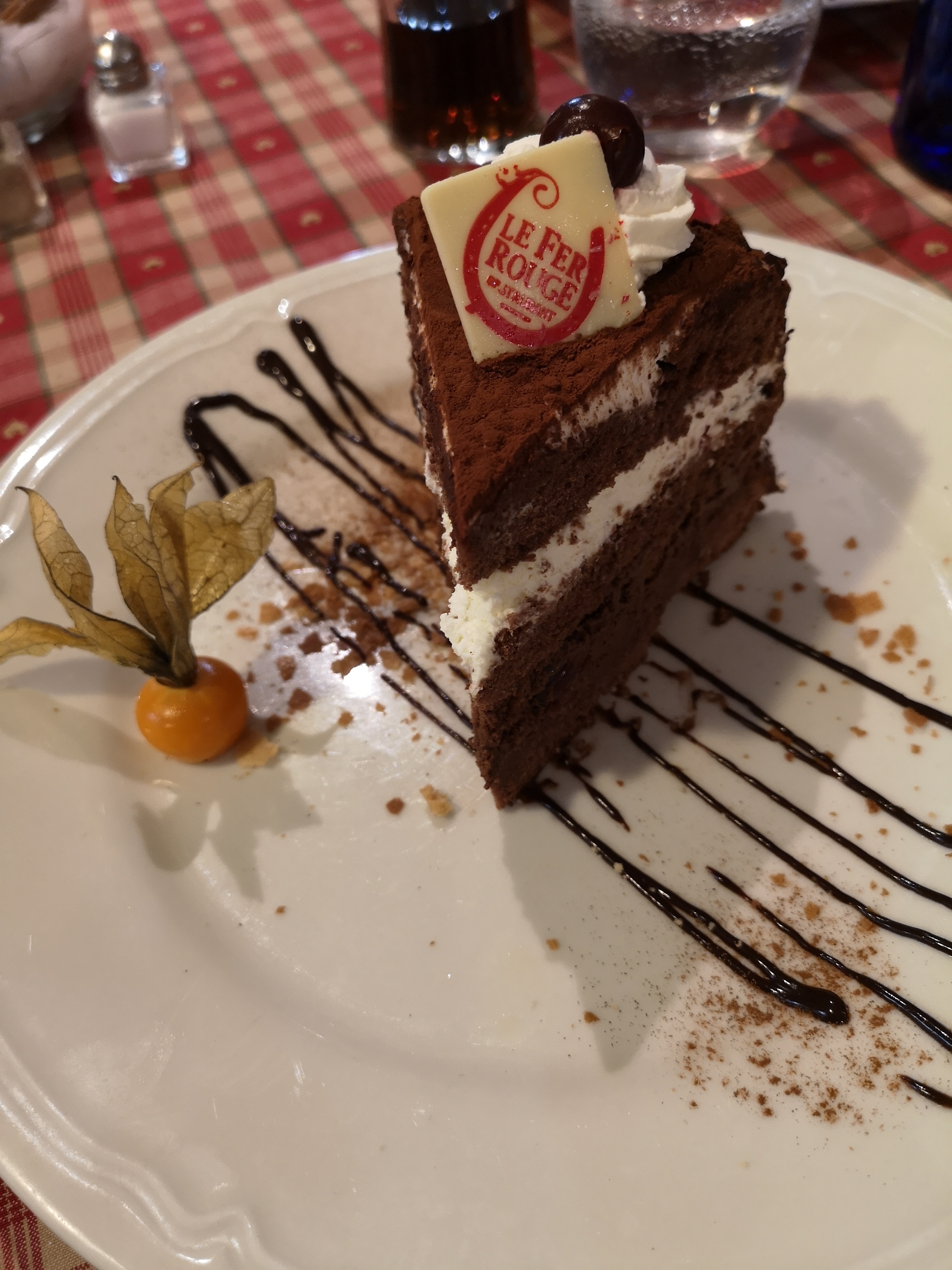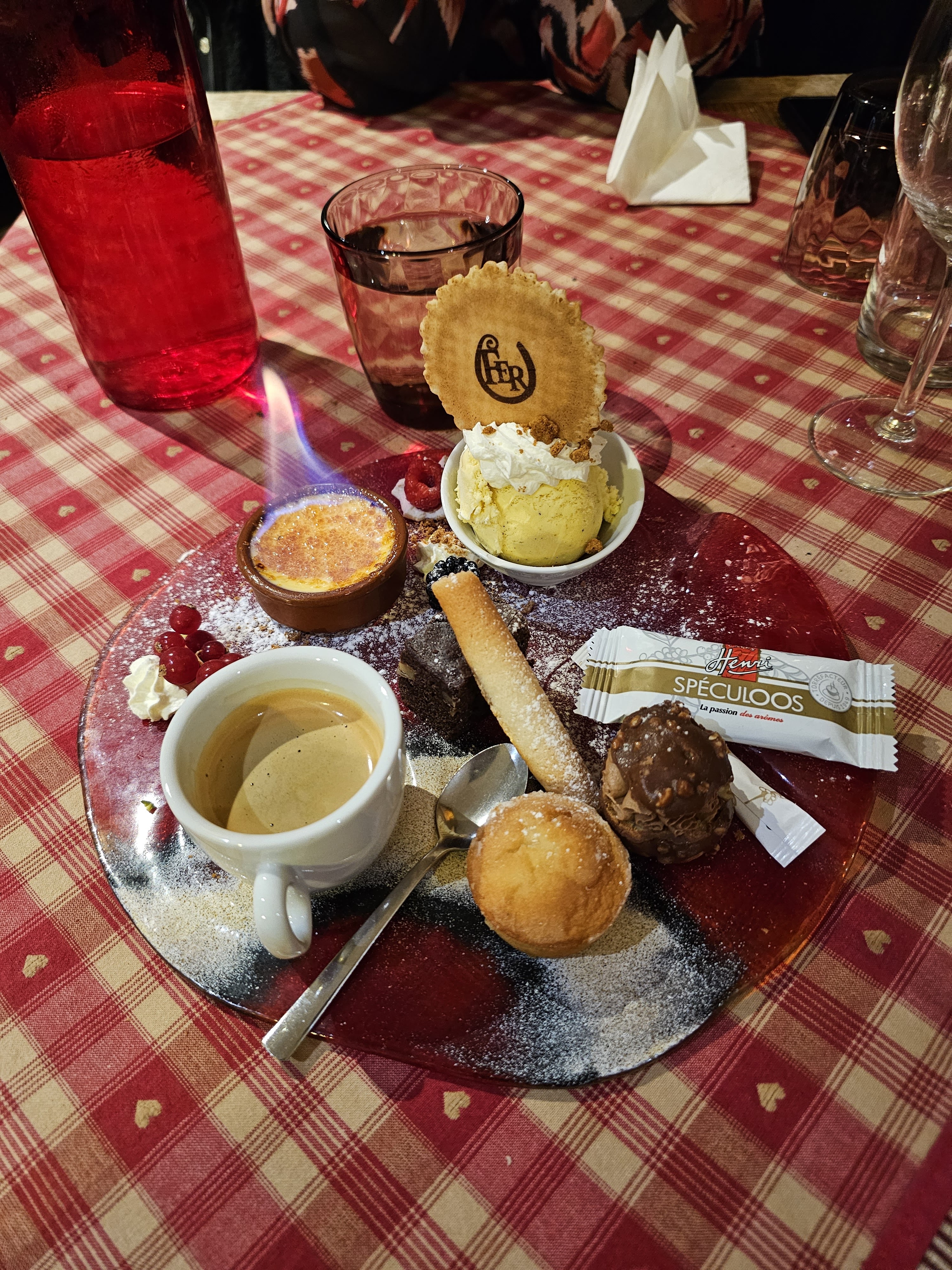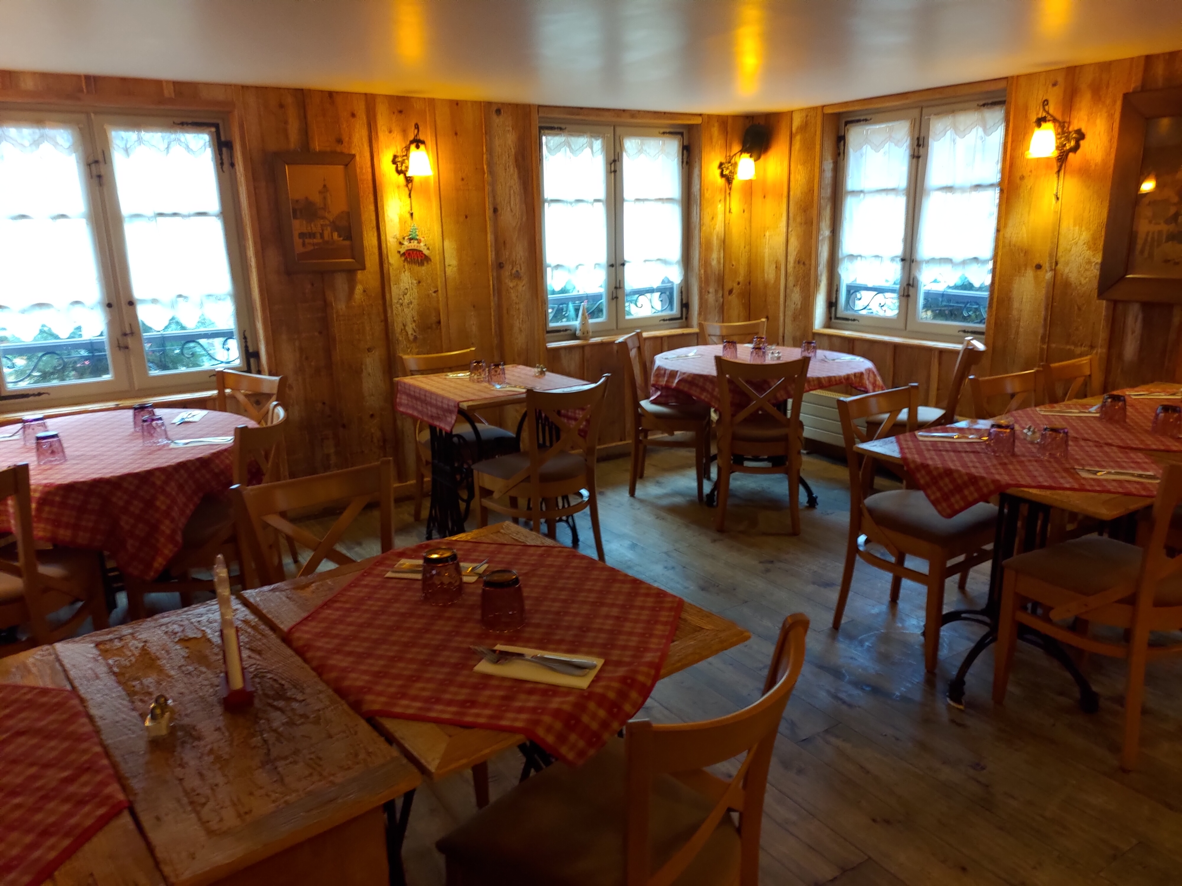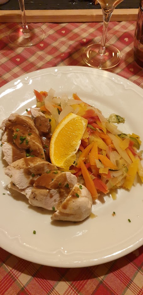 Nous avions une table près de la porte d’entrée, nous avons eu froid car beaucoup de va et vient. Le repas était bon mais pas assez chaud pour le poulet. Très bonne forêt noire mais seulement 2 cerises dans la part de gâteau.
