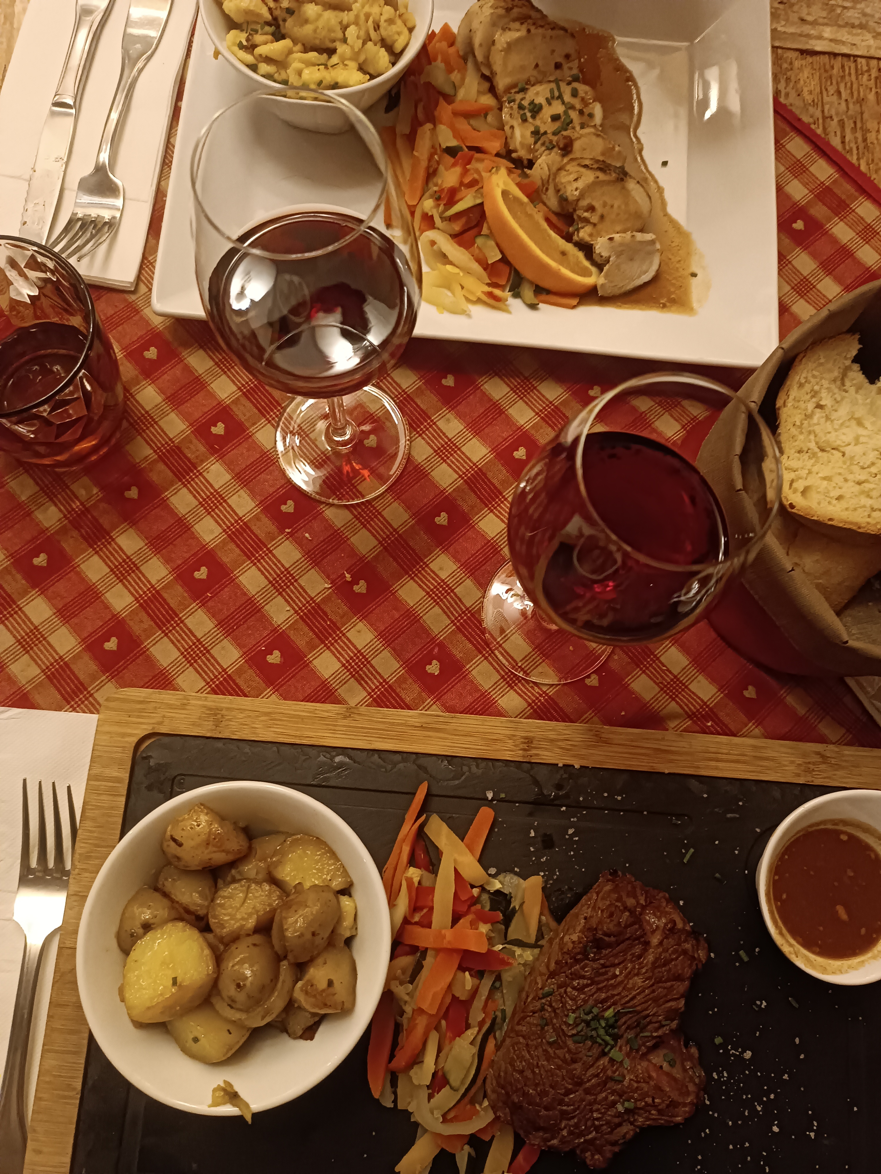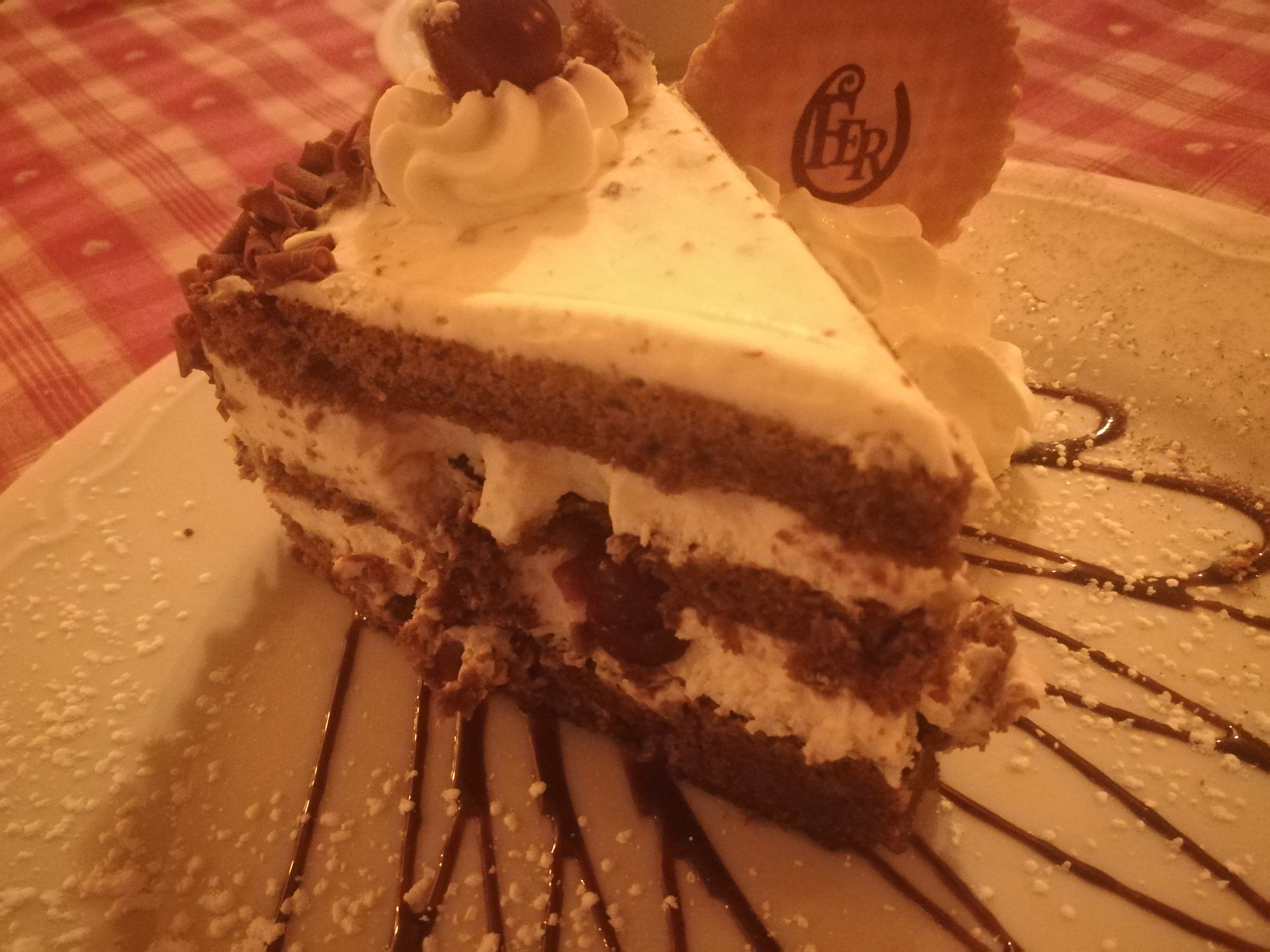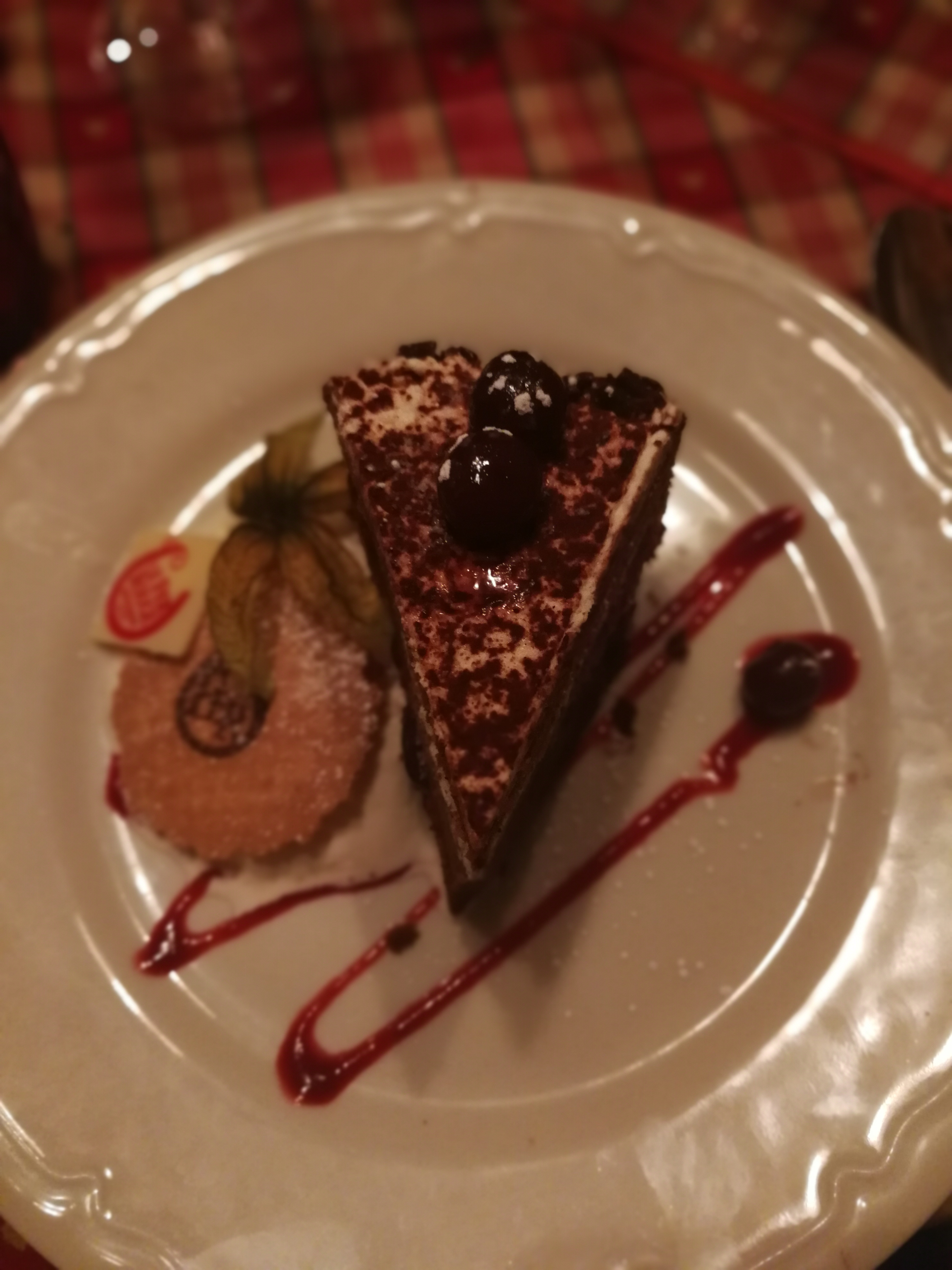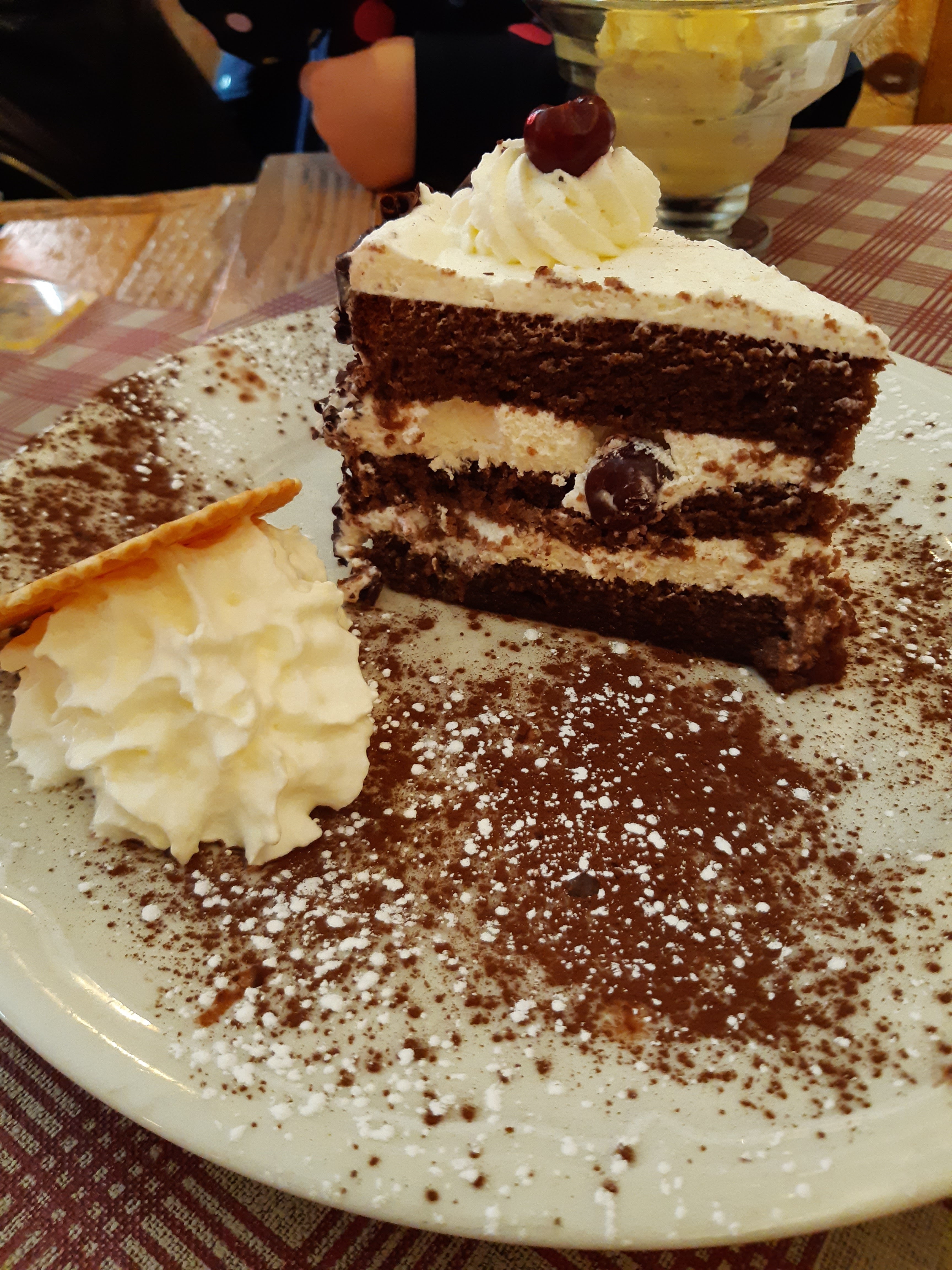 Nous avions une table près de la porte d’entrée, nous avons eu froid car beaucoup de va et vient. Le repas était bon mais pas assez chaud pour le poulet. Très bonne forêt noire mais seulement 2 cerises dans la part de gâteau.