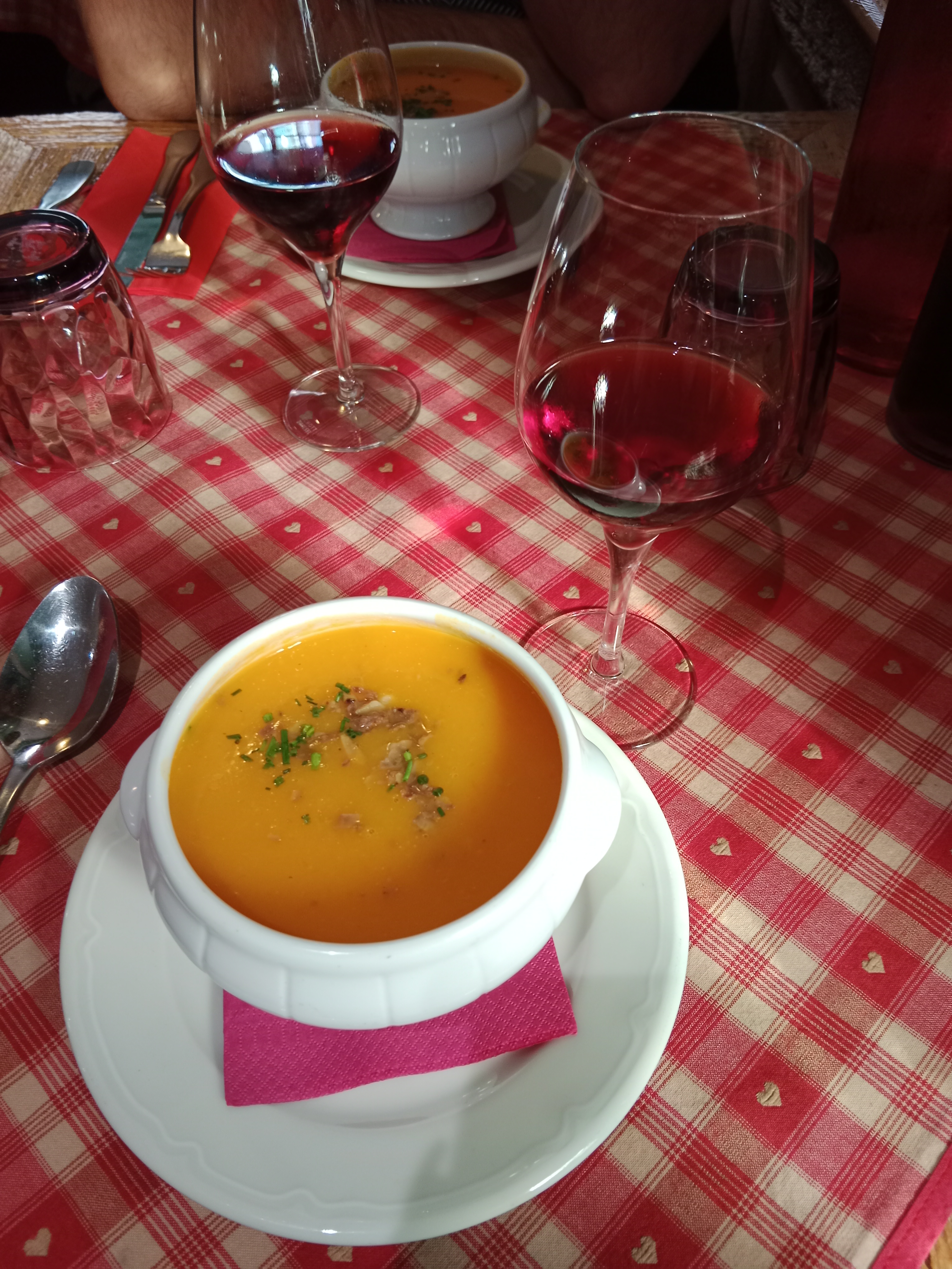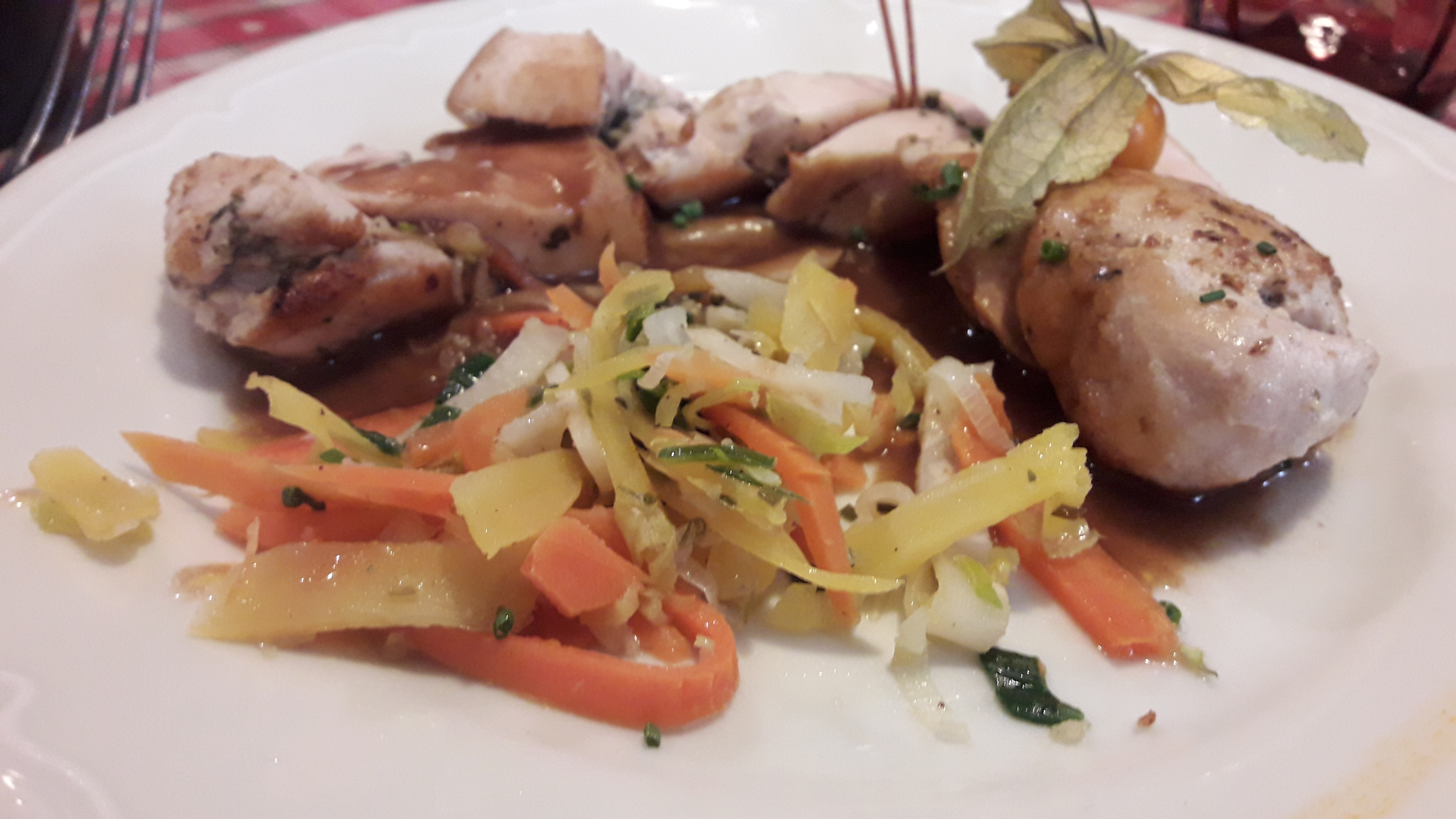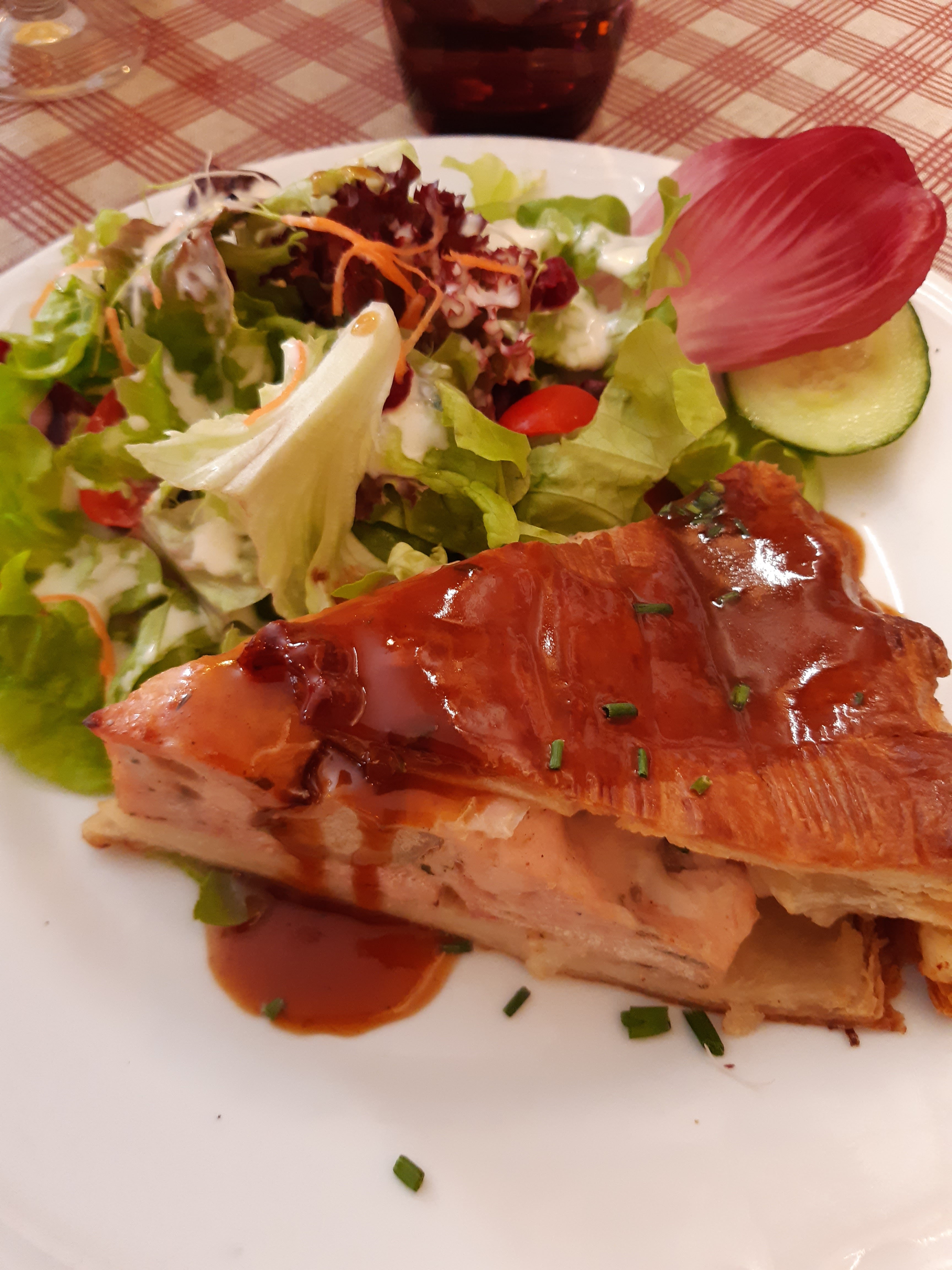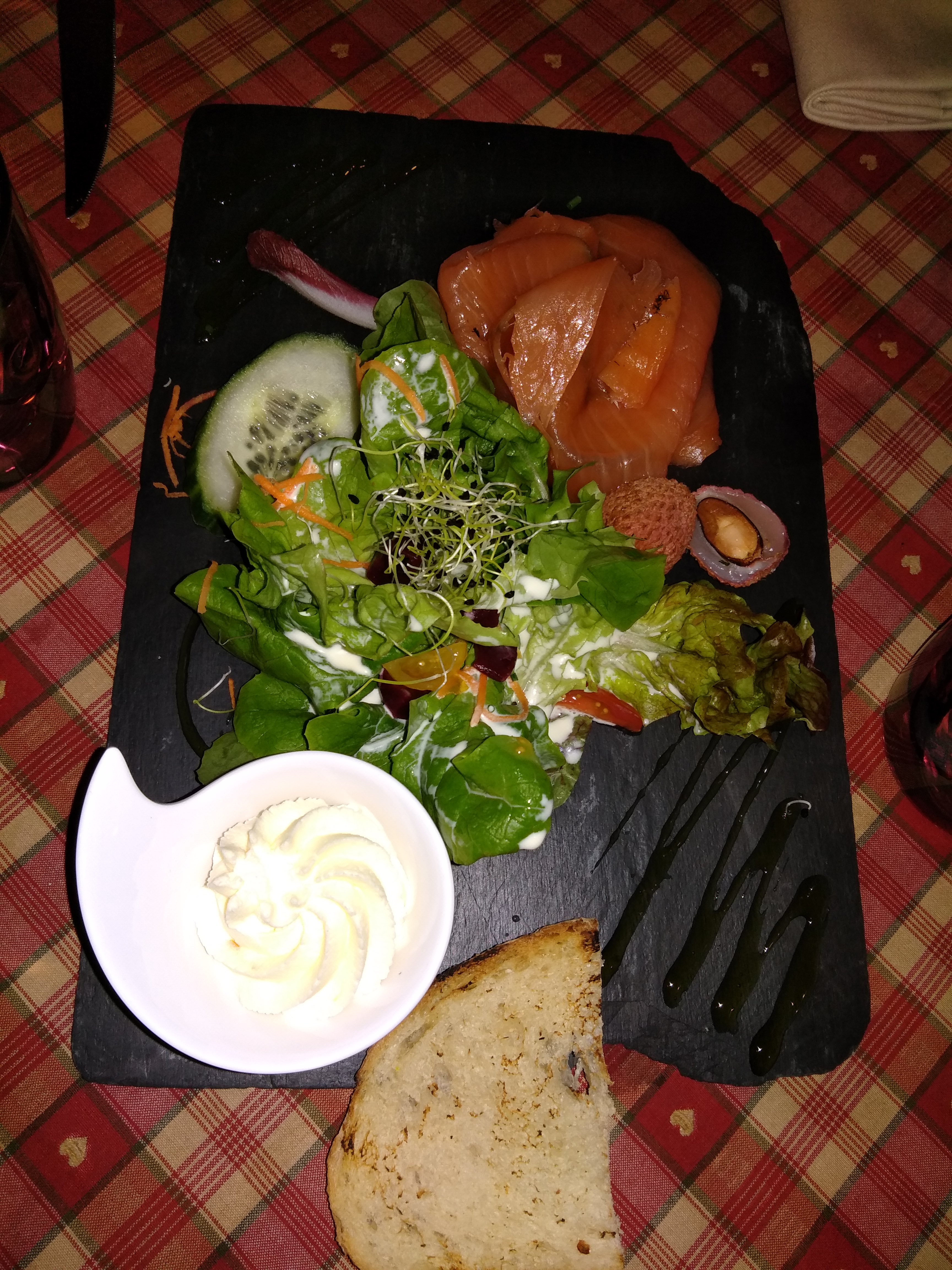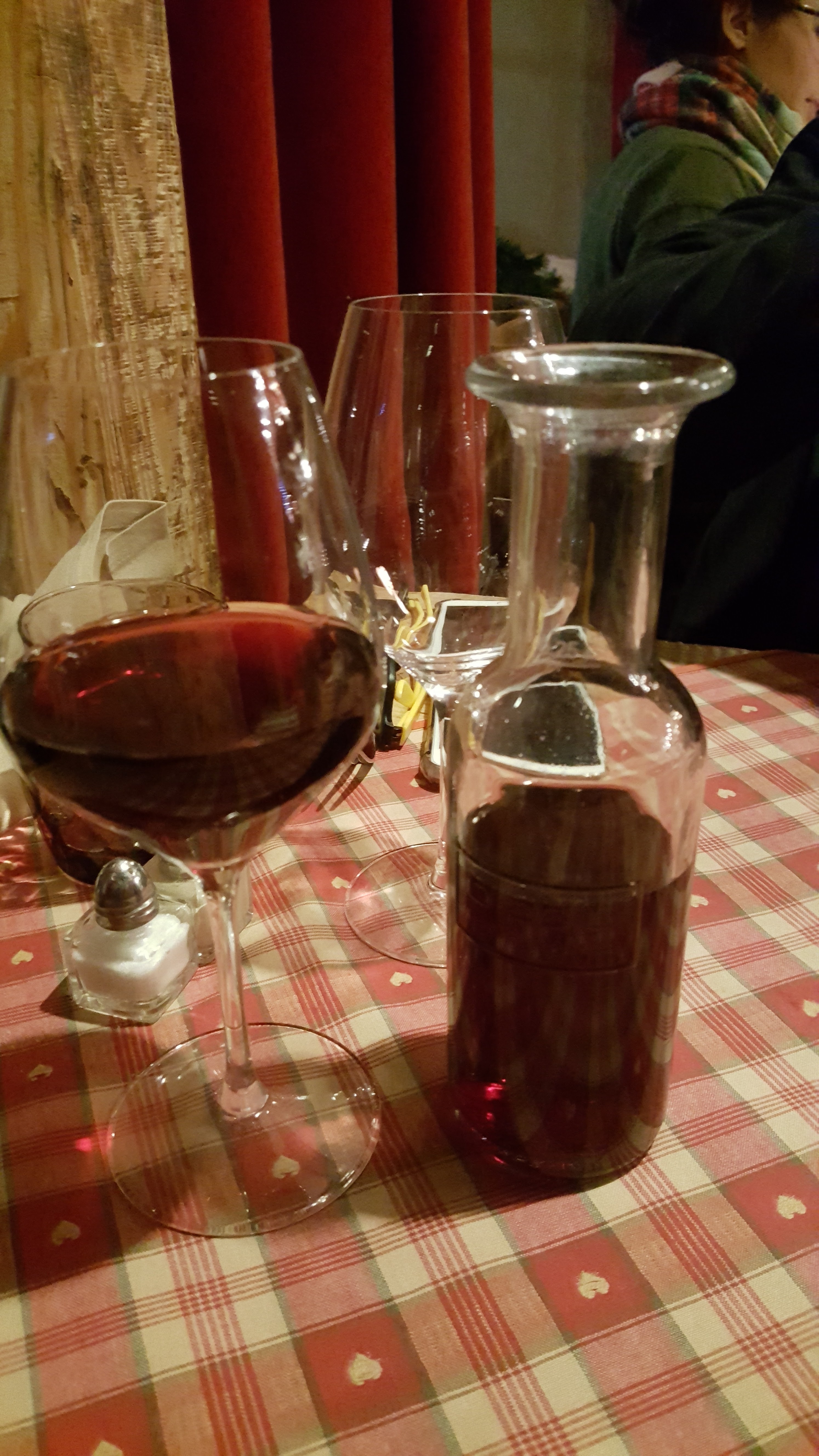 Nous avions une table près de la porte d’entrée, nous avons eu froid car beaucoup de va et vient. Le repas était bon mais pas assez chaud pour le poulet. Très bonne forêt noire mais seulement 2 cerises dans la part de gâteau.