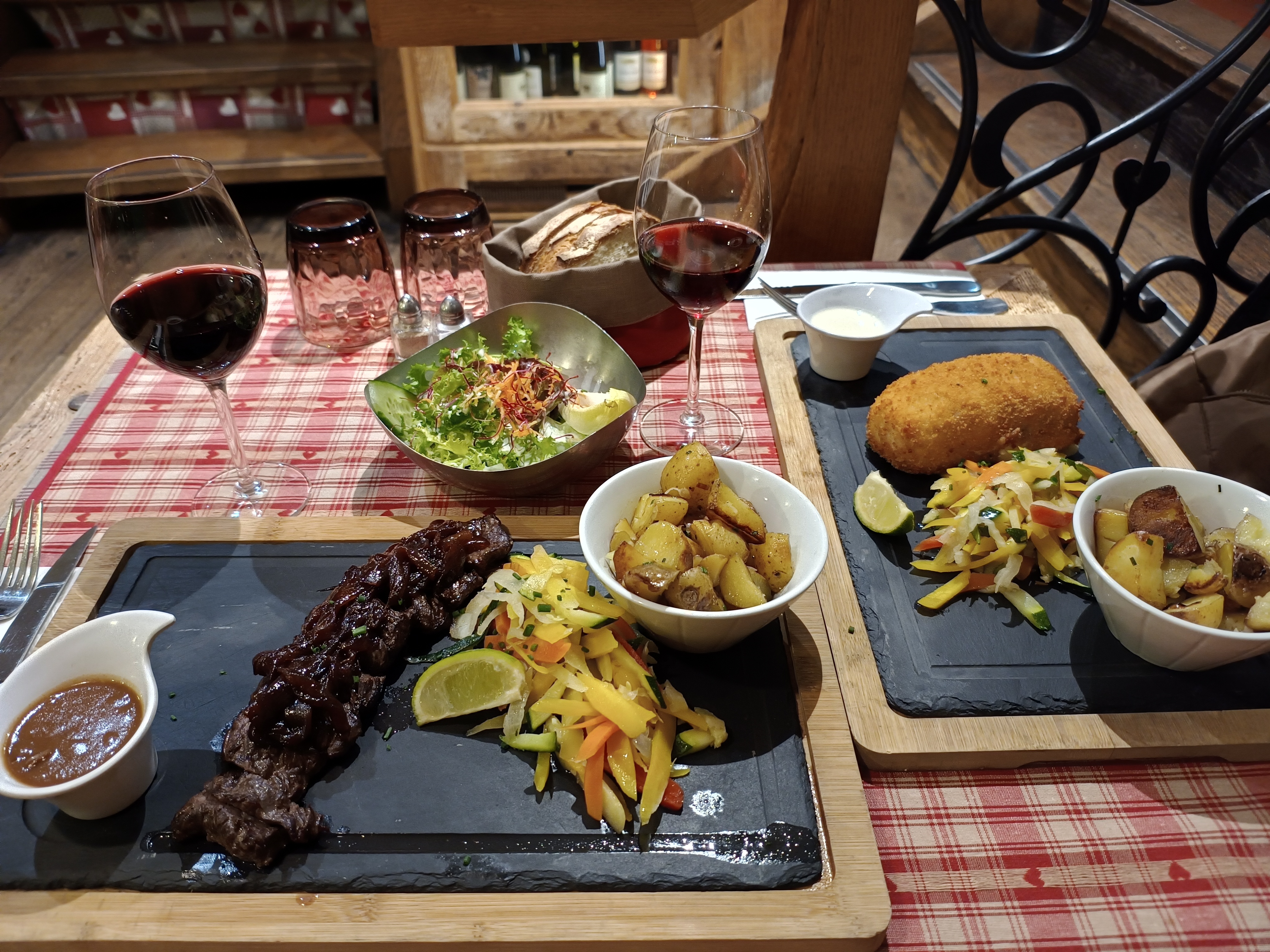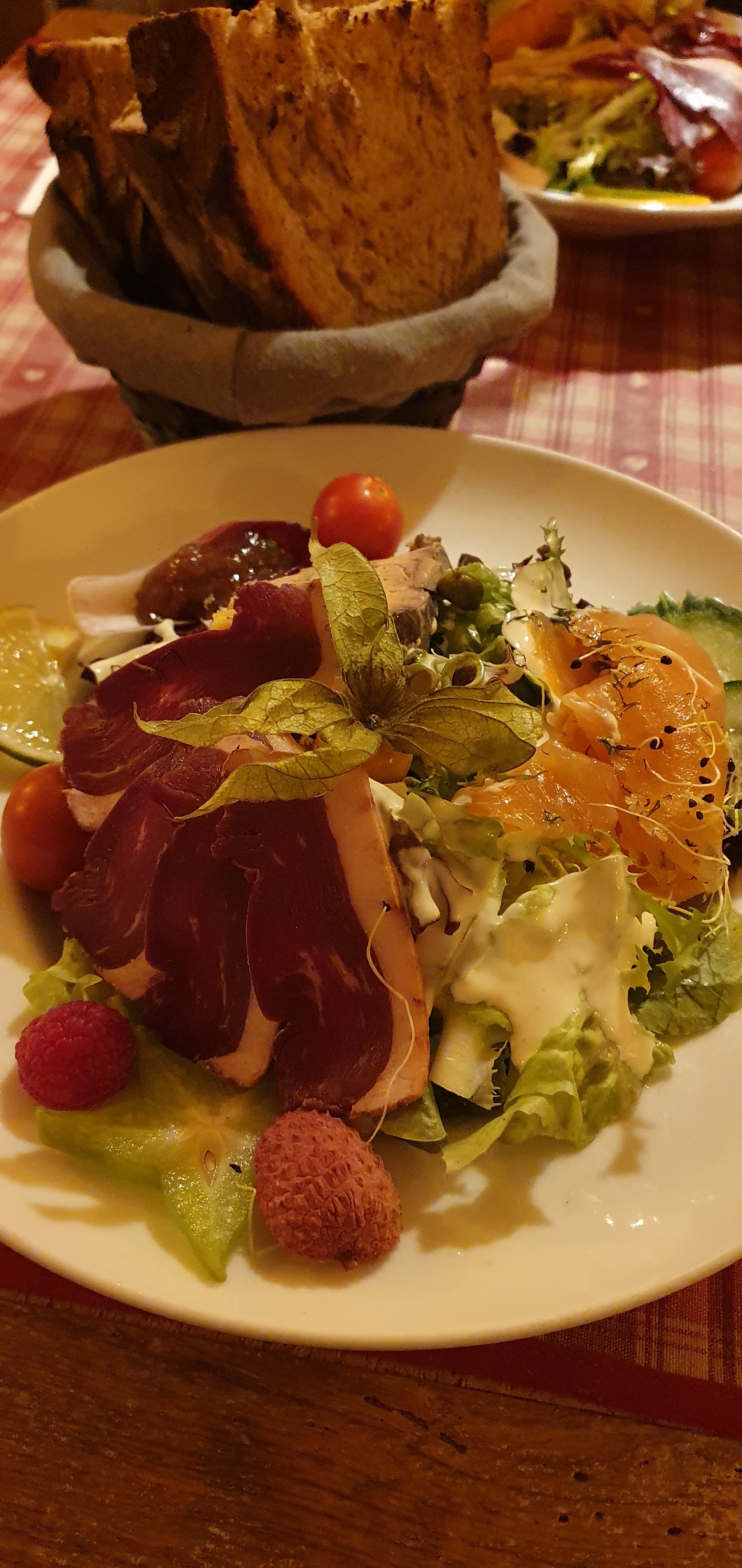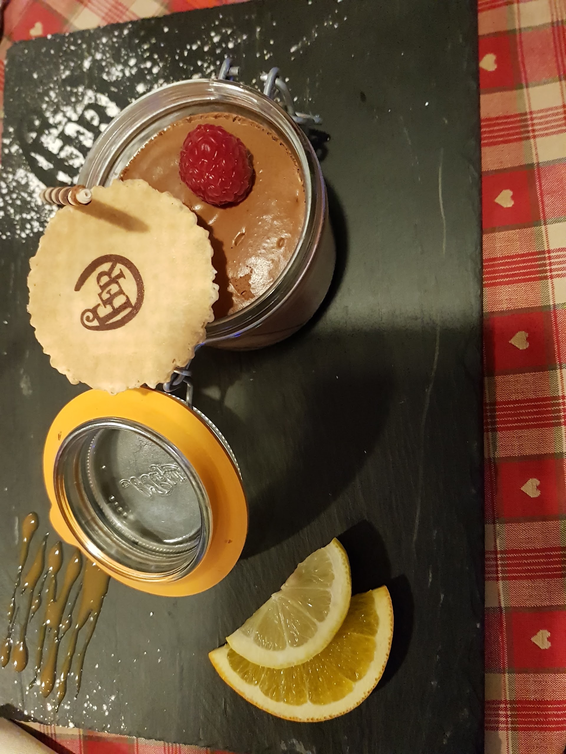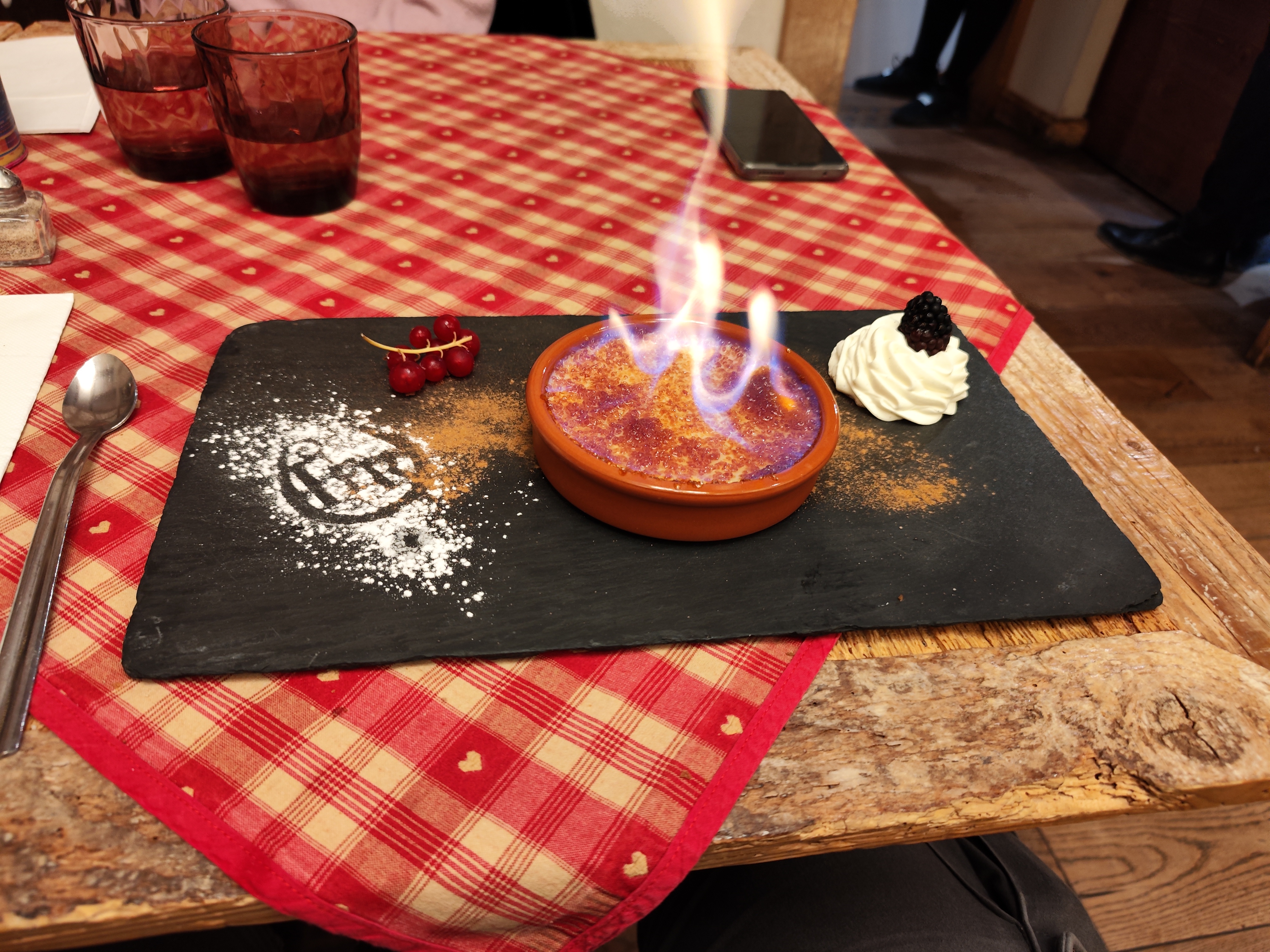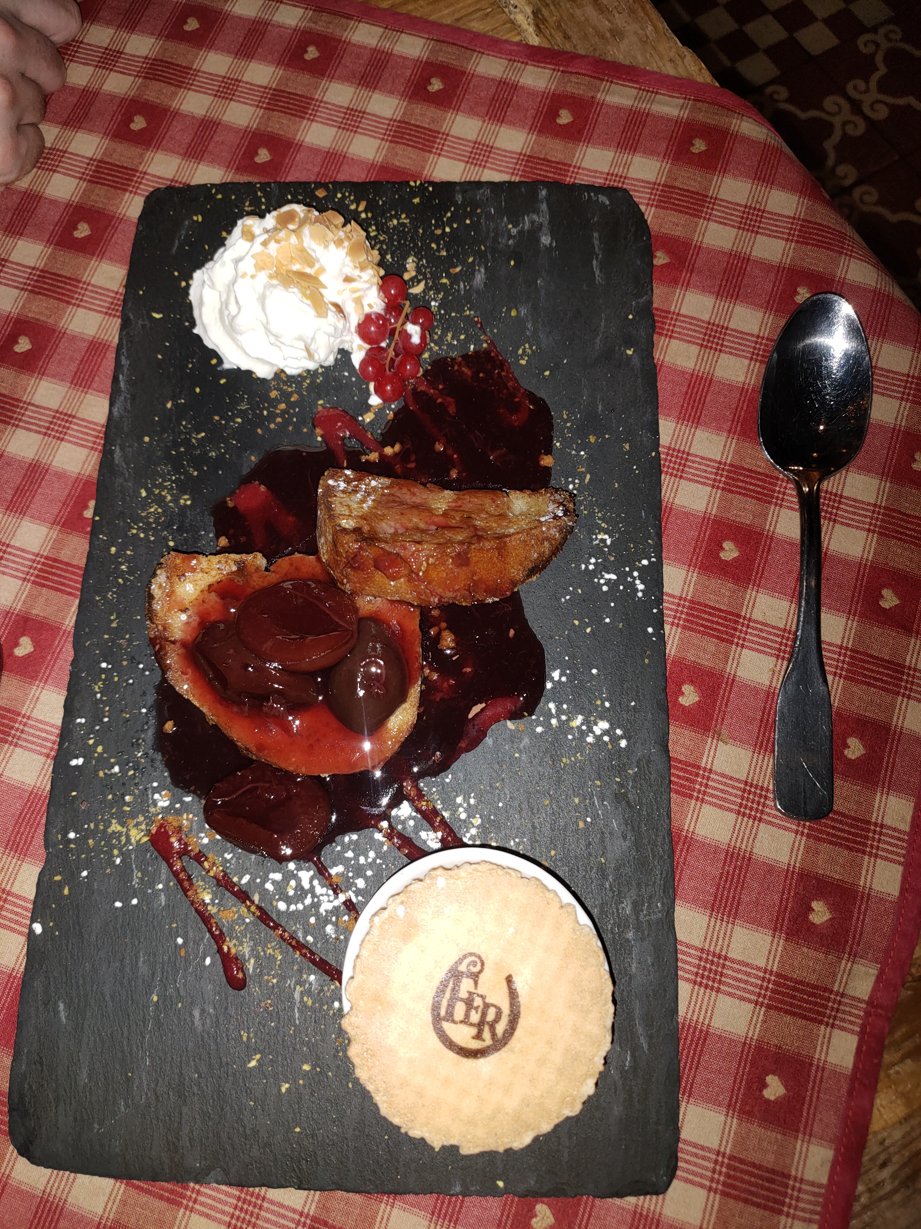 Nous avions une table près de la porte d’entrée, nous avons eu froid car beaucoup de va et vient. Le repas était bon mais pas assez chaud pour le poulet. Très bonne forêt noire mais seulement 2 cerises dans la part de gâteau.