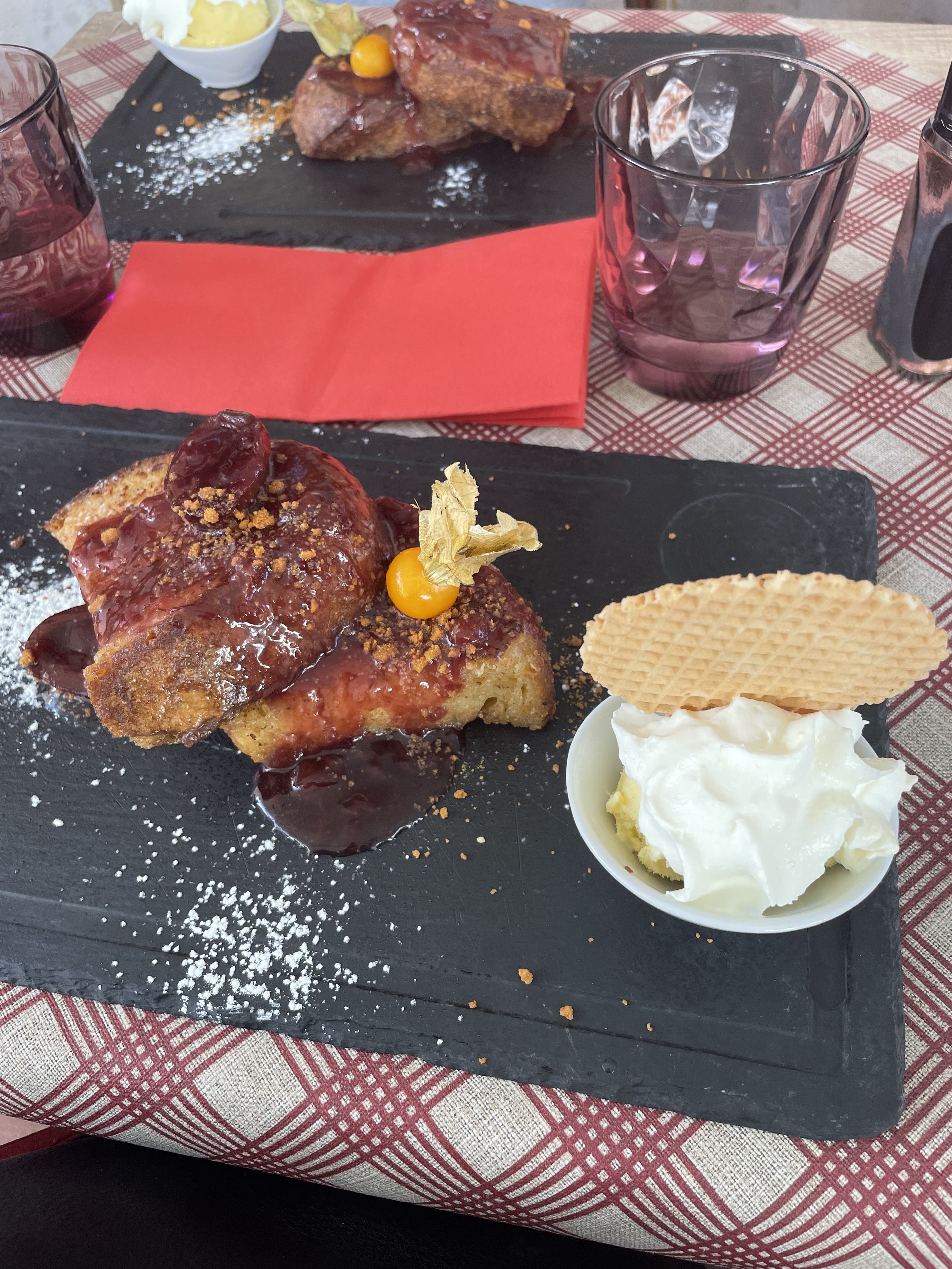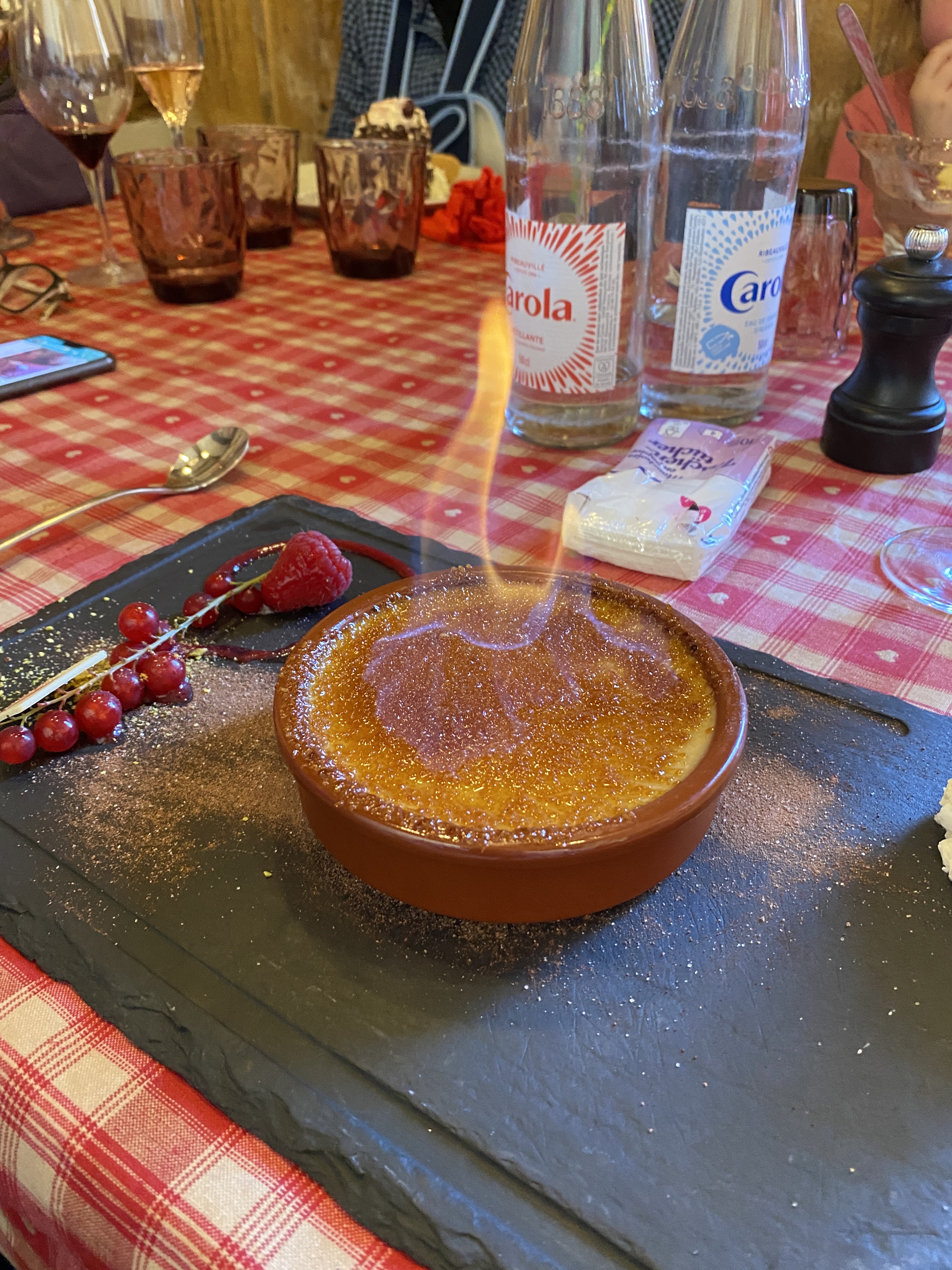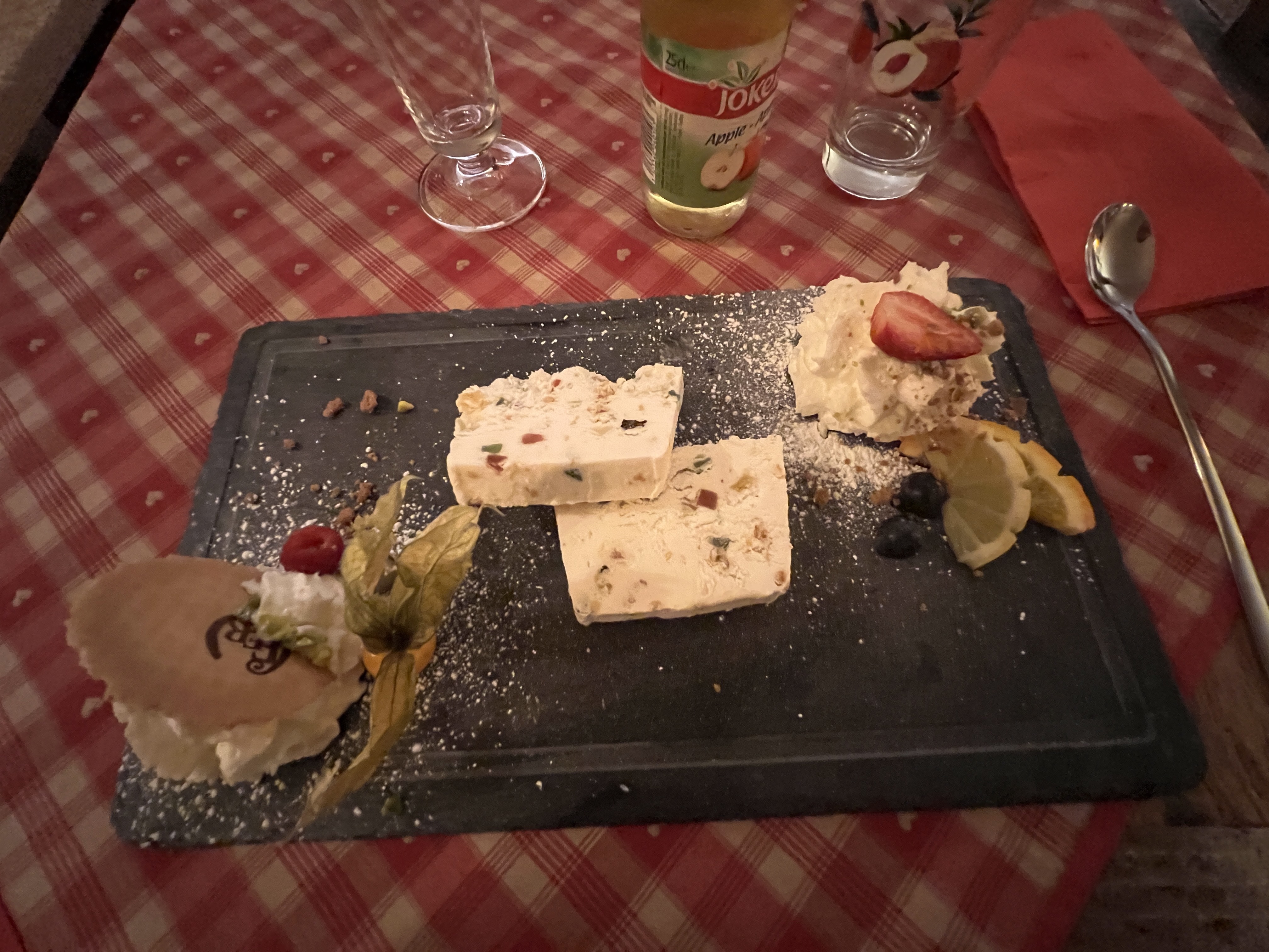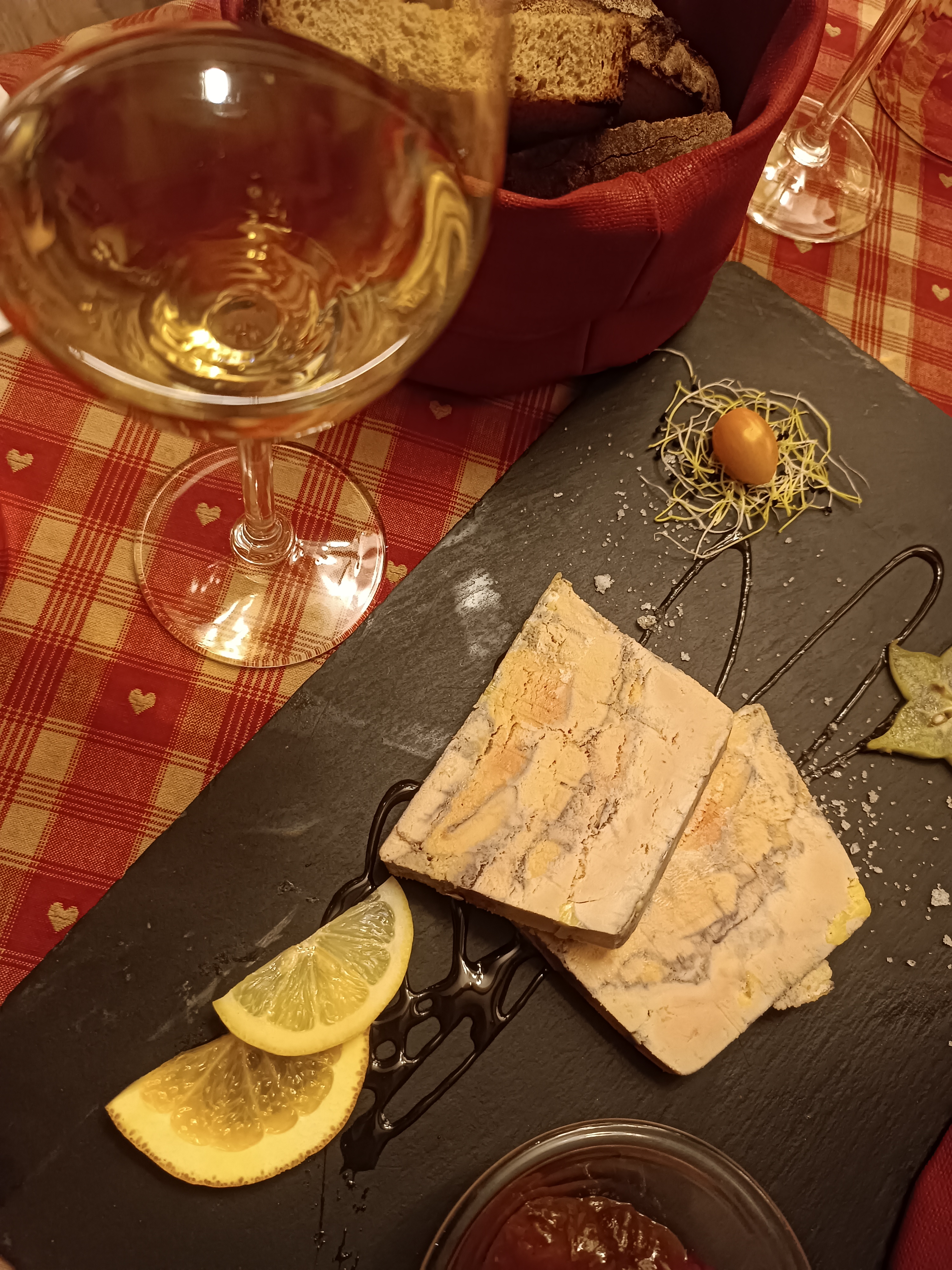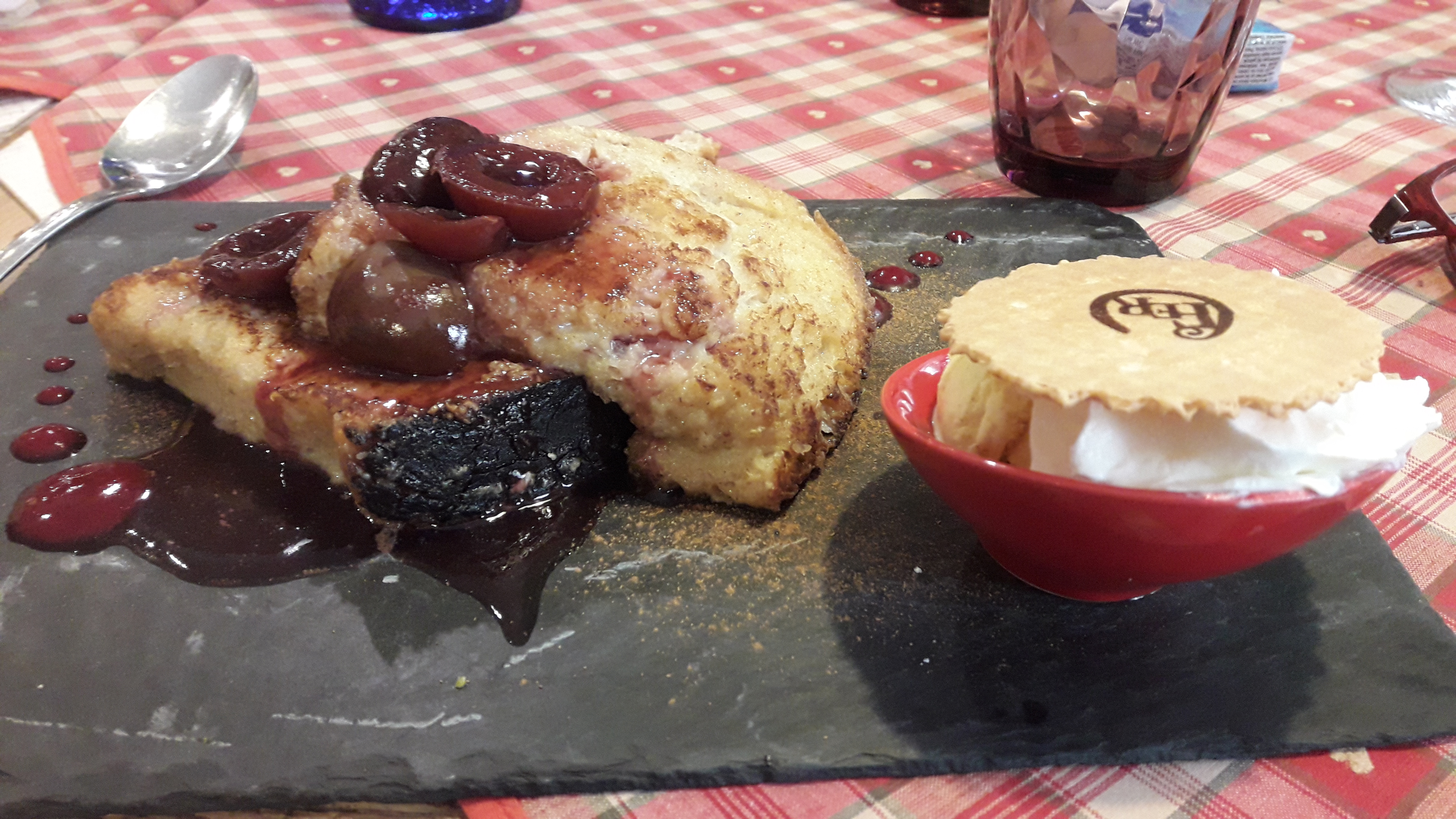 Nous avions une table près de la porte d’entrée, nous avons eu froid car beaucoup de va et vient. Le repas était bon mais pas assez chaud pour le poulet. Très bonne forêt noire mais seulement 2 cerises dans la part de gâteau.