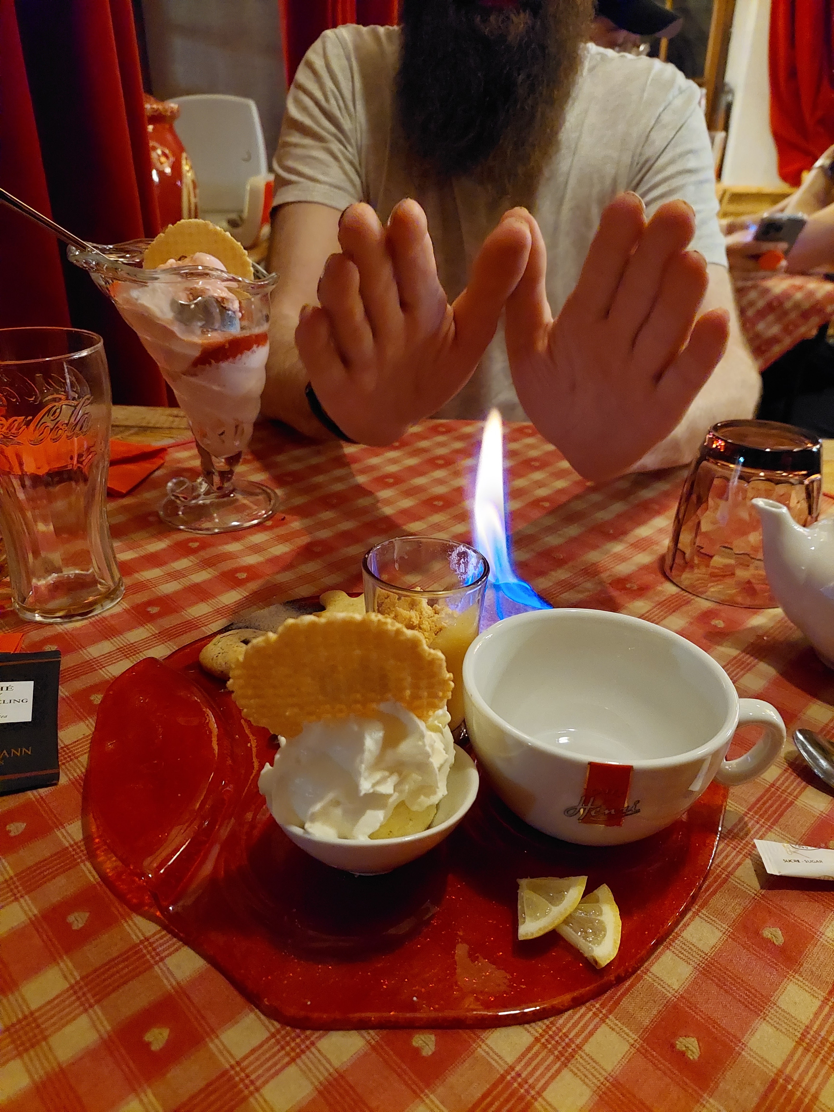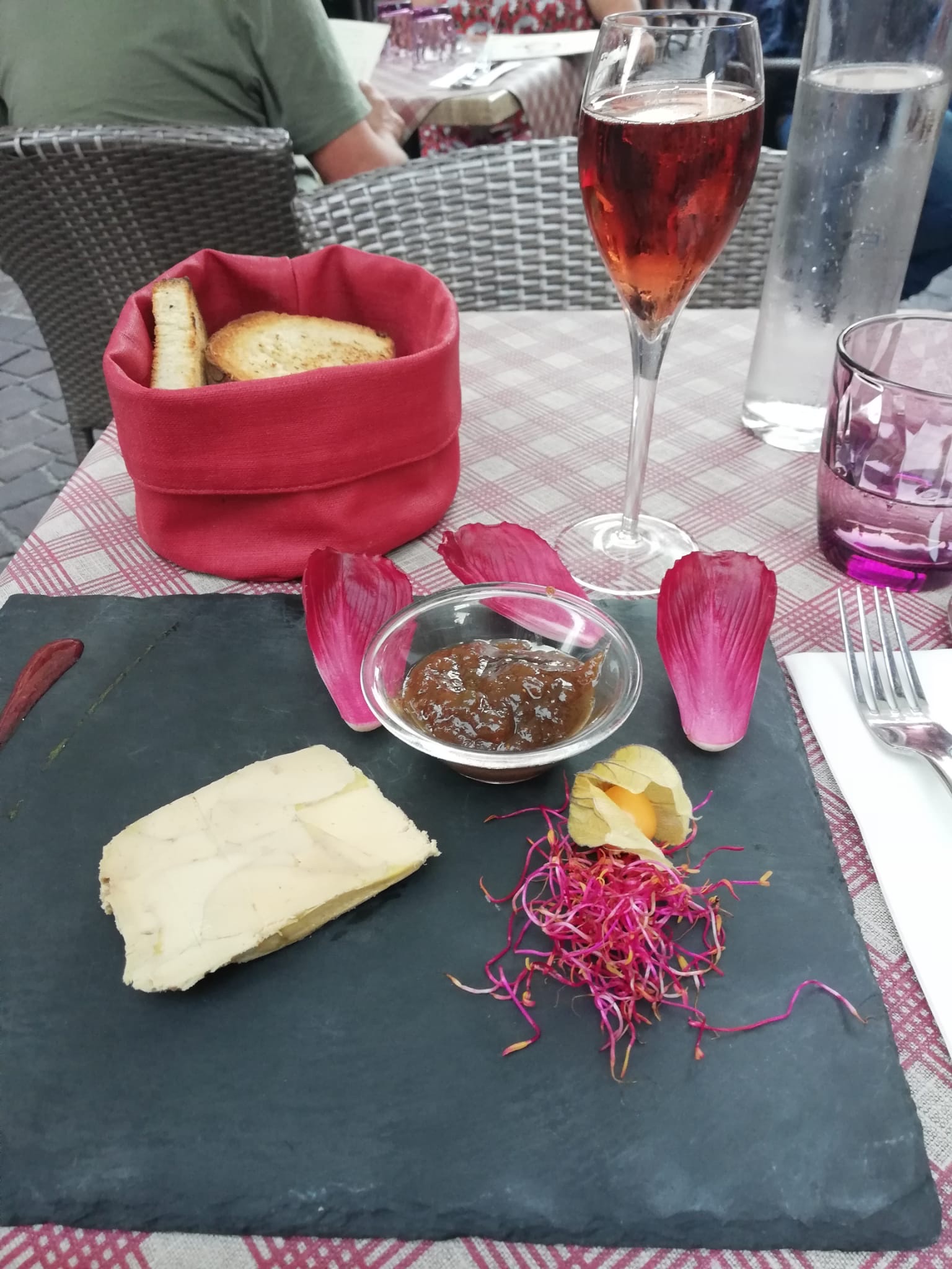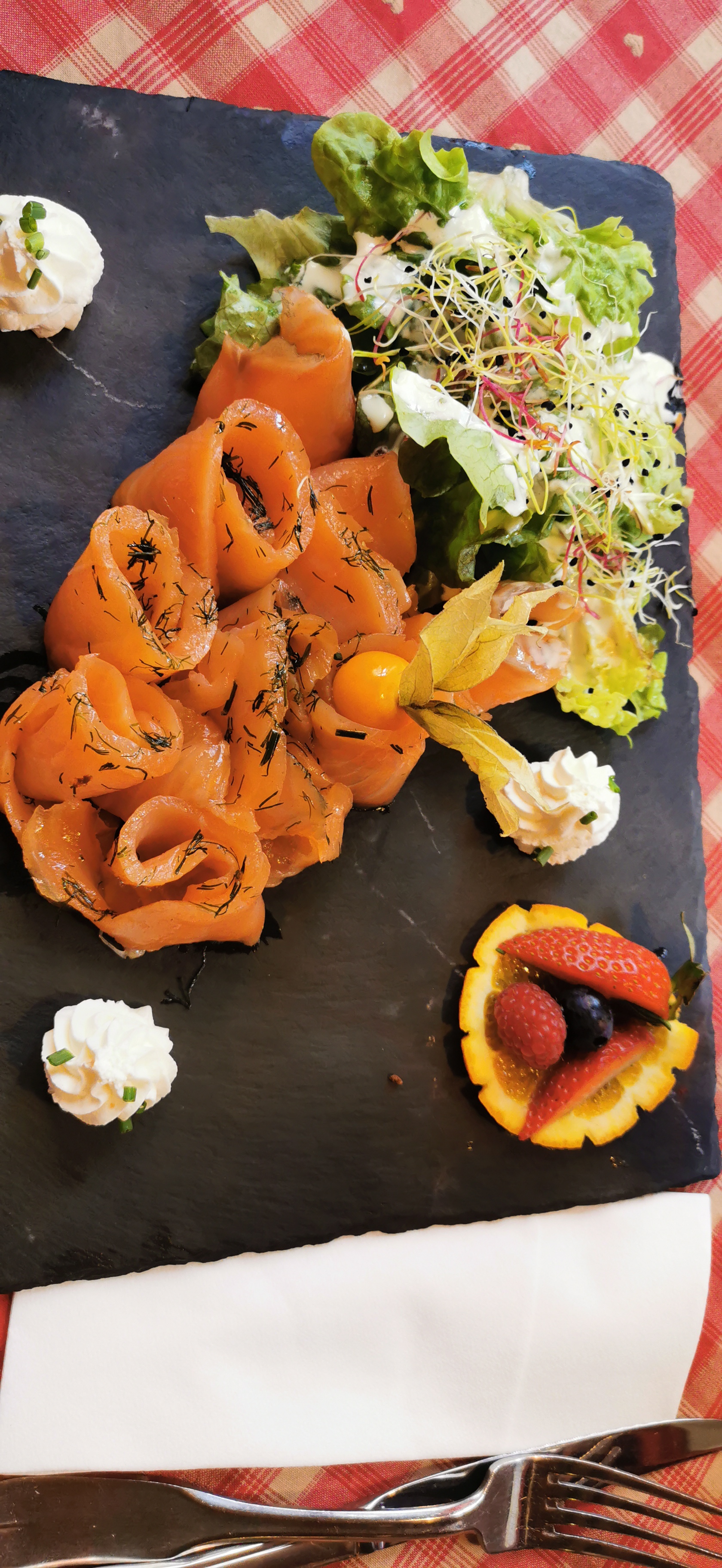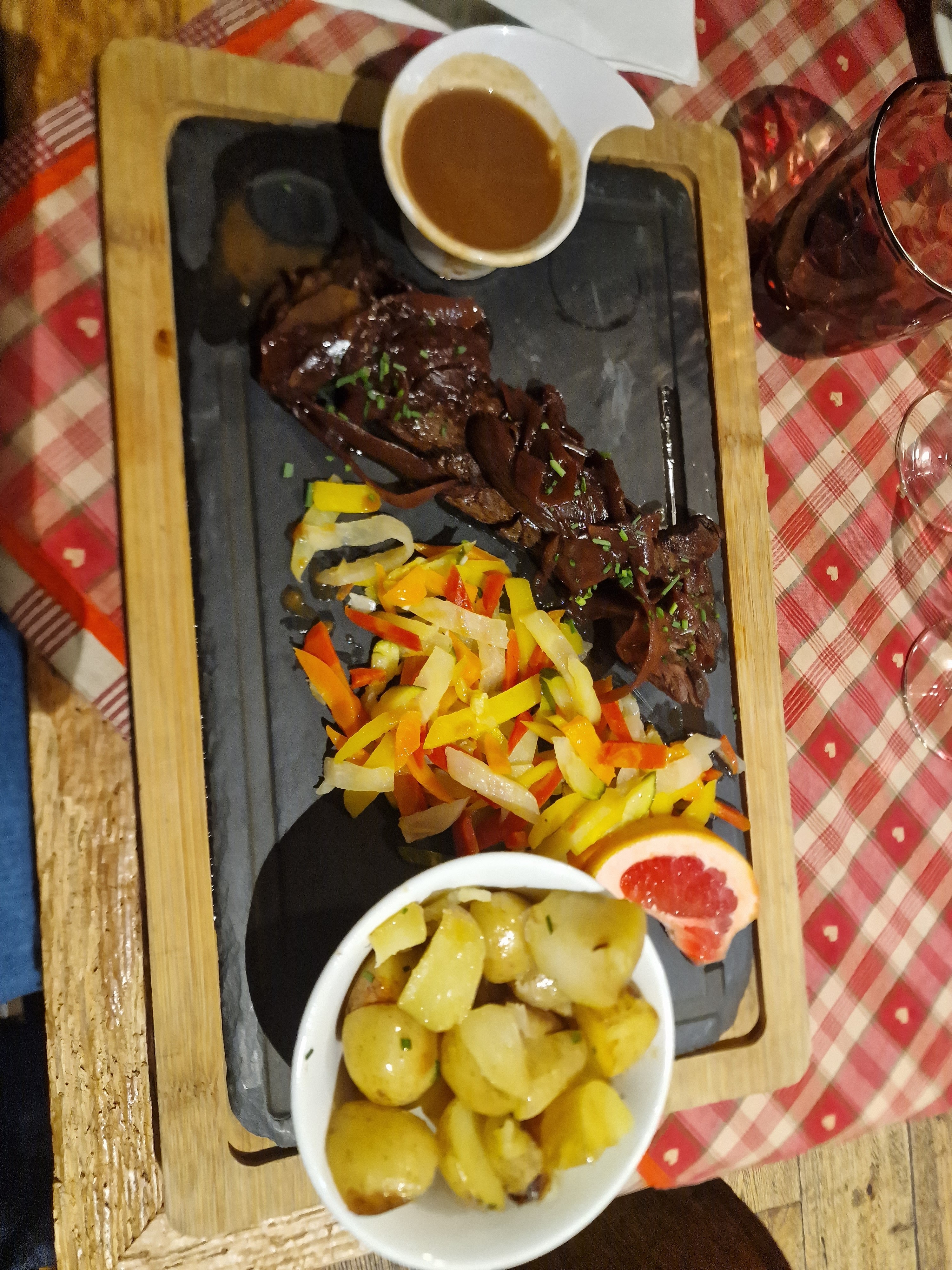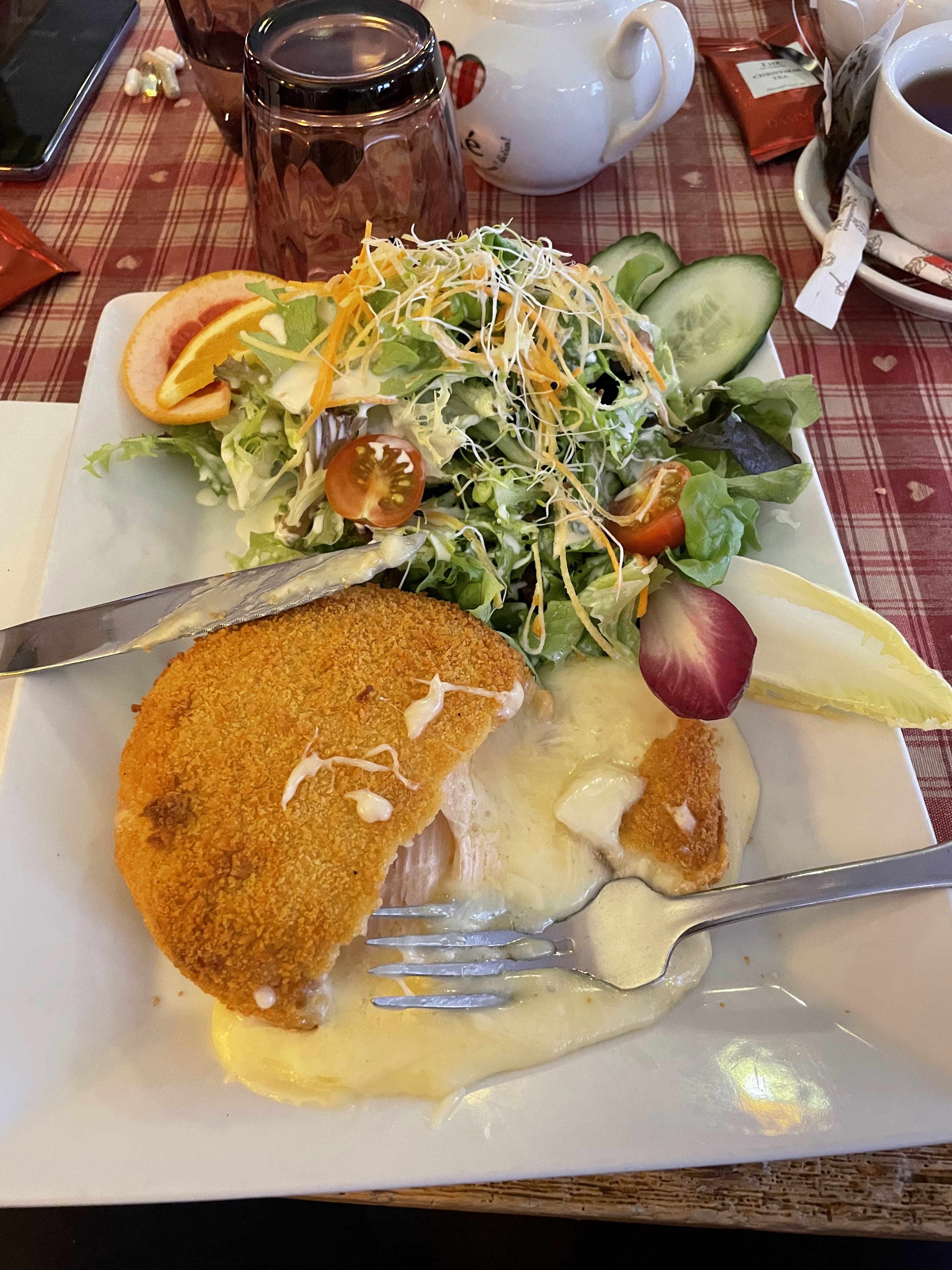 Nous avions une table près de la porte d’entrée, nous avons eu froid car beaucoup de va et vient. Le repas était bon mais pas assez chaud pour le poulet. Très bonne forêt noire mais seulement 2 cerises dans la part de gâteau.