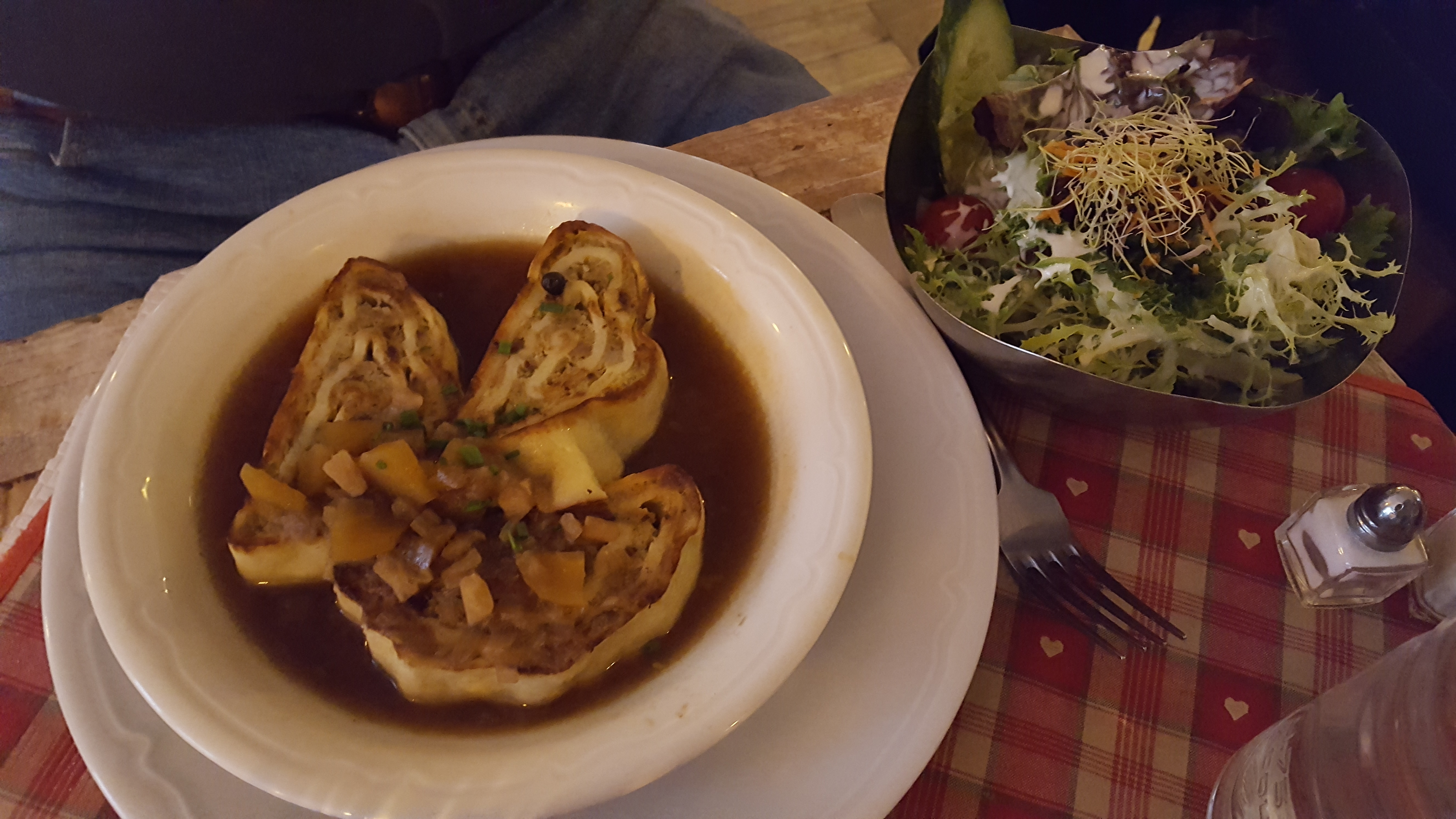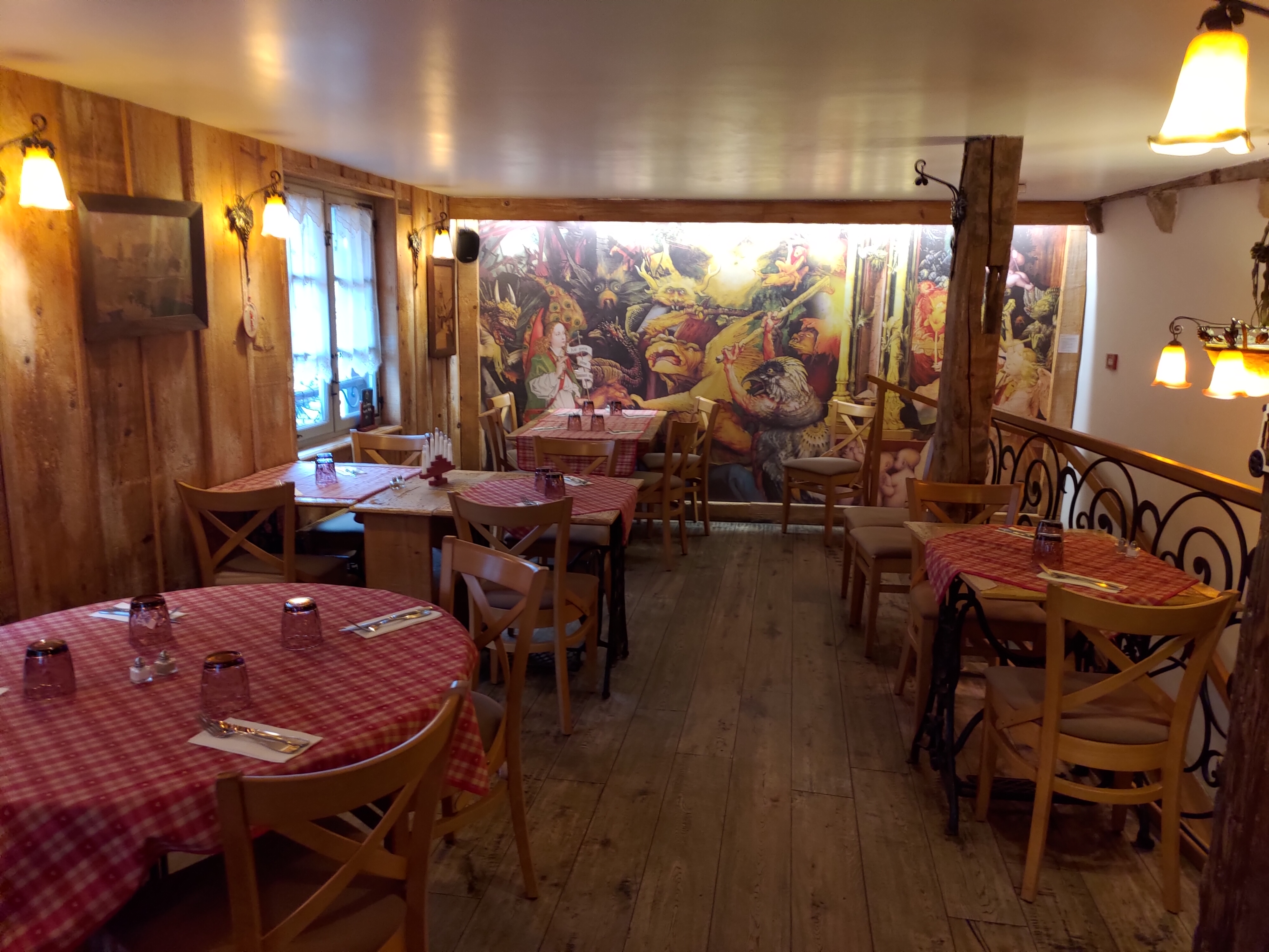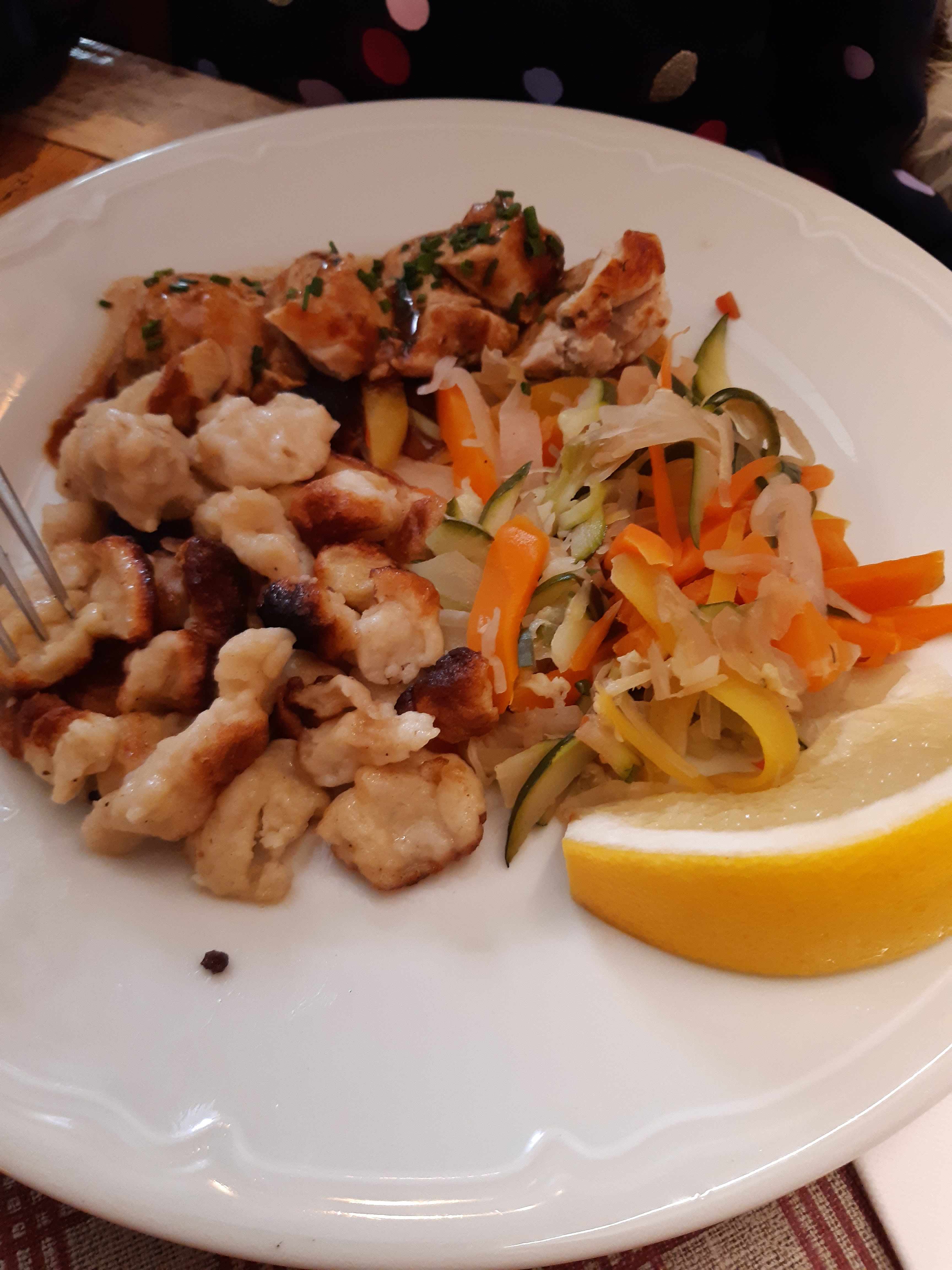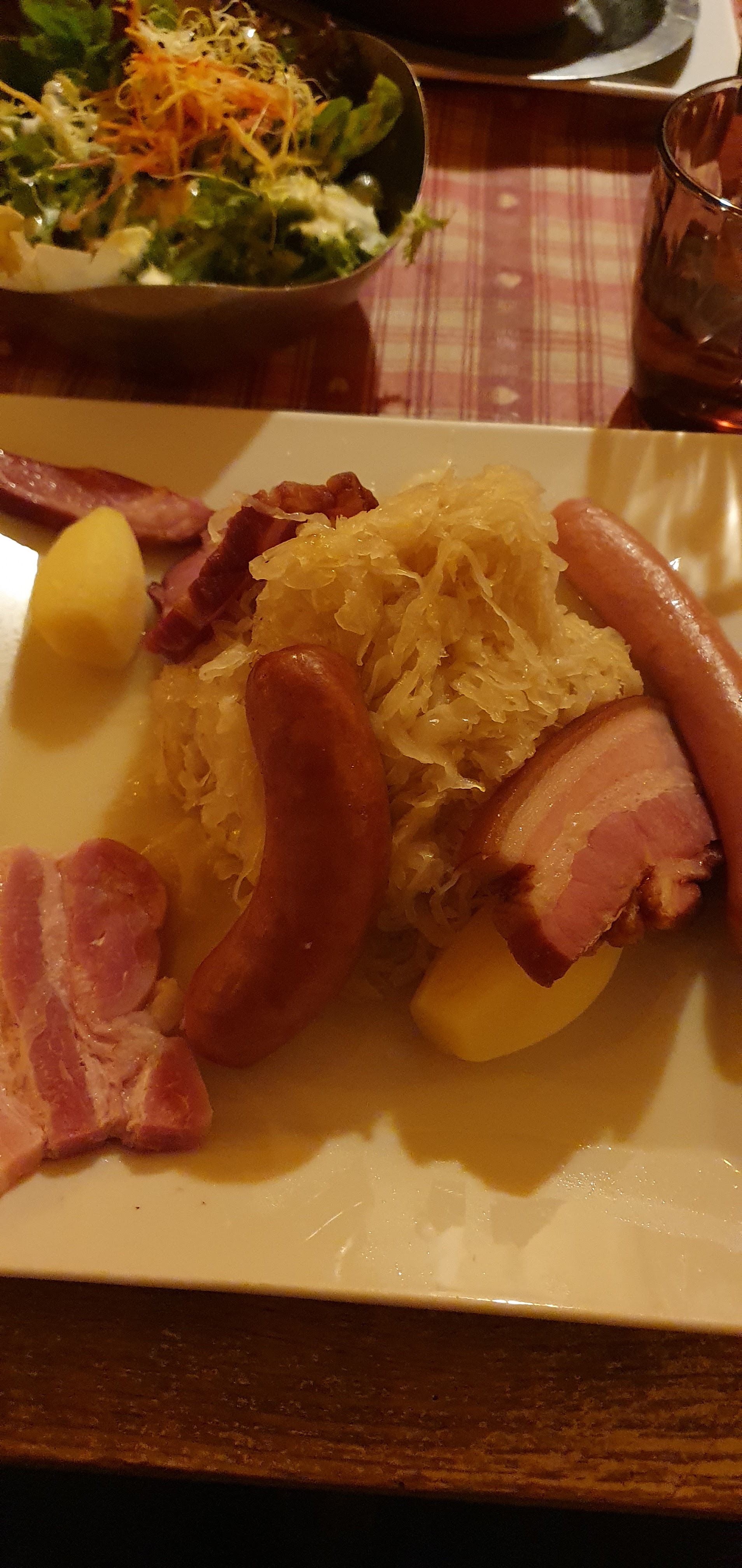Après 35 minutes d'attente dans le froid, nous avons été placés dans une salle toute de bois décorée. Les spatzle au munster étaient très bons et trèèèèès copieux (équivalent de 2 repas). Une bonne adresse à Colmar !