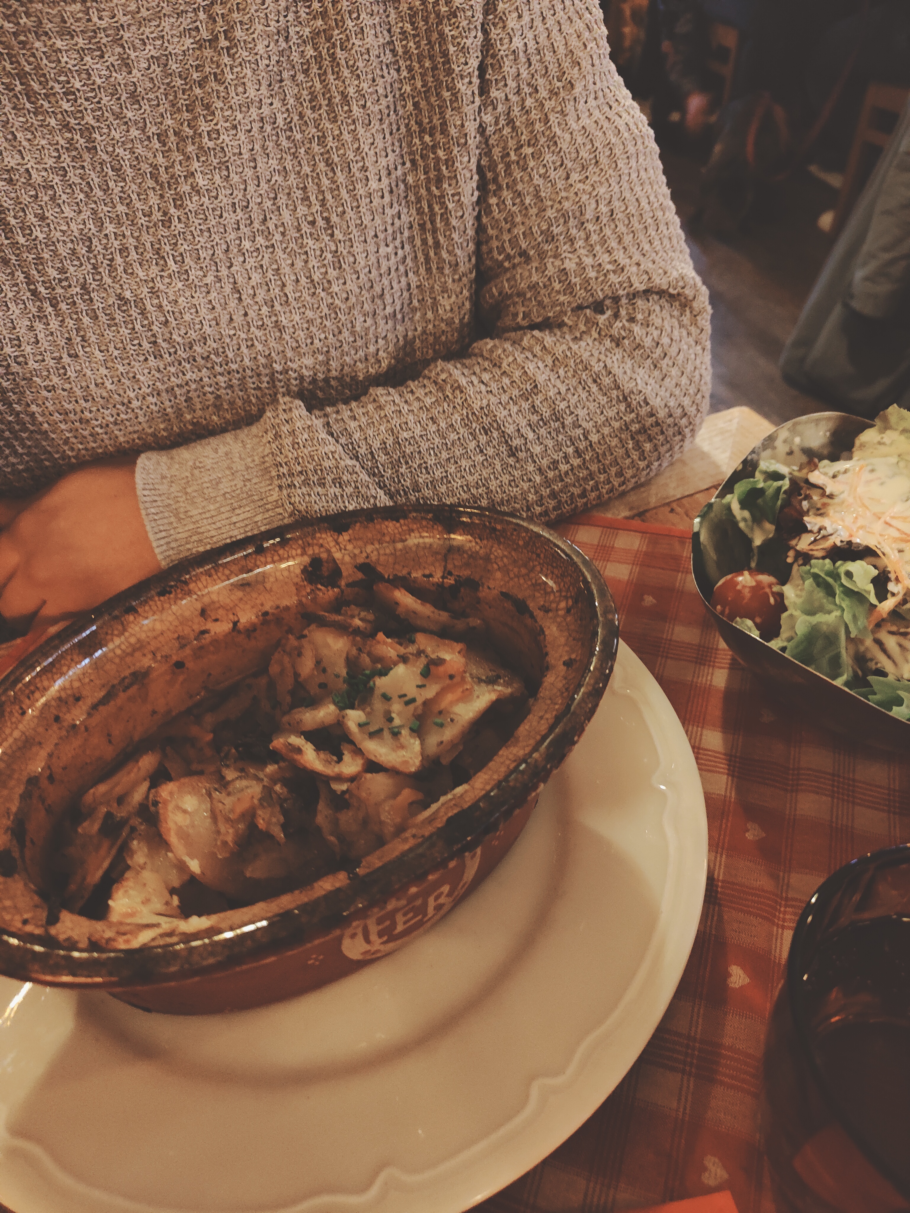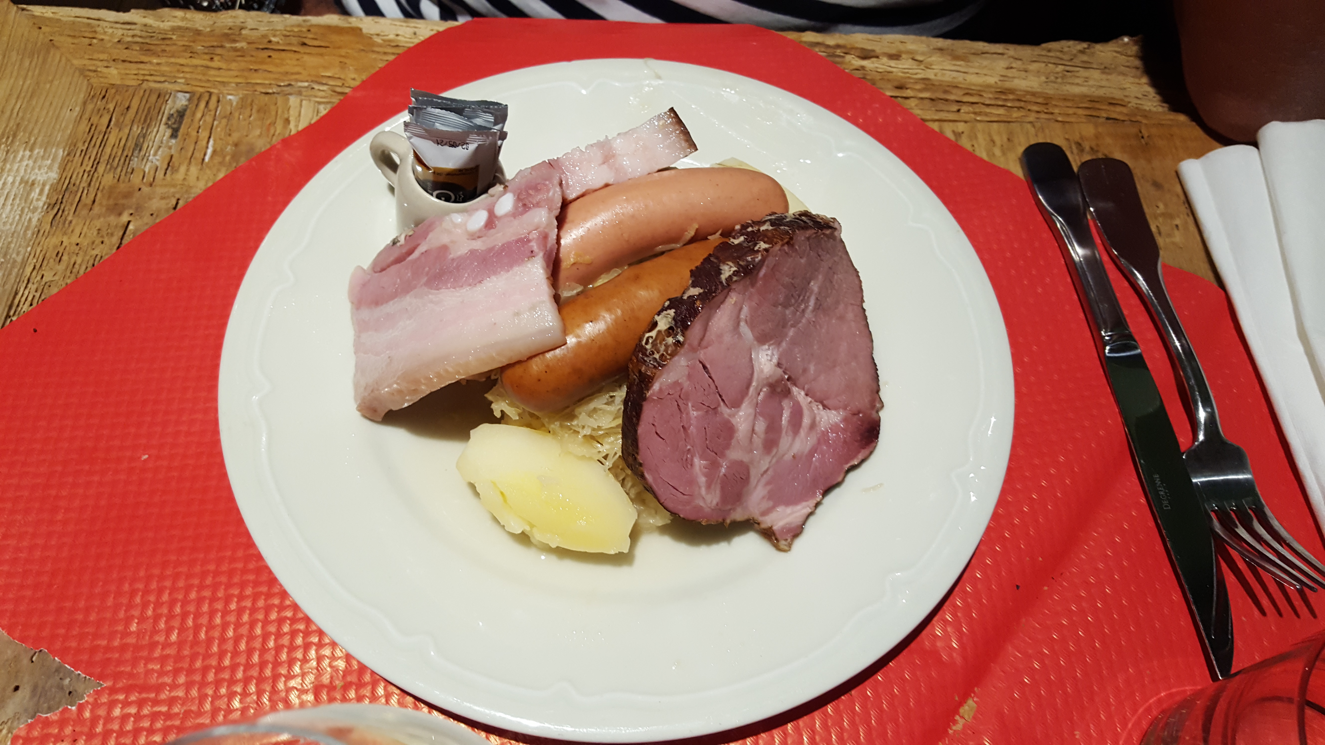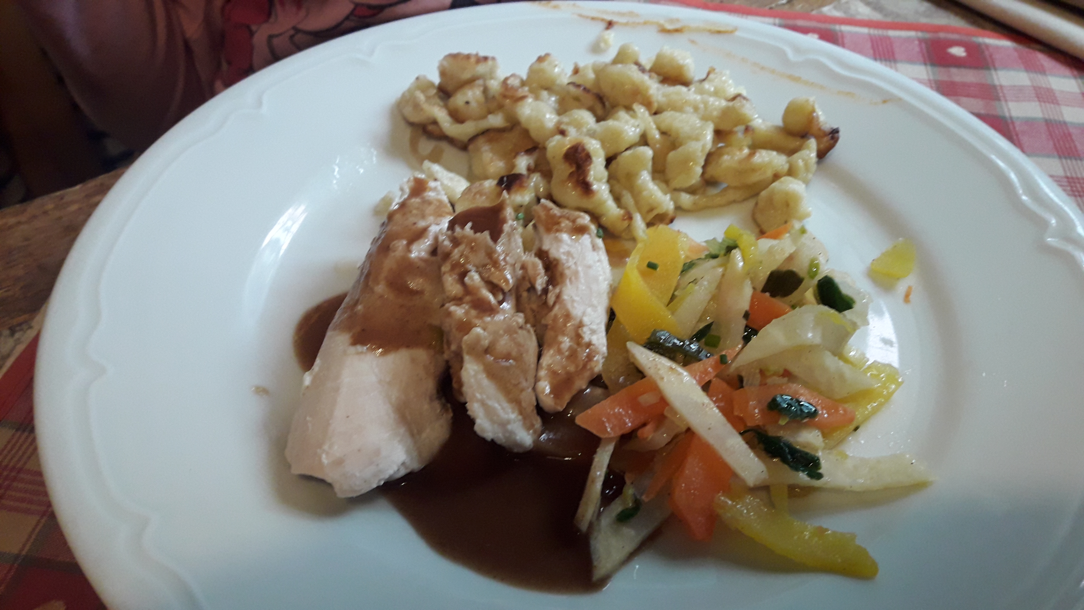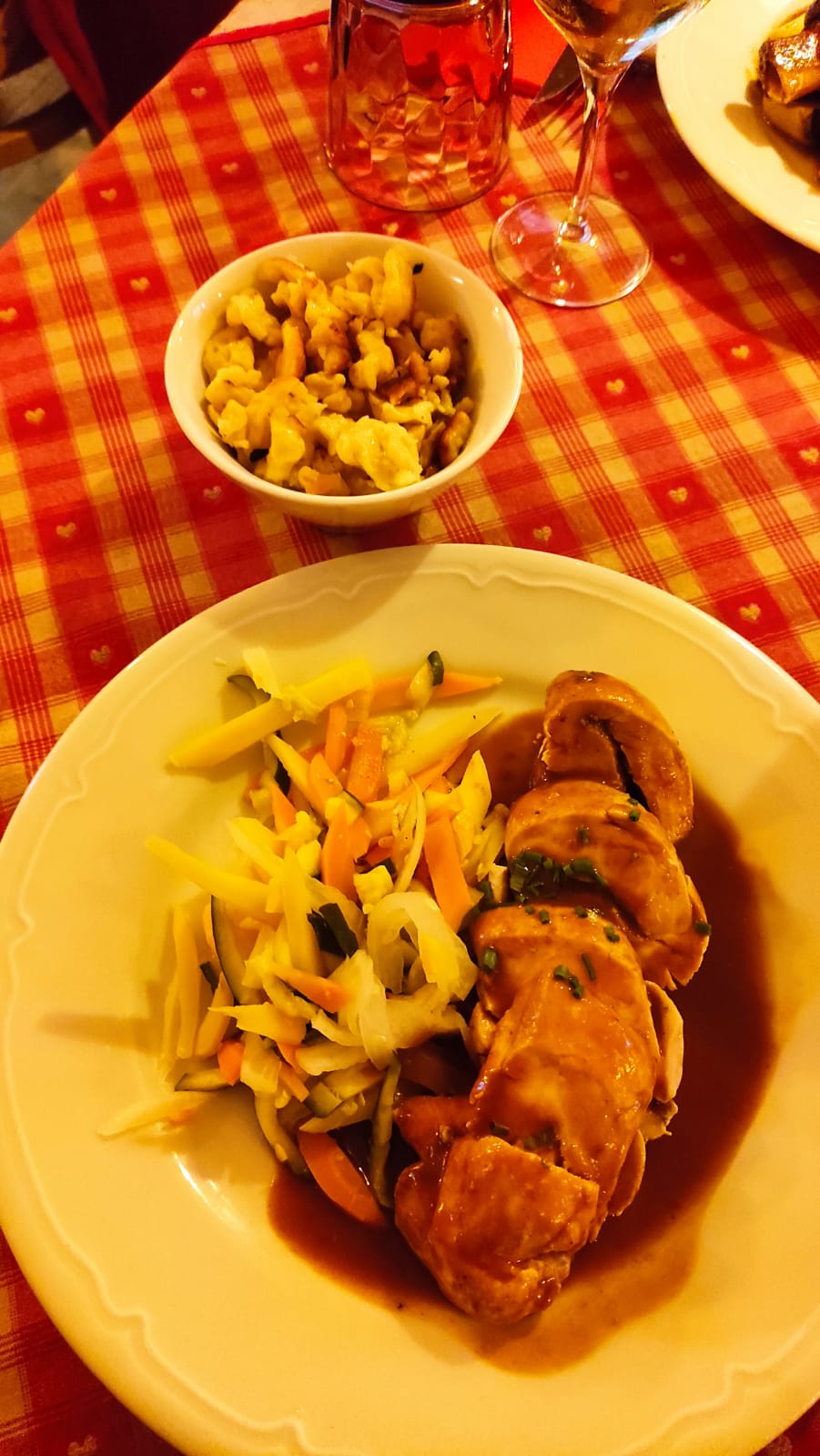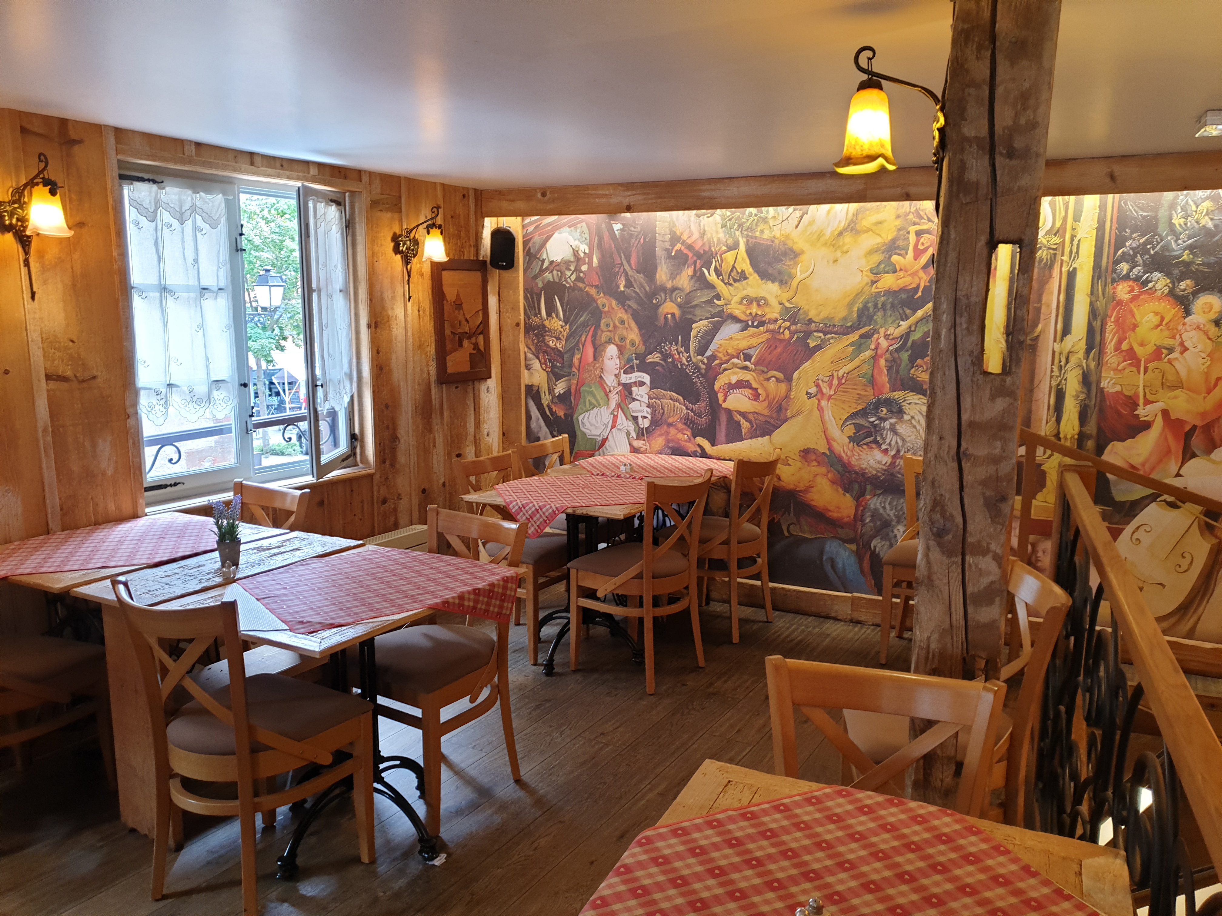 Après 35 minutes d'attente dans le froid, nous avons été placés dans une salle toute de bois décorée. Les spatzle au munster étaient très bons et trèèèèès copieux (équivalent de 2 repas). Une bonne adresse à Colmar !