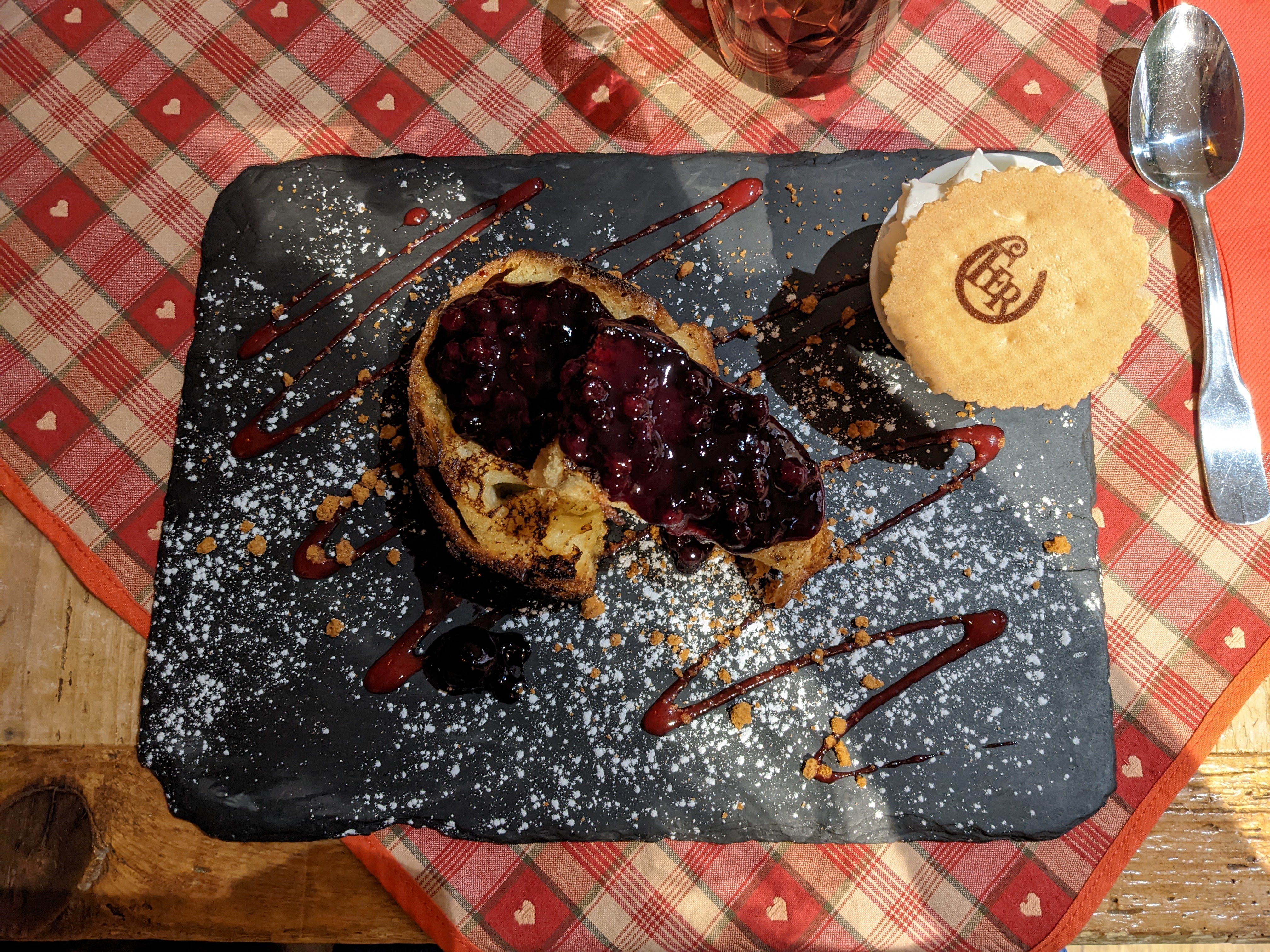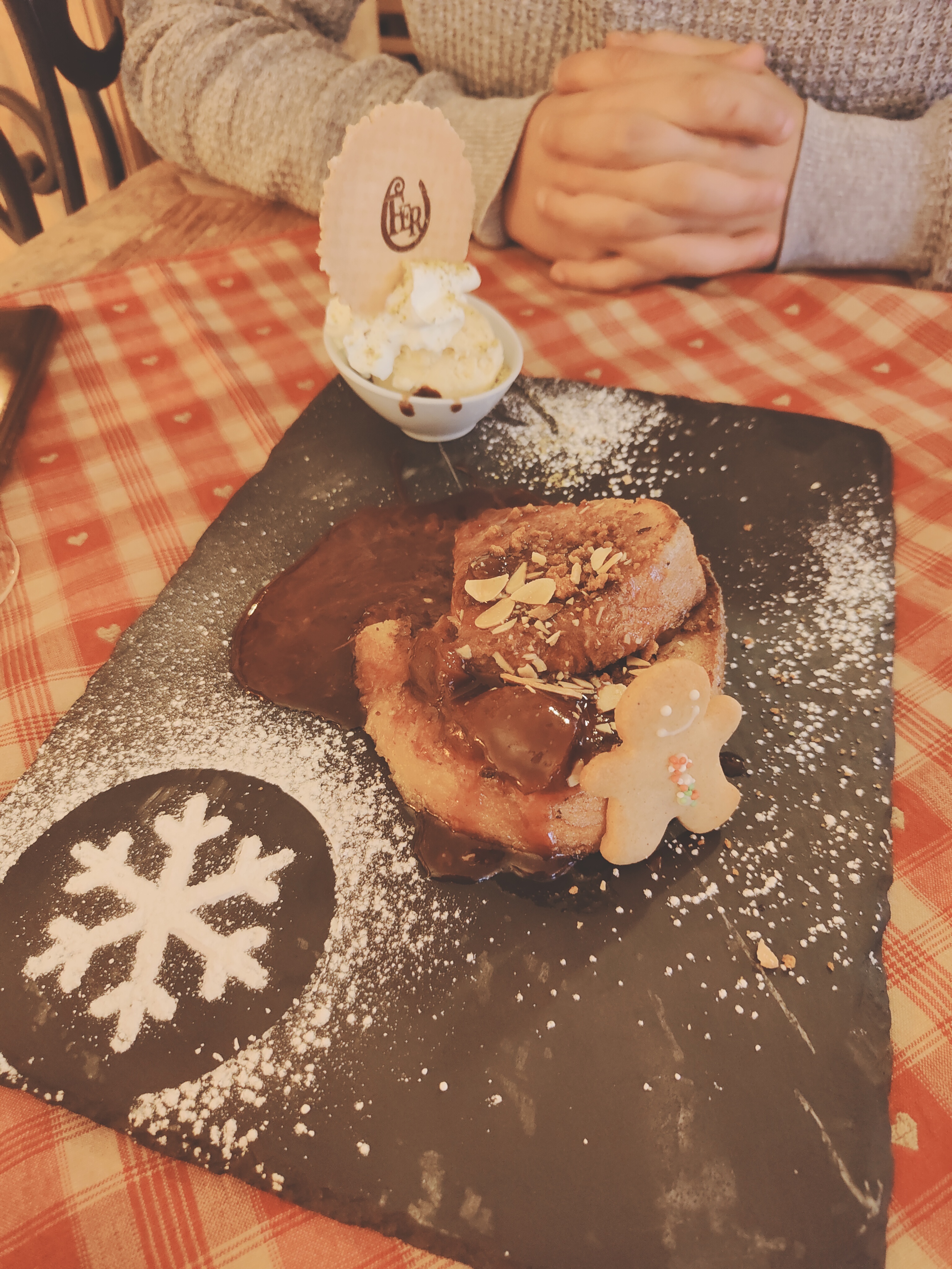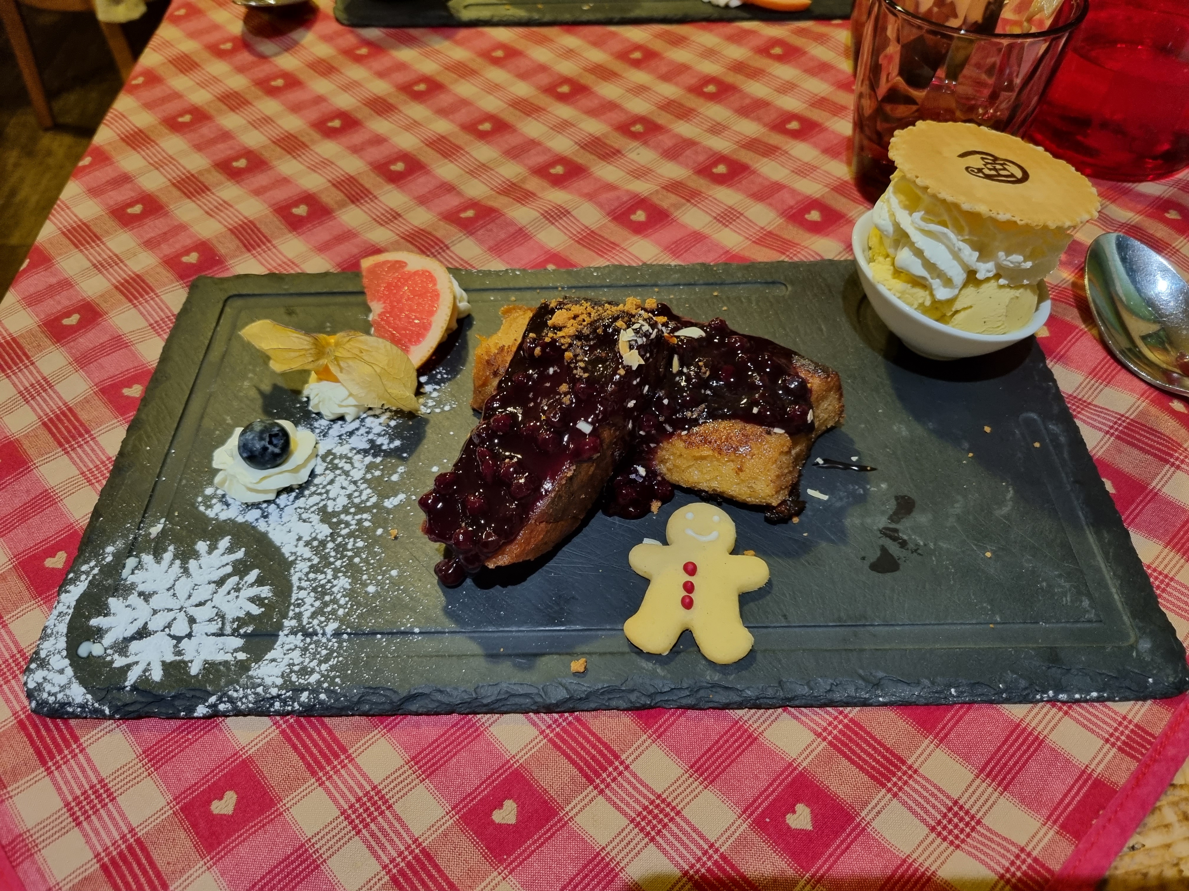 Belle découverte en plein marché de Noël. Restaurant atypique par son charme en terme de décoration et de cuisine. Le service du midi rien à redire, c’était parfait. On sent une bonne ambiance entre l’équipe. Nous avions un serveur très gentil qui nous as proposé des crayons et des feuilles pour nos enfants. Franchement rien à redire. Juste allez y la cuisine est excellente surtout le pain perdu