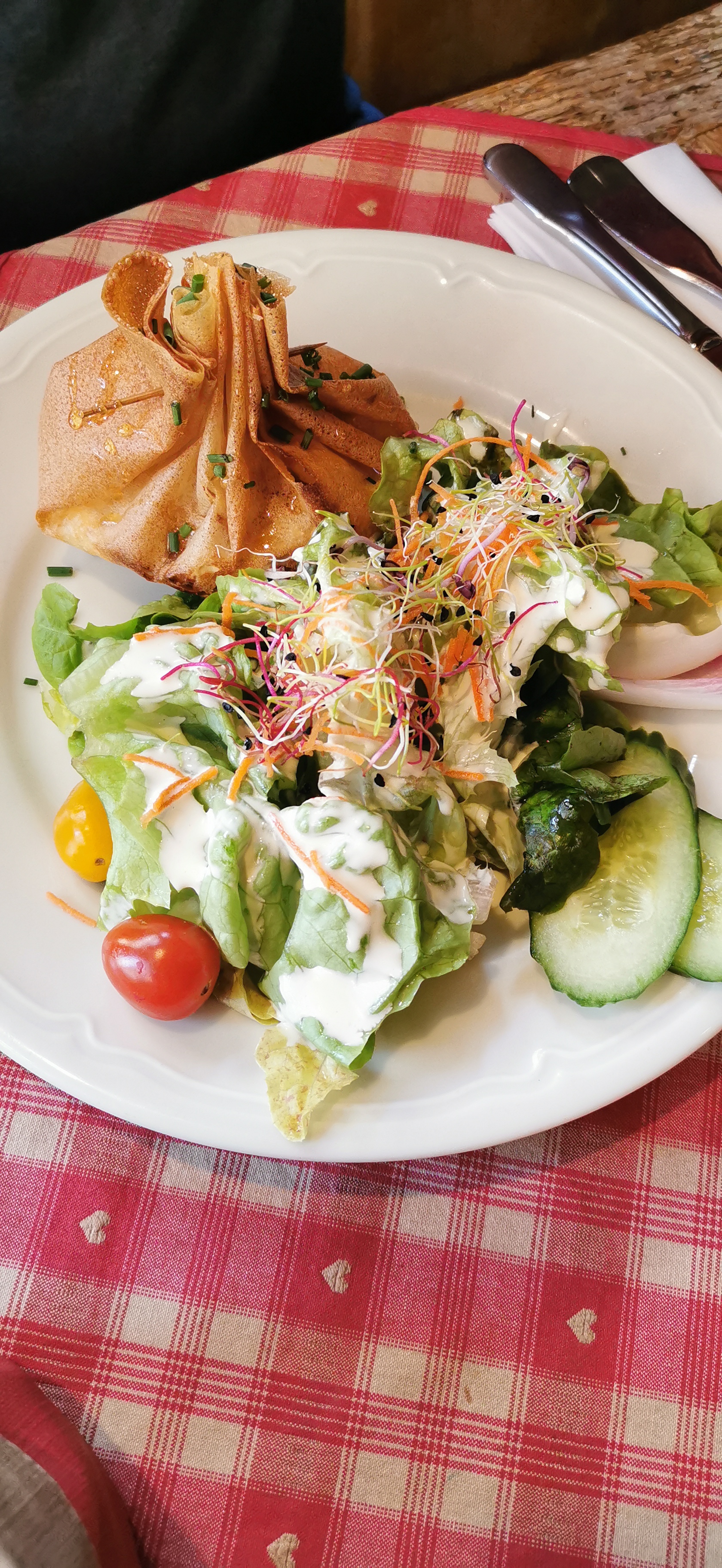 Cadre magnifique, le Resto attire l'attention. Une petite lecture du menu, il faut dire qu'il était l'heure de manger. Une demi-heure d'attente parce que le resto n'était pas encore ouvert et j'ai bien fait quand j'ai vu le monde qui était derrière. Je n'avais pas encore goûté un baeckeoffe, chose faite. J'ai très bien mangé, en suffisance, quand vous voyez le dessert, superbe endroit, chaleureux et personnel très sympathique. J'y retournerai.