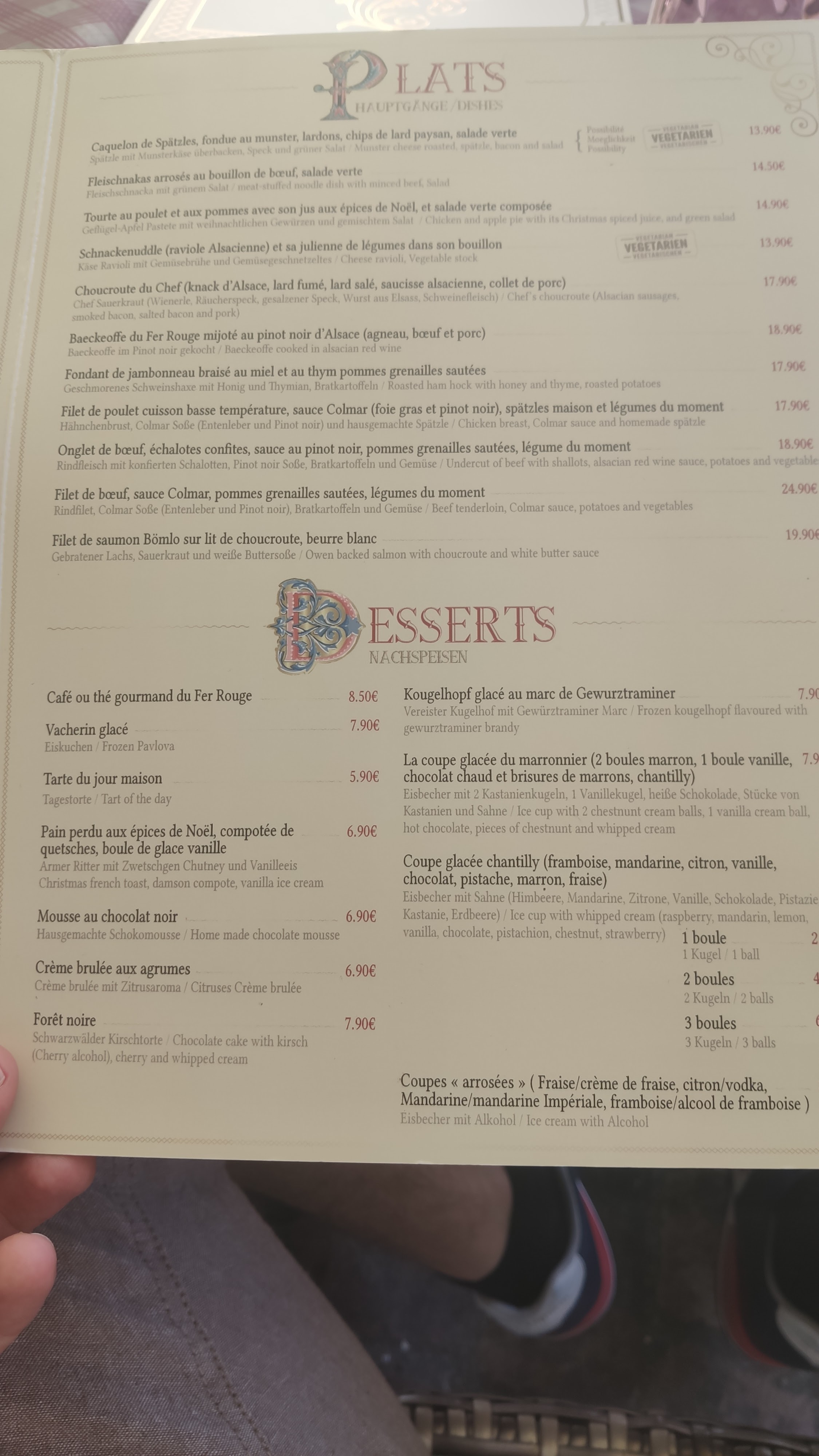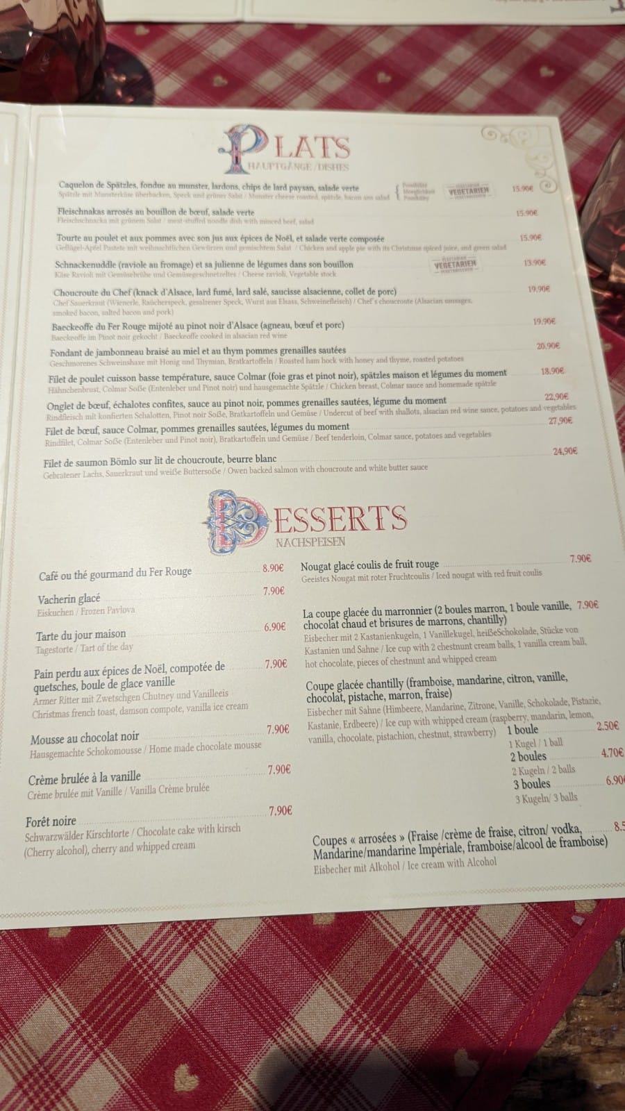 Restaurant sympathique et agréable à la décoration très Alsacienne. Serveurs efficace et dynamique et cuisine avec de nombreuses spécialités de la région. Nous nous sommes régalé avec les différents plats et desserts . Les prix sont correct et cohérent avec l'ensemble, un restaurant qu'ont vous conseille . Le tous malgré l'affluence du marché de Noël. https://www.tripadvisor.fr/ShowUserReviews-g187073-d8686715-r988014498-Le_Fer_Rouge-Colmar_Haut_Rhin_Grand_Est.html#