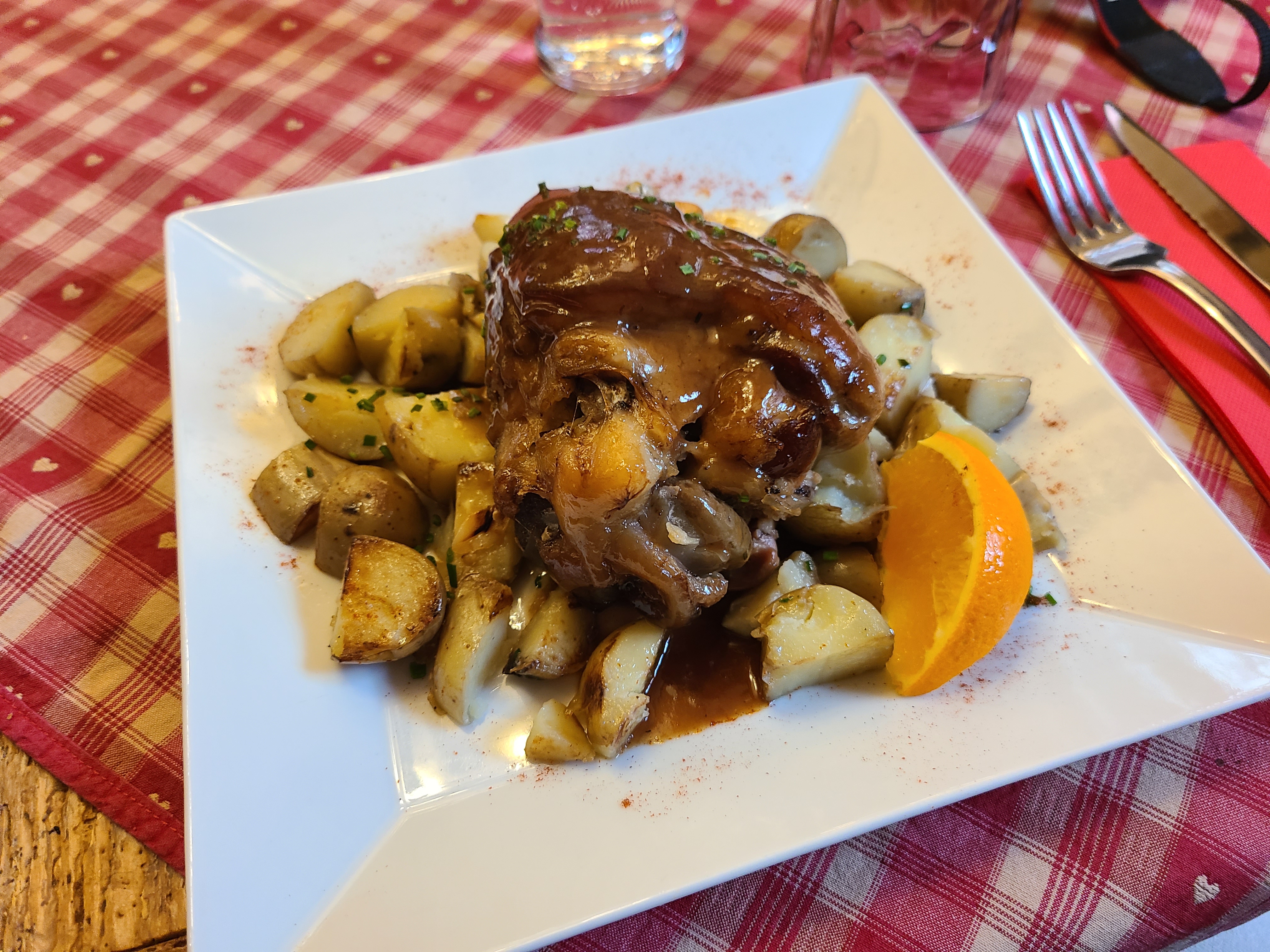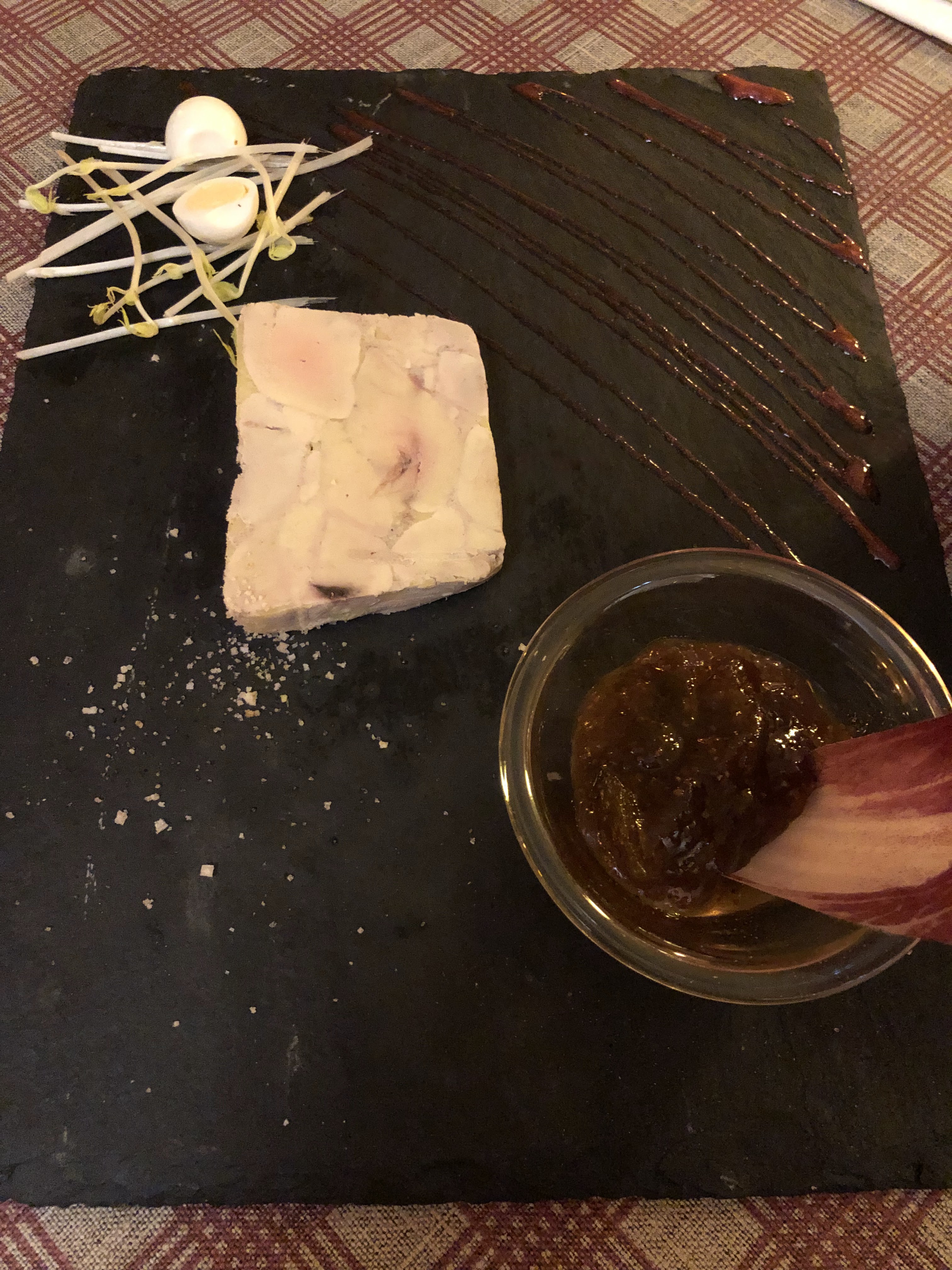 Je suis venu en juin dernier avec des amis. J'avais pris en plat un fondant de jambonneau braisé au miel et au thym pommes grenailles sautées c'était bon. Je trouve juste que les pommes grenailles n'étaient pas assez en quantité. En dessert j'avais pris une forêt noire qui était bonne.