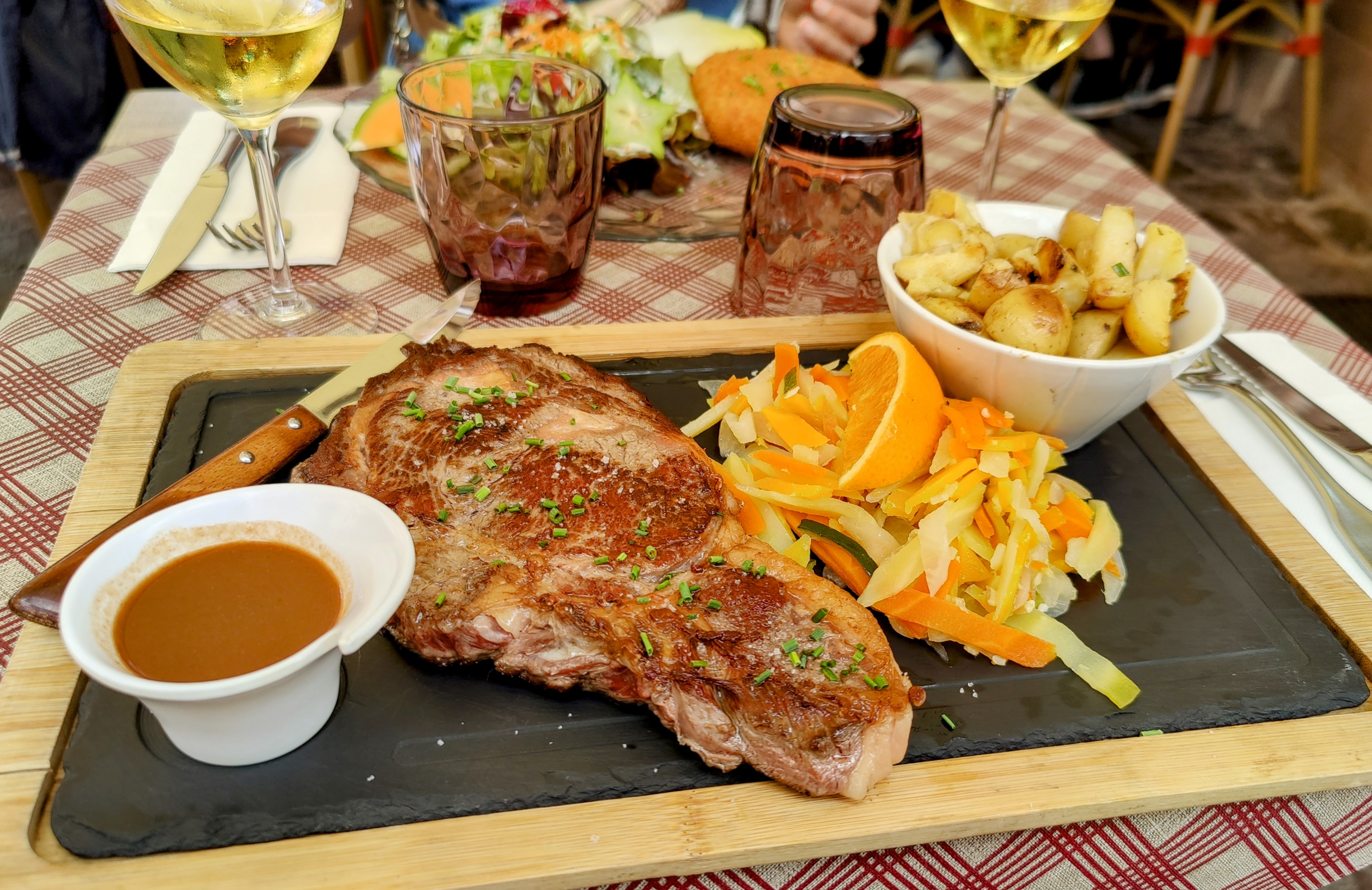 Suite à la recommandation à l’accueil de notre hôtel nous décidons de nous arrêter dans ce restaurant. Malgré la période du marcher de Noël le personnel rester accueillant et souriant, malgré l’irrespect de certains clients la Chef de rang Camille est les autres serveurs on été adorable avec nous. Et pour le repas nous nous sommes régaler et avons bien bu.