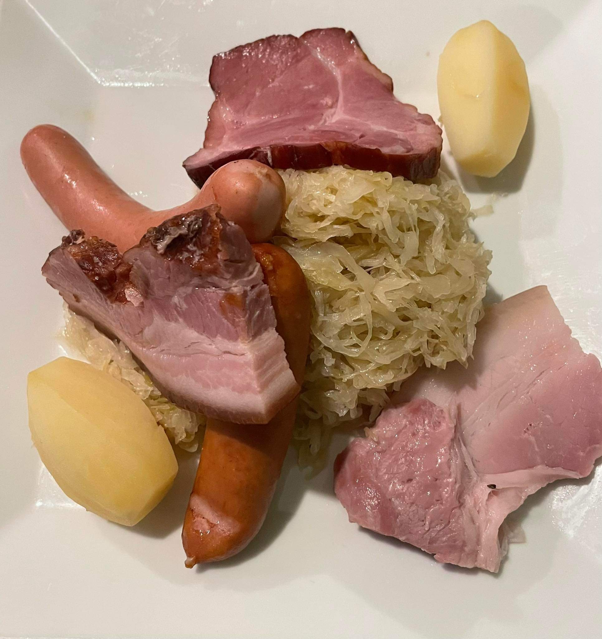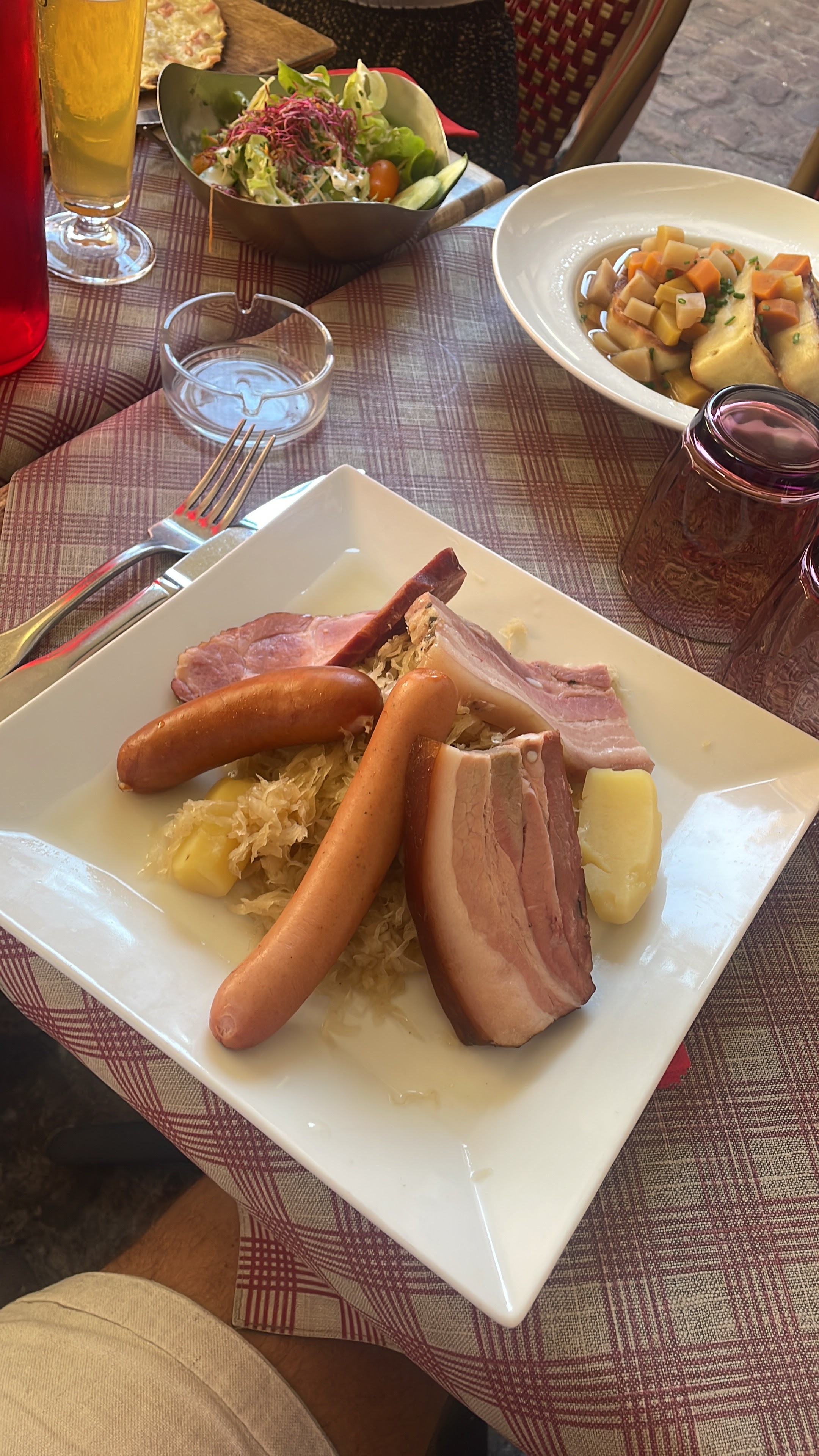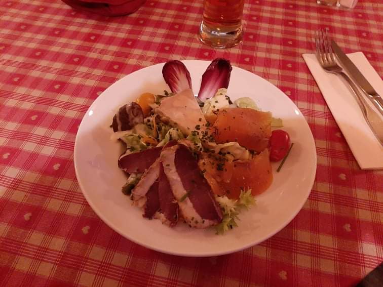 Beaucoup de monde pour ce restaurant très réputé de Colmar. Il faut réserver pour espérer y manger. Le serveur est agréable et souriant même derrière son masque. La tarte flambée est bonne Les entrées également La choucroute est bien servie Les fleischschnackas ne sont pas à la hauteur... pâte pas assez cuite et peu de farce. Le bouillon est plutôt bon. Plus de place pour le dessert.