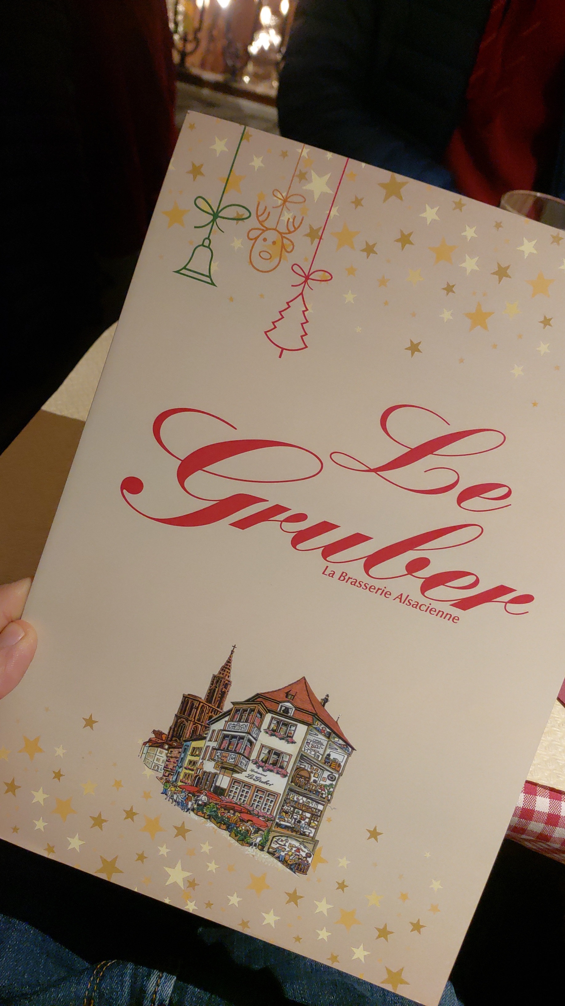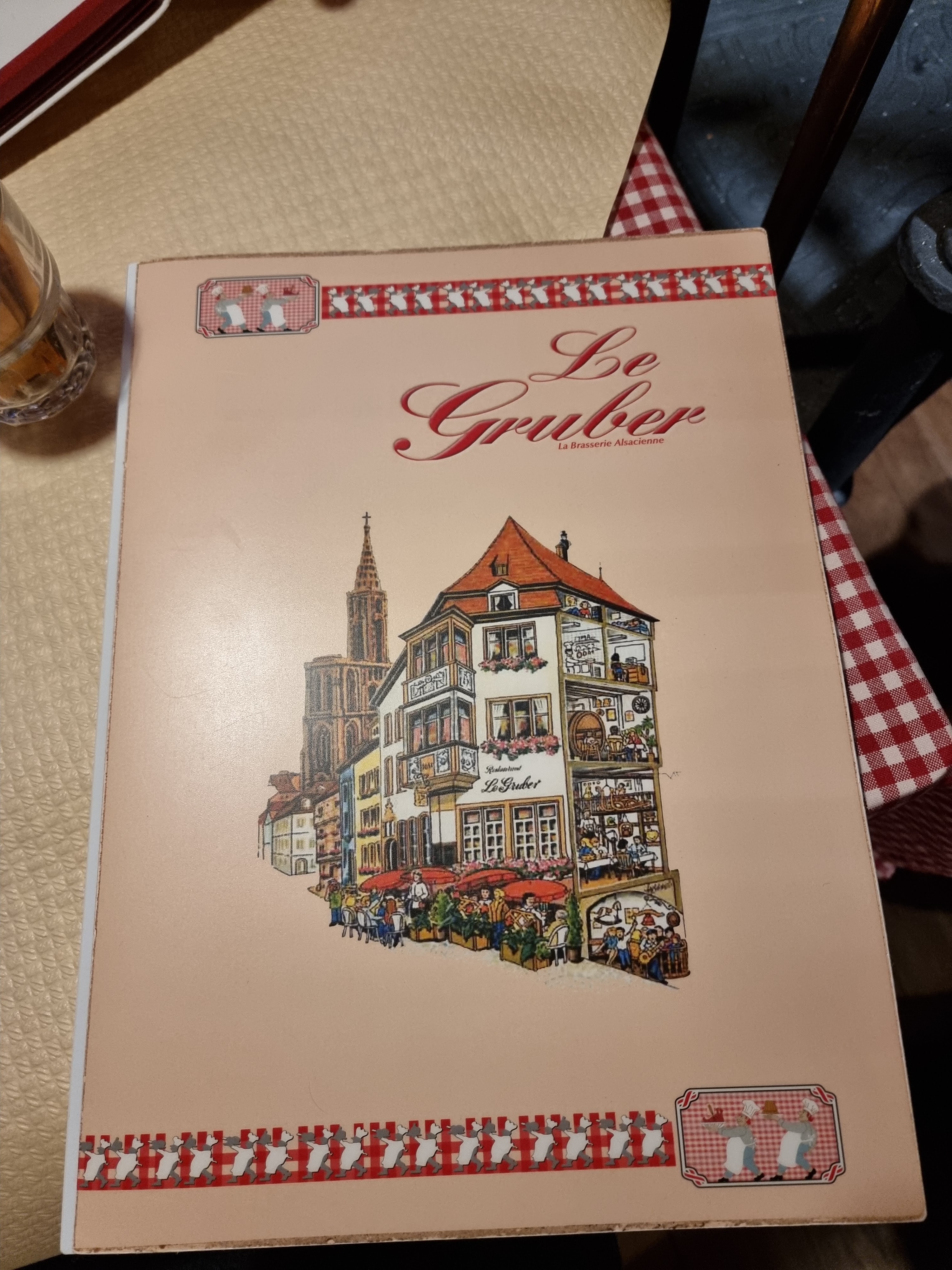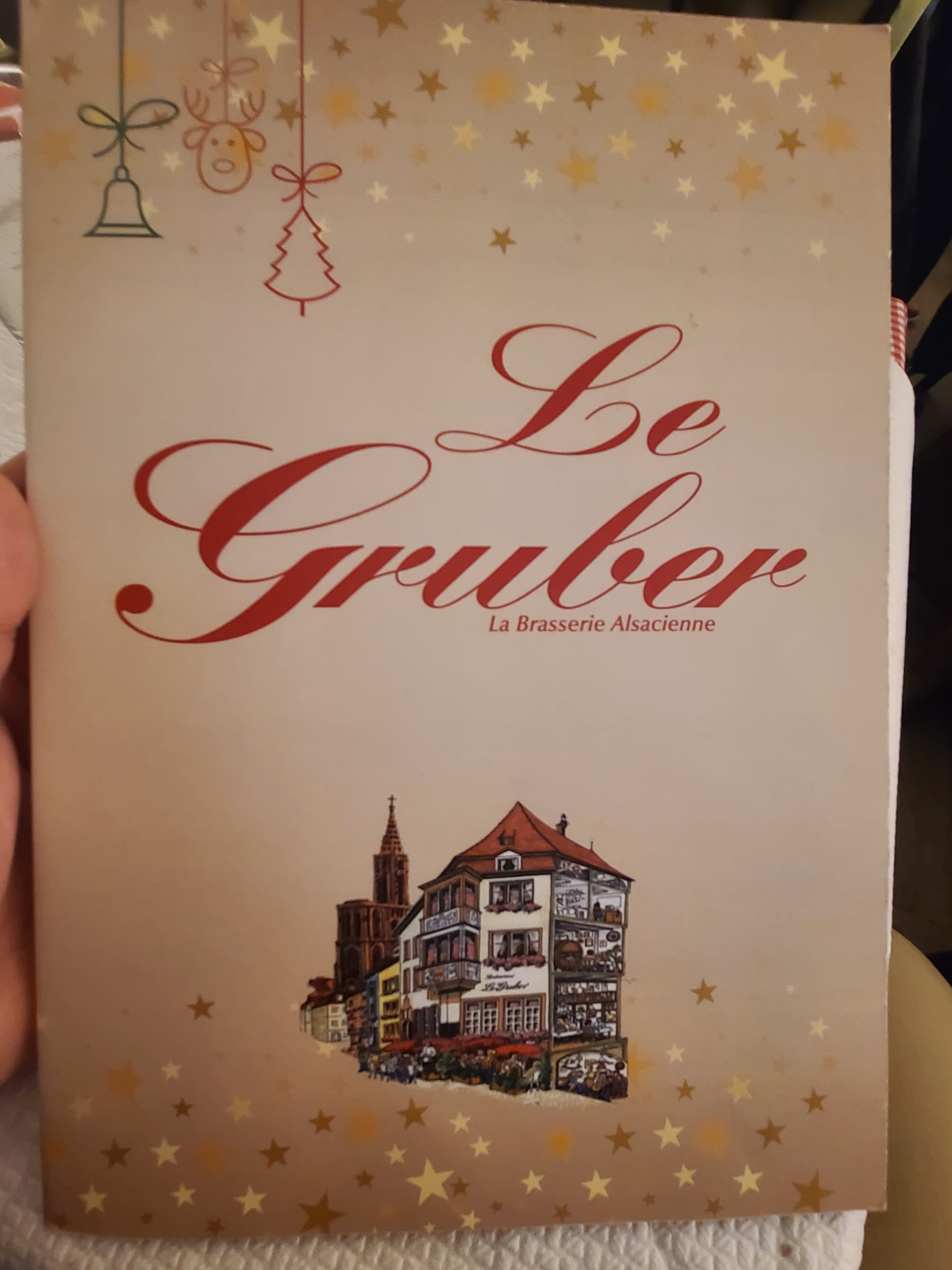 dans ce quartier si touristique de Strasbourg, a deux pas de la cathédrale, nous craignions de tomber dans un piège à touristes. Il n'en fut rien et nous avons quitté cet établissement fort contents nous avons opté pour une formule a 25,5€. pour commencer une délicieuse salade de pot au feu à laquelle il n'y a vraiment rien à redire. Puis un poulet au Riesling avec Spatzle et chou rouge à la cannelle. ce plat est revigorant et nous a fait du bien après une matinée a arpenter la ville dans le froid. enfin, un délicieux vacherin glacé vanille fraise. mention spéciale à notre serveur rapide et tres sympa. vous l'avez compris pour nous Gruber rime avec bonheur
