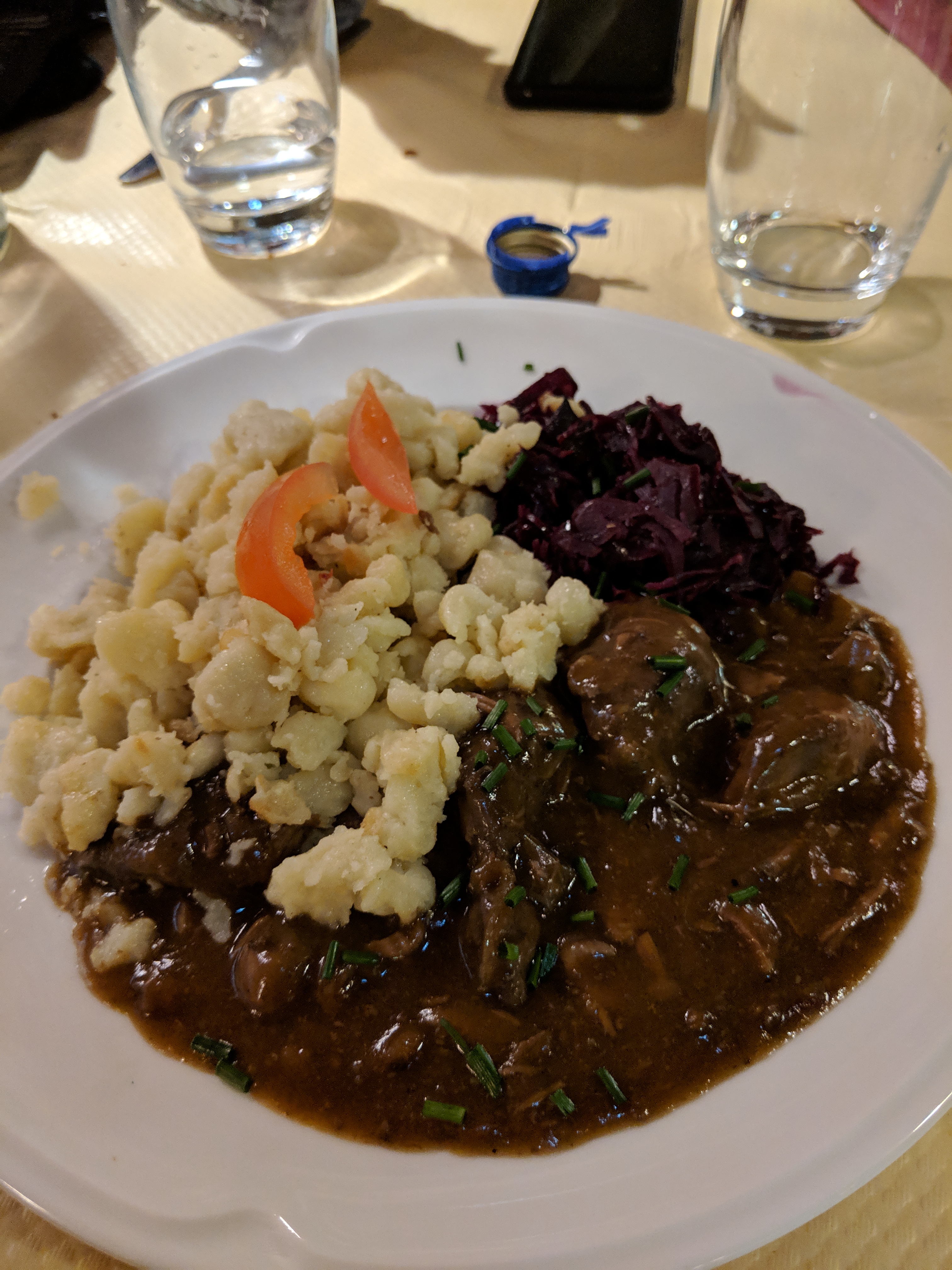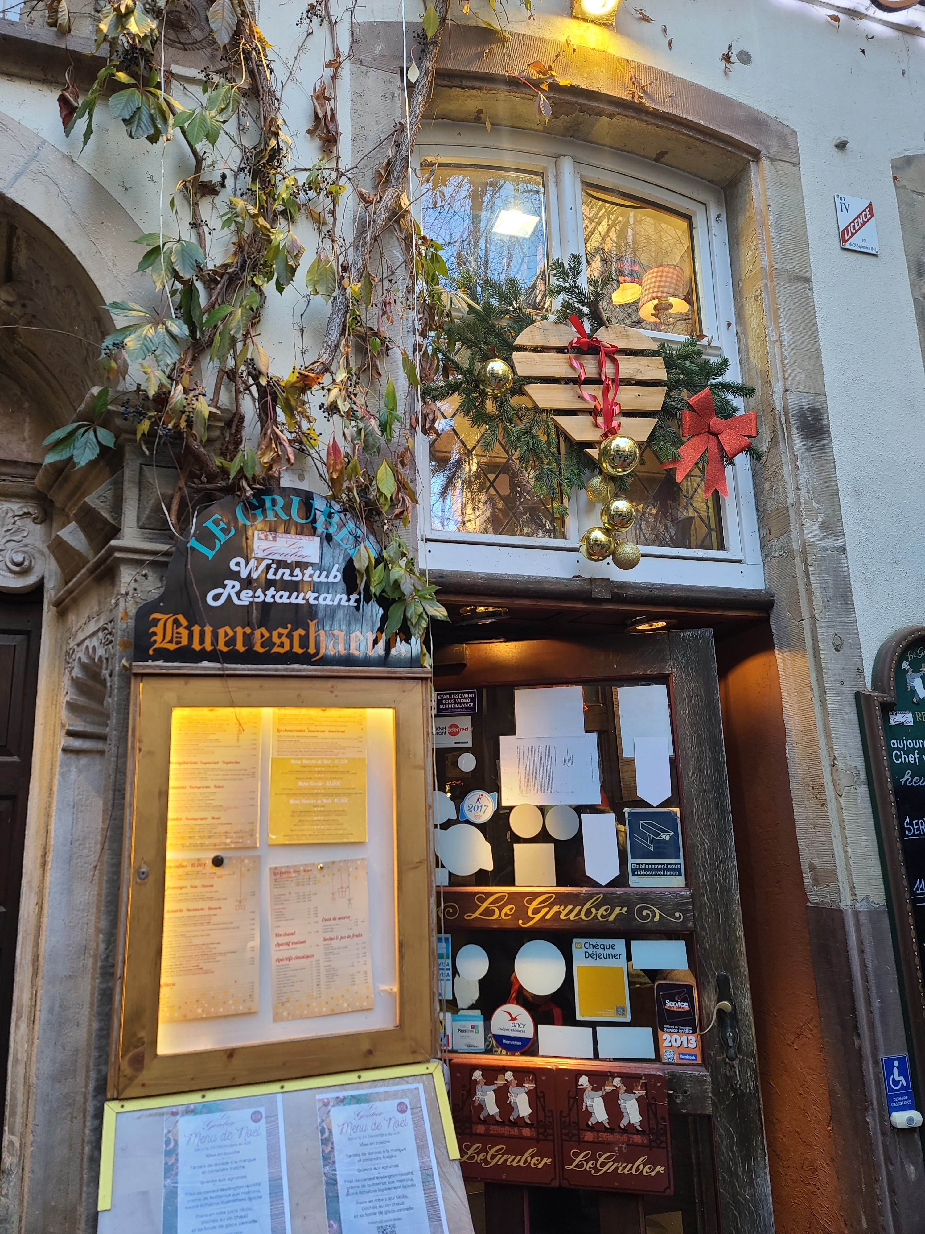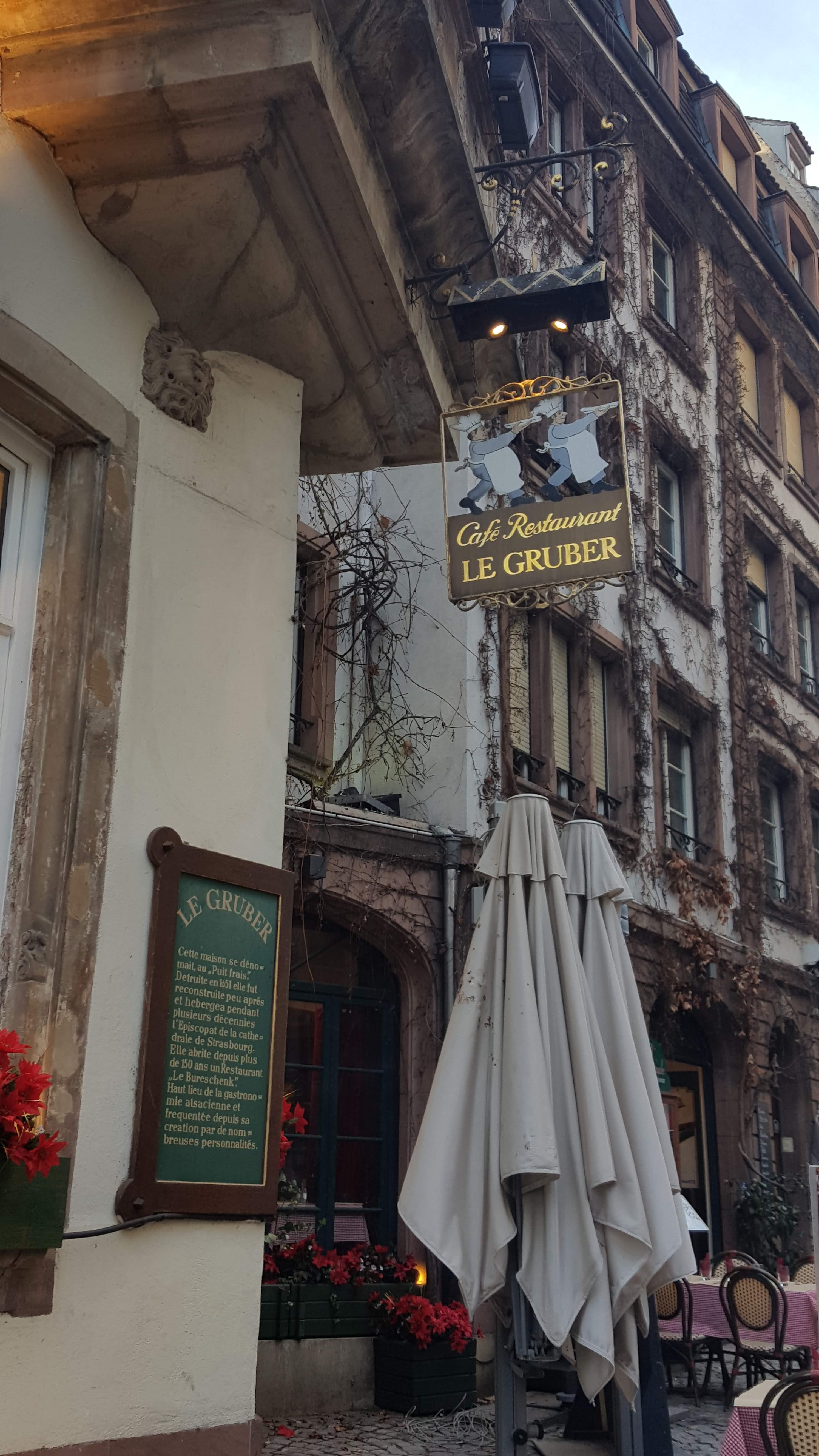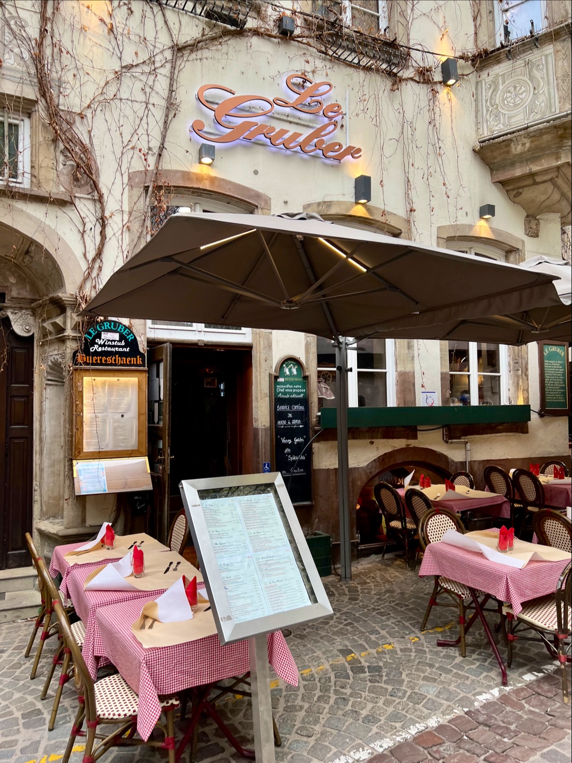 dans ce quartier si touristique de Strasbourg, a deux pas de la cathédrale, nous craignions de tomber dans un piège à touristes. Il n'en fut rien et nous avons quitté cet établissement fort contents nous avons opté pour une formule a 25,5€. pour commencer une délicieuse salade de pot au feu à laquelle il n'y a vraiment rien à redire. Puis un poulet au Riesling avec Spatzle et chou rouge à la cannelle. ce plat est revigorant et nous a fait du bien après une matinée a arpenter la ville dans le froid. enfin, un délicieux vacherin glacé vanille fraise. mention spéciale à notre serveur rapide et tres sympa. vous l'avez compris pour nous Gruber rime avec bonheur