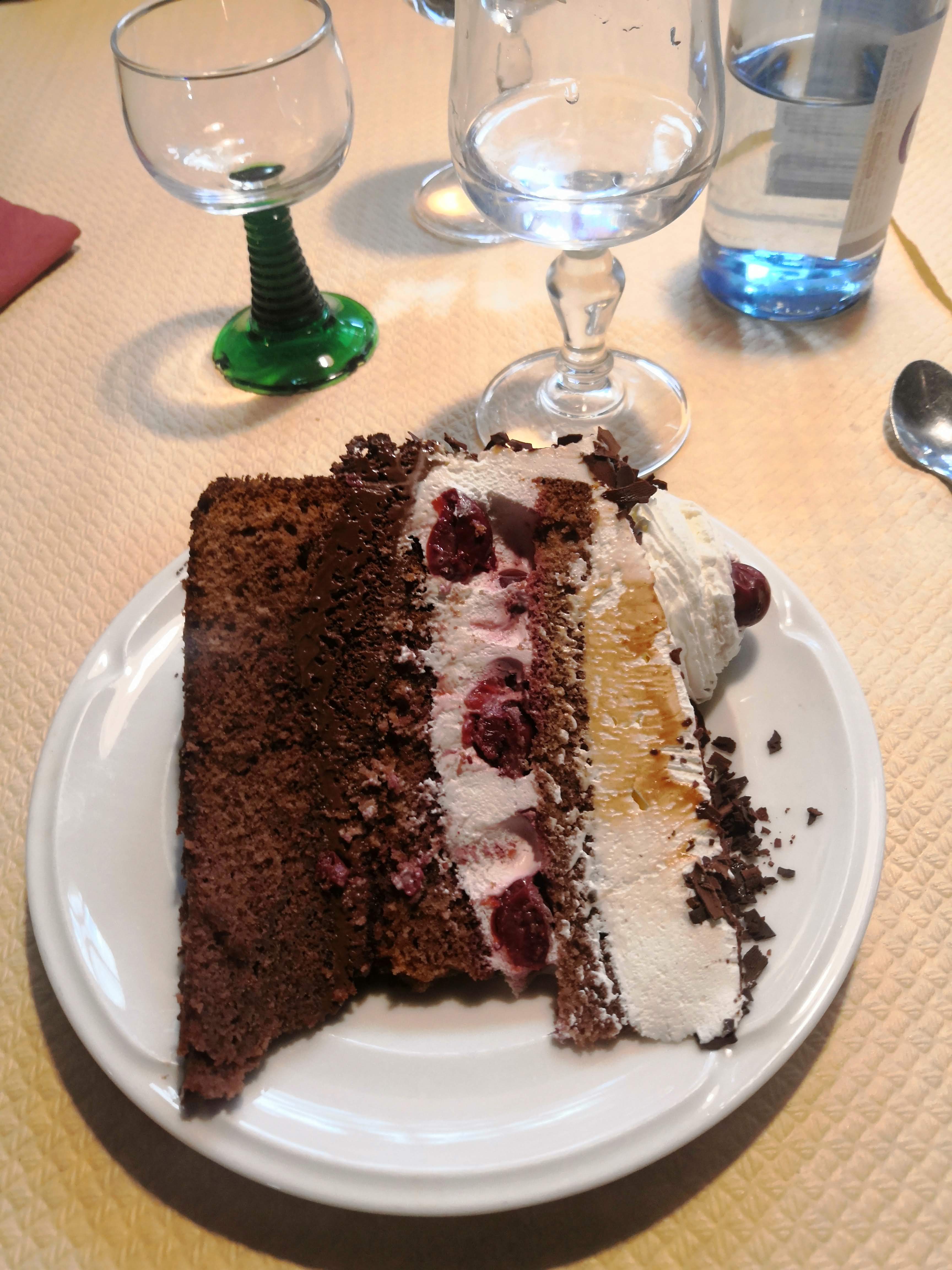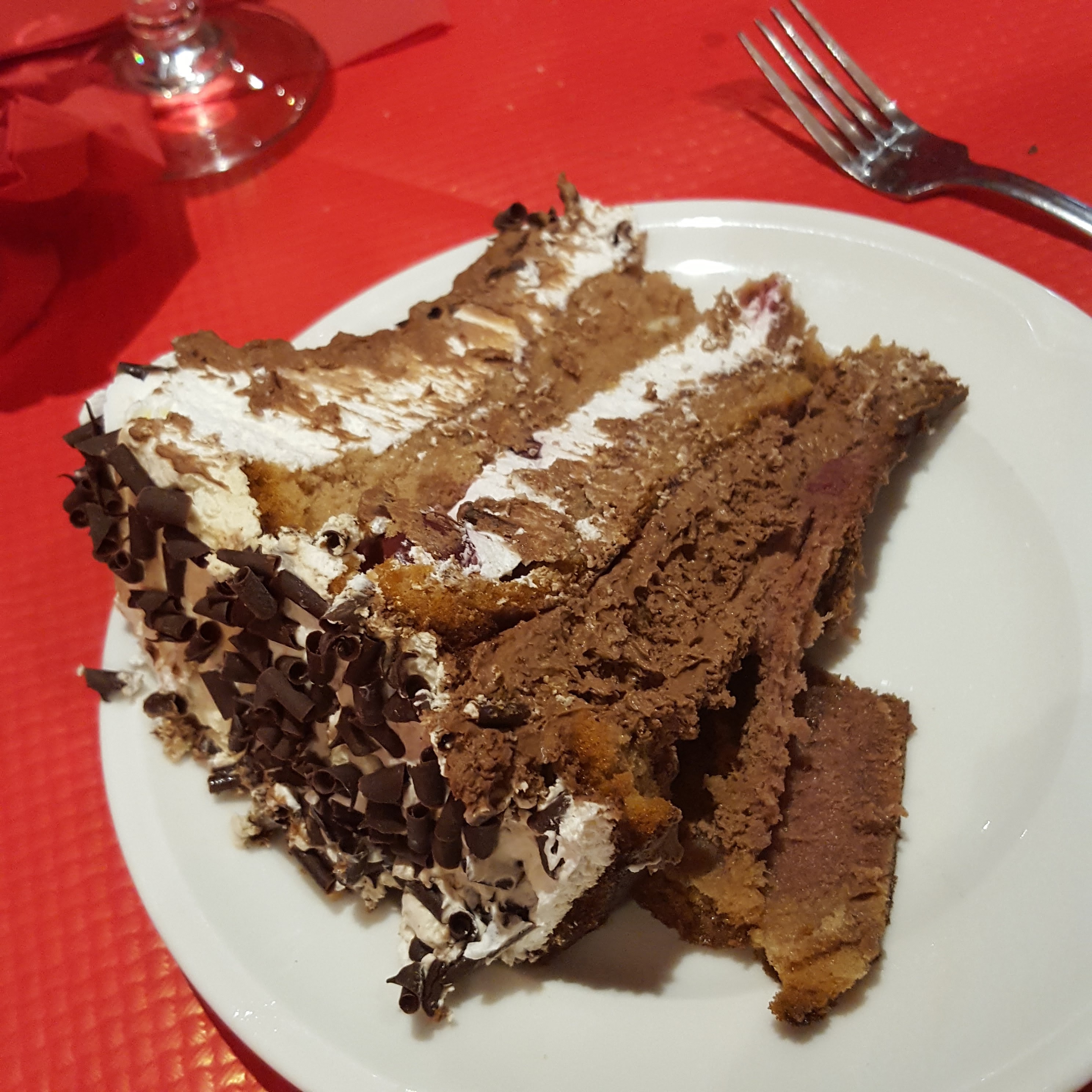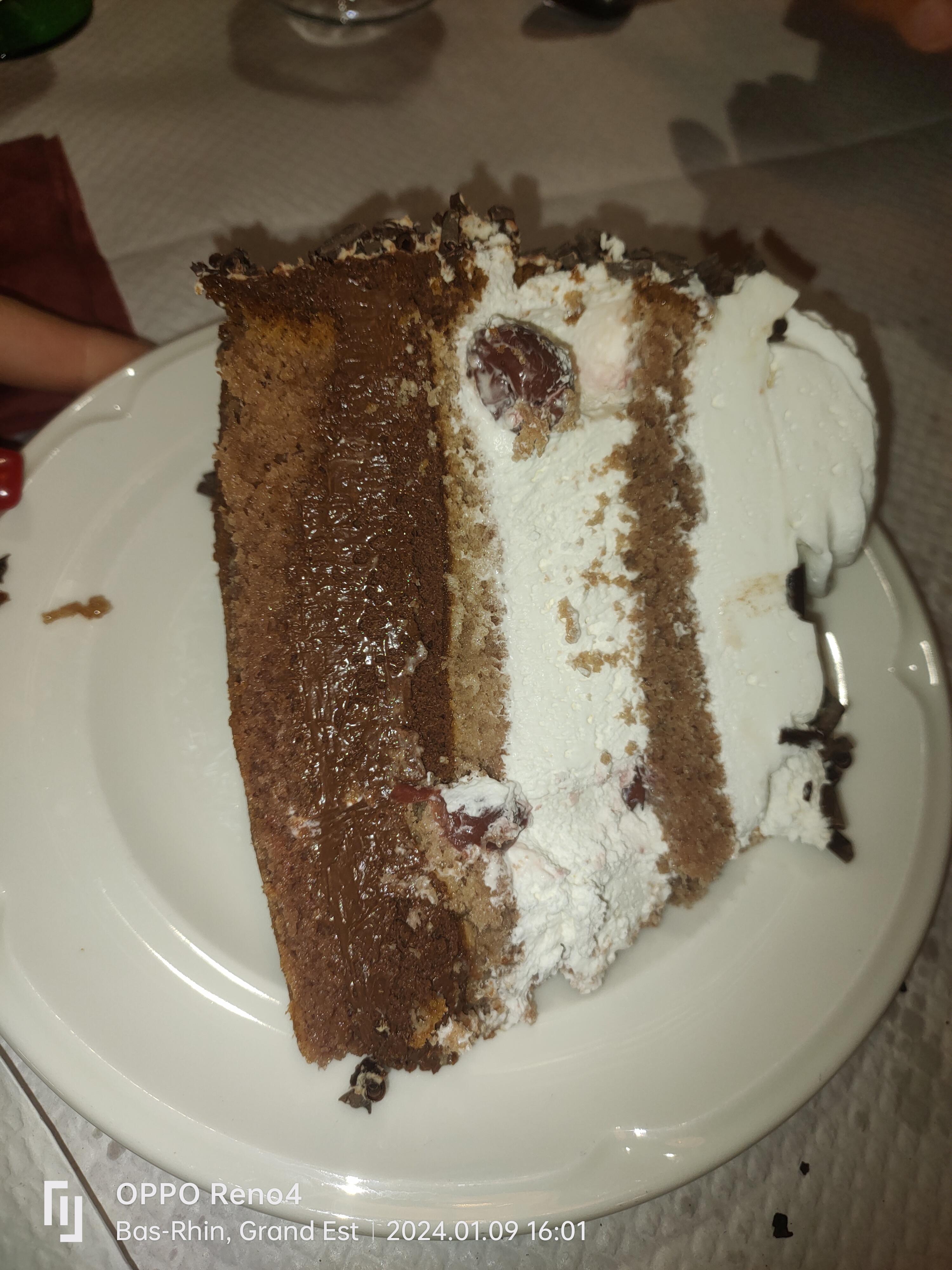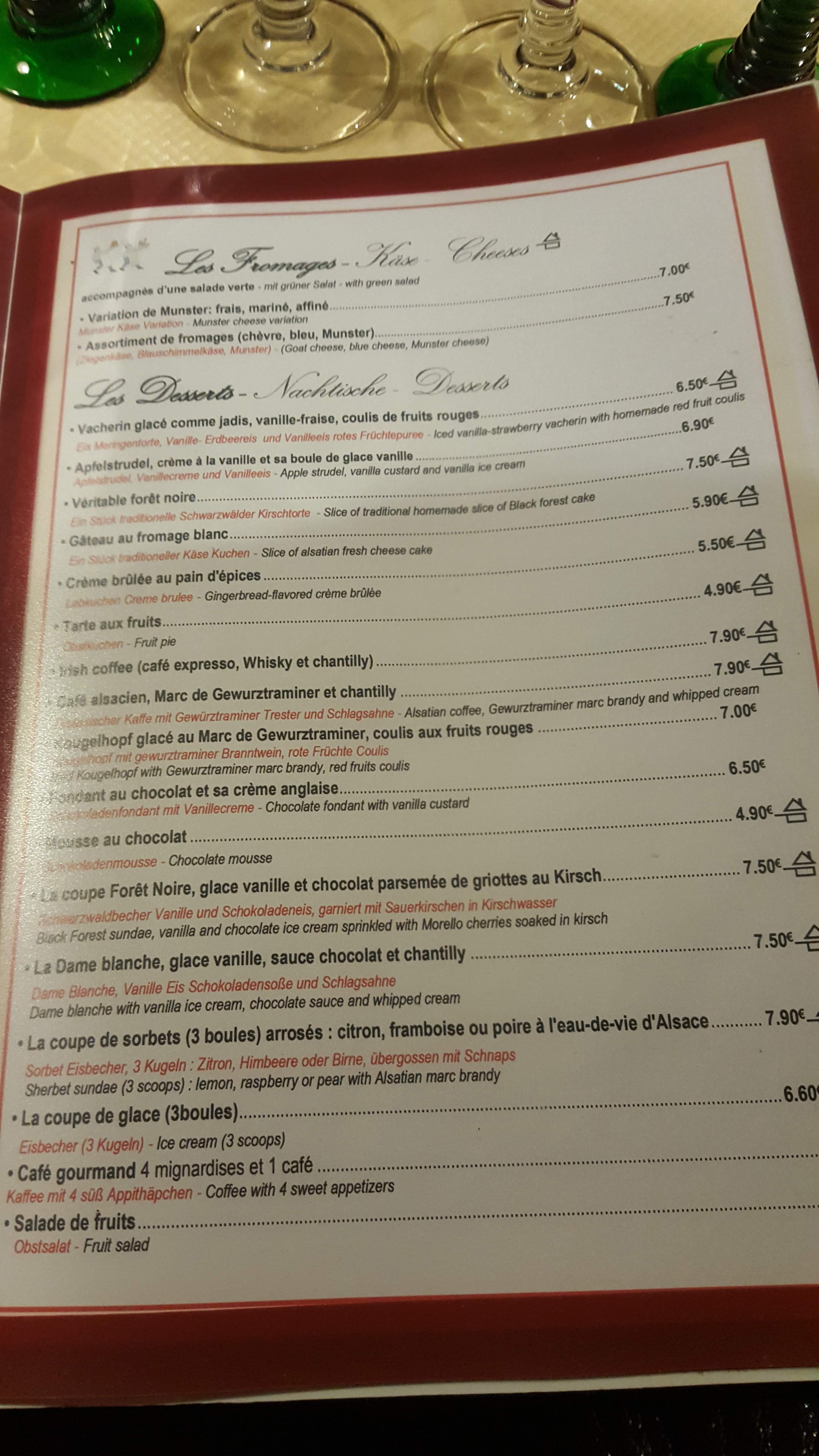 Olalala ça c’est un restaurant ! J’ai pris que le dessert en photo tellement que j’étais absorbé par les plats et comme on peut le voir c’est un part de forêt noire. Les prix sont cohérents au vu de l’emplacement, de la qualité et de la quantité. Une vraie forêt noire, classique mais si bonne. Je recommande cet établissement si vous voulez manger des bons plats traditionnels alsaciens !