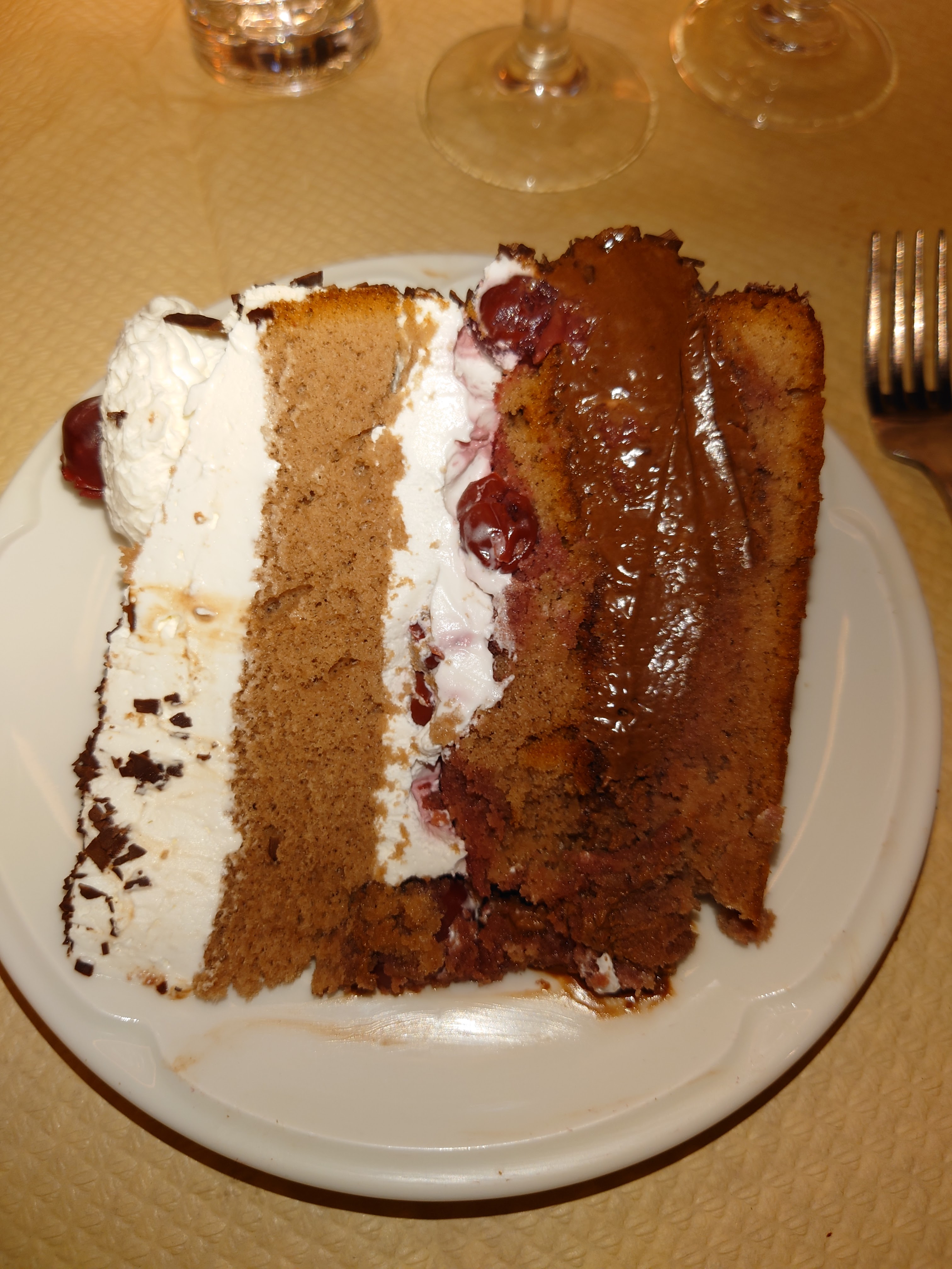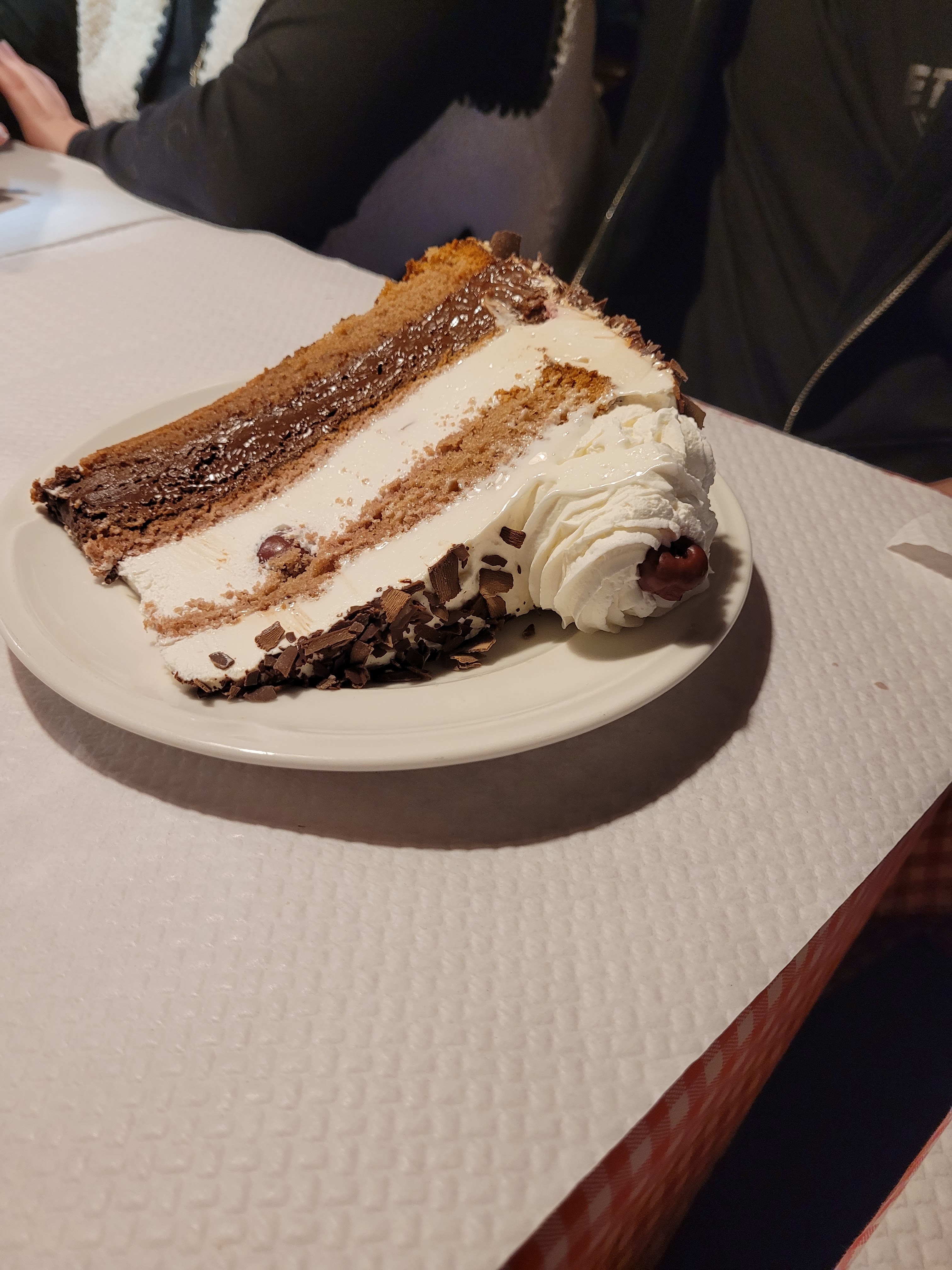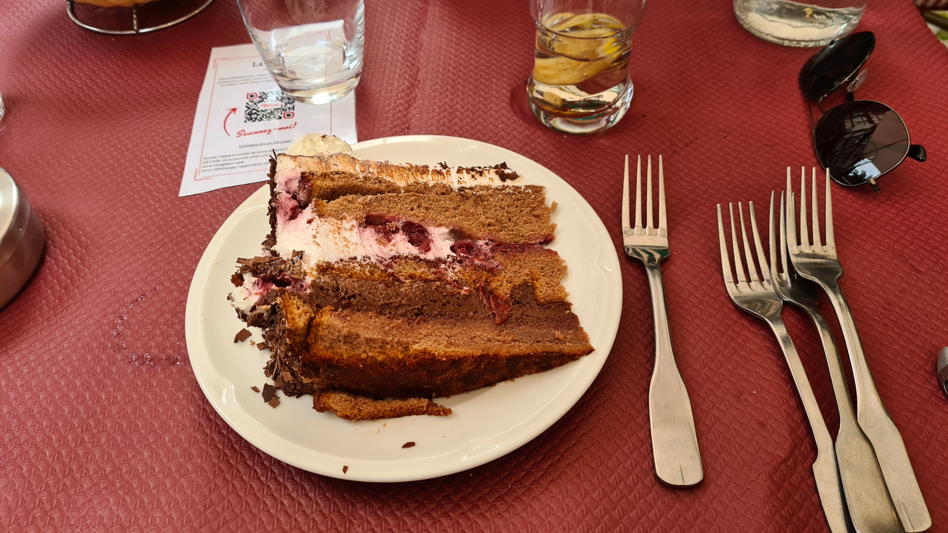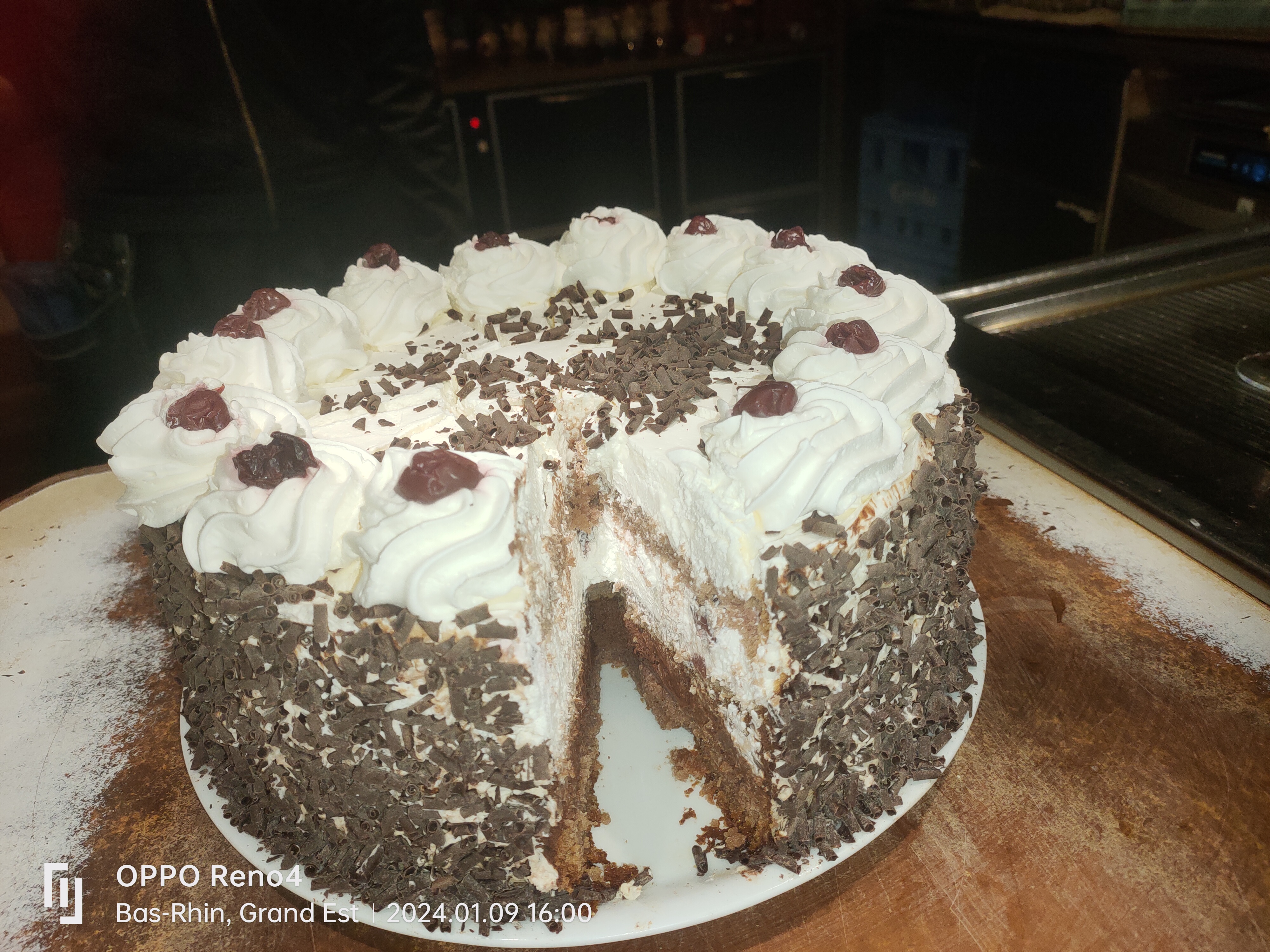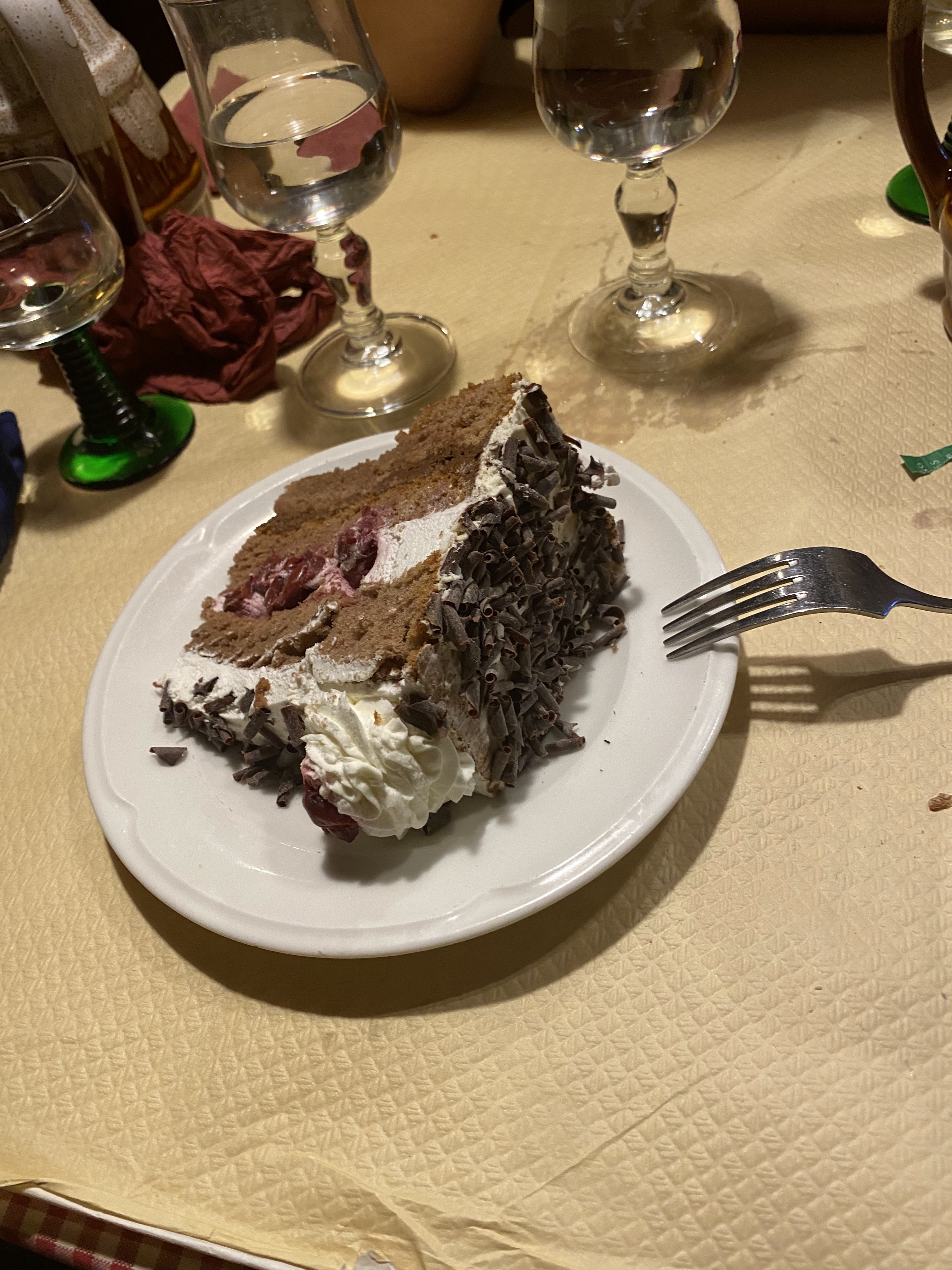 Olalala ça c’est un restaurant ! J’ai pris que le dessert en photo tellement que j’étais absorbé par les plats et comme on peut le voir c’est un part de forêt noire. Les prix sont cohérents au vu de l’emplacement, de la qualité et de la quantité. Une vraie forêt noire, classique mais si bonne. Je recommande cet établissement si vous voulez manger des bons plats traditionnels alsaciens !