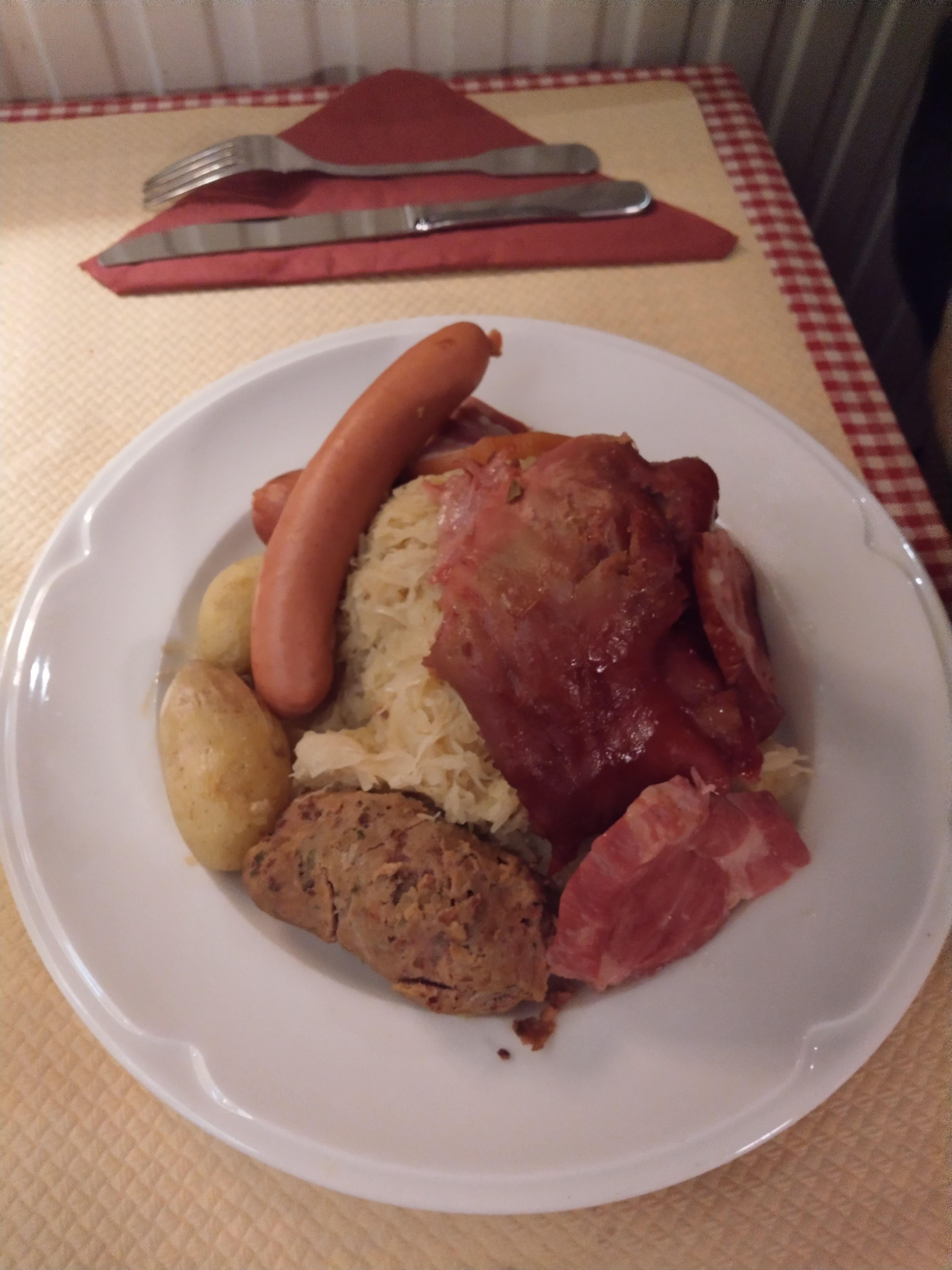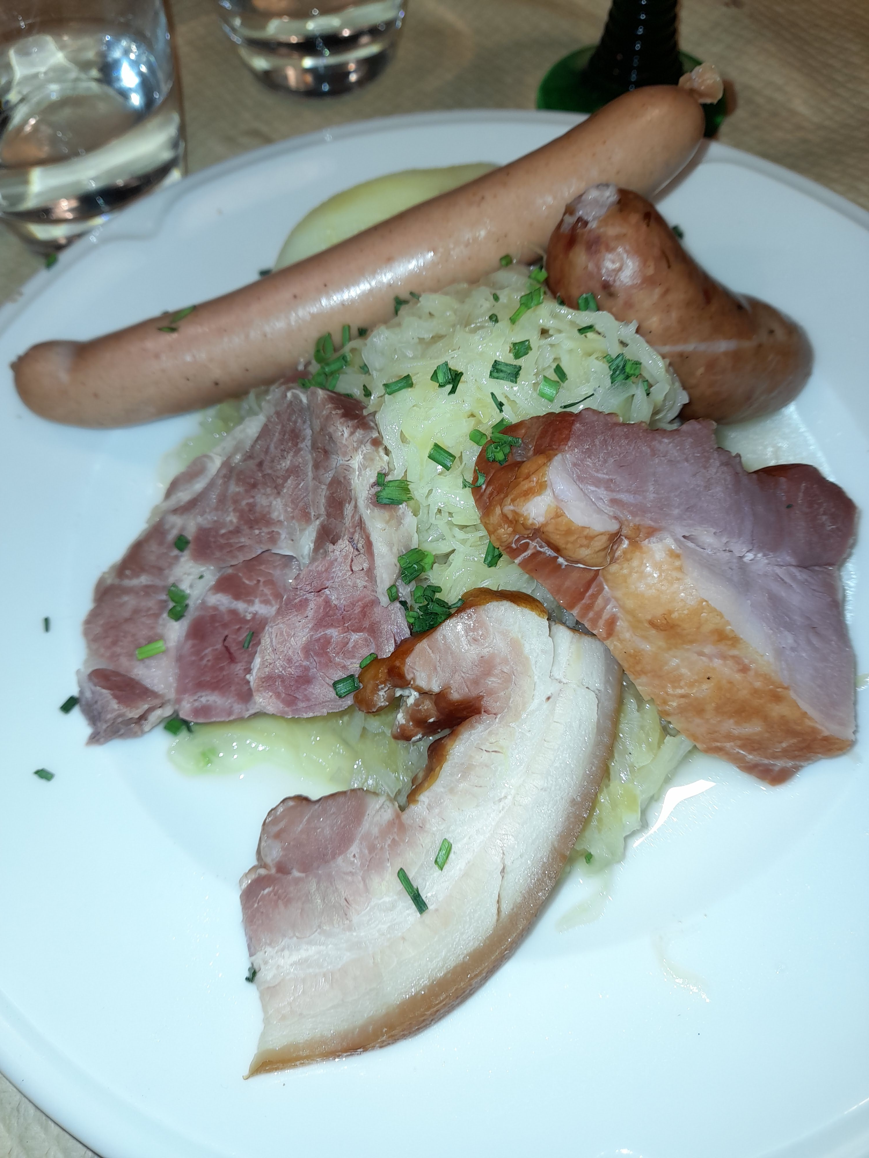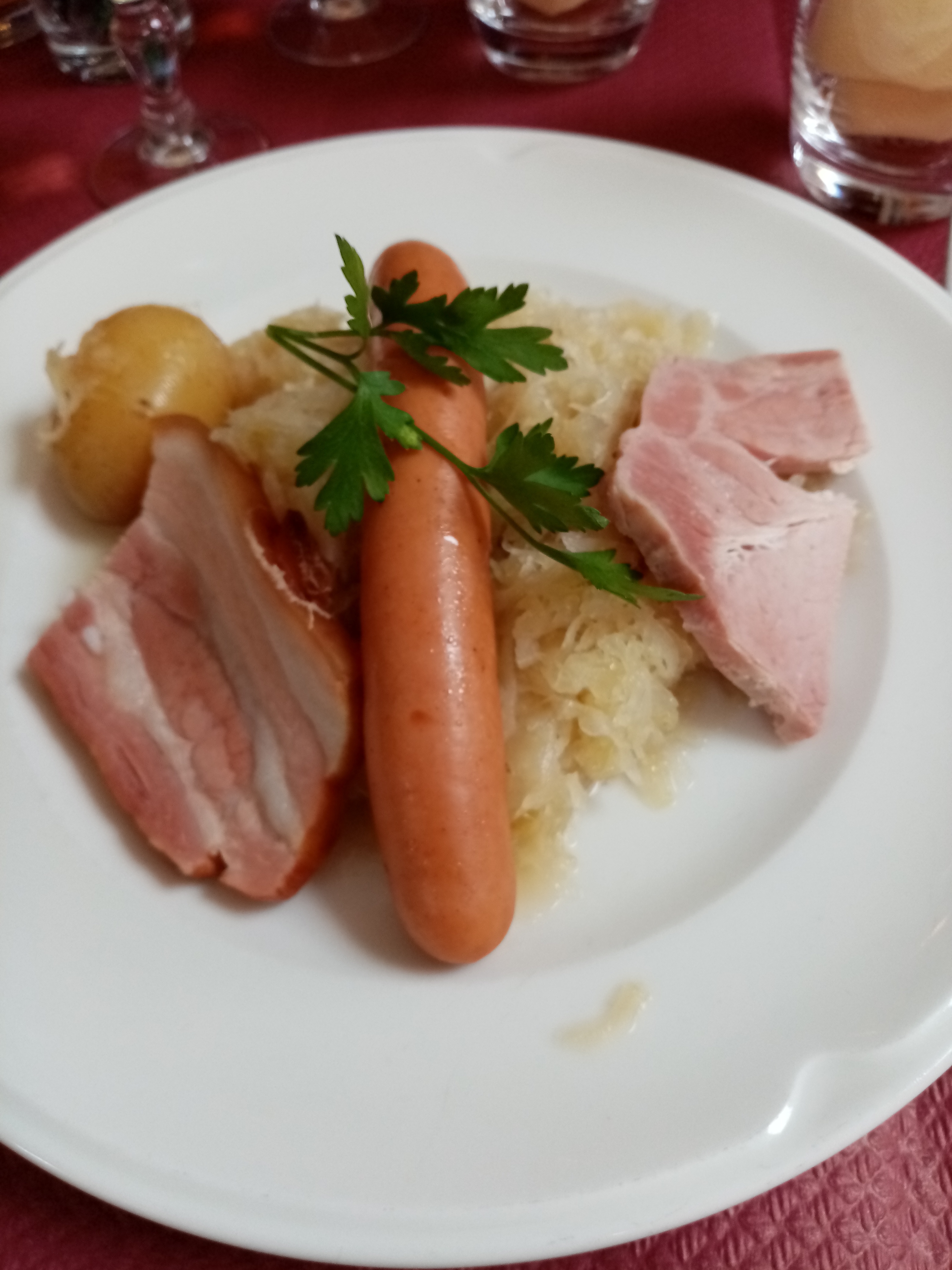 2 eme fois que j y vais en3 mois . bonne choucroute 5 viandes ,soupe à l oignon ,et gratin de pdt au munster tres bon. ambiance de fête. y aller un peu avant les horaires des repas car trop d attente dehors