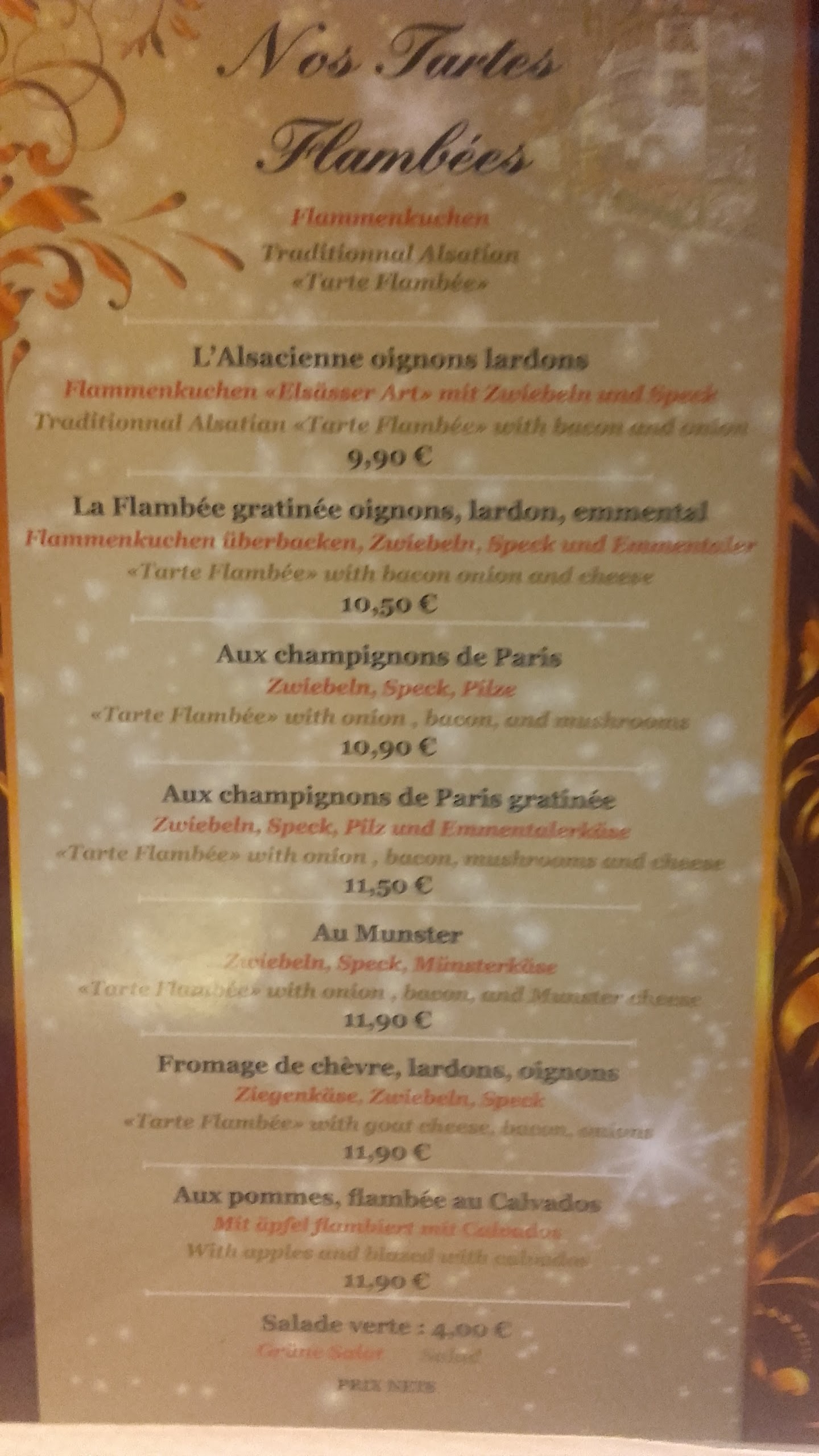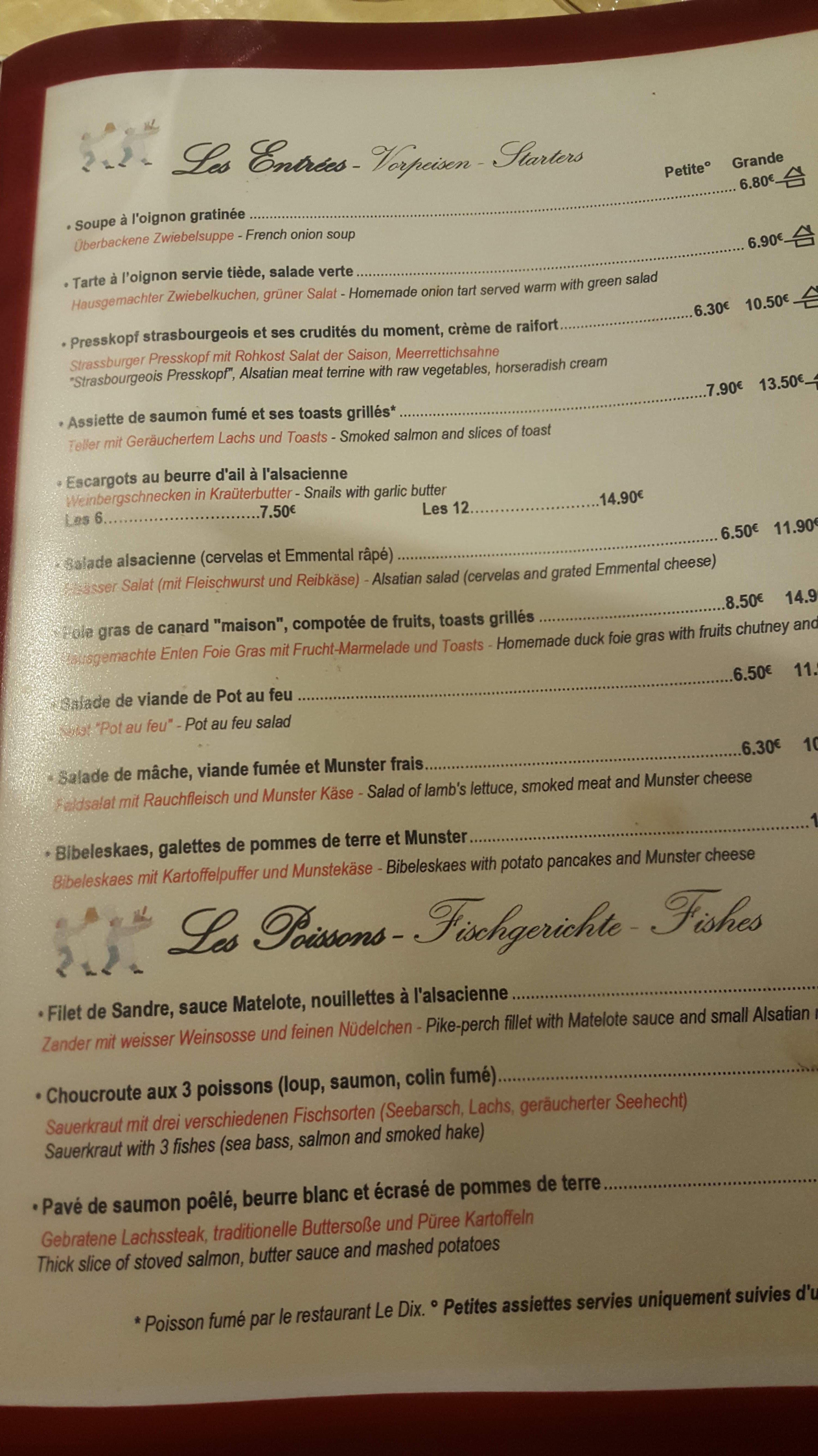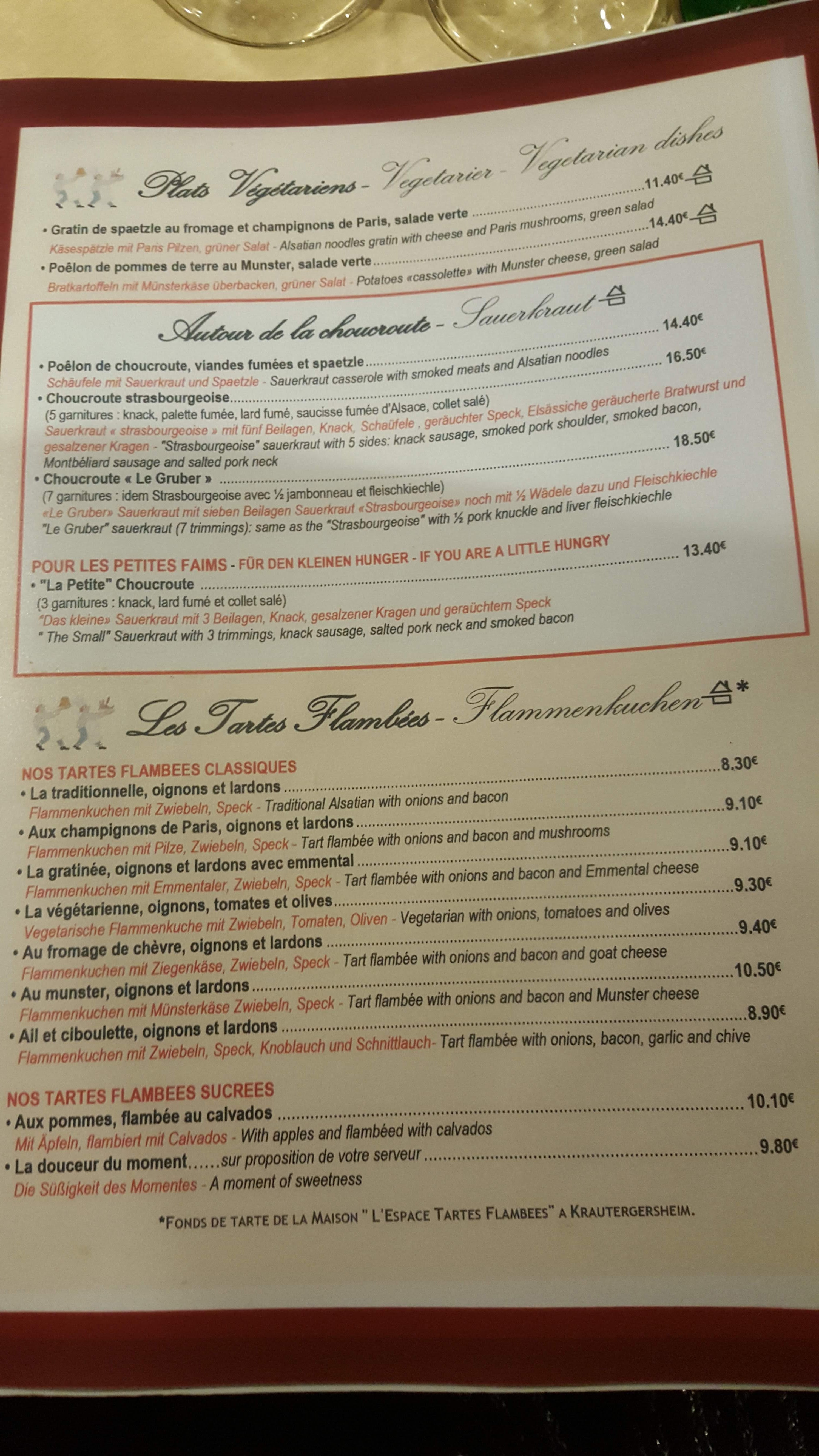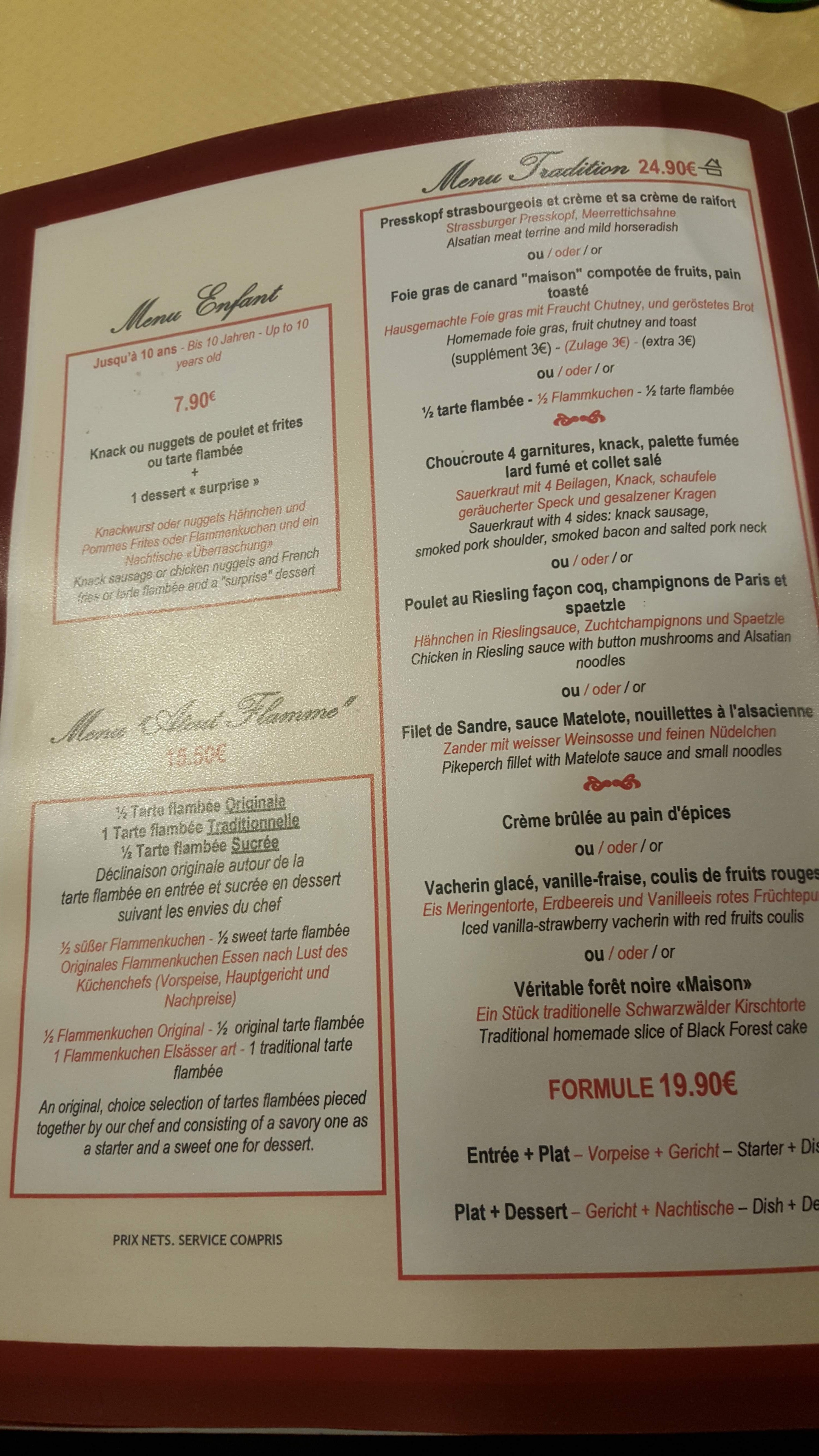 Avis mitigé... Il y a deux cartes: plats alsaciens/plats italiens.... La cuisine ne semble pas être maison (sauf les tartes flambées peut être). Jarret sauce munster très bon, portion généreuse. Choucroute... On a connu mieux.... Cassolette de spaetzle bof.... Par contre tartes flambées excellentes. Au vu des tarifs excessifs, nous n'avons pas pris de dessert. Le service, ça dépend des serveurs.... Certains sont NATURELLEMENT agréables, d'autres moins (il a quand même fallu qu'une serveuse ou responsable fasse la remarque à un de ses collègues de se montrer plus SOURIANT....) Je pense qu'en prenant le temps de bien chercher, on peut trouver un meilleur restaurant proposant des spécialités alsaciennes faites maison...