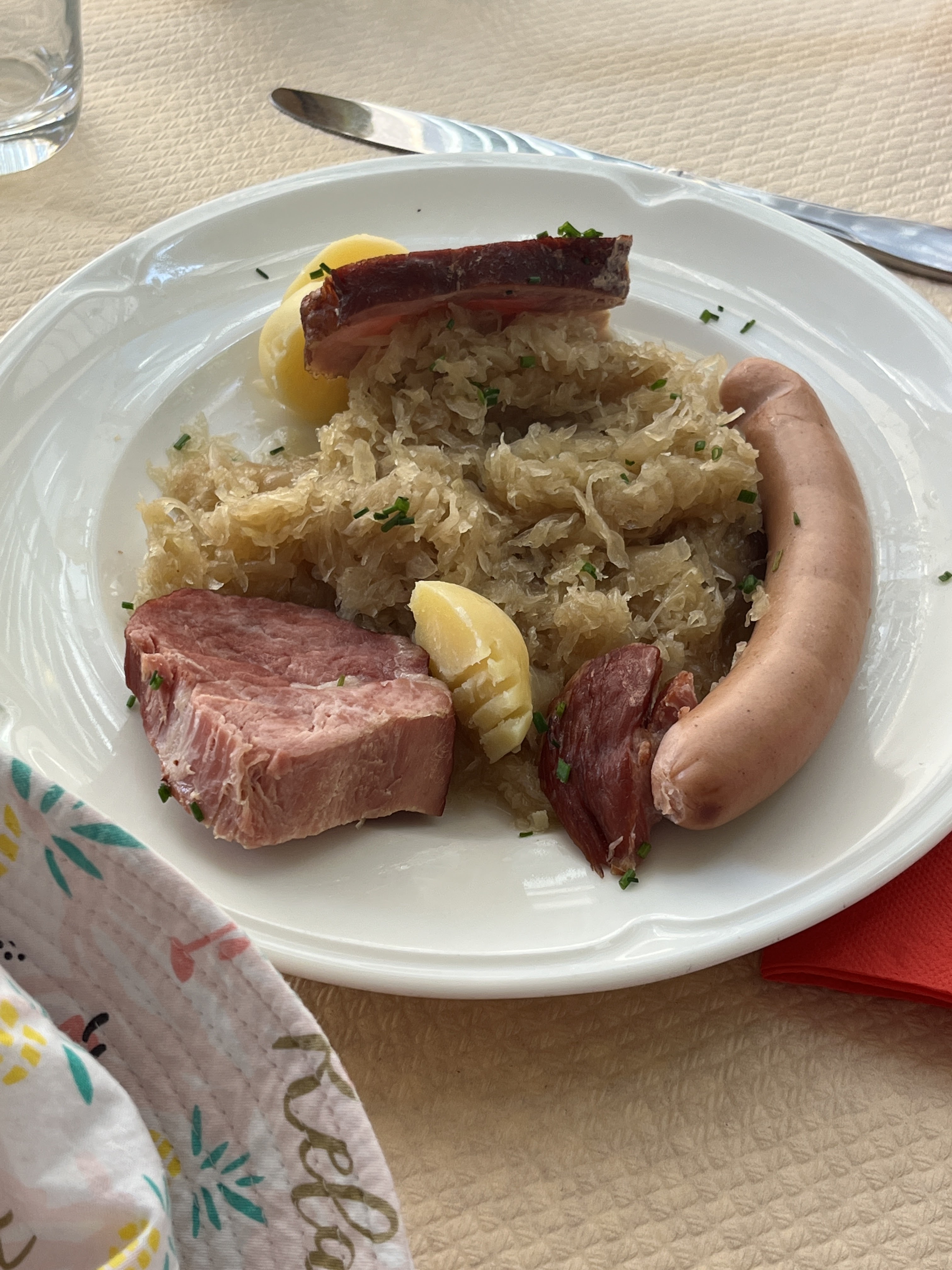 Choucroute inmangeable sans intérêt ; chou sorti du seau directement non recuit au Riesling ou à la bière… pas de goût… pommes de terre sorties d’un sachet sous vide..: viande sans grand intérêt non plus. Quel dommage avec un si beau lieu ! Serveurs au top