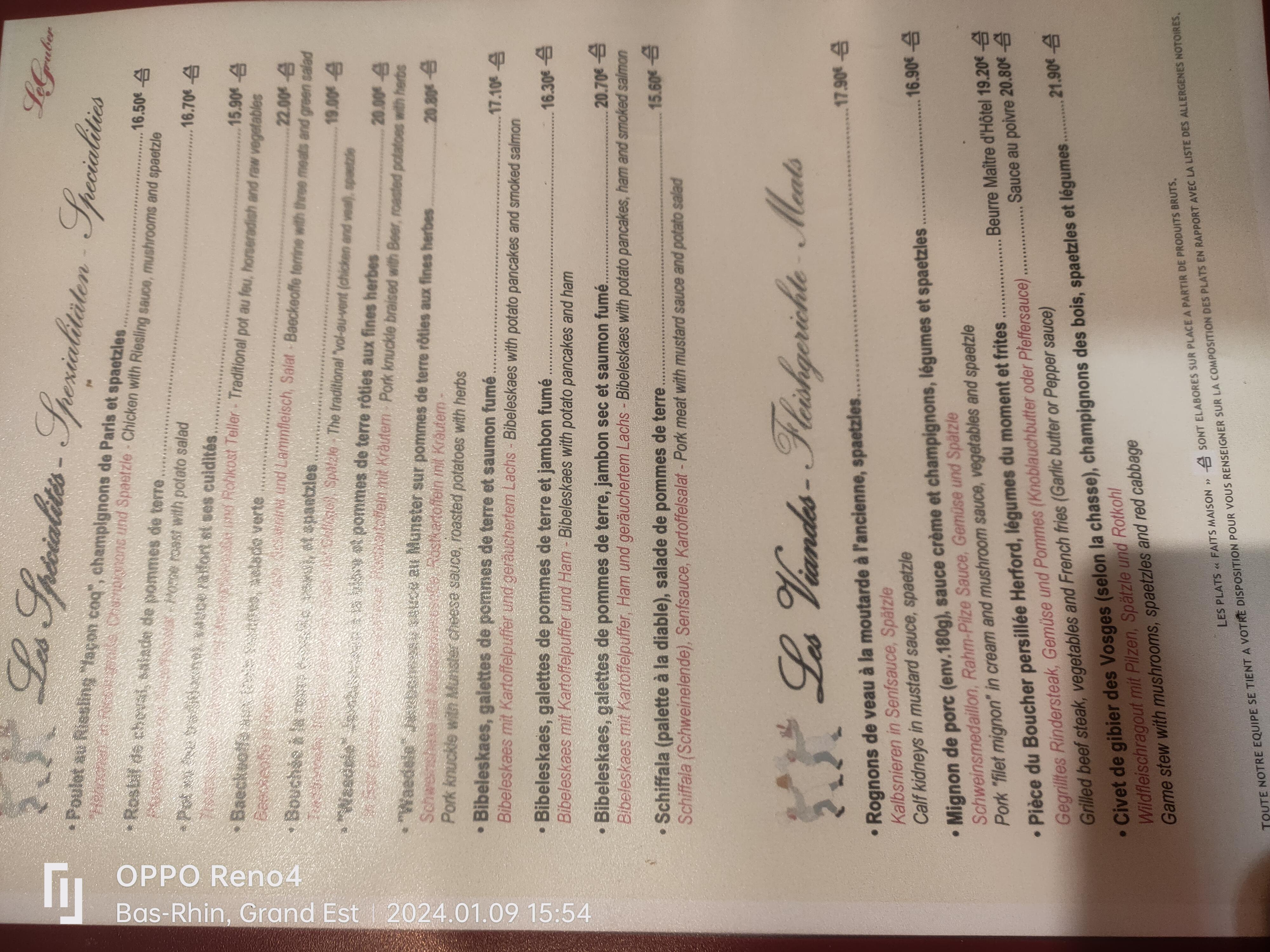 Très joli restaurant, typique de la région, jolie déco, jolie ambiance, bon plat bref nous avons passé un très bon moment/repas Côté prix, pour deux apéro, deux tarte flambée, un café gourmand, un café avec mousse au choco environ 50e :)